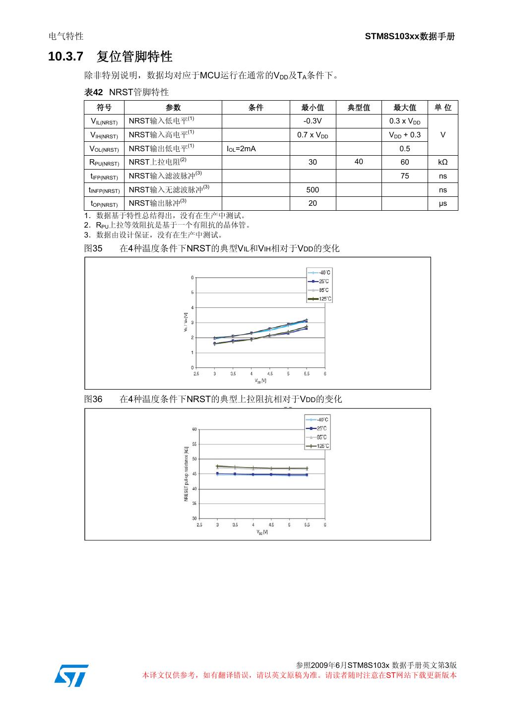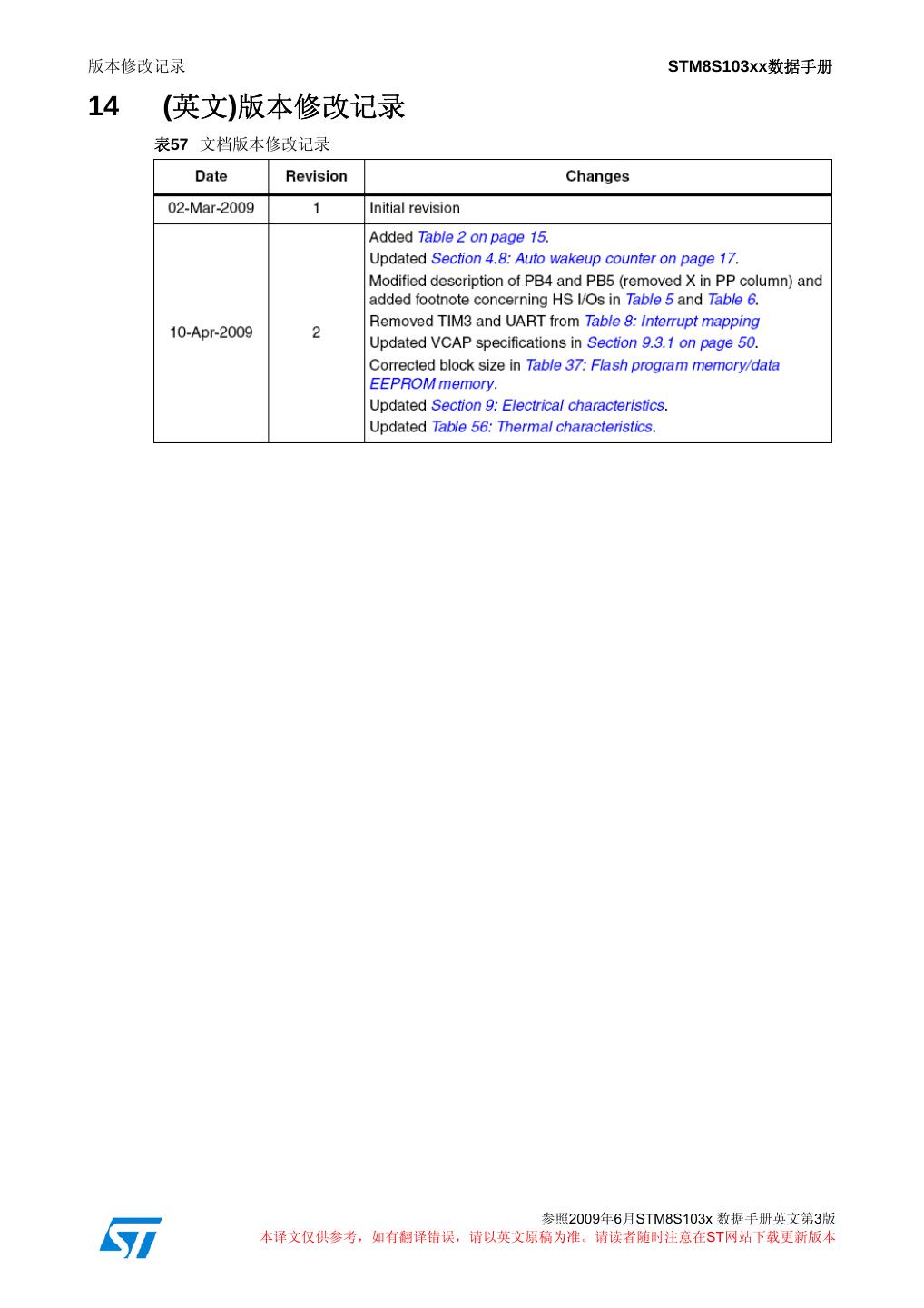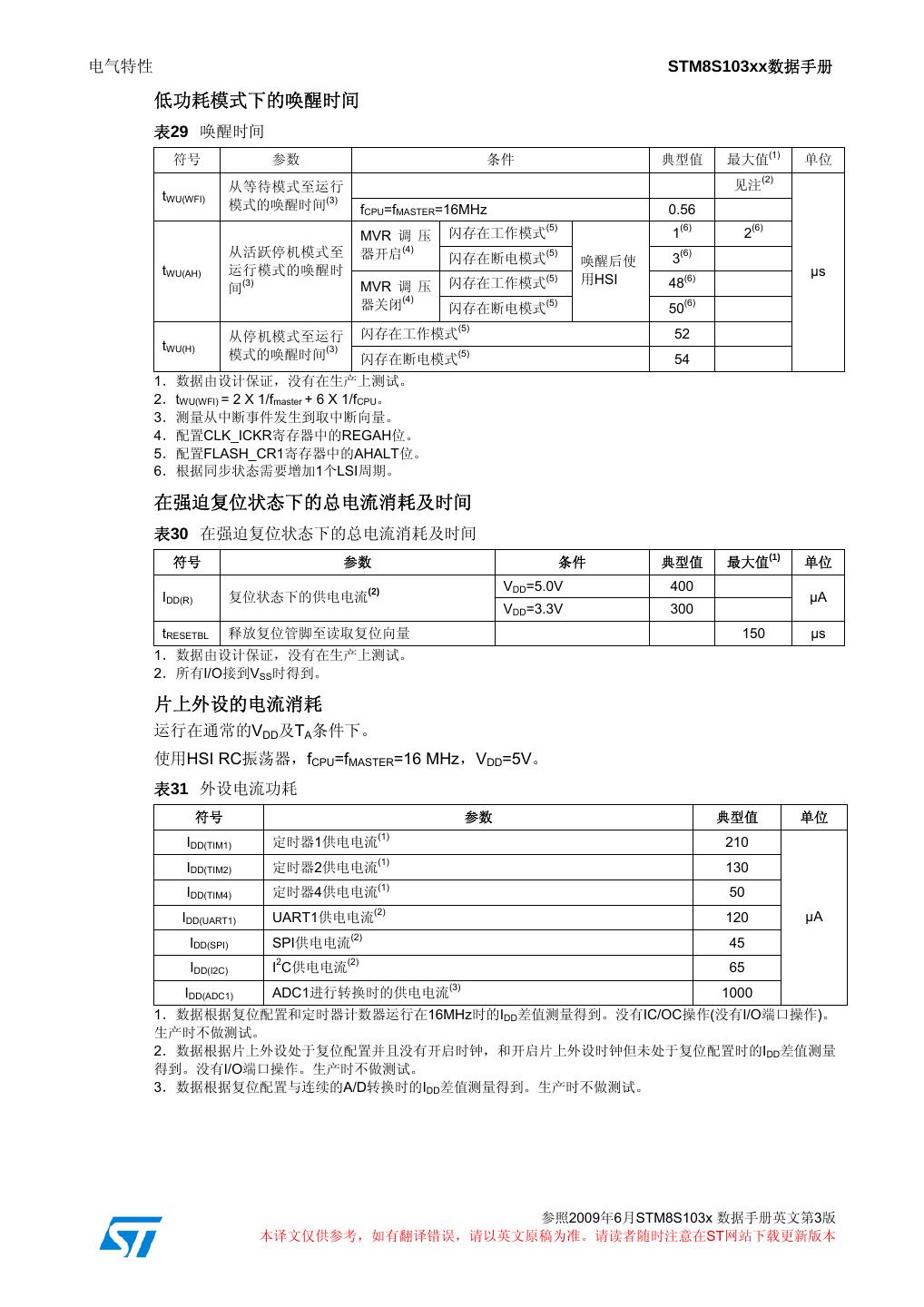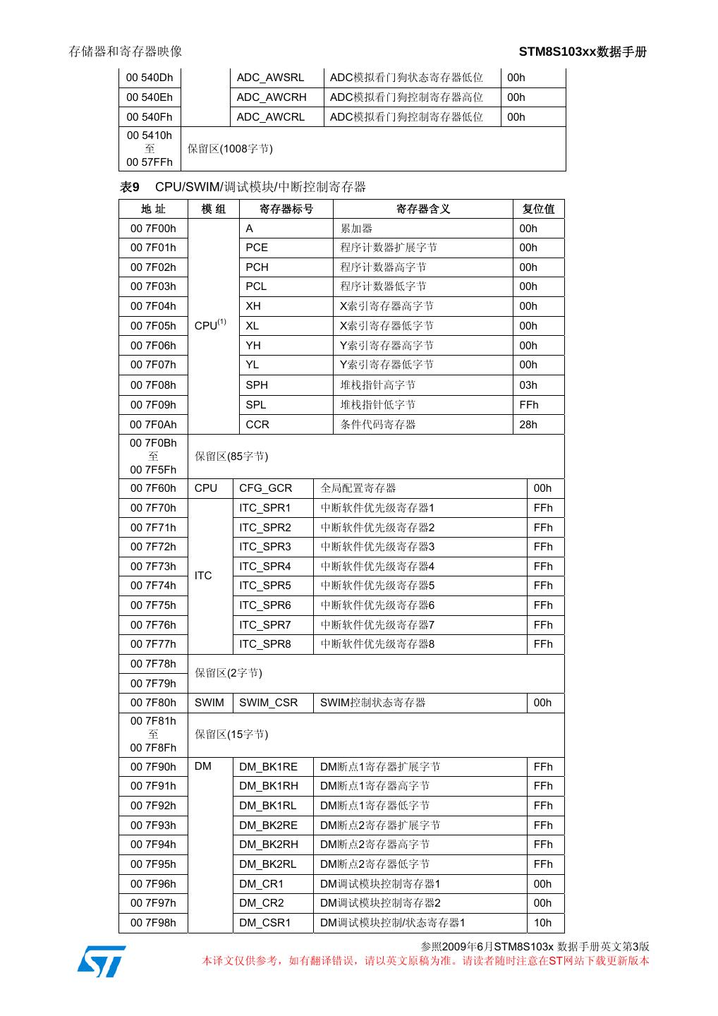 26 .存储器和寄存器映像 STM8S103xx数据手册 00 7F99h DM_CSR2 DM调试模块控制/状态寄存器2 00h 00 7F9Ah DM_ENFCTR DM使能功能寄存器 FFh 00 7F9Bh 至 保留区(5字节) 00 7F9Fh 1. 只有调试模块可以访问 参照2009年6月STM8S103x 数据手册英文第3版 本译文仅供参考,如有翻译错误,请以英文原稿为准。请读者随时注意在ST网站下载更新版本