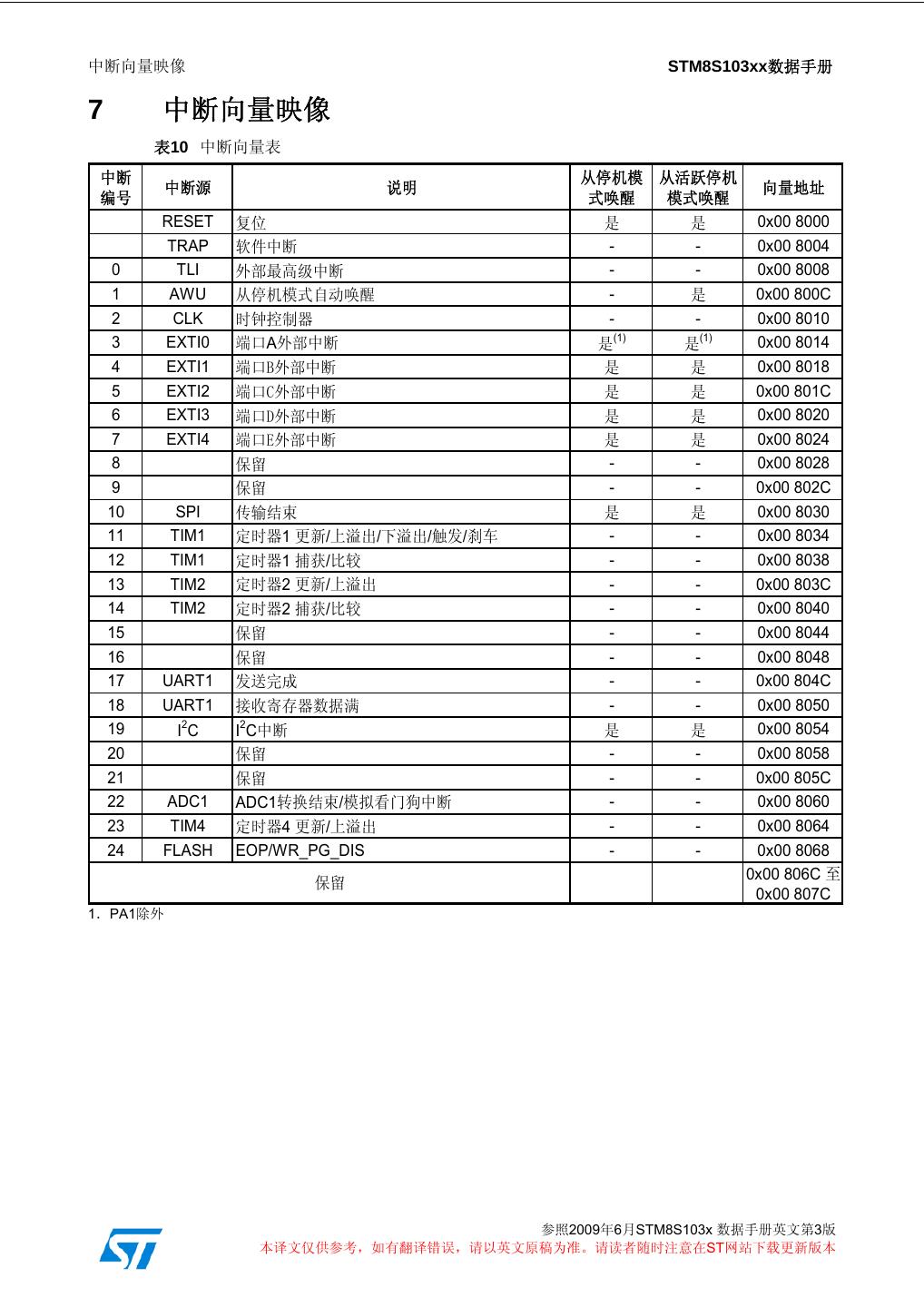 27 .中断向量映像 STM8S103xx数据手册 7 中断向量映像 表10 中断向量表 中断 从停机模 从活跃停机 中断源 说明 向量地址 编号 式唤醒 模式唤醒 RESET 复位 是 是 0x00 8000 TRAP 软件中断 - - 0x00 8004 0 TLI 外部最高级中断 - - 0x00 8008 1 AWU 从停机模式自动唤醒 - 是 0x00 800C 2 CLK 时钟控制器 - - 0x00 8010 (1) (1) 3 EXTI0 端口A外部中断 是 是 0x00 8014 4 EXTI1 端口B外部中断 是 是 0x00 8018 5 EXTI2 端口C外部中断 是 是 0x00 801C 6 EXTI3 端口D外部中断 是 是 0x00 8020 7 EXTI4 端口E外部中断 是 是 0x00 8024 8 保留 - - 0x00 8028 9 保留 - - 0x00 802C 10 SPI 传输结束 是 是 0x00 8030 11 TIM1 定时器1 更新/上溢出/下溢出/触发/刹车 - - 0x00 8034 12 TIM1 定时器1 捕获/比较 - - 0x00 8038 13 TIM2 定时器2 更新/上溢出 - - 0x00 803C 14 TIM2 定时器2 捕获/比较 - - 0x00 8040 15 保留 - - 0x00 8044 16 保留 - - 0x00 8048 17 UART1 发送完成 - - 0x00 804C 18 UART1 接收寄存器数据满 - - 0x00 8050 2 2 19 IC I C中断 是 是 0x00 8054 20 保留 - - 0x00 8058 21 保留 - - 0x00 805C 22 ADC1 ADC1转换结束/模拟看门狗中断 - - 0x00 8060 23 TIM4 定时器4 更新/上溢出 - - 0x00 8064 24 FLASH EOP/WR_PG_DIS - - 0x00 8068 0x00 806C 至 保留 0x00 807C 1.PA1除外 参照2009年6月STM8S103x 数据手册英文第3版 本译文仅供参考,如有翻译错误,请以英文原稿为准。请读者随时注意在ST网站下载更新版本