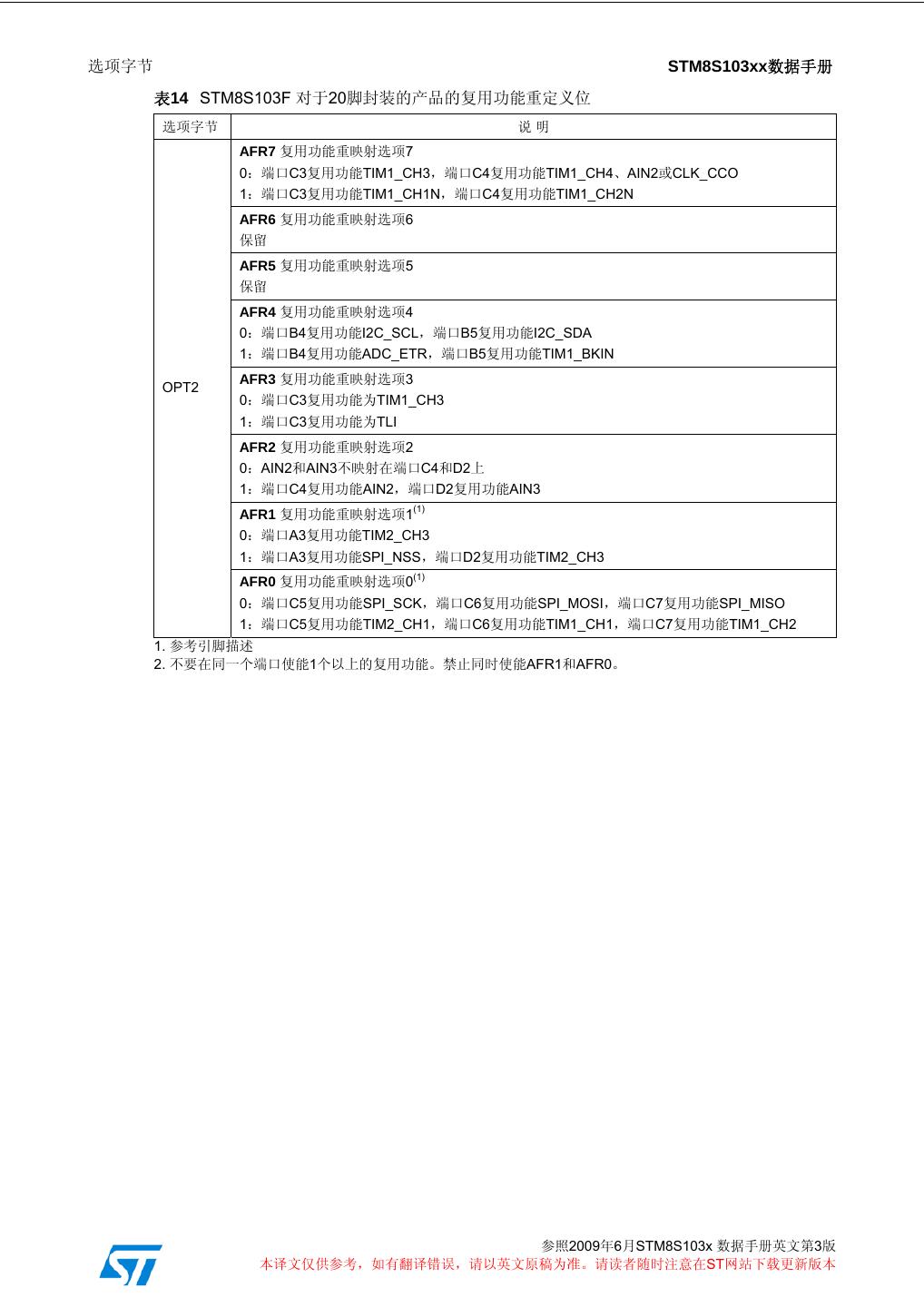 18 .引脚及其描述 STM8S103xx数据手册 5.1 备选功能重映射 如引脚描述表最右列中所示,通过对8个AFR(备选功能重映射)选项位中的一位,一些备选功能 可以被重新映射到不同的I/O端口上。请参考第8章:选项字节。当相应的重映射选项被打开 后,引脚默认的复用功能将不可用了。 如果要使用备选的功能,外设寄存器中相应的外设一定要被使能。 备选功能重映射不影响I/O端口的GPIO功能(请见参考手册RM0016中有关GPIO的章节)。 参照2009年6月 STM8S103x 数据手册英文第3版 本译文仅供参考,如有翻译错误,请以英文原稿为准。请读者随时注意在ST网站下载更新版本