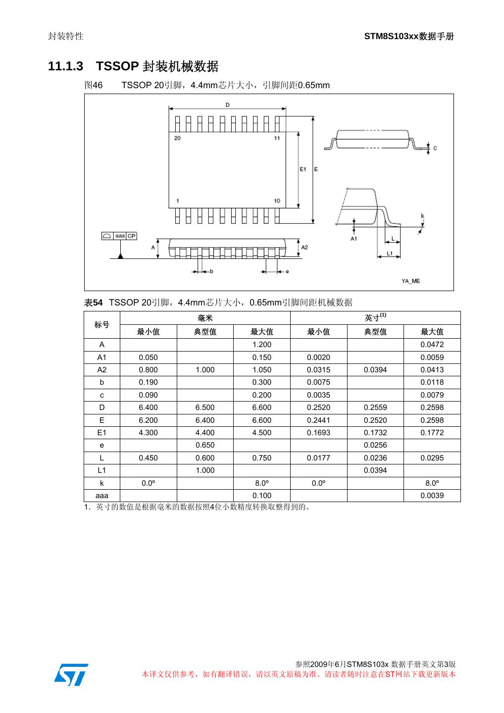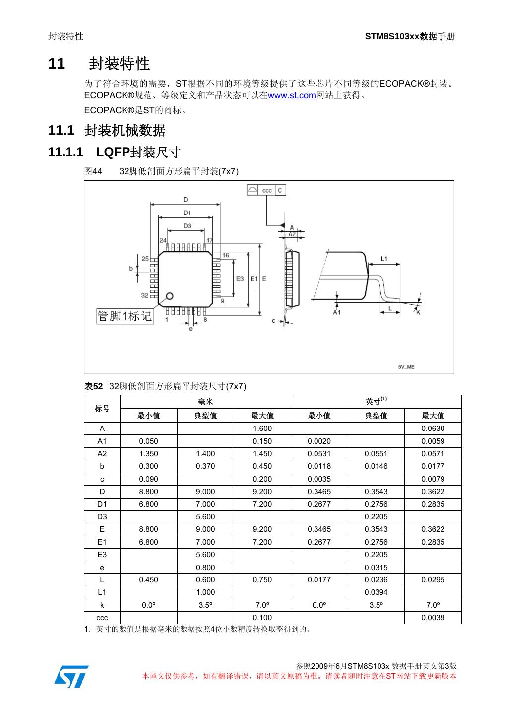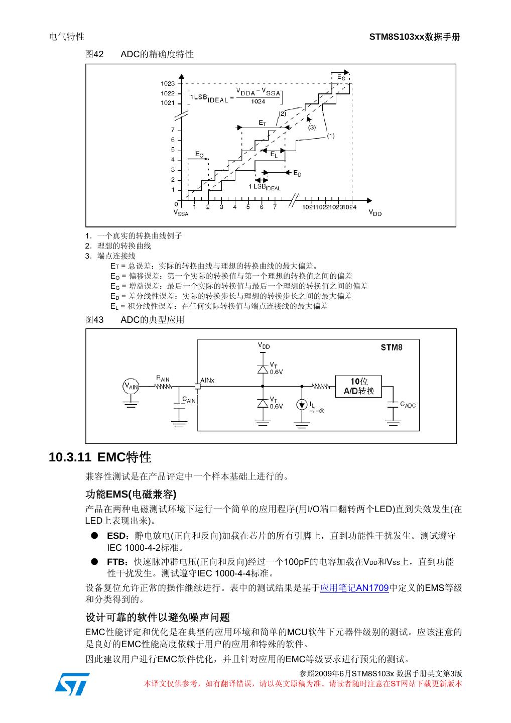 3 .目录 STM8S103xx数据手册 10.3.10 10位ADC特性 ............................................................................................................53 10.3.11 EMC特性....................................................................................................................55 11 封装特性 .................................................................................................................58 11.1 封装机械数据 ....................................................................................................................58 11.1.1 LQFP封装尺寸 ...........................................................................................................58 11.1.2 QFN封装机械数据......................................................................................................59 11.1.3 TSSOP 封装机械数据 ................................................................................................60 11.1.4 UFQFPN 封装............................................................................................................61 11.2 热特性 ...............................................................................................................................62 11.2.1 参考文档 ....................................................................................................................63 11.2.2 选择产品的温度范围...................................................................................................63 12 订购信息 .................................................................................................................64 13 STM8 开发工具 (本章从略) .....................................................................................65 13.1 仿真和在线调试工具..........................................................................................................65 13.2 软件工具............................................................................................................................65 13.2.1 STM8工具套件...........................................................................................................65 13.2.2 C和汇编工具 ..............................................................................................................65 13.2.3 编程工具 ....................................................................................................................65 14 (英文)版本修改记录.................................................................................................66 参照2009年6月 STM8S103x 数据手册英文第3版 本译文仅供参考,如有翻译错误,请以英文原稿为准。请读者随时注意在ST网站下载更新版本