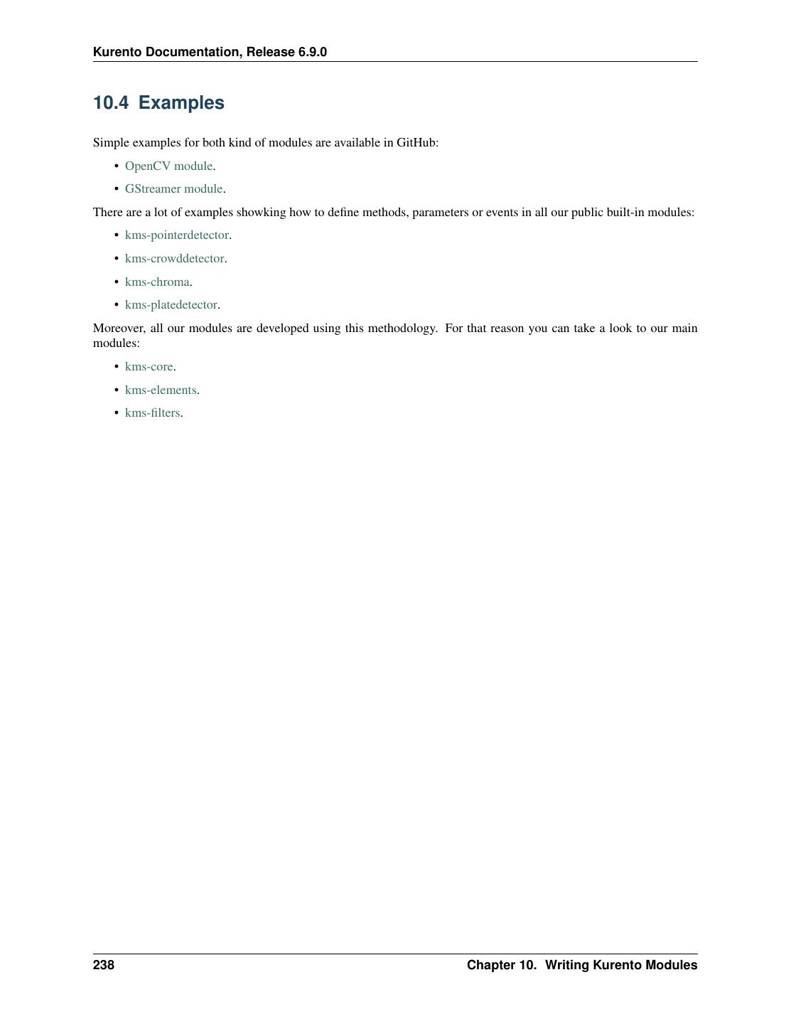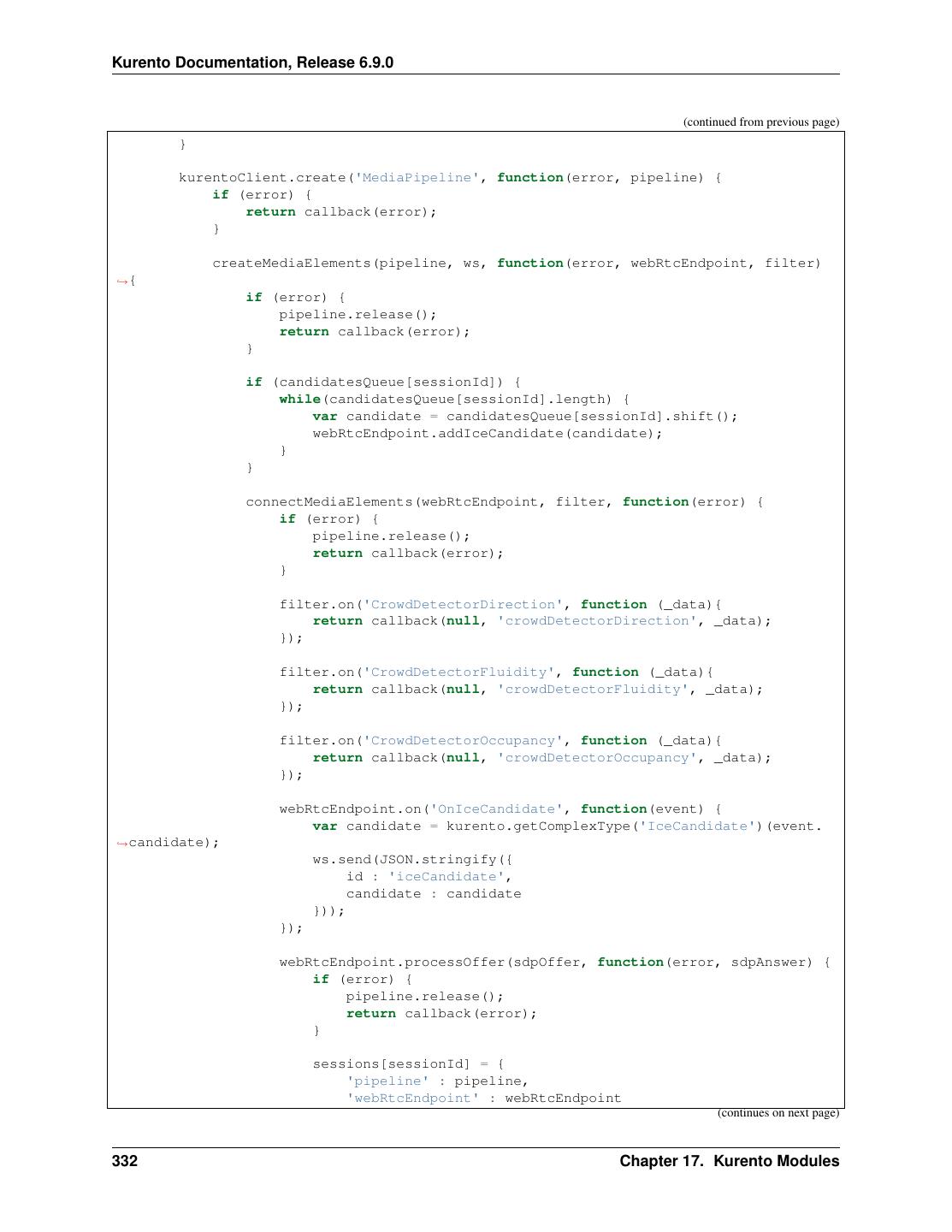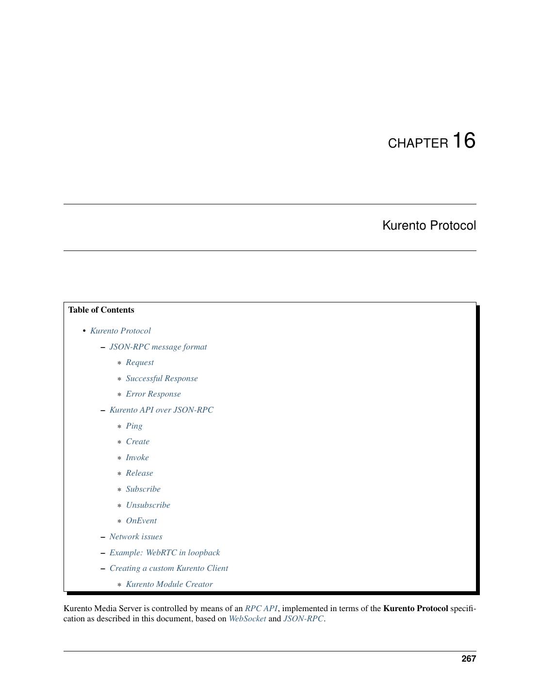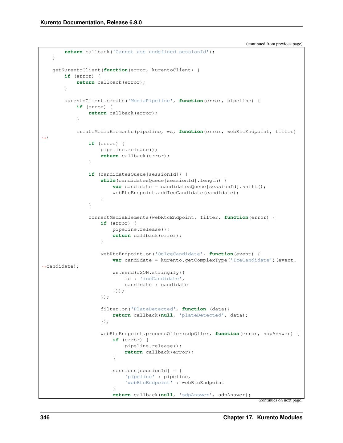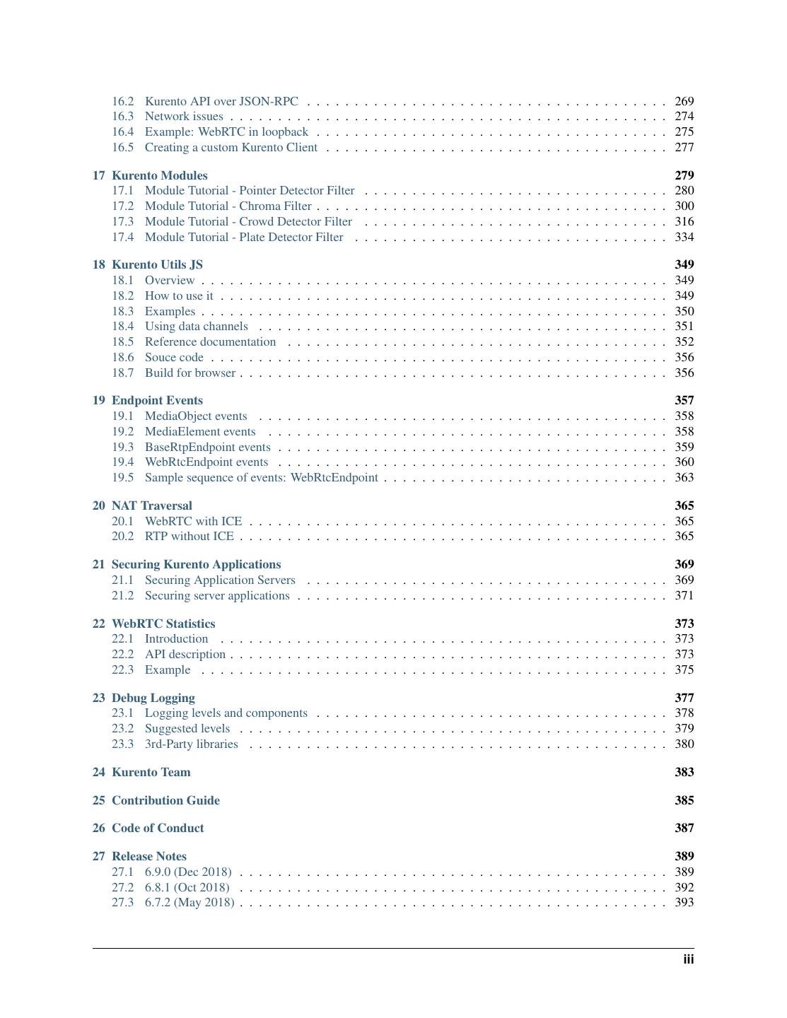 5 . 16.2 Kurento API over JSON-RPC . . . . . . . . . . . . . . . . . . . . . . . . . . . . . . . . . . . . . . 269 16.3 Network issues . . . . . . . . . . . . . . . . . . . . . . . . . . . . . . . . . . . . . . . . . . . . . . 274 16.4 Example: WebRTC in loopback . . . . . . . . . . . . . . . . . . . . . . . . . . . . . . . . . . . . . 275 16.5 Creating a custom Kurento Client . . . . . . . . . . . . . . . . . . . . . . . . . . . . . . . . . . . . 277 17 Kurento Modules 279 17.1 Module Tutorial - Pointer Detector Filter . . . . . . . . . . . . . . . . . . . . . . . . . . . . . . . . 280 17.2 Module Tutorial - Chroma Filter . . . . . . . . . . . . . . . . . . . . . . . . . . . . . . . . . . . . . 300 17.3 Module Tutorial - Crowd Detector Filter . . . . . . . . . . . . . . . . . . . . . . . . . . . . . . . . 316 17.4 Module Tutorial - Plate Detector Filter . . . . . . . . . . . . . . . . . . . . . . . . . . . . . . . . . 334 18 Kurento Utils JS 349 18.1 Overview . . . . . . . . . . . . . . . . . . . . . . . . . . . . . . . . . . . . . . . . . . . . . . . . . 349 18.2 How to use it . . . . . . . . . . . . . . . . . . . . . . . . . . . . . . . . . . . . . . . . . . . . . . . 349 18.3 Examples . . . . . . . . . . . . . . . . . . . . . . . . . . . . . . . . . . . . . . . . . . . . . . . . . 350 18.4 Using data channels . . . . . . . . . . . . . . . . . . . . . . . . . . . . . . . . . . . . . . . . . . . 351 18.5 Reference documentation . . . . . . . . . . . . . . . . . . . . . . . . . . . . . . . . . . . . . . . . 352 18.6 Souce code . . . . . . . . . . . . . . . . . . . . . . . . . . . . . . . . . . . . . . . . . . . . . . . . 356 18.7 Build for browser . . . . . . . . . . . . . . . . . . . . . . . . . . . . . . . . . . . . . . . . . . . . . 356 19 Endpoint Events 357 19.1 MediaObject events . . . . . . . . . . . . . . . . . . . . . . . . . . . . . . . . . . . . . . . . . . . 358 19.2 MediaElement events . . . . . . . . . . . . . . . . . . . . . . . . . . . . . . . . . . . . . . . . . . 358 19.3 BaseRtpEndpoint events . . . . . . . . . . . . . . . . . . . . . . . . . . . . . . . . . . . . . . . . . 359 19.4 WebRtcEndpoint events . . . . . . . . . . . . . . . . . . . . . . . . . . . . . . . . . . . . . . . . . 360 19.5 Sample sequence of events: WebRtcEndpoint . . . . . . . . . . . . . . . . . . . . . . . . . . . . . . 363 20 NAT Traversal 365 20.1 WebRTC with ICE . . . . . . . . . . . . . . . . . . . . . . . . . . . . . . . . . . . . . . . . . . . . 365 20.2 RTP without ICE . . . . . . . . . . . . . . . . . . . . . . . . . . . . . . . . . . . . . . . . . . . . . 365 21 Securing Kurento Applications 369 21.1 Securing Application Servers . . . . . . . . . . . . . . . . . . . . . . . . . . . . . . . . . . . . . . 369 21.2 Securing server applications . . . . . . . . . . . . . . . . . . . . . . . . . . . . . . . . . . . . . . . 371 22 WebRTC Statistics 373 22.1 Introduction . . . . . . . . . . . . . . . . . . . . . . . . . . . . . . . . . . . . . . . . . . . . . . . 373 22.2 API description . . . . . . . . . . . . . . . . . . . . . . . . . . . . . . . . . . . . . . . . . . . . . . 373 22.3 Example . . . . . . . . . . . . . . . . . . . . . . . . . . . . . . . . . . . . . . . . . . . . . . . . . 375 23 Debug Logging 377 23.1 Logging levels and components . . . . . . . . . . . . . . . . . . . . . . . . . . . . . . . . . . . . . 378 23.2 Suggested levels . . . . . . . . . . . . . . . . . . . . . . . . . . . . . . . . . . . . . . . . . . . . . 379 23.3 3rd-Party libraries . . . . . . . . . . . . . . . . . . . . . . . . . . . . . . . . . . . . . . . . . . . . 380 24 Kurento Team 383 25 Contribution Guide 385 26 Code of Conduct 387 27 Release Notes 389 27.1 6.9.0 (Dec 2018) . . . . . . . . . . . . . . . . . . . . . . . . . . . . . . . . . . . . . . . . . . . . . 389 27.2 6.8.1 (Oct 2018) . . . . . . . . . . . . . . . . . . . . . . . . . . . . . . . . . . . . . . . . . . . . . 392 27.3 6.7.2 (May 2018) . . . . . . . . . . . . . . . . . . . . . . . . . . . . . . . . . . . . . . . . . . . . . 393 iii