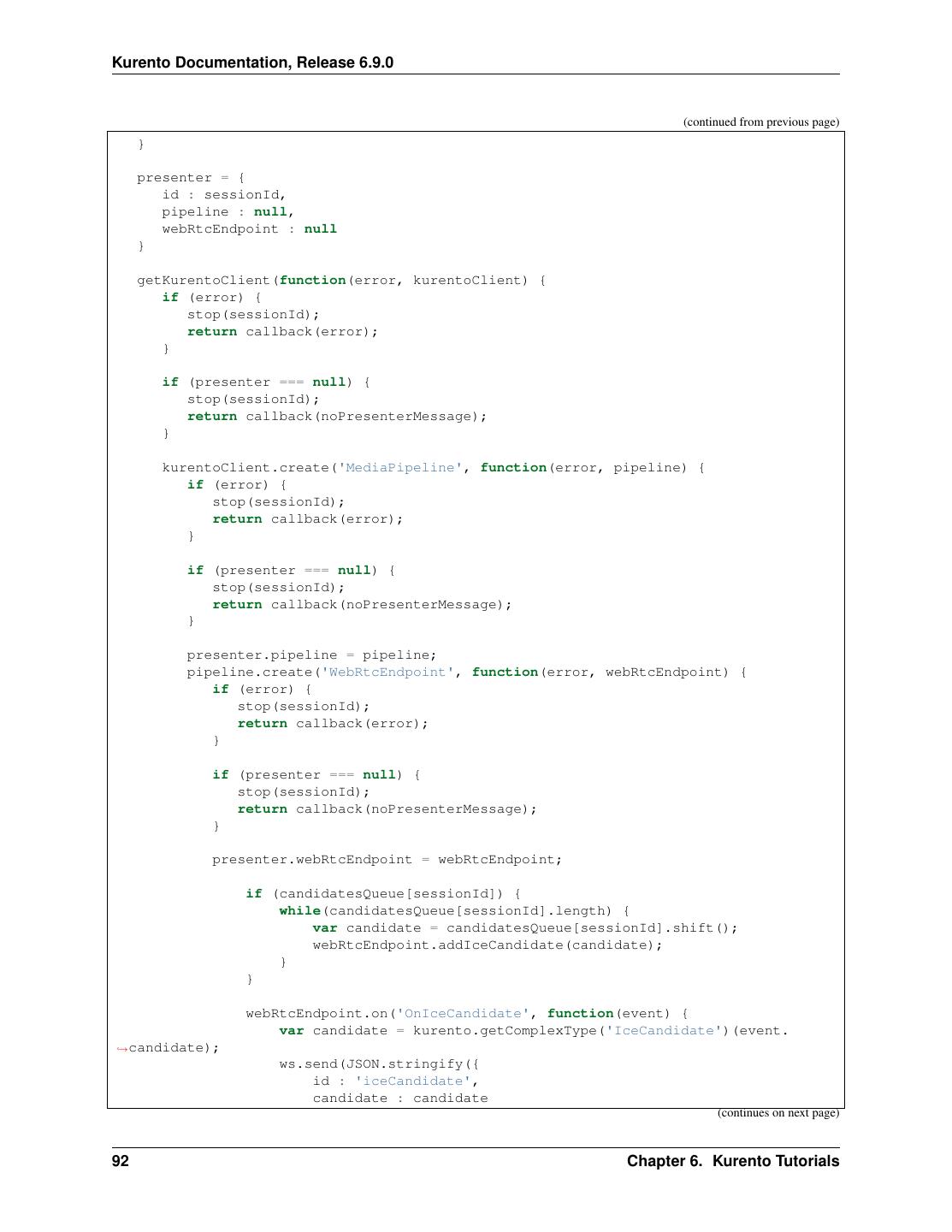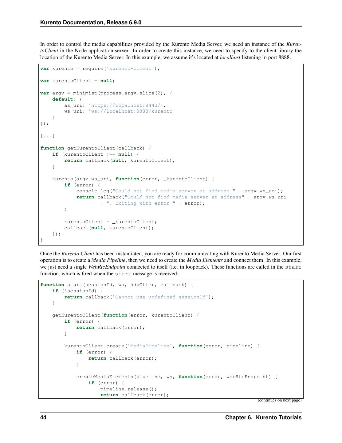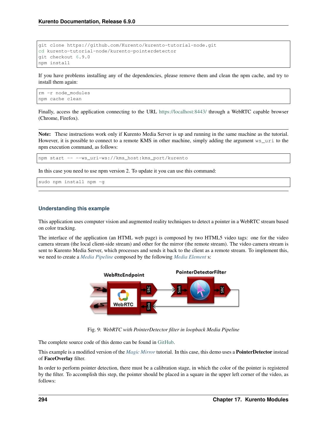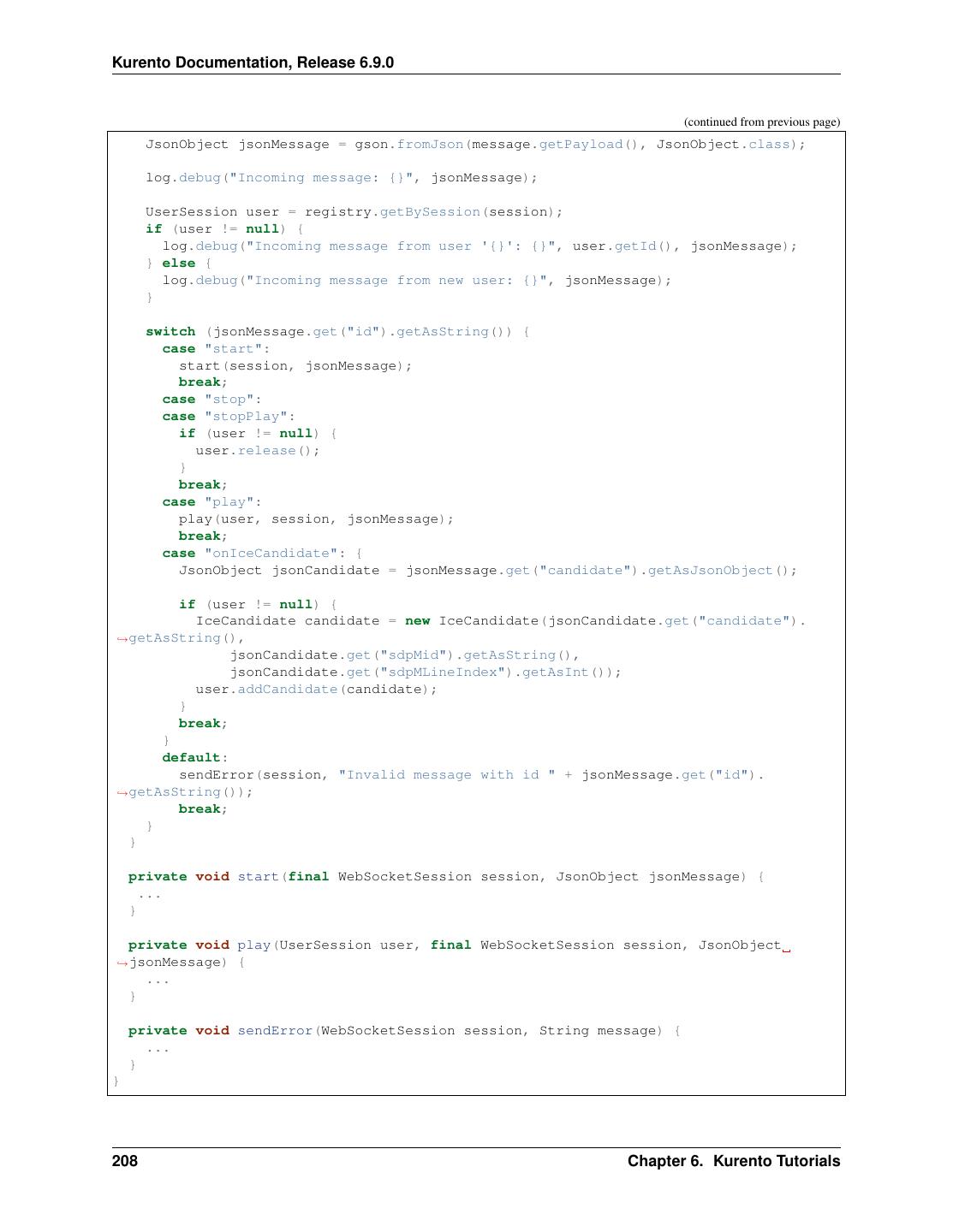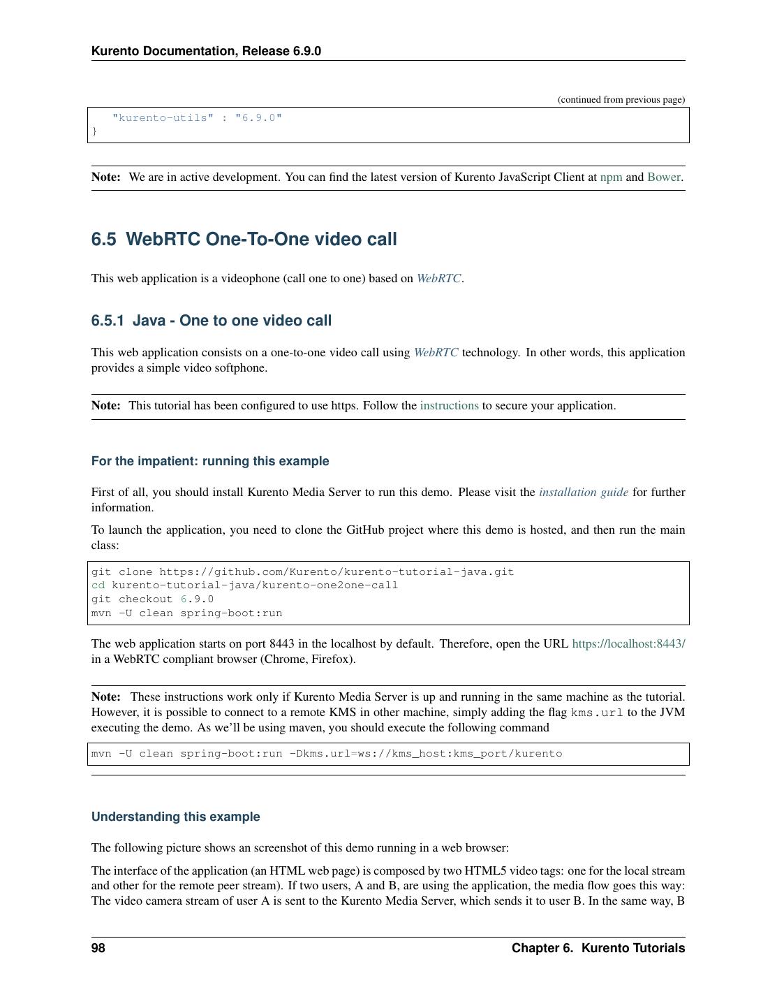 5 . 16.2 Kurento API over JSON-RPC . . . . . . . . . . . . . . . . . . . . . . . . . . . . . . . . . . . . . . 269 16.3 Network issues . . . . . . . . . . . . . . . . . . . . . . . . . . . . . . . . . . . . . . . . . . . . . . 274 16.4 Example: WebRTC in loopback . . . . . . . . . . . . . . . . . . . . . . . . . . . . . . . . . . . . . 275 16.5 Creating a custom Kurento Client . . . . . . . . . . . . . . . . . . . . . . . . . . . . . . . . . . . . 277 17 Kurento Modules 279 17.1 Module Tutorial - Pointer Detector Filter . . . . . . . . . . . . . . . . . . . . . . . . . . . . . . . . 280 17.2 Module Tutorial - Chroma Filter . . . . . . . . . . . . . . . . . . . . . . . . . . . . . . . . . . . . . 300 17.3 Module Tutorial - Crowd Detector Filter . . . . . . . . . . . . . . . . . . . . . . . . . . . . . . . . 316 17.4 Module Tutorial - Plate Detector Filter . . . . . . . . . . . . . . . . . . . . . . . . . . . . . . . . . 334 18 Kurento Utils JS 349 18.1 Overview . . . . . . . . . . . . . . . . . . . . . . . . . . . . . . . . . . . . . . . . . . . . . . . . . 349 18.2 How to use it . . . . . . . . . . . . . . . . . . . . . . . . . . . . . . . . . . . . . . . . . . . . . . . 349 18.3 Examples . . . . . . . . . . . . . . . . . . . . . . . . . . . . . . . . . . . . . . . . . . . . . . . . . 350 18.4 Using data channels . . . . . . . . . . . . . . . . . . . . . . . . . . . . . . . . . . . . . . . . . . . 351 18.5 Reference documentation . . . . . . . . . . . . . . . . . . . . . . . . . . . . . . . . . . . . . . . . 352 18.6 Souce code . . . . . . . . . . . . . . . . . . . . . . . . . . . . . . . . . . . . . . . . . . . . . . . . 356 18.7 Build for browser . . . . . . . . . . . . . . . . . . . . . . . . . . . . . . . . . . . . . . . . . . . . . 356 19 Endpoint Events 357 19.1 MediaObject events . . . . . . . . . . . . . . . . . . . . . . . . . . . . . . . . . . . . . . . . . . . 358 19.2 MediaElement events . . . . . . . . . . . . . . . . . . . . . . . . . . . . . . . . . . . . . . . . . . 358 19.3 BaseRtpEndpoint events . . . . . . . . . . . . . . . . . . . . . . . . . . . . . . . . . . . . . . . . . 359 19.4 WebRtcEndpoint events . . . . . . . . . . . . . . . . . . . . . . . . . . . . . . . . . . . . . . . . . 360 19.5 Sample sequence of events: WebRtcEndpoint . . . . . . . . . . . . . . . . . . . . . . . . . . . . . . 363 20 NAT Traversal 365 20.1 WebRTC with ICE . . . . . . . . . . . . . . . . . . . . . . . . . . . . . . . . . . . . . . . . . . . . 365 20.2 RTP without ICE . . . . . . . . . . . . . . . . . . . . . . . . . . . . . . . . . . . . . . . . . . . . . 365 21 Securing Kurento Applications 369 21.1 Securing Application Servers . . . . . . . . . . . . . . . . . . . . . . . . . . . . . . . . . . . . . . 369 21.2 Securing server applications . . . . . . . . . . . . . . . . . . . . . . . . . . . . . . . . . . . . . . . 371 22 WebRTC Statistics 373 22.1 Introduction . . . . . . . . . . . . . . . . . . . . . . . . . . . . . . . . . . . . . . . . . . . . . . . 373 22.2 API description . . . . . . . . . . . . . . . . . . . . . . . . . . . . . . . . . . . . . . . . . . . . . . 373 22.3 Example . . . . . . . . . . . . . . . . . . . . . . . . . . . . . . . . . . . . . . . . . . . . . . . . . 375 23 Debug Logging 377 23.1 Logging levels and components . . . . . . . . . . . . . . . . . . . . . . . . . . . . . . . . . . . . . 378 23.2 Suggested levels . . . . . . . . . . . . . . . . . . . . . . . . . . . . . . . . . . . . . . . . . . . . . 379 23.3 3rd-Party libraries . . . . . . . . . . . . . . . . . . . . . . . . . . . . . . . . . . . . . . . . . . . . 380 24 Kurento Team 383 25 Contribution Guide 385 26 Code of Conduct 387 27 Release Notes 389 27.1 6.9.0 (Dec 2018) . . . . . . . . . . . . . . . . . . . . . . . . . . . . . . . . . . . . . . . . . . . . . 389 27.2 6.8.1 (Oct 2018) . . . . . . . . . . . . . . . . . . . . . . . . . . . . . . . . . . . . . . . . . . . . . 392 27.3 6.7.2 (May 2018) . . . . . . . . . . . . . . . . . . . . . . . . . . . . . . . . . . . . . . . . . . . . . 393 iii