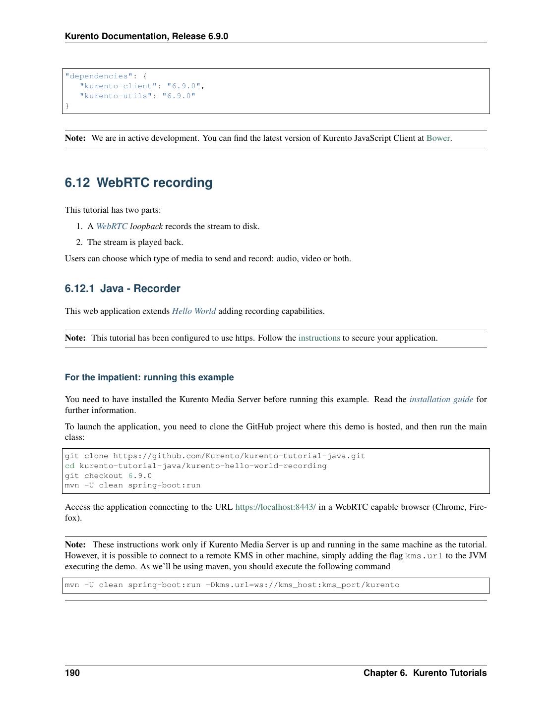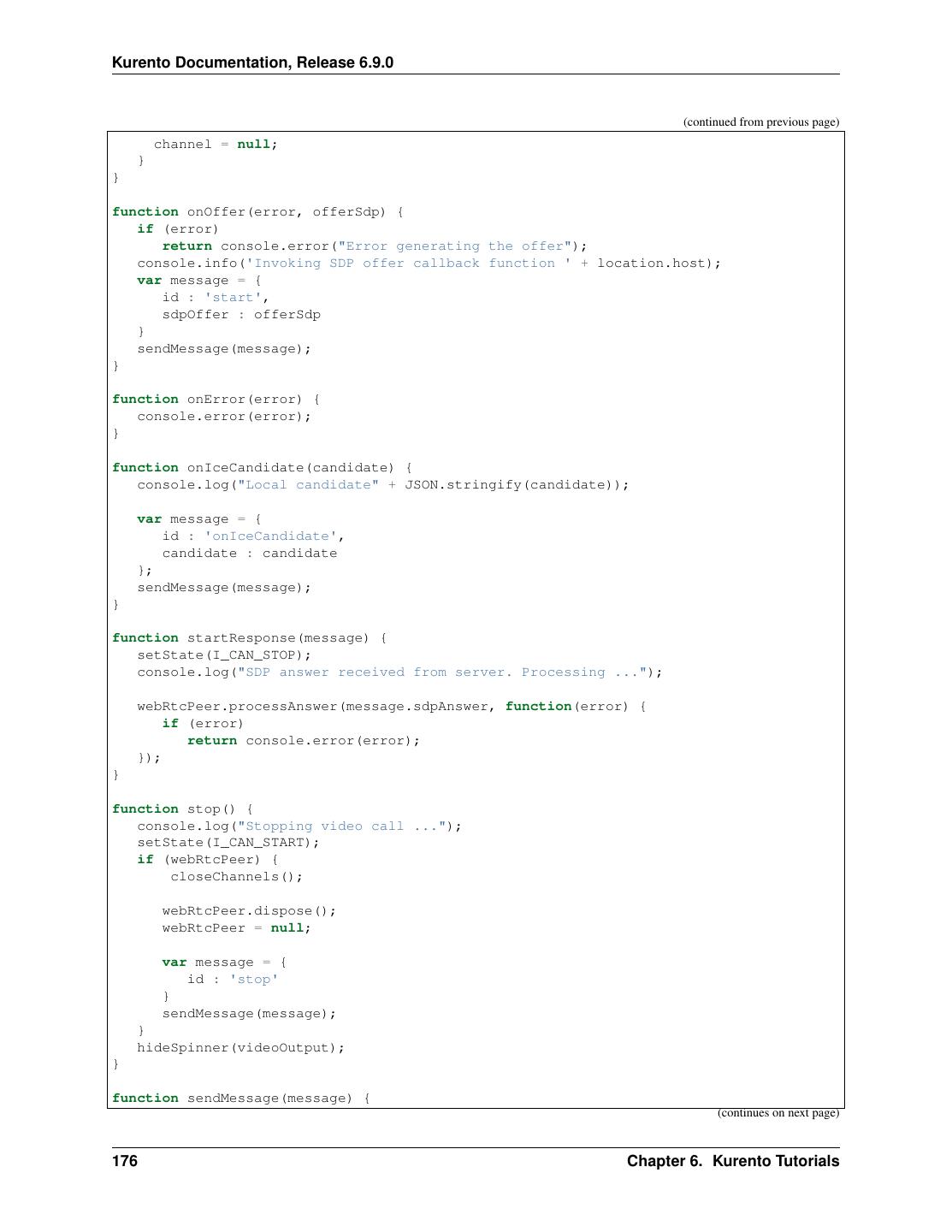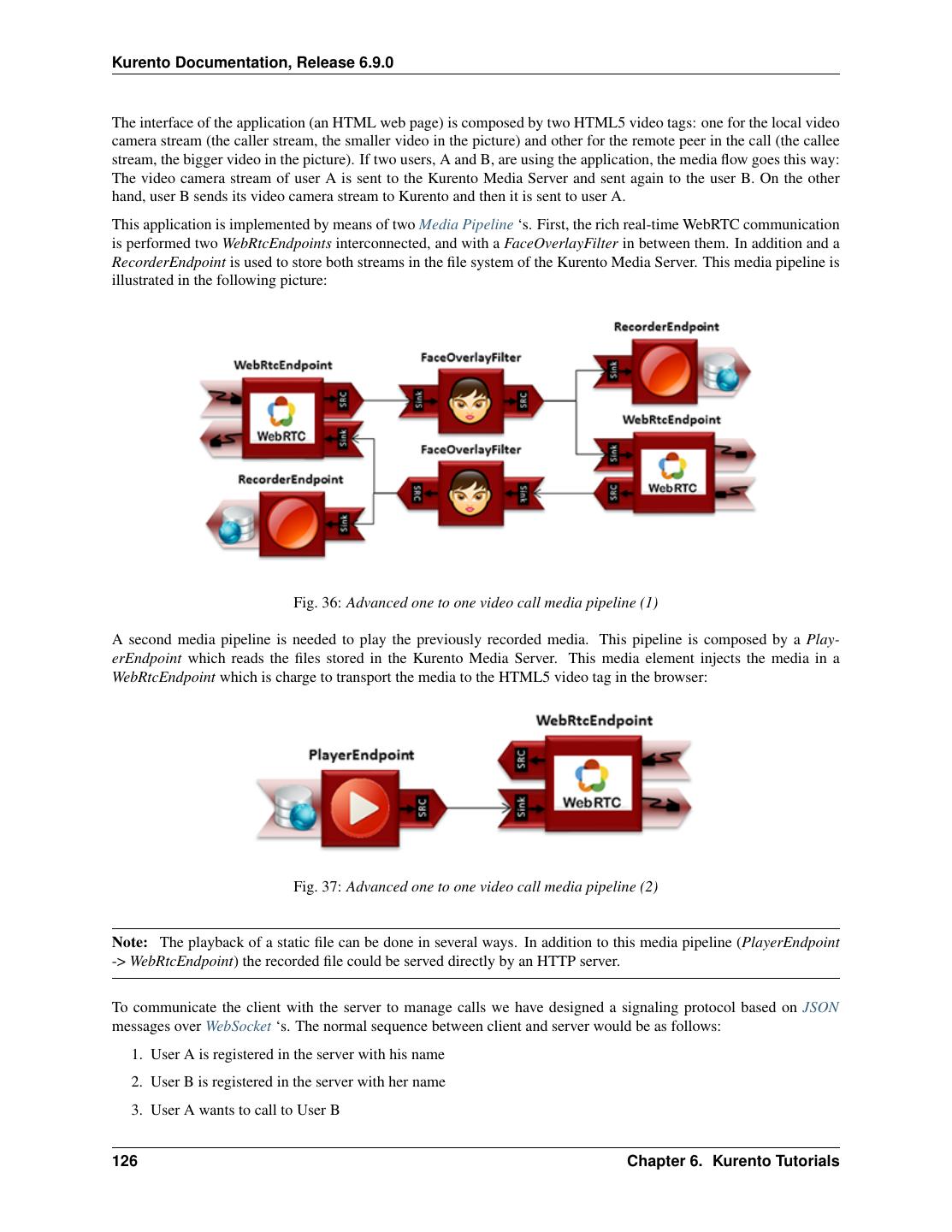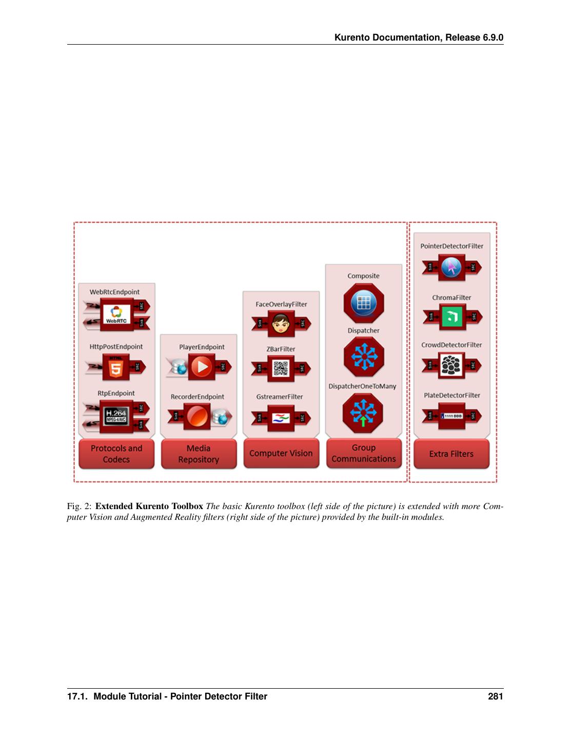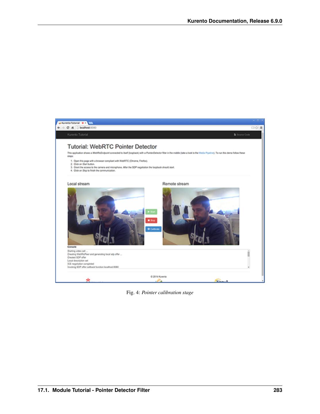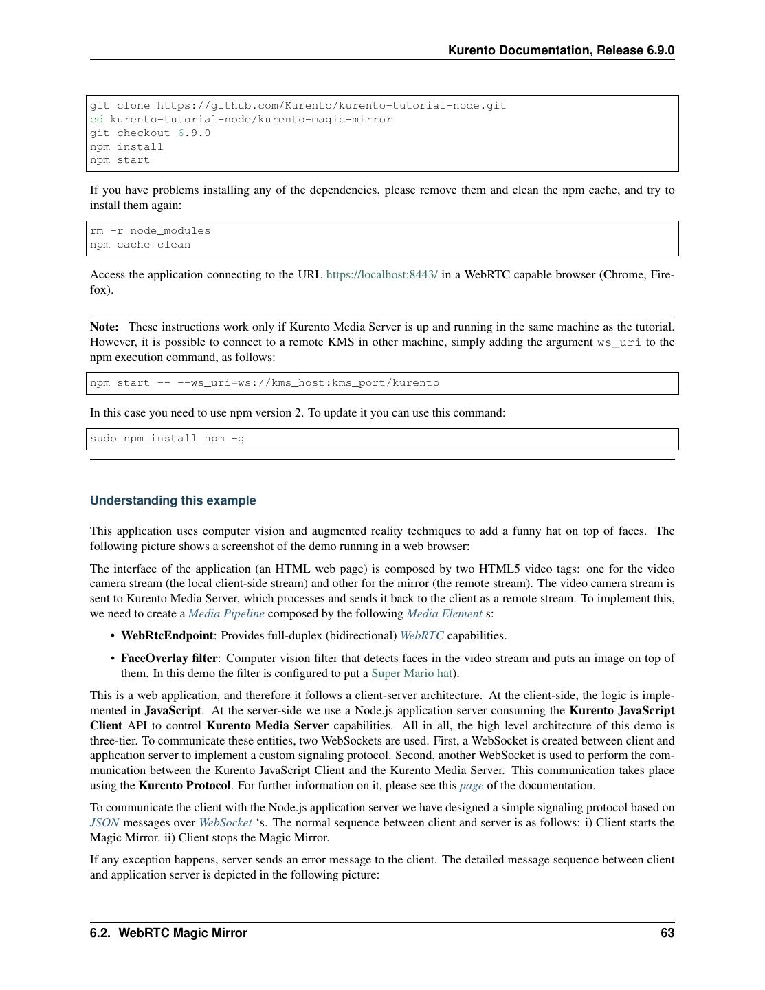 5 . 16.2 Kurento API over JSON-RPC . . . . . . . . . . . . . . . . . . . . . . . . . . . . . . . . . . . . . . 269 16.3 Network issues . . . . . . . . . . . . . . . . . . . . . . . . . . . . . . . . . . . . . . . . . . . . . . 274 16.4 Example: WebRTC in loopback . . . . . . . . . . . . . . . . . . . . . . . . . . . . . . . . . . . . . 275 16.5 Creating a custom Kurento Client . . . . . . . . . . . . . . . . . . . . . . . . . . . . . . . . . . . . 277 17 Kurento Modules 279 17.1 Module Tutorial - Pointer Detector Filter . . . . . . . . . . . . . . . . . . . . . . . . . . . . . . . . 280 17.2 Module Tutorial - Chroma Filter . . . . . . . . . . . . . . . . . . . . . . . . . . . . . . . . . . . . . 300 17.3 Module Tutorial - Crowd Detector Filter . . . . . . . . . . . . . . . . . . . . . . . . . . . . . . . . 316 17.4 Module Tutorial - Plate Detector Filter . . . . . . . . . . . . . . . . . . . . . . . . . . . . . . . . . 334 18 Kurento Utils JS 349 18.1 Overview . . . . . . . . . . . . . . . . . . . . . . . . . . . . . . . . . . . . . . . . . . . . . . . . . 349 18.2 How to use it . . . . . . . . . . . . . . . . . . . . . . . . . . . . . . . . . . . . . . . . . . . . . . . 349 18.3 Examples . . . . . . . . . . . . . . . . . . . . . . . . . . . . . . . . . . . . . . . . . . . . . . . . . 350 18.4 Using data channels . . . . . . . . . . . . . . . . . . . . . . . . . . . . . . . . . . . . . . . . . . . 351 18.5 Reference documentation . . . . . . . . . . . . . . . . . . . . . . . . . . . . . . . . . . . . . . . . 352 18.6 Souce code . . . . . . . . . . . . . . . . . . . . . . . . . . . . . . . . . . . . . . . . . . . . . . . . 356 18.7 Build for browser . . . . . . . . . . . . . . . . . . . . . . . . . . . . . . . . . . . . . . . . . . . . . 356 19 Endpoint Events 357 19.1 MediaObject events . . . . . . . . . . . . . . . . . . . . . . . . . . . . . . . . . . . . . . . . . . . 358 19.2 MediaElement events . . . . . . . . . . . . . . . . . . . . . . . . . . . . . . . . . . . . . . . . . . 358 19.3 BaseRtpEndpoint events . . . . . . . . . . . . . . . . . . . . . . . . . . . . . . . . . . . . . . . . . 359 19.4 WebRtcEndpoint events . . . . . . . . . . . . . . . . . . . . . . . . . . . . . . . . . . . . . . . . . 360 19.5 Sample sequence of events: WebRtcEndpoint . . . . . . . . . . . . . . . . . . . . . . . . . . . . . . 363 20 NAT Traversal 365 20.1 WebRTC with ICE . . . . . . . . . . . . . . . . . . . . . . . . . . . . . . . . . . . . . . . . . . . . 365 20.2 RTP without ICE . . . . . . . . . . . . . . . . . . . . . . . . . . . . . . . . . . . . . . . . . . . . . 365 21 Securing Kurento Applications 369 21.1 Securing Application Servers . . . . . . . . . . . . . . . . . . . . . . . . . . . . . . . . . . . . . . 369 21.2 Securing server applications . . . . . . . . . . . . . . . . . . . . . . . . . . . . . . . . . . . . . . . 371 22 WebRTC Statistics 373 22.1 Introduction . . . . . . . . . . . . . . . . . . . . . . . . . . . . . . . . . . . . . . . . . . . . . . . 373 22.2 API description . . . . . . . . . . . . . . . . . . . . . . . . . . . . . . . . . . . . . . . . . . . . . . 373 22.3 Example . . . . . . . . . . . . . . . . . . . . . . . . . . . . . . . . . . . . . . . . . . . . . . . . . 375 23 Debug Logging 377 23.1 Logging levels and components . . . . . . . . . . . . . . . . . . . . . . . . . . . . . . . . . . . . . 378 23.2 Suggested levels . . . . . . . . . . . . . . . . . . . . . . . . . . . . . . . . . . . . . . . . . . . . . 379 23.3 3rd-Party libraries . . . . . . . . . . . . . . . . . . . . . . . . . . . . . . . . . . . . . . . . . . . . 380 24 Kurento Team 383 25 Contribution Guide 385 26 Code of Conduct 387 27 Release Notes 389 27.1 6.9.0 (Dec 2018) . . . . . . . . . . . . . . . . . . . . . . . . . . . . . . . . . . . . . . . . . . . . . 389 27.2 6.8.1 (Oct 2018) . . . . . . . . . . . . . . . . . . . . . . . . . . . . . . . . . . . . . . . . . . . . . 392 27.3 6.7.2 (May 2018) . . . . . . . . . . . . . . . . . . . . . . . . . . . . . . . . . . . . . . . . . . . . . 393 iii