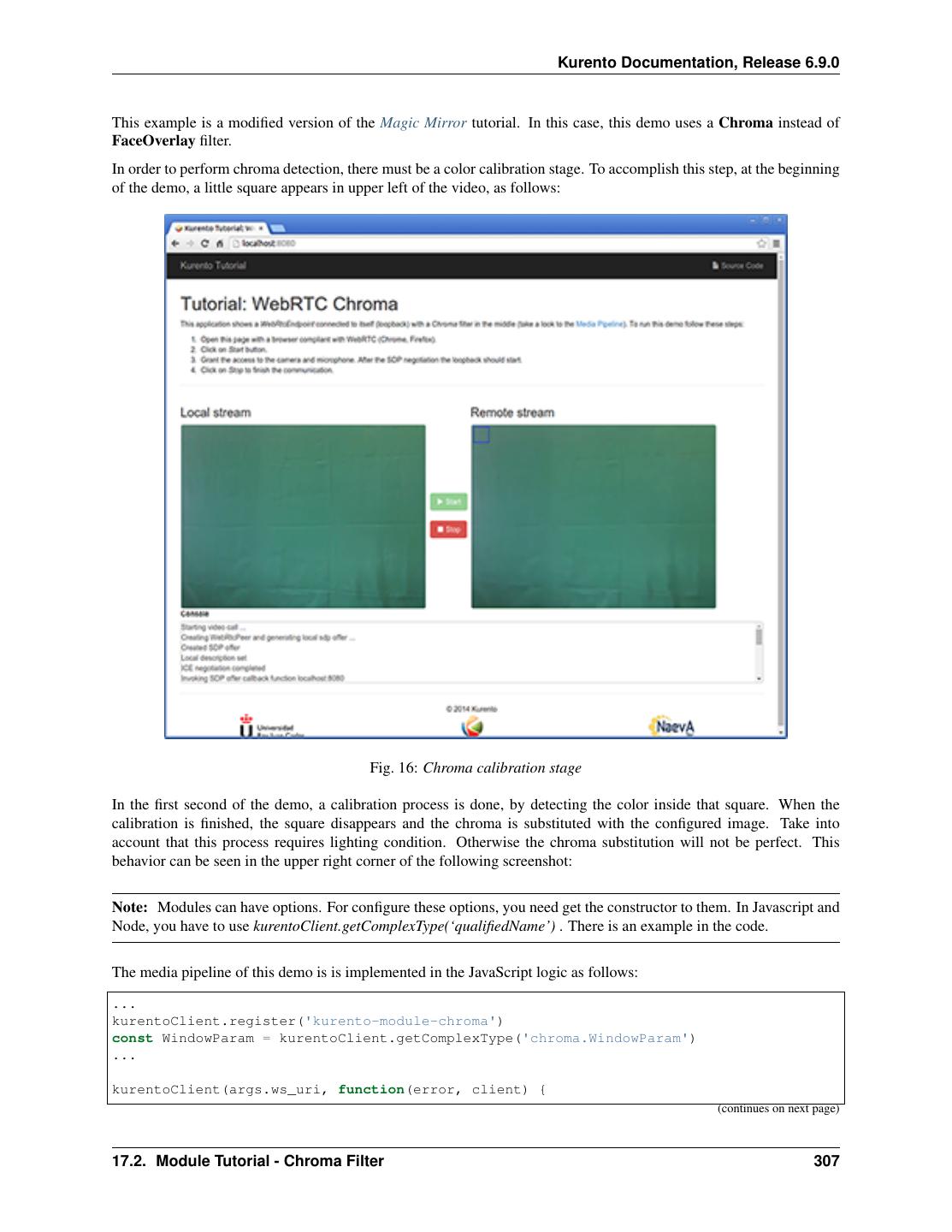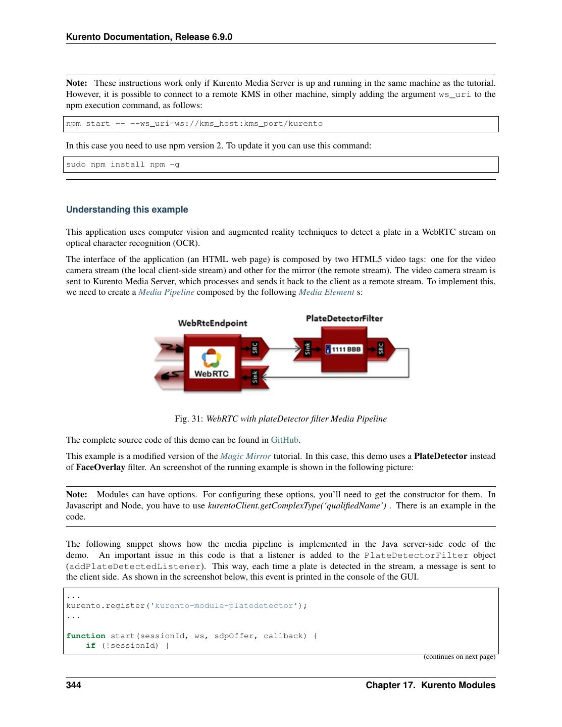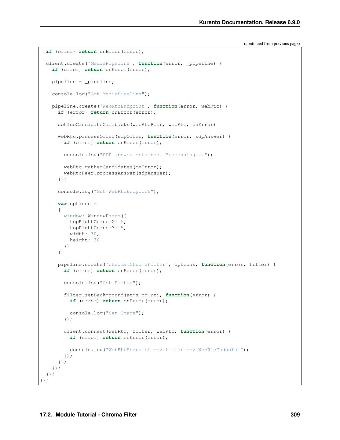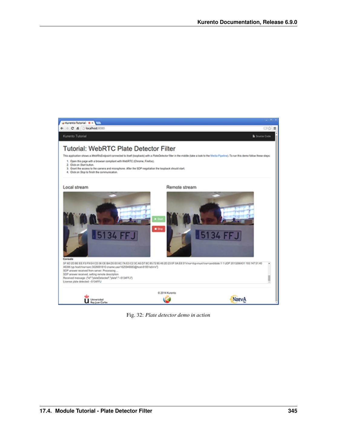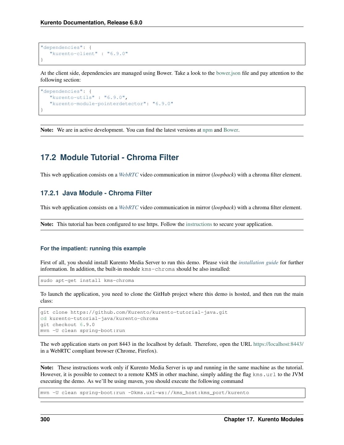 5 . 16.2 Kurento API over JSON-RPC . . . . . . . . . . . . . . . . . . . . . . . . . . . . . . . . . . . . . . 269 16.3 Network issues . . . . . . . . . . . . . . . . . . . . . . . . . . . . . . . . . . . . . . . . . . . . . . 274 16.4 Example: WebRTC in loopback . . . . . . . . . . . . . . . . . . . . . . . . . . . . . . . . . . . . . 275 16.5 Creating a custom Kurento Client . . . . . . . . . . . . . . . . . . . . . . . . . . . . . . . . . . . . 277 17 Kurento Modules 279 17.1 Module Tutorial - Pointer Detector Filter . . . . . . . . . . . . . . . . . . . . . . . . . . . . . . . . 280 17.2 Module Tutorial - Chroma Filter . . . . . . . . . . . . . . . . . . . . . . . . . . . . . . . . . . . . . 300 17.3 Module Tutorial - Crowd Detector Filter . . . . . . . . . . . . . . . . . . . . . . . . . . . . . . . . 316 17.4 Module Tutorial - Plate Detector Filter . . . . . . . . . . . . . . . . . . . . . . . . . . . . . . . . . 334 18 Kurento Utils JS 349 18.1 Overview . . . . . . . . . . . . . . . . . . . . . . . . . . . . . . . . . . . . . . . . . . . . . . . . . 349 18.2 How to use it . . . . . . . . . . . . . . . . . . . . . . . . . . . . . . . . . . . . . . . . . . . . . . . 349 18.3 Examples . . . . . . . . . . . . . . . . . . . . . . . . . . . . . . . . . . . . . . . . . . . . . . . . . 350 18.4 Using data channels . . . . . . . . . . . . . . . . . . . . . . . . . . . . . . . . . . . . . . . . . . . 351 18.5 Reference documentation . . . . . . . . . . . . . . . . . . . . . . . . . . . . . . . . . . . . . . . . 352 18.6 Souce code . . . . . . . . . . . . . . . . . . . . . . . . . . . . . . . . . . . . . . . . . . . . . . . . 356 18.7 Build for browser . . . . . . . . . . . . . . . . . . . . . . . . . . . . . . . . . . . . . . . . . . . . . 356 19 Endpoint Events 357 19.1 MediaObject events . . . . . . . . . . . . . . . . . . . . . . . . . . . . . . . . . . . . . . . . . . . 358 19.2 MediaElement events . . . . . . . . . . . . . . . . . . . . . . . . . . . . . . . . . . . . . . . . . . 358 19.3 BaseRtpEndpoint events . . . . . . . . . . . . . . . . . . . . . . . . . . . . . . . . . . . . . . . . . 359 19.4 WebRtcEndpoint events . . . . . . . . . . . . . . . . . . . . . . . . . . . . . . . . . . . . . . . . . 360 19.5 Sample sequence of events: WebRtcEndpoint . . . . . . . . . . . . . . . . . . . . . . . . . . . . . . 363 20 NAT Traversal 365 20.1 WebRTC with ICE . . . . . . . . . . . . . . . . . . . . . . . . . . . . . . . . . . . . . . . . . . . . 365 20.2 RTP without ICE . . . . . . . . . . . . . . . . . . . . . . . . . . . . . . . . . . . . . . . . . . . . . 365 21 Securing Kurento Applications 369 21.1 Securing Application Servers . . . . . . . . . . . . . . . . . . . . . . . . . . . . . . . . . . . . . . 369 21.2 Securing server applications . . . . . . . . . . . . . . . . . . . . . . . . . . . . . . . . . . . . . . . 371 22 WebRTC Statistics 373 22.1 Introduction . . . . . . . . . . . . . . . . . . . . . . . . . . . . . . . . . . . . . . . . . . . . . . . 373 22.2 API description . . . . . . . . . . . . . . . . . . . . . . . . . . . . . . . . . . . . . . . . . . . . . . 373 22.3 Example . . . . . . . . . . . . . . . . . . . . . . . . . . . . . . . . . . . . . . . . . . . . . . . . . 375 23 Debug Logging 377 23.1 Logging levels and components . . . . . . . . . . . . . . . . . . . . . . . . . . . . . . . . . . . . . 378 23.2 Suggested levels . . . . . . . . . . . . . . . . . . . . . . . . . . . . . . . . . . . . . . . . . . . . . 379 23.3 3rd-Party libraries . . . . . . . . . . . . . . . . . . . . . . . . . . . . . . . . . . . . . . . . . . . . 380 24 Kurento Team 383 25 Contribution Guide 385 26 Code of Conduct 387 27 Release Notes 389 27.1 6.9.0 (Dec 2018) . . . . . . . . . . . . . . . . . . . . . . . . . . . . . . . . . . . . . . . . . . . . . 389 27.2 6.8.1 (Oct 2018) . . . . . . . . . . . . . . . . . . . . . . . . . . . . . . . . . . . . . . . . . . . . . 392 27.3 6.7.2 (May 2018) . . . . . . . . . . . . . . . . . . . . . . . . . . . . . . . . . . . . . . . . . . . . . 393 iii