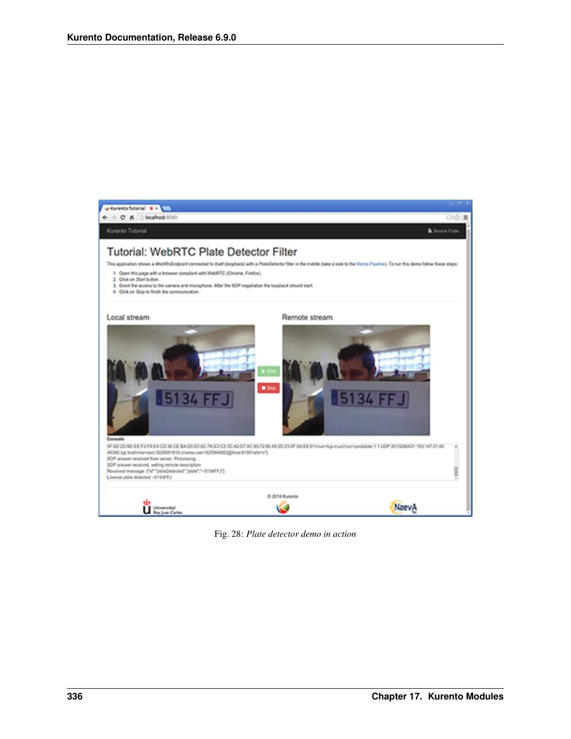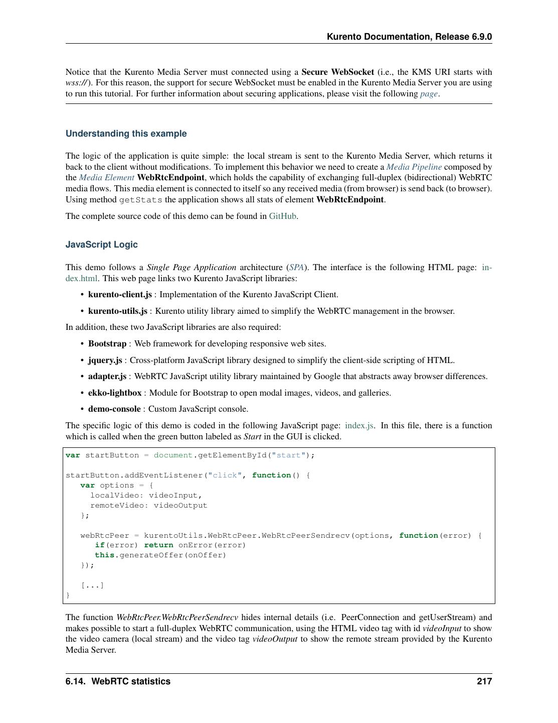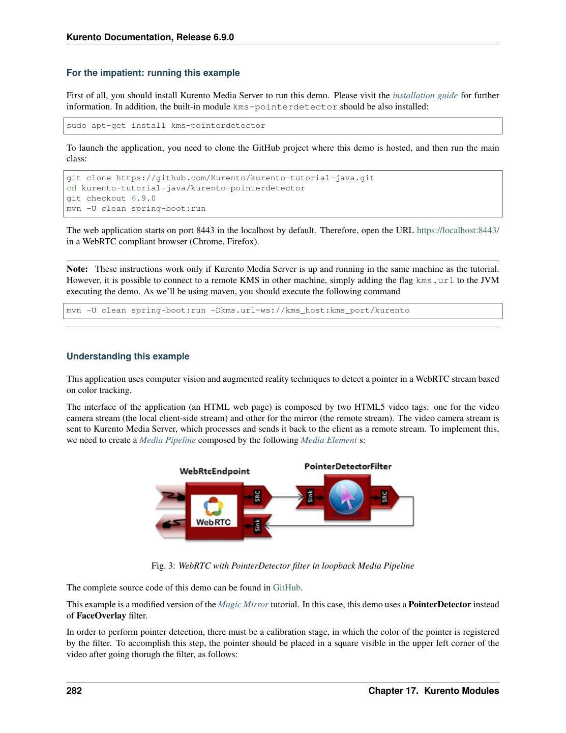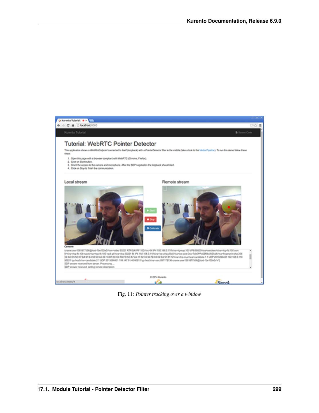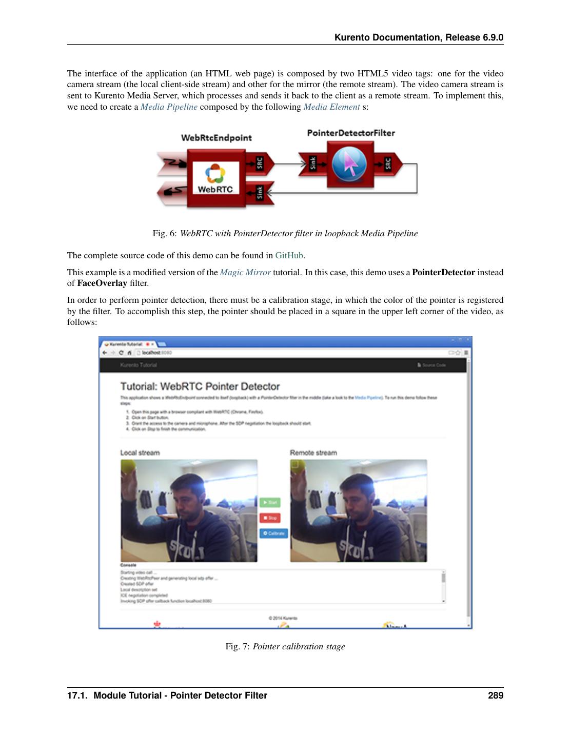 5 . 16.2 Kurento API over JSON-RPC . . . . . . . . . . . . . . . . . . . . . . . . . . . . . . . . . . . . . . 269 16.3 Network issues . . . . . . . . . . . . . . . . . . . . . . . . . . . . . . . . . . . . . . . . . . . . . . 274 16.4 Example: WebRTC in loopback . . . . . . . . . . . . . . . . . . . . . . . . . . . . . . . . . . . . . 275 16.5 Creating a custom Kurento Client . . . . . . . . . . . . . . . . . . . . . . . . . . . . . . . . . . . . 277 17 Kurento Modules 279 17.1 Module Tutorial - Pointer Detector Filter . . . . . . . . . . . . . . . . . . . . . . . . . . . . . . . . 280 17.2 Module Tutorial - Chroma Filter . . . . . . . . . . . . . . . . . . . . . . . . . . . . . . . . . . . . . 300 17.3 Module Tutorial - Crowd Detector Filter . . . . . . . . . . . . . . . . . . . . . . . . . . . . . . . . 316 17.4 Module Tutorial - Plate Detector Filter . . . . . . . . . . . . . . . . . . . . . . . . . . . . . . . . . 334 18 Kurento Utils JS 349 18.1 Overview . . . . . . . . . . . . . . . . . . . . . . . . . . . . . . . . . . . . . . . . . . . . . . . . . 349 18.2 How to use it . . . . . . . . . . . . . . . . . . . . . . . . . . . . . . . . . . . . . . . . . . . . . . . 349 18.3 Examples . . . . . . . . . . . . . . . . . . . . . . . . . . . . . . . . . . . . . . . . . . . . . . . . . 350 18.4 Using data channels . . . . . . . . . . . . . . . . . . . . . . . . . . . . . . . . . . . . . . . . . . . 351 18.5 Reference documentation . . . . . . . . . . . . . . . . . . . . . . . . . . . . . . . . . . . . . . . . 352 18.6 Souce code . . . . . . . . . . . . . . . . . . . . . . . . . . . . . . . . . . . . . . . . . . . . . . . . 356 18.7 Build for browser . . . . . . . . . . . . . . . . . . . . . . . . . . . . . . . . . . . . . . . . . . . . . 356 19 Endpoint Events 357 19.1 MediaObject events . . . . . . . . . . . . . . . . . . . . . . . . . . . . . . . . . . . . . . . . . . . 358 19.2 MediaElement events . . . . . . . . . . . . . . . . . . . . . . . . . . . . . . . . . . . . . . . . . . 358 19.3 BaseRtpEndpoint events . . . . . . . . . . . . . . . . . . . . . . . . . . . . . . . . . . . . . . . . . 359 19.4 WebRtcEndpoint events . . . . . . . . . . . . . . . . . . . . . . . . . . . . . . . . . . . . . . . . . 360 19.5 Sample sequence of events: WebRtcEndpoint . . . . . . . . . . . . . . . . . . . . . . . . . . . . . . 363 20 NAT Traversal 365 20.1 WebRTC with ICE . . . . . . . . . . . . . . . . . . . . . . . . . . . . . . . . . . . . . . . . . . . . 365 20.2 RTP without ICE . . . . . . . . . . . . . . . . . . . . . . . . . . . . . . . . . . . . . . . . . . . . . 365 21 Securing Kurento Applications 369 21.1 Securing Application Servers . . . . . . . . . . . . . . . . . . . . . . . . . . . . . . . . . . . . . . 369 21.2 Securing server applications . . . . . . . . . . . . . . . . . . . . . . . . . . . . . . . . . . . . . . . 371 22 WebRTC Statistics 373 22.1 Introduction . . . . . . . . . . . . . . . . . . . . . . . . . . . . . . . . . . . . . . . . . . . . . . . 373 22.2 API description . . . . . . . . . . . . . . . . . . . . . . . . . . . . . . . . . . . . . . . . . . . . . . 373 22.3 Example . . . . . . . . . . . . . . . . . . . . . . . . . . . . . . . . . . . . . . . . . . . . . . . . . 375 23 Debug Logging 377 23.1 Logging levels and components . . . . . . . . . . . . . . . . . . . . . . . . . . . . . . . . . . . . . 378 23.2 Suggested levels . . . . . . . . . . . . . . . . . . . . . . . . . . . . . . . . . . . . . . . . . . . . . 379 23.3 3rd-Party libraries . . . . . . . . . . . . . . . . . . . . . . . . . . . . . . . . . . . . . . . . . . . . 380 24 Kurento Team 383 25 Contribution Guide 385 26 Code of Conduct 387 27 Release Notes 389 27.1 6.9.0 (Dec 2018) . . . . . . . . . . . . . . . . . . . . . . . . . . . . . . . . . . . . . . . . . . . . . 389 27.2 6.8.1 (Oct 2018) . . . . . . . . . . . . . . . . . . . . . . . . . . . . . . . . . . . . . . . . . . . . . 392 27.3 6.7.2 (May 2018) . . . . . . . . . . . . . . . . . . . . . . . . . . . . . . . . . . . . . . . . . . . . . 393 iii