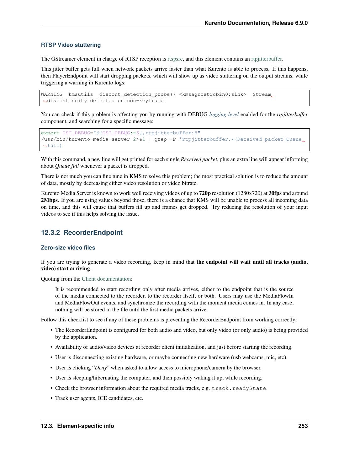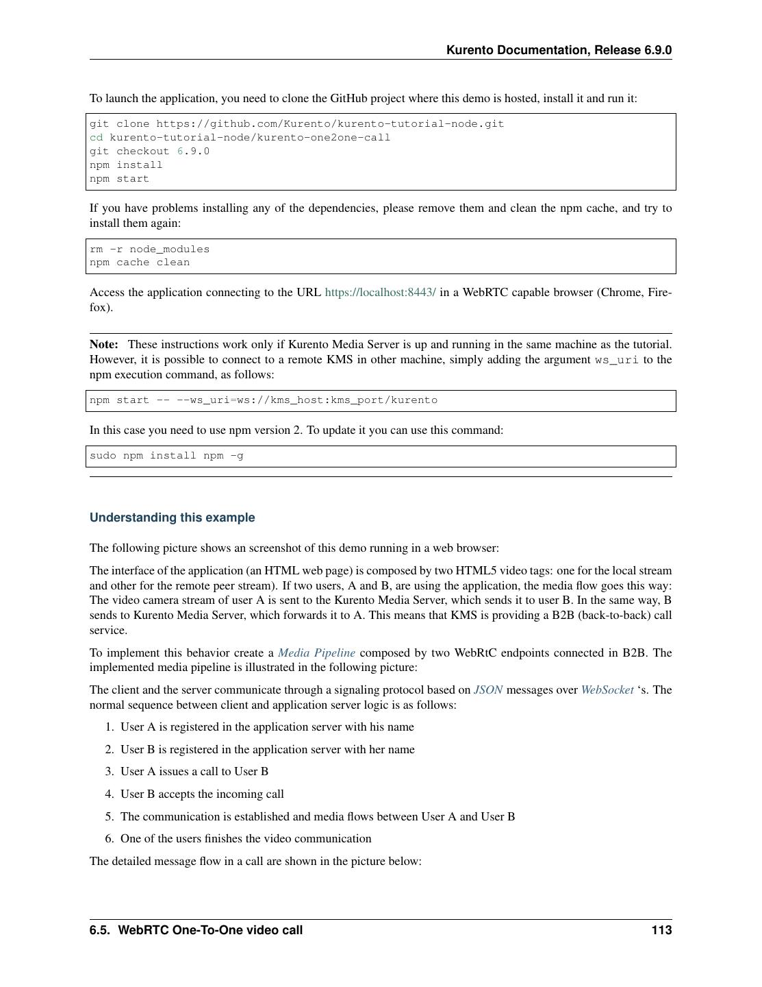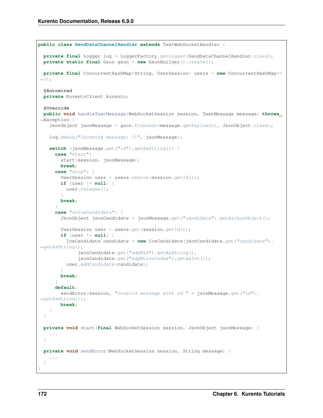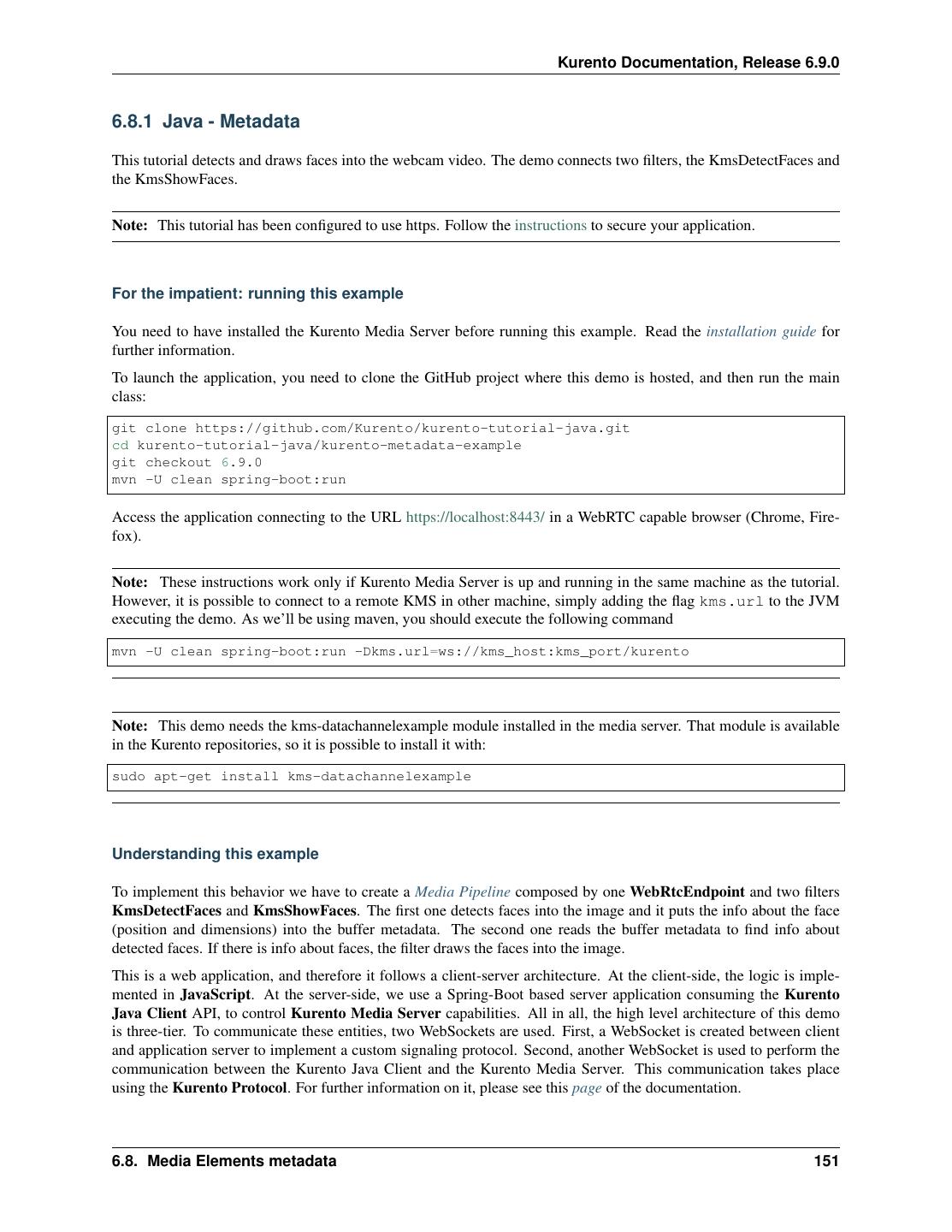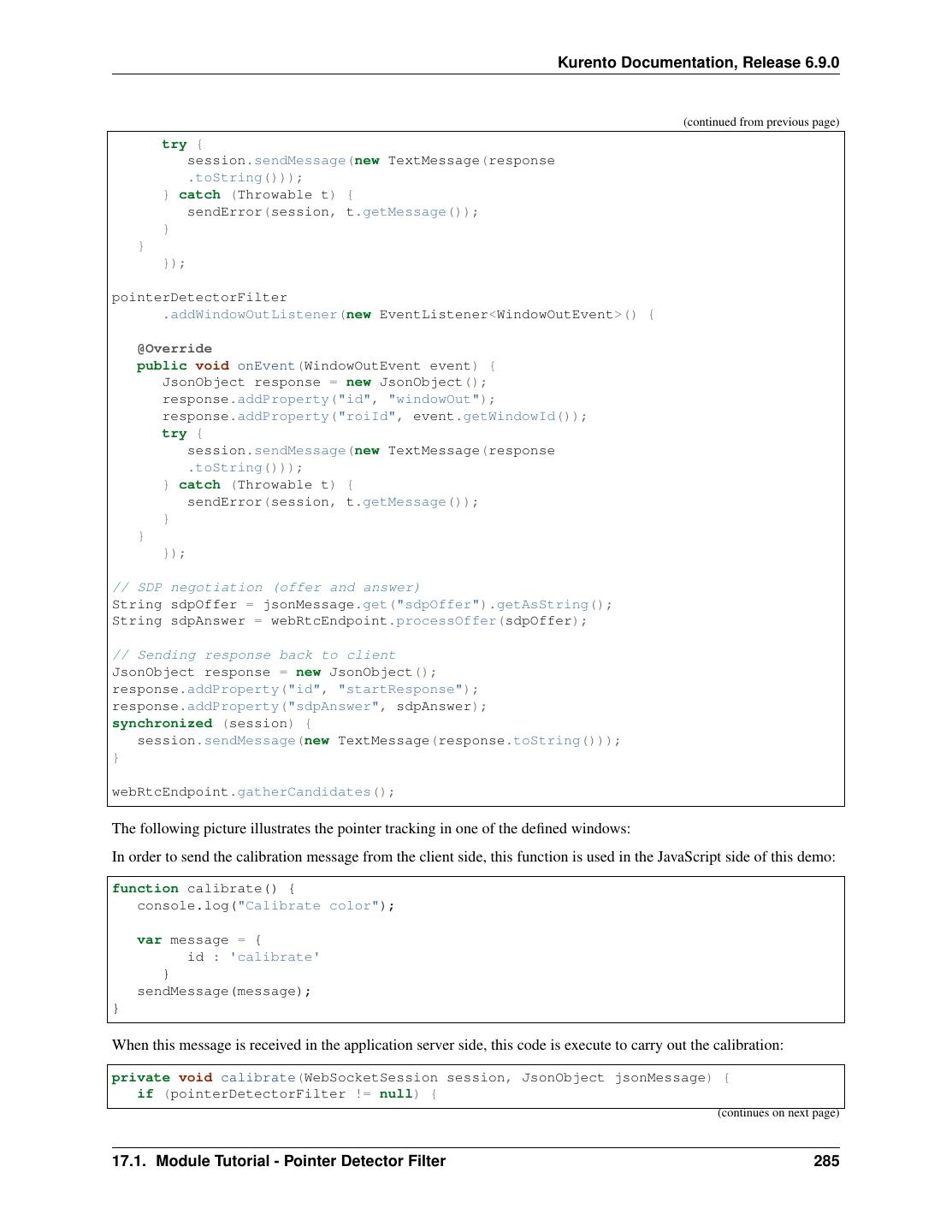 5 . 16.2 Kurento API over JSON-RPC . . . . . . . . . . . . . . . . . . . . . . . . . . . . . . . . . . . . . . 269 16.3 Network issues . . . . . . . . . . . . . . . . . . . . . . . . . . . . . . . . . . . . . . . . . . . . . . 274 16.4 Example: WebRTC in loopback . . . . . . . . . . . . . . . . . . . . . . . . . . . . . . . . . . . . . 275 16.5 Creating a custom Kurento Client . . . . . . . . . . . . . . . . . . . . . . . . . . . . . . . . . . . . 277 17 Kurento Modules 279 17.1 Module Tutorial - Pointer Detector Filter . . . . . . . . . . . . . . . . . . . . . . . . . . . . . . . . 280 17.2 Module Tutorial - Chroma Filter . . . . . . . . . . . . . . . . . . . . . . . . . . . . . . . . . . . . . 300 17.3 Module Tutorial - Crowd Detector Filter . . . . . . . . . . . . . . . . . . . . . . . . . . . . . . . . 316 17.4 Module Tutorial - Plate Detector Filter . . . . . . . . . . . . . . . . . . . . . . . . . . . . . . . . . 334 18 Kurento Utils JS 349 18.1 Overview . . . . . . . . . . . . . . . . . . . . . . . . . . . . . . . . . . . . . . . . . . . . . . . . . 349 18.2 How to use it . . . . . . . . . . . . . . . . . . . . . . . . . . . . . . . . . . . . . . . . . . . . . . . 349 18.3 Examples . . . . . . . . . . . . . . . . . . . . . . . . . . . . . . . . . . . . . . . . . . . . . . . . . 350 18.4 Using data channels . . . . . . . . . . . . . . . . . . . . . . . . . . . . . . . . . . . . . . . . . . . 351 18.5 Reference documentation . . . . . . . . . . . . . . . . . . . . . . . . . . . . . . . . . . . . . . . . 352 18.6 Souce code . . . . . . . . . . . . . . . . . . . . . . . . . . . . . . . . . . . . . . . . . . . . . . . . 356 18.7 Build for browser . . . . . . . . . . . . . . . . . . . . . . . . . . . . . . . . . . . . . . . . . . . . . 356 19 Endpoint Events 357 19.1 MediaObject events . . . . . . . . . . . . . . . . . . . . . . . . . . . . . . . . . . . . . . . . . . . 358 19.2 MediaElement events . . . . . . . . . . . . . . . . . . . . . . . . . . . . . . . . . . . . . . . . . . 358 19.3 BaseRtpEndpoint events . . . . . . . . . . . . . . . . . . . . . . . . . . . . . . . . . . . . . . . . . 359 19.4 WebRtcEndpoint events . . . . . . . . . . . . . . . . . . . . . . . . . . . . . . . . . . . . . . . . . 360 19.5 Sample sequence of events: WebRtcEndpoint . . . . . . . . . . . . . . . . . . . . . . . . . . . . . . 363 20 NAT Traversal 365 20.1 WebRTC with ICE . . . . . . . . . . . . . . . . . . . . . . . . . . . . . . . . . . . . . . . . . . . . 365 20.2 RTP without ICE . . . . . . . . . . . . . . . . . . . . . . . . . . . . . . . . . . . . . . . . . . . . . 365 21 Securing Kurento Applications 369 21.1 Securing Application Servers . . . . . . . . . . . . . . . . . . . . . . . . . . . . . . . . . . . . . . 369 21.2 Securing server applications . . . . . . . . . . . . . . . . . . . . . . . . . . . . . . . . . . . . . . . 371 22 WebRTC Statistics 373 22.1 Introduction . . . . . . . . . . . . . . . . . . . . . . . . . . . . . . . . . . . . . . . . . . . . . . . 373 22.2 API description . . . . . . . . . . . . . . . . . . . . . . . . . . . . . . . . . . . . . . . . . . . . . . 373 22.3 Example . . . . . . . . . . . . . . . . . . . . . . . . . . . . . . . . . . . . . . . . . . . . . . . . . 375 23 Debug Logging 377 23.1 Logging levels and components . . . . . . . . . . . . . . . . . . . . . . . . . . . . . . . . . . . . . 378 23.2 Suggested levels . . . . . . . . . . . . . . . . . . . . . . . . . . . . . . . . . . . . . . . . . . . . . 379 23.3 3rd-Party libraries . . . . . . . . . . . . . . . . . . . . . . . . . . . . . . . . . . . . . . . . . . . . 380 24 Kurento Team 383 25 Contribution Guide 385 26 Code of Conduct 387 27 Release Notes 389 27.1 6.9.0 (Dec 2018) . . . . . . . . . . . . . . . . . . . . . . . . . . . . . . . . . . . . . . . . . . . . . 389 27.2 6.8.1 (Oct 2018) . . . . . . . . . . . . . . . . . . . . . . . . . . . . . . . . . . . . . . . . . . . . . 392 27.3 6.7.2 (May 2018) . . . . . . . . . . . . . . . . . . . . . . . . . . . . . . . . . . . . . . . . . . . . . 393 iii
