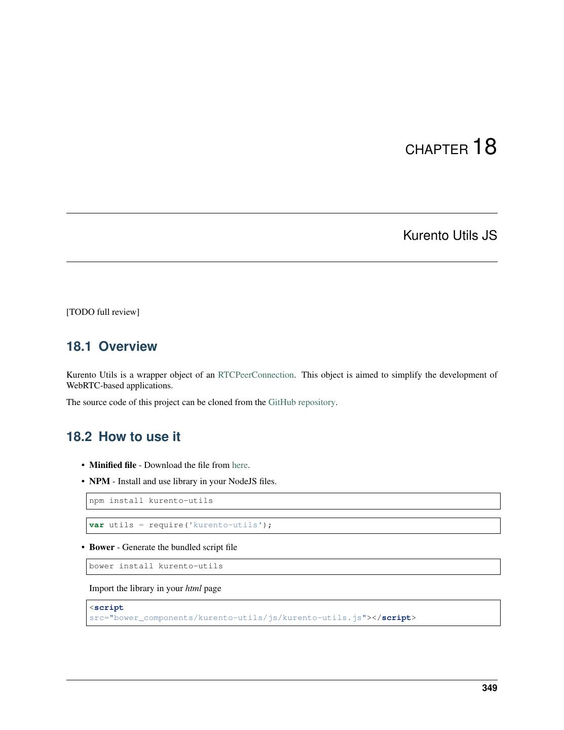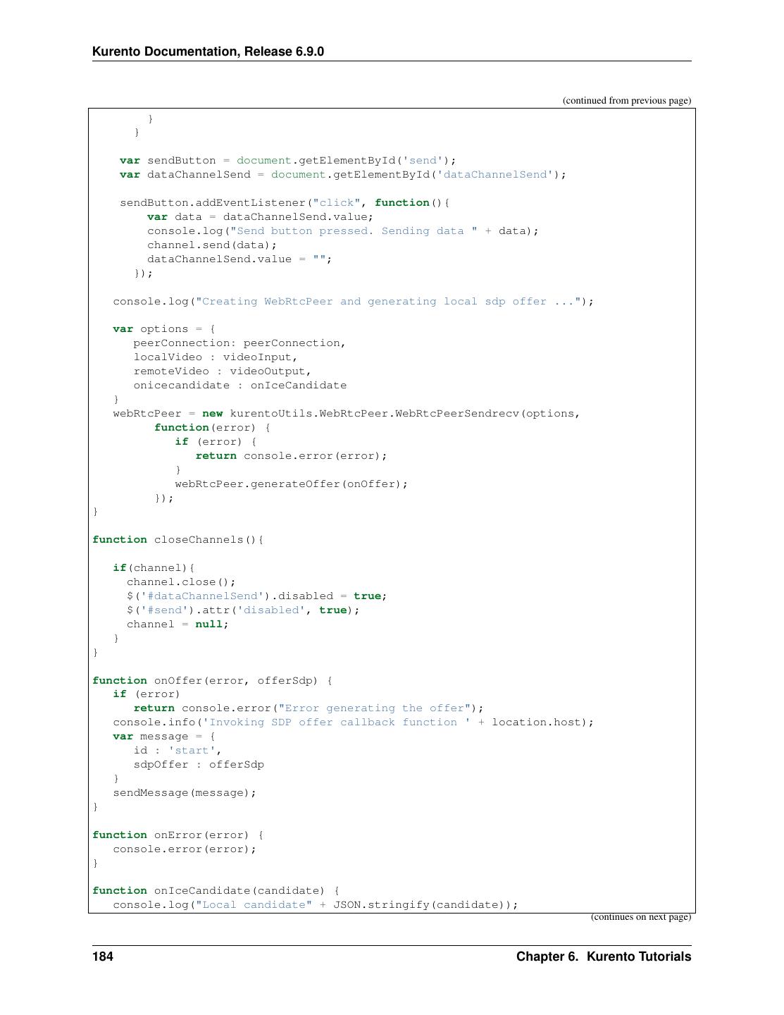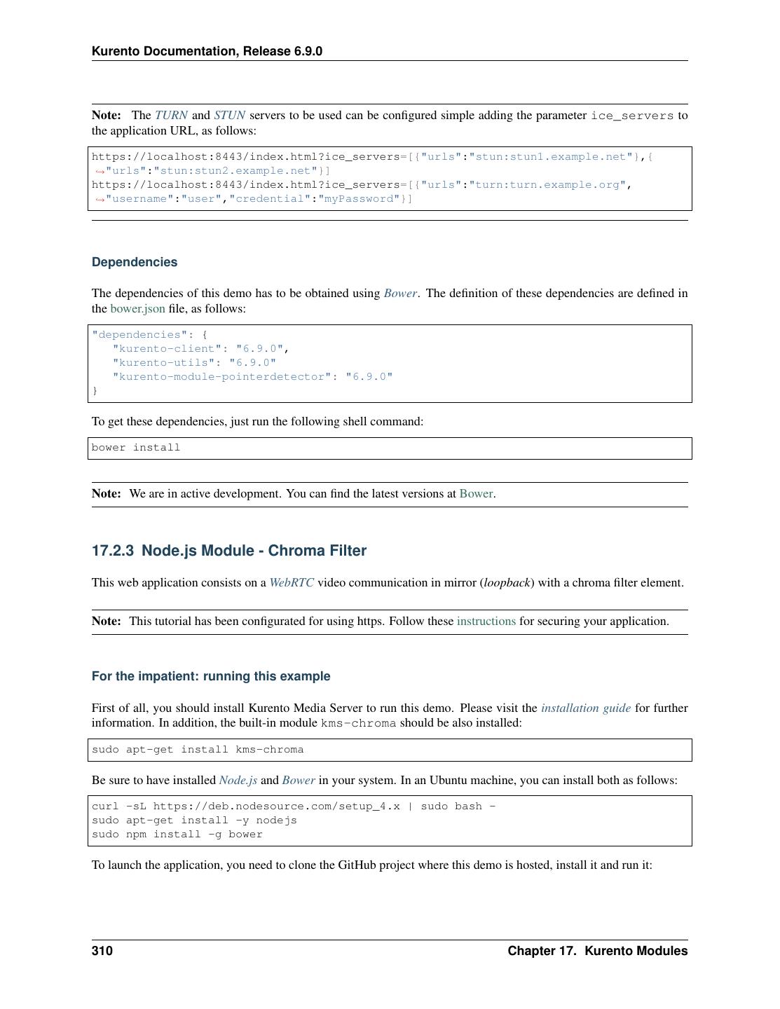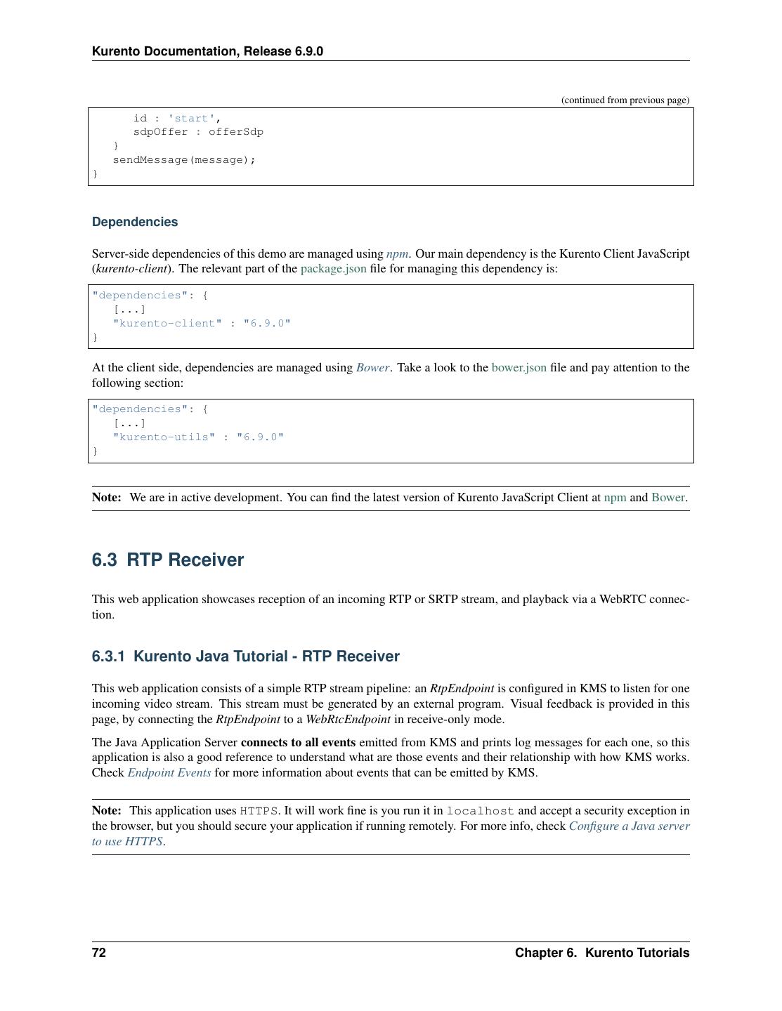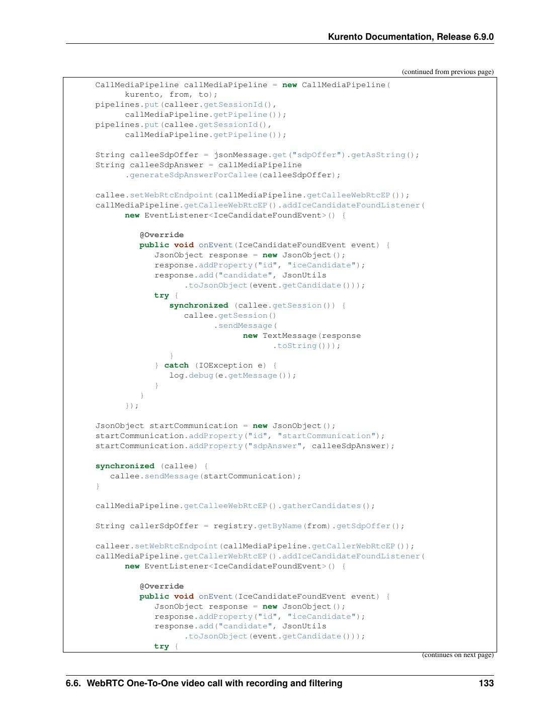 5 . 16.2 Kurento API over JSON-RPC . . . . . . . . . . . . . . . . . . . . . . . . . . . . . . . . . . . . . . 269 16.3 Network issues . . . . . . . . . . . . . . . . . . . . . . . . . . . . . . . . . . . . . . . . . . . . . . 274 16.4 Example: WebRTC in loopback . . . . . . . . . . . . . . . . . . . . . . . . . . . . . . . . . . . . . 275 16.5 Creating a custom Kurento Client . . . . . . . . . . . . . . . . . . . . . . . . . . . . . . . . . . . . 277 17 Kurento Modules 279 17.1 Module Tutorial - Pointer Detector Filter . . . . . . . . . . . . . . . . . . . . . . . . . . . . . . . . 280 17.2 Module Tutorial - Chroma Filter . . . . . . . . . . . . . . . . . . . . . . . . . . . . . . . . . . . . . 300 17.3 Module Tutorial - Crowd Detector Filter . . . . . . . . . . . . . . . . . . . . . . . . . . . . . . . . 316 17.4 Module Tutorial - Plate Detector Filter . . . . . . . . . . . . . . . . . . . . . . . . . . . . . . . . . 334 18 Kurento Utils JS 349 18.1 Overview . . . . . . . . . . . . . . . . . . . . . . . . . . . . . . . . . . . . . . . . . . . . . . . . . 349 18.2 How to use it . . . . . . . . . . . . . . . . . . . . . . . . . . . . . . . . . . . . . . . . . . . . . . . 349 18.3 Examples . . . . . . . . . . . . . . . . . . . . . . . . . . . . . . . . . . . . . . . . . . . . . . . . . 350 18.4 Using data channels . . . . . . . . . . . . . . . . . . . . . . . . . . . . . . . . . . . . . . . . . . . 351 18.5 Reference documentation . . . . . . . . . . . . . . . . . . . . . . . . . . . . . . . . . . . . . . . . 352 18.6 Souce code . . . . . . . . . . . . . . . . . . . . . . . . . . . . . . . . . . . . . . . . . . . . . . . . 356 18.7 Build for browser . . . . . . . . . . . . . . . . . . . . . . . . . . . . . . . . . . . . . . . . . . . . . 356 19 Endpoint Events 357 19.1 MediaObject events . . . . . . . . . . . . . . . . . . . . . . . . . . . . . . . . . . . . . . . . . . . 358 19.2 MediaElement events . . . . . . . . . . . . . . . . . . . . . . . . . . . . . . . . . . . . . . . . . . 358 19.3 BaseRtpEndpoint events . . . . . . . . . . . . . . . . . . . . . . . . . . . . . . . . . . . . . . . . . 359 19.4 WebRtcEndpoint events . . . . . . . . . . . . . . . . . . . . . . . . . . . . . . . . . . . . . . . . . 360 19.5 Sample sequence of events: WebRtcEndpoint . . . . . . . . . . . . . . . . . . . . . . . . . . . . . . 363 20 NAT Traversal 365 20.1 WebRTC with ICE . . . . . . . . . . . . . . . . . . . . . . . . . . . . . . . . . . . . . . . . . . . . 365 20.2 RTP without ICE . . . . . . . . . . . . . . . . . . . . . . . . . . . . . . . . . . . . . . . . . . . . . 365 21 Securing Kurento Applications 369 21.1 Securing Application Servers . . . . . . . . . . . . . . . . . . . . . . . . . . . . . . . . . . . . . . 369 21.2 Securing server applications . . . . . . . . . . . . . . . . . . . . . . . . . . . . . . . . . . . . . . . 371 22 WebRTC Statistics 373 22.1 Introduction . . . . . . . . . . . . . . . . . . . . . . . . . . . . . . . . . . . . . . . . . . . . . . . 373 22.2 API description . . . . . . . . . . . . . . . . . . . . . . . . . . . . . . . . . . . . . . . . . . . . . . 373 22.3 Example . . . . . . . . . . . . . . . . . . . . . . . . . . . . . . . . . . . . . . . . . . . . . . . . . 375 23 Debug Logging 377 23.1 Logging levels and components . . . . . . . . . . . . . . . . . . . . . . . . . . . . . . . . . . . . . 378 23.2 Suggested levels . . . . . . . . . . . . . . . . . . . . . . . . . . . . . . . . . . . . . . . . . . . . . 379 23.3 3rd-Party libraries . . . . . . . . . . . . . . . . . . . . . . . . . . . . . . . . . . . . . . . . . . . . 380 24 Kurento Team 383 25 Contribution Guide 385 26 Code of Conduct 387 27 Release Notes 389 27.1 6.9.0 (Dec 2018) . . . . . . . . . . . . . . . . . . . . . . . . . . . . . . . . . . . . . . . . . . . . . 389 27.2 6.8.1 (Oct 2018) . . . . . . . . . . . . . . . . . . . . . . . . . . . . . . . . . . . . . . . . . . . . . 392 27.3 6.7.2 (May 2018) . . . . . . . . . . . . . . . . . . . . . . . . . . . . . . . . . . . . . . . . . . . . . 393 iii