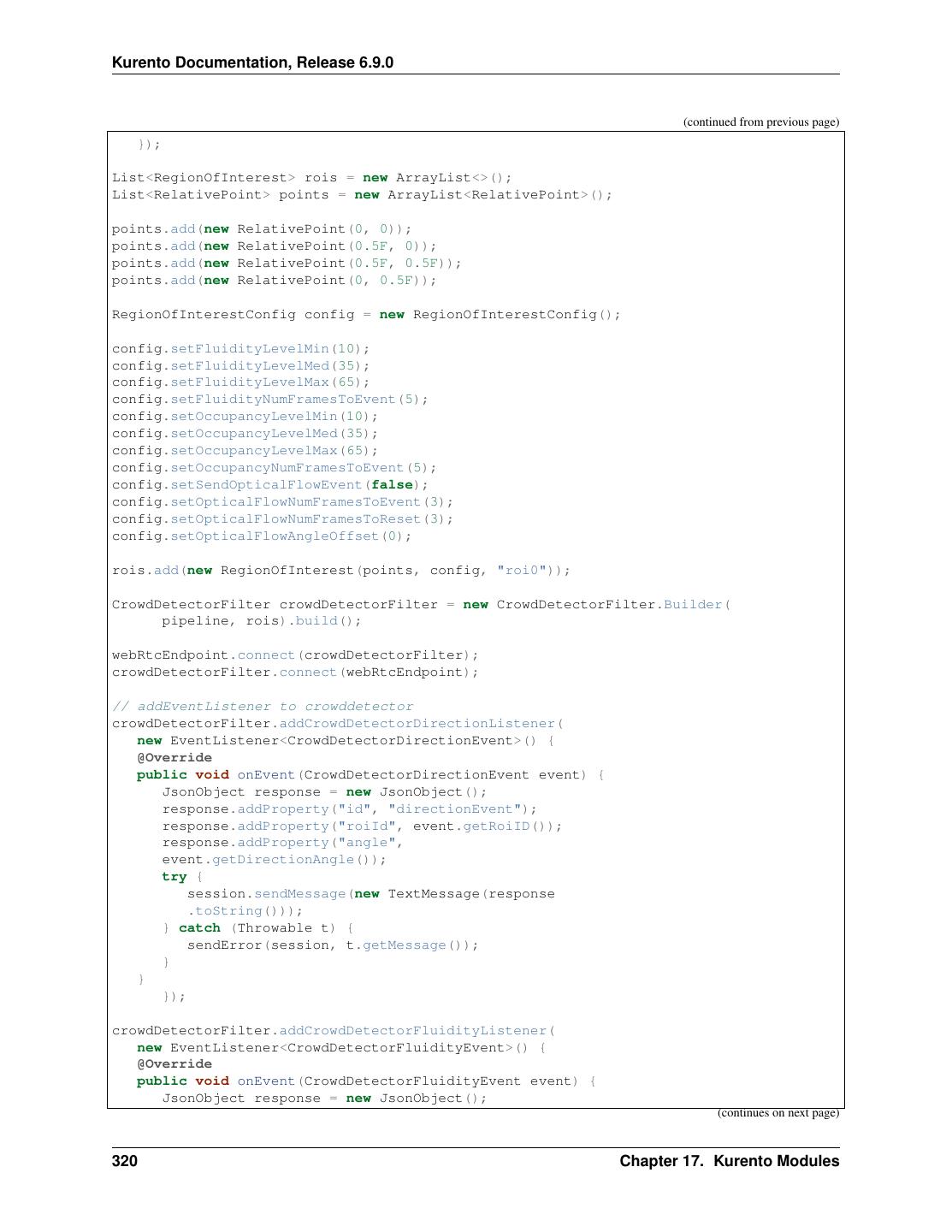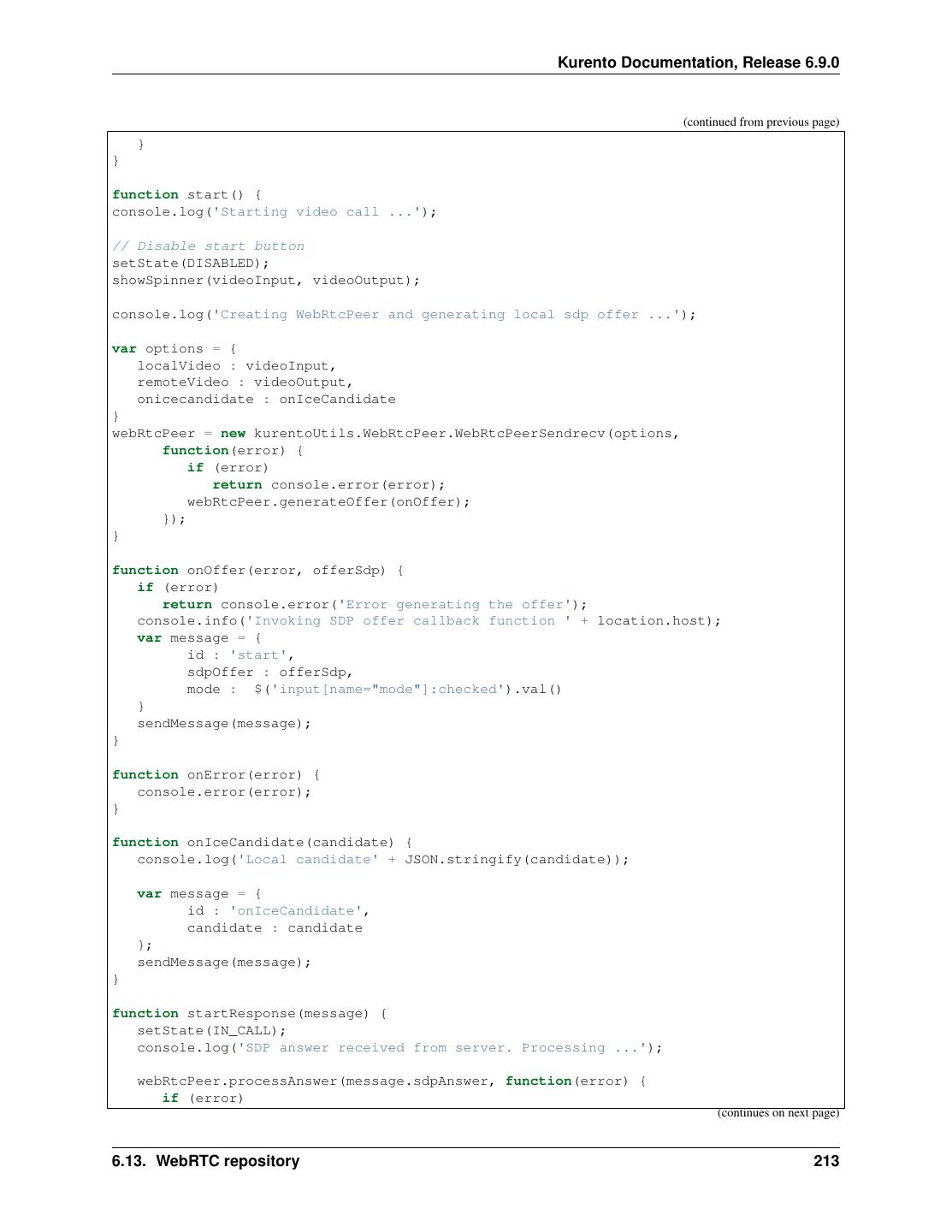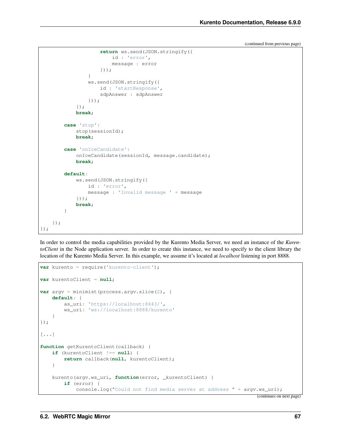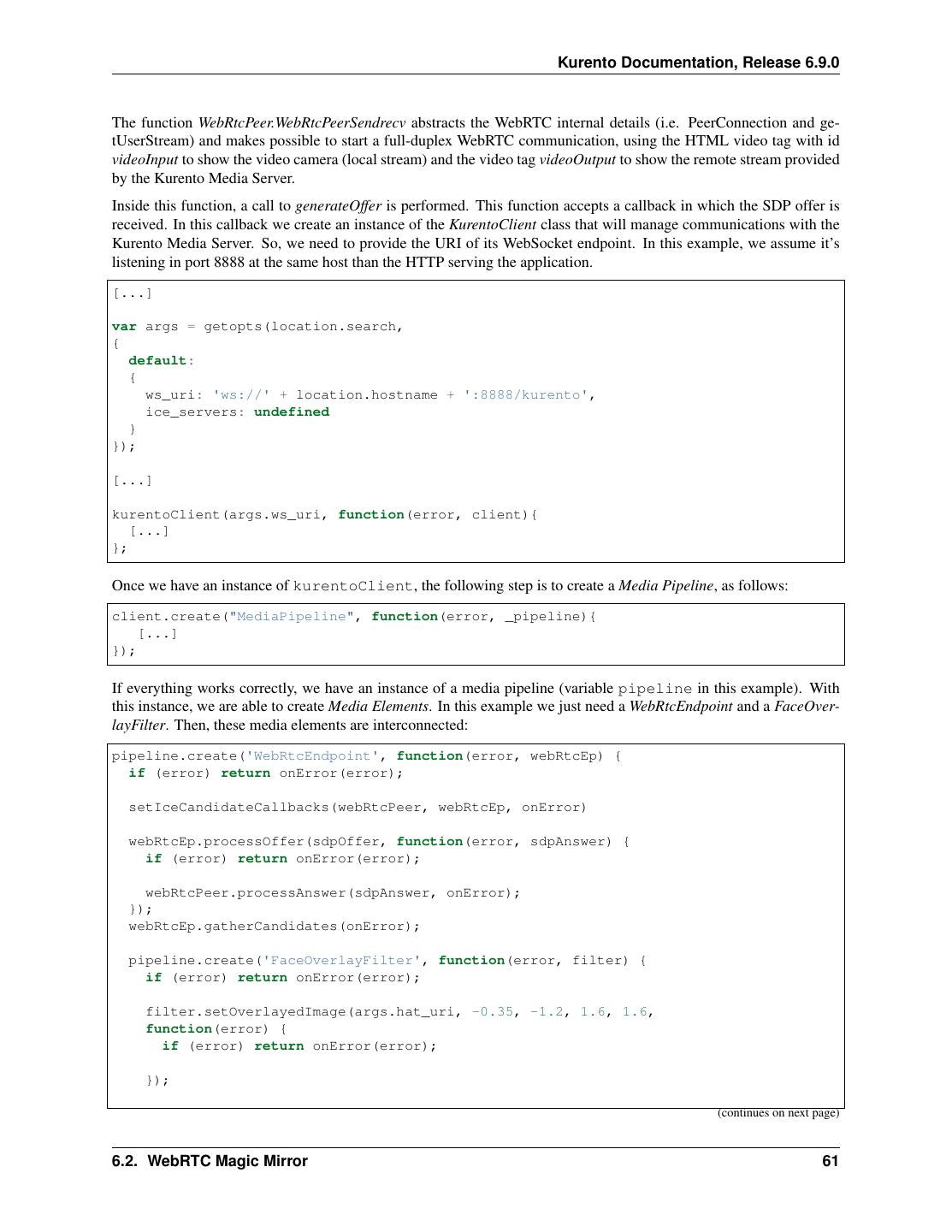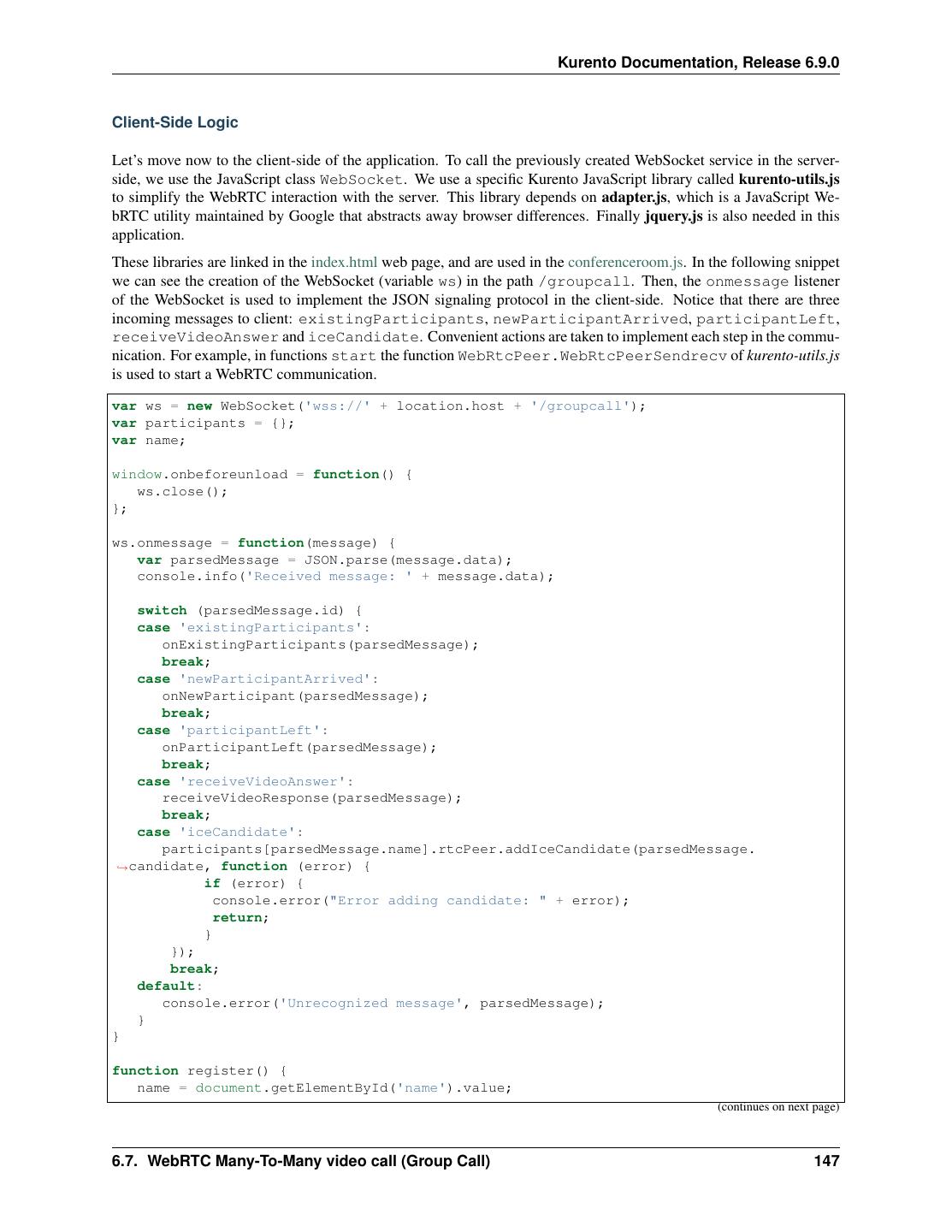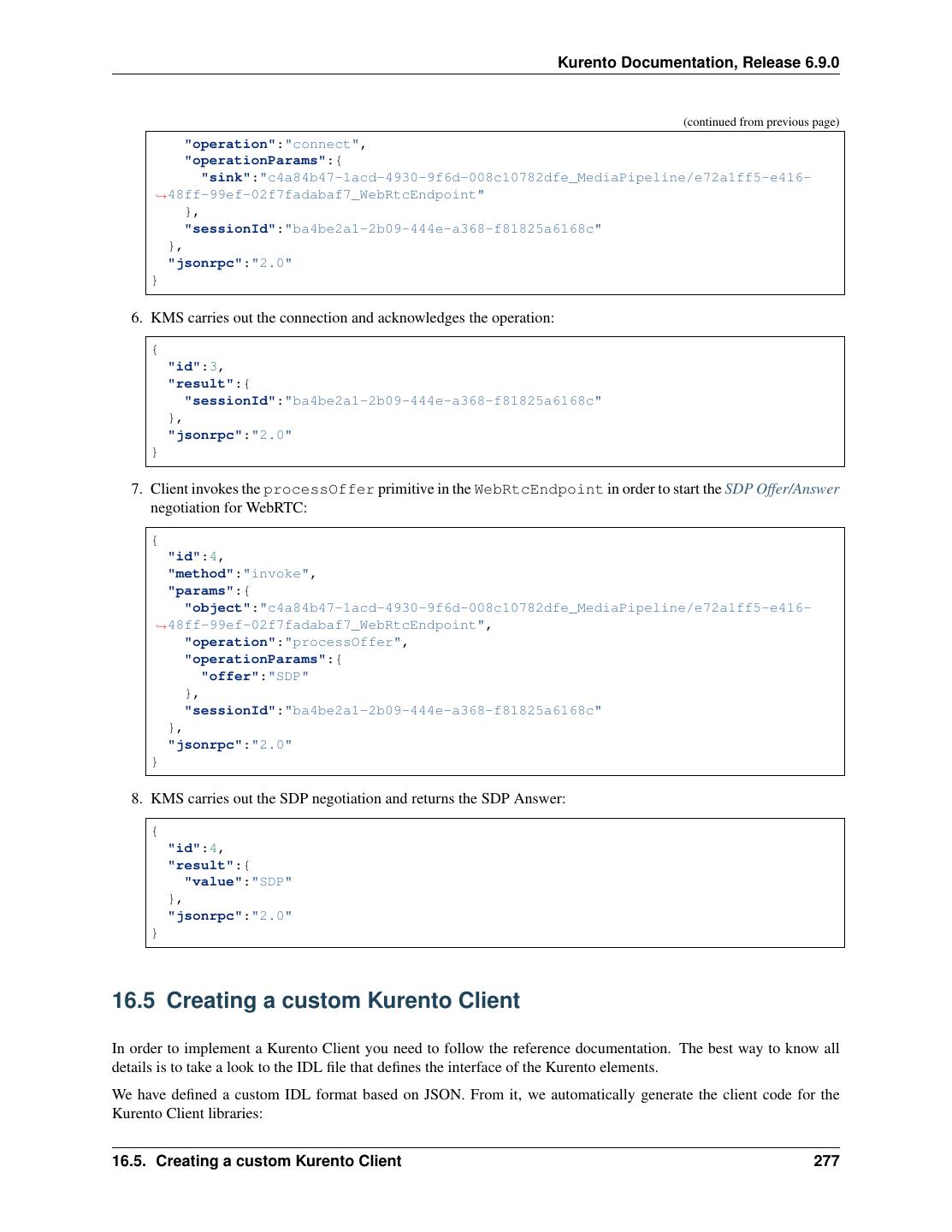 5 . 16.2 Kurento API over JSON-RPC . . . . . . . . . . . . . . . . . . . . . . . . . . . . . . . . . . . . . . 269 16.3 Network issues . . . . . . . . . . . . . . . . . . . . . . . . . . . . . . . . . . . . . . . . . . . . . . 274 16.4 Example: WebRTC in loopback . . . . . . . . . . . . . . . . . . . . . . . . . . . . . . . . . . . . . 275 16.5 Creating a custom Kurento Client . . . . . . . . . . . . . . . . . . . . . . . . . . . . . . . . . . . . 277 17 Kurento Modules 279 17.1 Module Tutorial - Pointer Detector Filter . . . . . . . . . . . . . . . . . . . . . . . . . . . . . . . . 280 17.2 Module Tutorial - Chroma Filter . . . . . . . . . . . . . . . . . . . . . . . . . . . . . . . . . . . . . 300 17.3 Module Tutorial - Crowd Detector Filter . . . . . . . . . . . . . . . . . . . . . . . . . . . . . . . . 316 17.4 Module Tutorial - Plate Detector Filter . . . . . . . . . . . . . . . . . . . . . . . . . . . . . . . . . 334 18 Kurento Utils JS 349 18.1 Overview . . . . . . . . . . . . . . . . . . . . . . . . . . . . . . . . . . . . . . . . . . . . . . . . . 349 18.2 How to use it . . . . . . . . . . . . . . . . . . . . . . . . . . . . . . . . . . . . . . . . . . . . . . . 349 18.3 Examples . . . . . . . . . . . . . . . . . . . . . . . . . . . . . . . . . . . . . . . . . . . . . . . . . 350 18.4 Using data channels . . . . . . . . . . . . . . . . . . . . . . . . . . . . . . . . . . . . . . . . . . . 351 18.5 Reference documentation . . . . . . . . . . . . . . . . . . . . . . . . . . . . . . . . . . . . . . . . 352 18.6 Souce code . . . . . . . . . . . . . . . . . . . . . . . . . . . . . . . . . . . . . . . . . . . . . . . . 356 18.7 Build for browser . . . . . . . . . . . . . . . . . . . . . . . . . . . . . . . . . . . . . . . . . . . . . 356 19 Endpoint Events 357 19.1 MediaObject events . . . . . . . . . . . . . . . . . . . . . . . . . . . . . . . . . . . . . . . . . . . 358 19.2 MediaElement events . . . . . . . . . . . . . . . . . . . . . . . . . . . . . . . . . . . . . . . . . . 358 19.3 BaseRtpEndpoint events . . . . . . . . . . . . . . . . . . . . . . . . . . . . . . . . . . . . . . . . . 359 19.4 WebRtcEndpoint events . . . . . . . . . . . . . . . . . . . . . . . . . . . . . . . . . . . . . . . . . 360 19.5 Sample sequence of events: WebRtcEndpoint . . . . . . . . . . . . . . . . . . . . . . . . . . . . . . 363 20 NAT Traversal 365 20.1 WebRTC with ICE . . . . . . . . . . . . . . . . . . . . . . . . . . . . . . . . . . . . . . . . . . . . 365 20.2 RTP without ICE . . . . . . . . . . . . . . . . . . . . . . . . . . . . . . . . . . . . . . . . . . . . . 365 21 Securing Kurento Applications 369 21.1 Securing Application Servers . . . . . . . . . . . . . . . . . . . . . . . . . . . . . . . . . . . . . . 369 21.2 Securing server applications . . . . . . . . . . . . . . . . . . . . . . . . . . . . . . . . . . . . . . . 371 22 WebRTC Statistics 373 22.1 Introduction . . . . . . . . . . . . . . . . . . . . . . . . . . . . . . . . . . . . . . . . . . . . . . . 373 22.2 API description . . . . . . . . . . . . . . . . . . . . . . . . . . . . . . . . . . . . . . . . . . . . . . 373 22.3 Example . . . . . . . . . . . . . . . . . . . . . . . . . . . . . . . . . . . . . . . . . . . . . . . . . 375 23 Debug Logging 377 23.1 Logging levels and components . . . . . . . . . . . . . . . . . . . . . . . . . . . . . . . . . . . . . 378 23.2 Suggested levels . . . . . . . . . . . . . . . . . . . . . . . . . . . . . . . . . . . . . . . . . . . . . 379 23.3 3rd-Party libraries . . . . . . . . . . . . . . . . . . . . . . . . . . . . . . . . . . . . . . . . . . . . 380 24 Kurento Team 383 25 Contribution Guide 385 26 Code of Conduct 387 27 Release Notes 389 27.1 6.9.0 (Dec 2018) . . . . . . . . . . . . . . . . . . . . . . . . . . . . . . . . . . . . . . . . . . . . . 389 27.2 6.8.1 (Oct 2018) . . . . . . . . . . . . . . . . . . . . . . . . . . . . . . . . . . . . . . . . . . . . . 392 27.3 6.7.2 (May 2018) . . . . . . . . . . . . . . . . . . . . . . . . . . . . . . . . . . . . . . . . . . . . . 393 iii