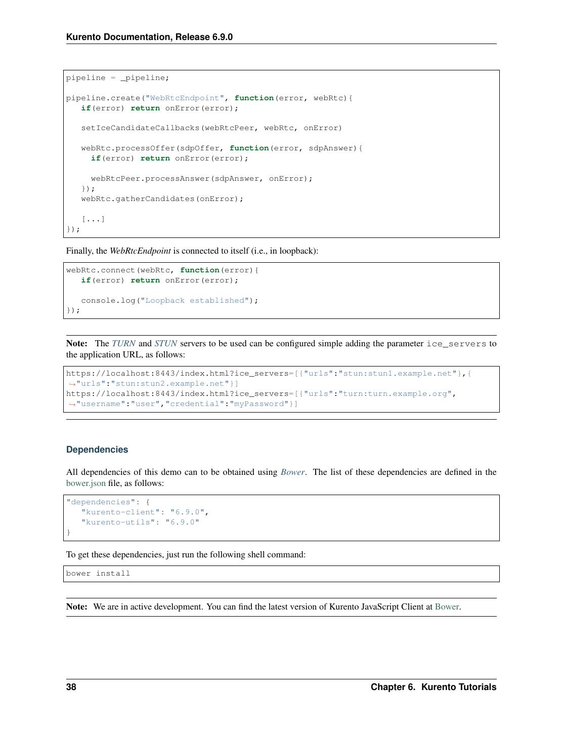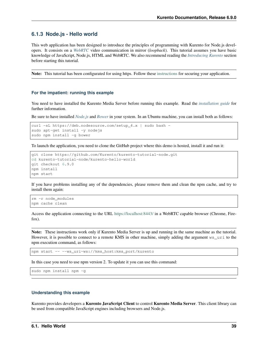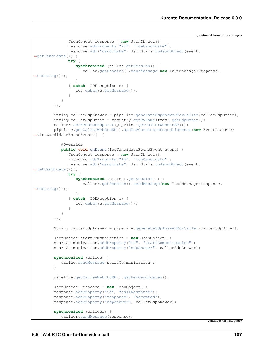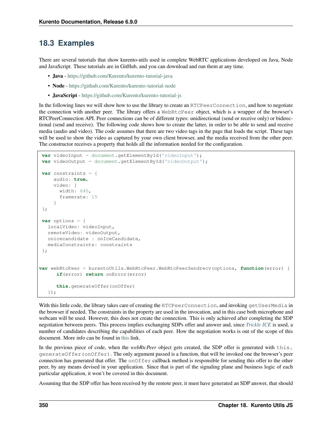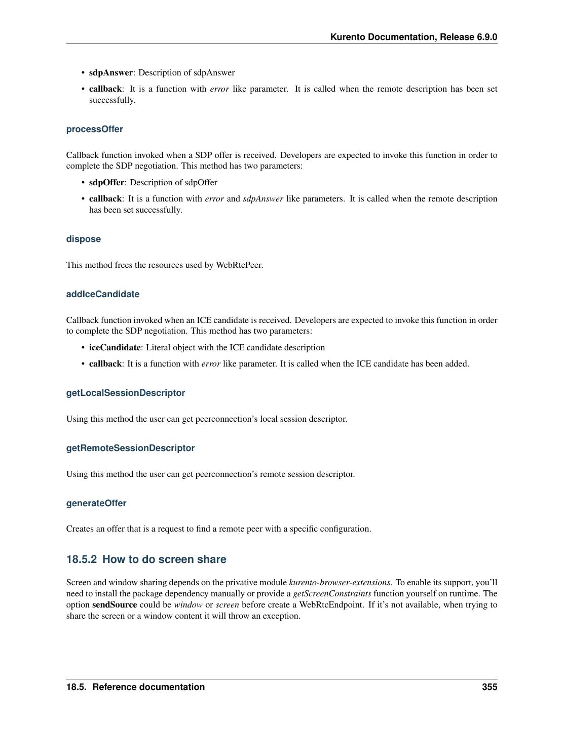 5 . 16.2 Kurento API over JSON-RPC . . . . . . . . . . . . . . . . . . . . . . . . . . . . . . . . . . . . . . 269 16.3 Network issues . . . . . . . . . . . . . . . . . . . . . . . . . . . . . . . . . . . . . . . . . . . . . . 274 16.4 Example: WebRTC in loopback . . . . . . . . . . . . . . . . . . . . . . . . . . . . . . . . . . . . . 275 16.5 Creating a custom Kurento Client . . . . . . . . . . . . . . . . . . . . . . . . . . . . . . . . . . . . 277 17 Kurento Modules 279 17.1 Module Tutorial - Pointer Detector Filter . . . . . . . . . . . . . . . . . . . . . . . . . . . . . . . . 280 17.2 Module Tutorial - Chroma Filter . . . . . . . . . . . . . . . . . . . . . . . . . . . . . . . . . . . . . 300 17.3 Module Tutorial - Crowd Detector Filter . . . . . . . . . . . . . . . . . . . . . . . . . . . . . . . . 316 17.4 Module Tutorial - Plate Detector Filter . . . . . . . . . . . . . . . . . . . . . . . . . . . . . . . . . 334 18 Kurento Utils JS 349 18.1 Overview . . . . . . . . . . . . . . . . . . . . . . . . . . . . . . . . . . . . . . . . . . . . . . . . . 349 18.2 How to use it . . . . . . . . . . . . . . . . . . . . . . . . . . . . . . . . . . . . . . . . . . . . . . . 349 18.3 Examples . . . . . . . . . . . . . . . . . . . . . . . . . . . . . . . . . . . . . . . . . . . . . . . . . 350 18.4 Using data channels . . . . . . . . . . . . . . . . . . . . . . . . . . . . . . . . . . . . . . . . . . . 351 18.5 Reference documentation . . . . . . . . . . . . . . . . . . . . . . . . . . . . . . . . . . . . . . . . 352 18.6 Souce code . . . . . . . . . . . . . . . . . . . . . . . . . . . . . . . . . . . . . . . . . . . . . . . . 356 18.7 Build for browser . . . . . . . . . . . . . . . . . . . . . . . . . . . . . . . . . . . . . . . . . . . . . 356 19 Endpoint Events 357 19.1 MediaObject events . . . . . . . . . . . . . . . . . . . . . . . . . . . . . . . . . . . . . . . . . . . 358 19.2 MediaElement events . . . . . . . . . . . . . . . . . . . . . . . . . . . . . . . . . . . . . . . . . . 358 19.3 BaseRtpEndpoint events . . . . . . . . . . . . . . . . . . . . . . . . . . . . . . . . . . . . . . . . . 359 19.4 WebRtcEndpoint events . . . . . . . . . . . . . . . . . . . . . . . . . . . . . . . . . . . . . . . . . 360 19.5 Sample sequence of events: WebRtcEndpoint . . . . . . . . . . . . . . . . . . . . . . . . . . . . . . 363 20 NAT Traversal 365 20.1 WebRTC with ICE . . . . . . . . . . . . . . . . . . . . . . . . . . . . . . . . . . . . . . . . . . . . 365 20.2 RTP without ICE . . . . . . . . . . . . . . . . . . . . . . . . . . . . . . . . . . . . . . . . . . . . . 365 21 Securing Kurento Applications 369 21.1 Securing Application Servers . . . . . . . . . . . . . . . . . . . . . . . . . . . . . . . . . . . . . . 369 21.2 Securing server applications . . . . . . . . . . . . . . . . . . . . . . . . . . . . . . . . . . . . . . . 371 22 WebRTC Statistics 373 22.1 Introduction . . . . . . . . . . . . . . . . . . . . . . . . . . . . . . . . . . . . . . . . . . . . . . . 373 22.2 API description . . . . . . . . . . . . . . . . . . . . . . . . . . . . . . . . . . . . . . . . . . . . . . 373 22.3 Example . . . . . . . . . . . . . . . . . . . . . . . . . . . . . . . . . . . . . . . . . . . . . . . . . 375 23 Debug Logging 377 23.1 Logging levels and components . . . . . . . . . . . . . . . . . . . . . . . . . . . . . . . . . . . . . 378 23.2 Suggested levels . . . . . . . . . . . . . . . . . . . . . . . . . . . . . . . . . . . . . . . . . . . . . 379 23.3 3rd-Party libraries . . . . . . . . . . . . . . . . . . . . . . . . . . . . . . . . . . . . . . . . . . . . 380 24 Kurento Team 383 25 Contribution Guide 385 26 Code of Conduct 387 27 Release Notes 389 27.1 6.9.0 (Dec 2018) . . . . . . . . . . . . . . . . . . . . . . . . . . . . . . . . . . . . . . . . . . . . . 389 27.2 6.8.1 (Oct 2018) . . . . . . . . . . . . . . . . . . . . . . . . . . . . . . . . . . . . . . . . . . . . . 392 27.3 6.7.2 (May 2018) . . . . . . . . . . . . . . . . . . . . . . . . . . . . . . . . . . . . . . . . . . . . . 393 iii