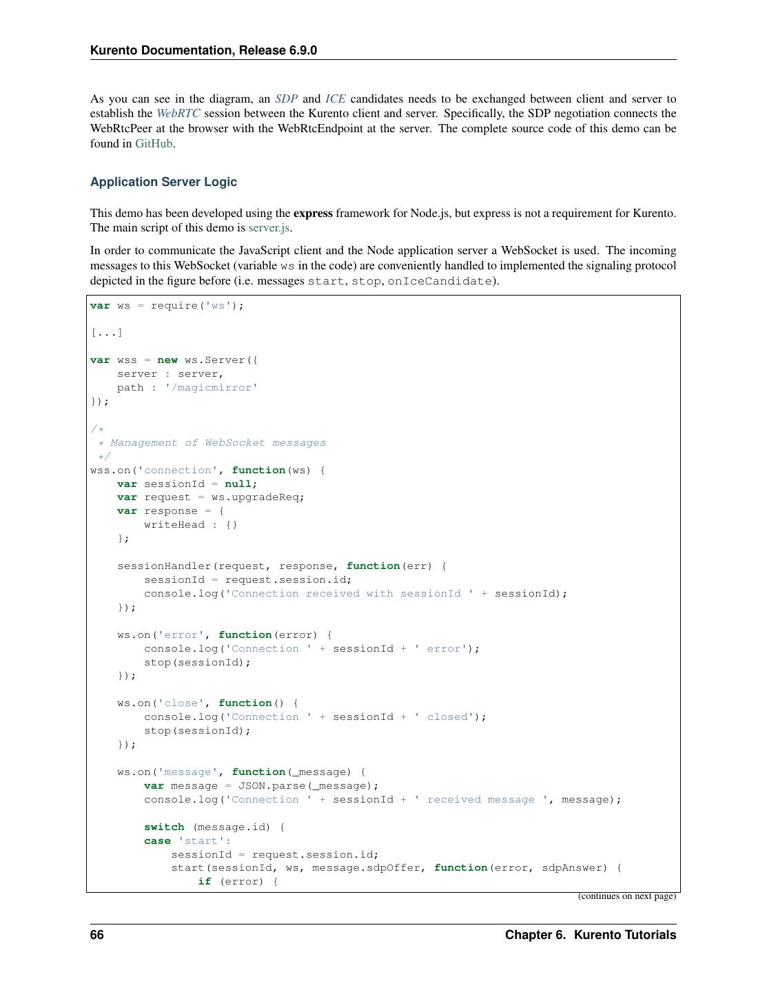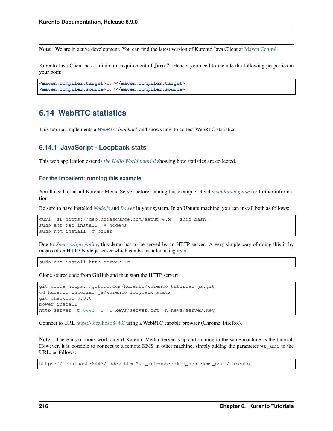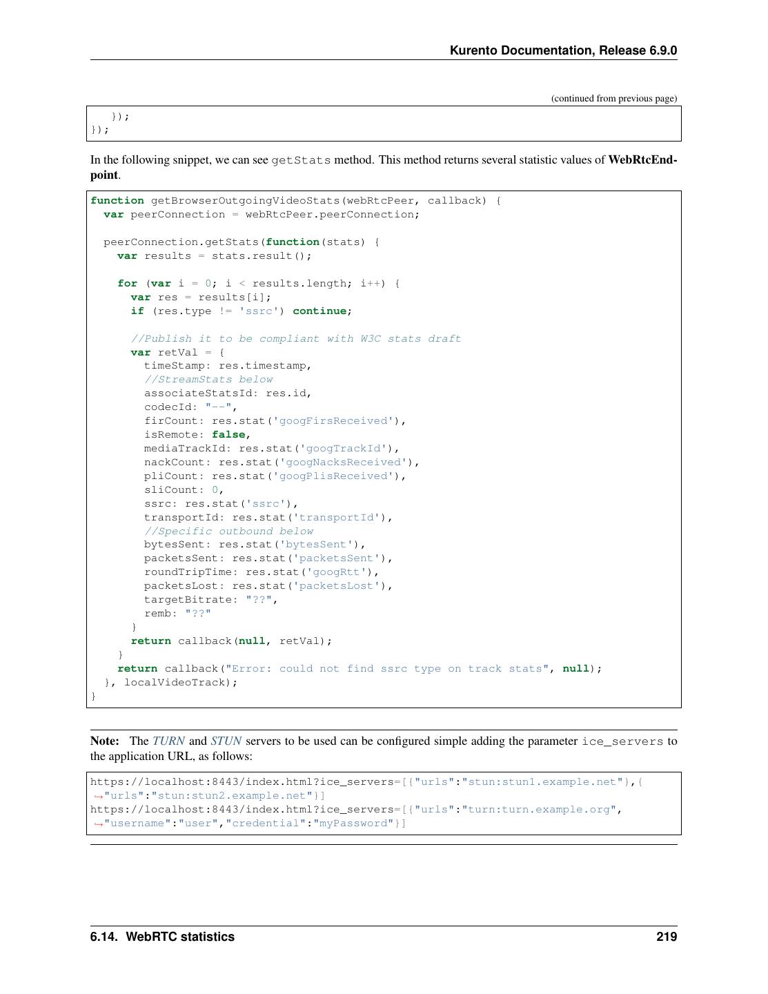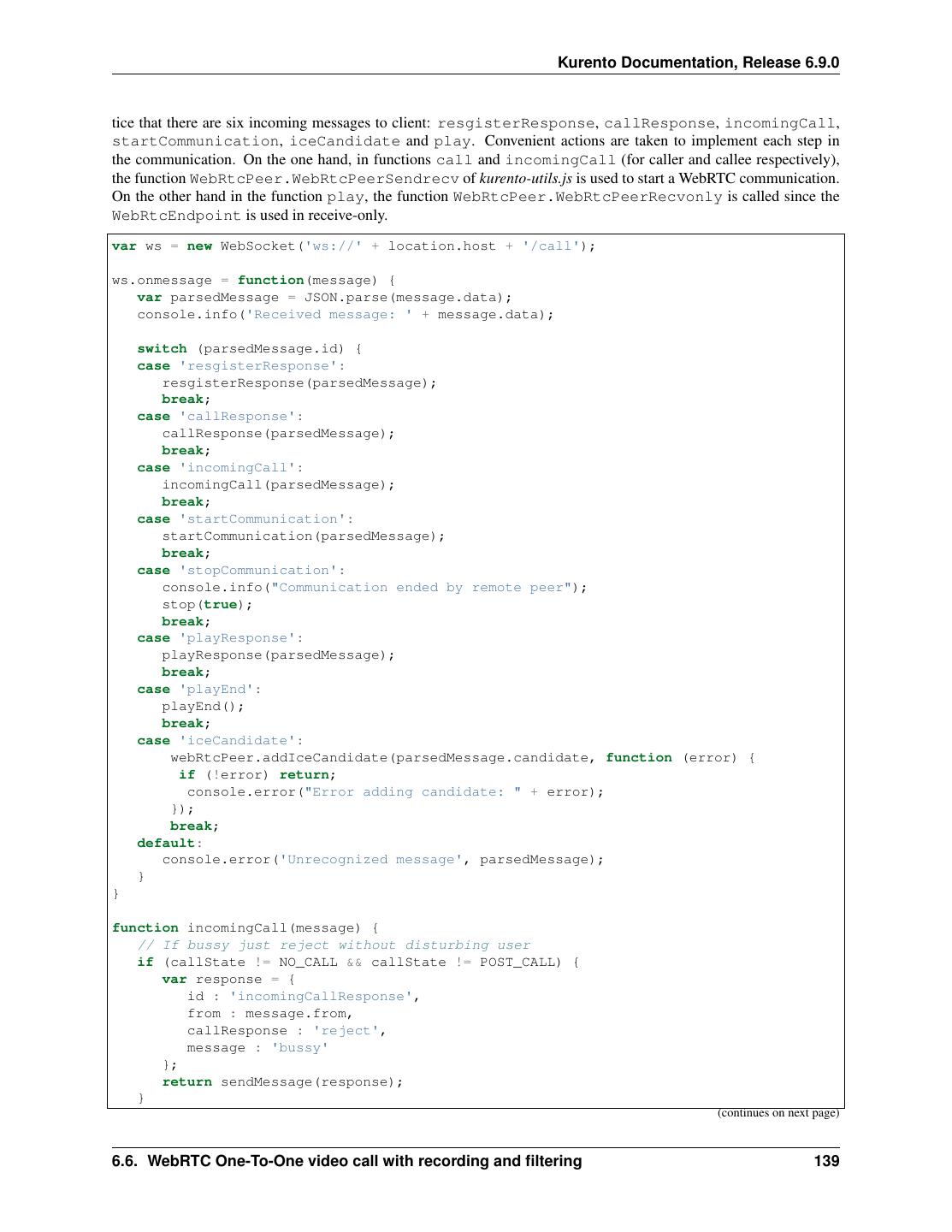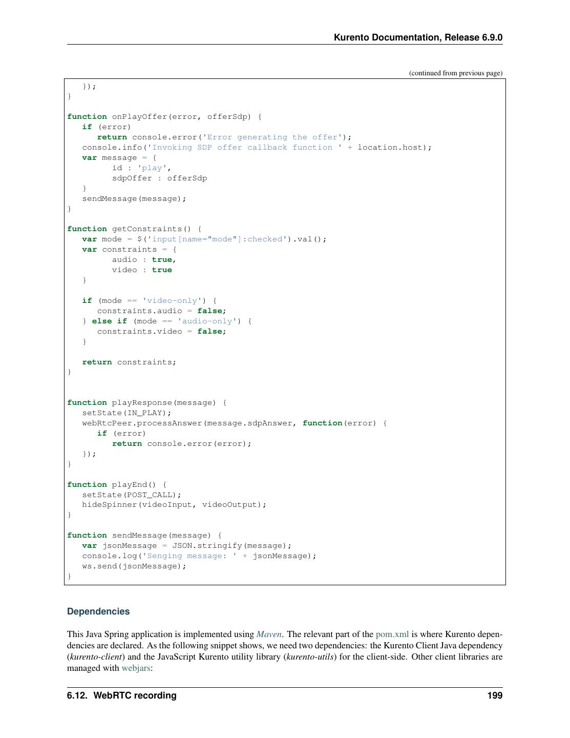 5 . 16.2 Kurento API over JSON-RPC . . . . . . . . . . . . . . . . . . . . . . . . . . . . . . . . . . . . . . 269 16.3 Network issues . . . . . . . . . . . . . . . . . . . . . . . . . . . . . . . . . . . . . . . . . . . . . . 274 16.4 Example: WebRTC in loopback . . . . . . . . . . . . . . . . . . . . . . . . . . . . . . . . . . . . . 275 16.5 Creating a custom Kurento Client . . . . . . . . . . . . . . . . . . . . . . . . . . . . . . . . . . . . 277 17 Kurento Modules 279 17.1 Module Tutorial - Pointer Detector Filter . . . . . . . . . . . . . . . . . . . . . . . . . . . . . . . . 280 17.2 Module Tutorial - Chroma Filter . . . . . . . . . . . . . . . . . . . . . . . . . . . . . . . . . . . . . 300 17.3 Module Tutorial - Crowd Detector Filter . . . . . . . . . . . . . . . . . . . . . . . . . . . . . . . . 316 17.4 Module Tutorial - Plate Detector Filter . . . . . . . . . . . . . . . . . . . . . . . . . . . . . . . . . 334 18 Kurento Utils JS 349 18.1 Overview . . . . . . . . . . . . . . . . . . . . . . . . . . . . . . . . . . . . . . . . . . . . . . . . . 349 18.2 How to use it . . . . . . . . . . . . . . . . . . . . . . . . . . . . . . . . . . . . . . . . . . . . . . . 349 18.3 Examples . . . . . . . . . . . . . . . . . . . . . . . . . . . . . . . . . . . . . . . . . . . . . . . . . 350 18.4 Using data channels . . . . . . . . . . . . . . . . . . . . . . . . . . . . . . . . . . . . . . . . . . . 351 18.5 Reference documentation . . . . . . . . . . . . . . . . . . . . . . . . . . . . . . . . . . . . . . . . 352 18.6 Souce code . . . . . . . . . . . . . . . . . . . . . . . . . . . . . . . . . . . . . . . . . . . . . . . . 356 18.7 Build for browser . . . . . . . . . . . . . . . . . . . . . . . . . . . . . . . . . . . . . . . . . . . . . 356 19 Endpoint Events 357 19.1 MediaObject events . . . . . . . . . . . . . . . . . . . . . . . . . . . . . . . . . . . . . . . . . . . 358 19.2 MediaElement events . . . . . . . . . . . . . . . . . . . . . . . . . . . . . . . . . . . . . . . . . . 358 19.3 BaseRtpEndpoint events . . . . . . . . . . . . . . . . . . . . . . . . . . . . . . . . . . . . . . . . . 359 19.4 WebRtcEndpoint events . . . . . . . . . . . . . . . . . . . . . . . . . . . . . . . . . . . . . . . . . 360 19.5 Sample sequence of events: WebRtcEndpoint . . . . . . . . . . . . . . . . . . . . . . . . . . . . . . 363 20 NAT Traversal 365 20.1 WebRTC with ICE . . . . . . . . . . . . . . . . . . . . . . . . . . . . . . . . . . . . . . . . . . . . 365 20.2 RTP without ICE . . . . . . . . . . . . . . . . . . . . . . . . . . . . . . . . . . . . . . . . . . . . . 365 21 Securing Kurento Applications 369 21.1 Securing Application Servers . . . . . . . . . . . . . . . . . . . . . . . . . . . . . . . . . . . . . . 369 21.2 Securing server applications . . . . . . . . . . . . . . . . . . . . . . . . . . . . . . . . . . . . . . . 371 22 WebRTC Statistics 373 22.1 Introduction . . . . . . . . . . . . . . . . . . . . . . . . . . . . . . . . . . . . . . . . . . . . . . . 373 22.2 API description . . . . . . . . . . . . . . . . . . . . . . . . . . . . . . . . . . . . . . . . . . . . . . 373 22.3 Example . . . . . . . . . . . . . . . . . . . . . . . . . . . . . . . . . . . . . . . . . . . . . . . . . 375 23 Debug Logging 377 23.1 Logging levels and components . . . . . . . . . . . . . . . . . . . . . . . . . . . . . . . . . . . . . 378 23.2 Suggested levels . . . . . . . . . . . . . . . . . . . . . . . . . . . . . . . . . . . . . . . . . . . . . 379 23.3 3rd-Party libraries . . . . . . . . . . . . . . . . . . . . . . . . . . . . . . . . . . . . . . . . . . . . 380 24 Kurento Team 383 25 Contribution Guide 385 26 Code of Conduct 387 27 Release Notes 389 27.1 6.9.0 (Dec 2018) . . . . . . . . . . . . . . . . . . . . . . . . . . . . . . . . . . . . . . . . . . . . . 389 27.2 6.8.1 (Oct 2018) . . . . . . . . . . . . . . . . . . . . . . . . . . . . . . . . . . . . . . . . . . . . . 392 27.3 6.7.2 (May 2018) . . . . . . . . . . . . . . . . . . . . . . . . . . . . . . . . . . . . . . . . . . . . . 393 iii