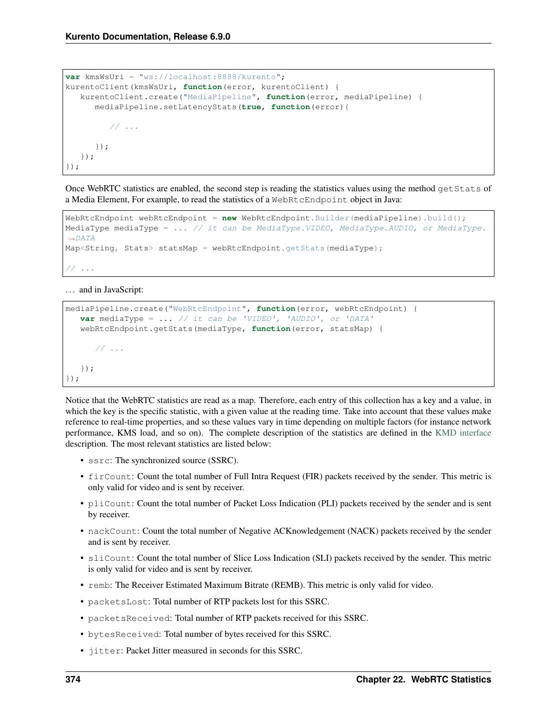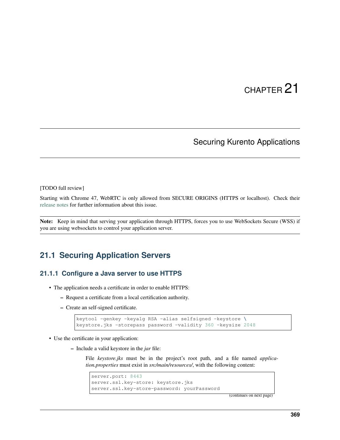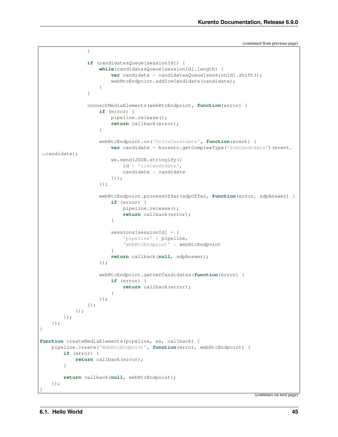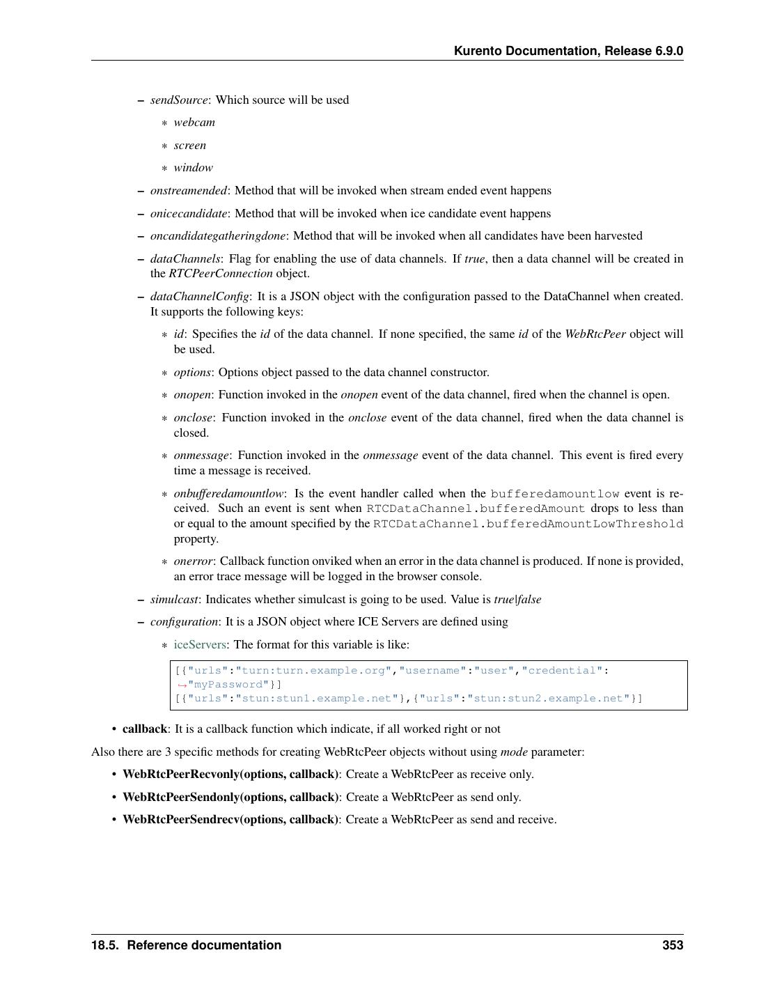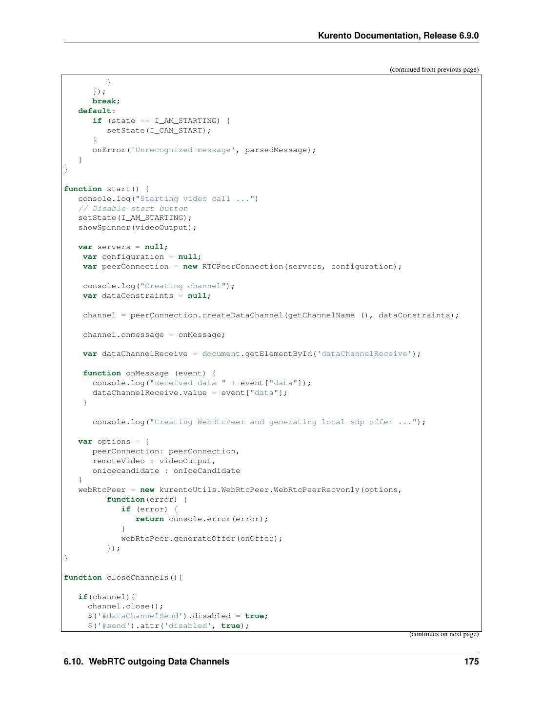 5 . 16.2 Kurento API over JSON-RPC . . . . . . . . . . . . . . . . . . . . . . . . . . . . . . . . . . . . . . 269 16.3 Network issues . . . . . . . . . . . . . . . . . . . . . . . . . . . . . . . . . . . . . . . . . . . . . . 274 16.4 Example: WebRTC in loopback . . . . . . . . . . . . . . . . . . . . . . . . . . . . . . . . . . . . . 275 16.5 Creating a custom Kurento Client . . . . . . . . . . . . . . . . . . . . . . . . . . . . . . . . . . . . 277 17 Kurento Modules 279 17.1 Module Tutorial - Pointer Detector Filter . . . . . . . . . . . . . . . . . . . . . . . . . . . . . . . . 280 17.2 Module Tutorial - Chroma Filter . . . . . . . . . . . . . . . . . . . . . . . . . . . . . . . . . . . . . 300 17.3 Module Tutorial - Crowd Detector Filter . . . . . . . . . . . . . . . . . . . . . . . . . . . . . . . . 316 17.4 Module Tutorial - Plate Detector Filter . . . . . . . . . . . . . . . . . . . . . . . . . . . . . . . . . 334 18 Kurento Utils JS 349 18.1 Overview . . . . . . . . . . . . . . . . . . . . . . . . . . . . . . . . . . . . . . . . . . . . . . . . . 349 18.2 How to use it . . . . . . . . . . . . . . . . . . . . . . . . . . . . . . . . . . . . . . . . . . . . . . . 349 18.3 Examples . . . . . . . . . . . . . . . . . . . . . . . . . . . . . . . . . . . . . . . . . . . . . . . . . 350 18.4 Using data channels . . . . . . . . . . . . . . . . . . . . . . . . . . . . . . . . . . . . . . . . . . . 351 18.5 Reference documentation . . . . . . . . . . . . . . . . . . . . . . . . . . . . . . . . . . . . . . . . 352 18.6 Souce code . . . . . . . . . . . . . . . . . . . . . . . . . . . . . . . . . . . . . . . . . . . . . . . . 356 18.7 Build for browser . . . . . . . . . . . . . . . . . . . . . . . . . . . . . . . . . . . . . . . . . . . . . 356 19 Endpoint Events 357 19.1 MediaObject events . . . . . . . . . . . . . . . . . . . . . . . . . . . . . . . . . . . . . . . . . . . 358 19.2 MediaElement events . . . . . . . . . . . . . . . . . . . . . . . . . . . . . . . . . . . . . . . . . . 358 19.3 BaseRtpEndpoint events . . . . . . . . . . . . . . . . . . . . . . . . . . . . . . . . . . . . . . . . . 359 19.4 WebRtcEndpoint events . . . . . . . . . . . . . . . . . . . . . . . . . . . . . . . . . . . . . . . . . 360 19.5 Sample sequence of events: WebRtcEndpoint . . . . . . . . . . . . . . . . . . . . . . . . . . . . . . 363 20 NAT Traversal 365 20.1 WebRTC with ICE . . . . . . . . . . . . . . . . . . . . . . . . . . . . . . . . . . . . . . . . . . . . 365 20.2 RTP without ICE . . . . . . . . . . . . . . . . . . . . . . . . . . . . . . . . . . . . . . . . . . . . . 365 21 Securing Kurento Applications 369 21.1 Securing Application Servers . . . . . . . . . . . . . . . . . . . . . . . . . . . . . . . . . . . . . . 369 21.2 Securing server applications . . . . . . . . . . . . . . . . . . . . . . . . . . . . . . . . . . . . . . . 371 22 WebRTC Statistics 373 22.1 Introduction . . . . . . . . . . . . . . . . . . . . . . . . . . . . . . . . . . . . . . . . . . . . . . . 373 22.2 API description . . . . . . . . . . . . . . . . . . . . . . . . . . . . . . . . . . . . . . . . . . . . . . 373 22.3 Example . . . . . . . . . . . . . . . . . . . . . . . . . . . . . . . . . . . . . . . . . . . . . . . . . 375 23 Debug Logging 377 23.1 Logging levels and components . . . . . . . . . . . . . . . . . . . . . . . . . . . . . . . . . . . . . 378 23.2 Suggested levels . . . . . . . . . . . . . . . . . . . . . . . . . . . . . . . . . . . . . . . . . . . . . 379 23.3 3rd-Party libraries . . . . . . . . . . . . . . . . . . . . . . . . . . . . . . . . . . . . . . . . . . . . 380 24 Kurento Team 383 25 Contribution Guide 385 26 Code of Conduct 387 27 Release Notes 389 27.1 6.9.0 (Dec 2018) . . . . . . . . . . . . . . . . . . . . . . . . . . . . . . . . . . . . . . . . . . . . . 389 27.2 6.8.1 (Oct 2018) . . . . . . . . . . . . . . . . . . . . . . . . . . . . . . . . . . . . . . . . . . . . . 392 27.3 6.7.2 (May 2018) . . . . . . . . . . . . . . . . . . . . . . . . . . . . . . . . . . . . . . . . . . . . . 393 iii