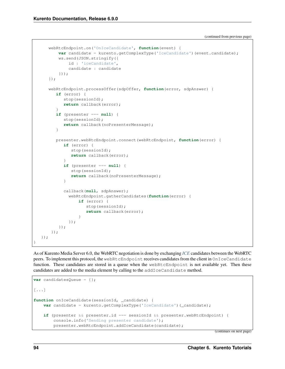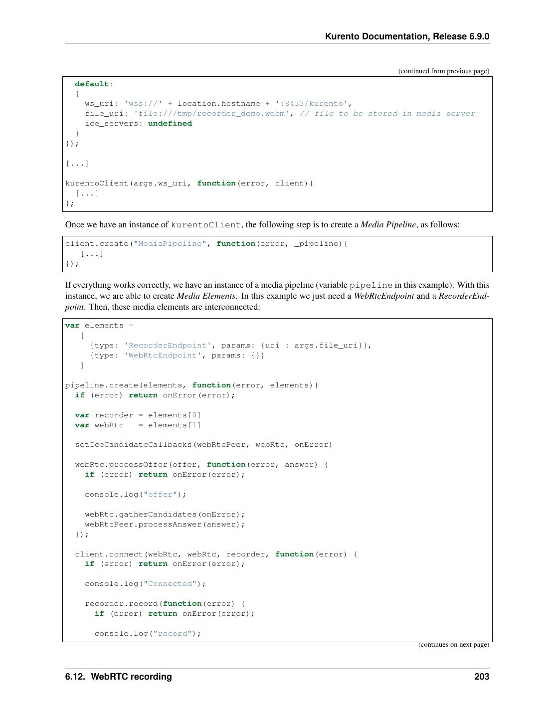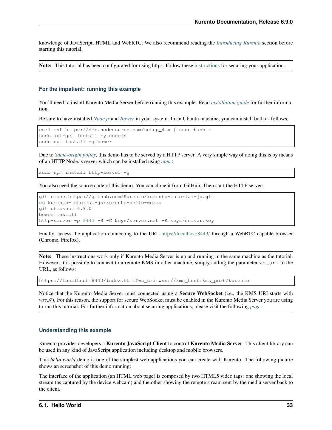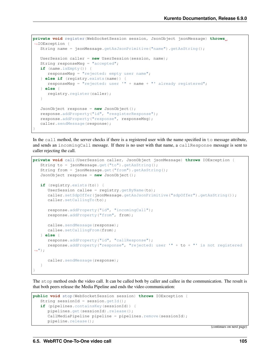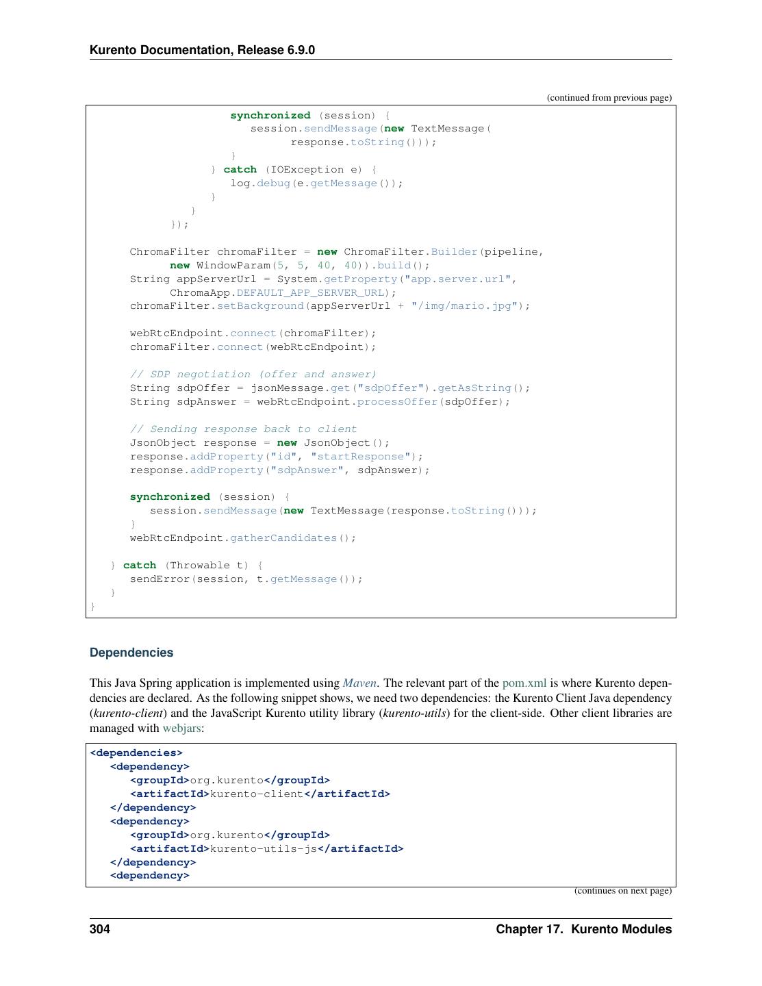 5 . 16.2 Kurento API over JSON-RPC . . . . . . . . . . . . . . . . . . . . . . . . . . . . . . . . . . . . . . 269 16.3 Network issues . . . . . . . . . . . . . . . . . . . . . . . . . . . . . . . . . . . . . . . . . . . . . . 274 16.4 Example: WebRTC in loopback . . . . . . . . . . . . . . . . . . . . . . . . . . . . . . . . . . . . . 275 16.5 Creating a custom Kurento Client . . . . . . . . . . . . . . . . . . . . . . . . . . . . . . . . . . . . 277 17 Kurento Modules 279 17.1 Module Tutorial - Pointer Detector Filter . . . . . . . . . . . . . . . . . . . . . . . . . . . . . . . . 280 17.2 Module Tutorial - Chroma Filter . . . . . . . . . . . . . . . . . . . . . . . . . . . . . . . . . . . . . 300 17.3 Module Tutorial - Crowd Detector Filter . . . . . . . . . . . . . . . . . . . . . . . . . . . . . . . . 316 17.4 Module Tutorial - Plate Detector Filter . . . . . . . . . . . . . . . . . . . . . . . . . . . . . . . . . 334 18 Kurento Utils JS 349 18.1 Overview . . . . . . . . . . . . . . . . . . . . . . . . . . . . . . . . . . . . . . . . . . . . . . . . . 349 18.2 How to use it . . . . . . . . . . . . . . . . . . . . . . . . . . . . . . . . . . . . . . . . . . . . . . . 349 18.3 Examples . . . . . . . . . . . . . . . . . . . . . . . . . . . . . . . . . . . . . . . . . . . . . . . . . 350 18.4 Using data channels . . . . . . . . . . . . . . . . . . . . . . . . . . . . . . . . . . . . . . . . . . . 351 18.5 Reference documentation . . . . . . . . . . . . . . . . . . . . . . . . . . . . . . . . . . . . . . . . 352 18.6 Souce code . . . . . . . . . . . . . . . . . . . . . . . . . . . . . . . . . . . . . . . . . . . . . . . . 356 18.7 Build for browser . . . . . . . . . . . . . . . . . . . . . . . . . . . . . . . . . . . . . . . . . . . . . 356 19 Endpoint Events 357 19.1 MediaObject events . . . . . . . . . . . . . . . . . . . . . . . . . . . . . . . . . . . . . . . . . . . 358 19.2 MediaElement events . . . . . . . . . . . . . . . . . . . . . . . . . . . . . . . . . . . . . . . . . . 358 19.3 BaseRtpEndpoint events . . . . . . . . . . . . . . . . . . . . . . . . . . . . . . . . . . . . . . . . . 359 19.4 WebRtcEndpoint events . . . . . . . . . . . . . . . . . . . . . . . . . . . . . . . . . . . . . . . . . 360 19.5 Sample sequence of events: WebRtcEndpoint . . . . . . . . . . . . . . . . . . . . . . . . . . . . . . 363 20 NAT Traversal 365 20.1 WebRTC with ICE . . . . . . . . . . . . . . . . . . . . . . . . . . . . . . . . . . . . . . . . . . . . 365 20.2 RTP without ICE . . . . . . . . . . . . . . . . . . . . . . . . . . . . . . . . . . . . . . . . . . . . . 365 21 Securing Kurento Applications 369 21.1 Securing Application Servers . . . . . . . . . . . . . . . . . . . . . . . . . . . . . . . . . . . . . . 369 21.2 Securing server applications . . . . . . . . . . . . . . . . . . . . . . . . . . . . . . . . . . . . . . . 371 22 WebRTC Statistics 373 22.1 Introduction . . . . . . . . . . . . . . . . . . . . . . . . . . . . . . . . . . . . . . . . . . . . . . . 373 22.2 API description . . . . . . . . . . . . . . . . . . . . . . . . . . . . . . . . . . . . . . . . . . . . . . 373 22.3 Example . . . . . . . . . . . . . . . . . . . . . . . . . . . . . . . . . . . . . . . . . . . . . . . . . 375 23 Debug Logging 377 23.1 Logging levels and components . . . . . . . . . . . . . . . . . . . . . . . . . . . . . . . . . . . . . 378 23.2 Suggested levels . . . . . . . . . . . . . . . . . . . . . . . . . . . . . . . . . . . . . . . . . . . . . 379 23.3 3rd-Party libraries . . . . . . . . . . . . . . . . . . . . . . . . . . . . . . . . . . . . . . . . . . . . 380 24 Kurento Team 383 25 Contribution Guide 385 26 Code of Conduct 387 27 Release Notes 389 27.1 6.9.0 (Dec 2018) . . . . . . . . . . . . . . . . . . . . . . . . . . . . . . . . . . . . . . . . . . . . . 389 27.2 6.8.1 (Oct 2018) . . . . . . . . . . . . . . . . . . . . . . . . . . . . . . . . . . . . . . . . . . . . . 392 27.3 6.7.2 (May 2018) . . . . . . . . . . . . . . . . . . . . . . . . . . . . . . . . . . . . . . . . . . . . . 393 iii
