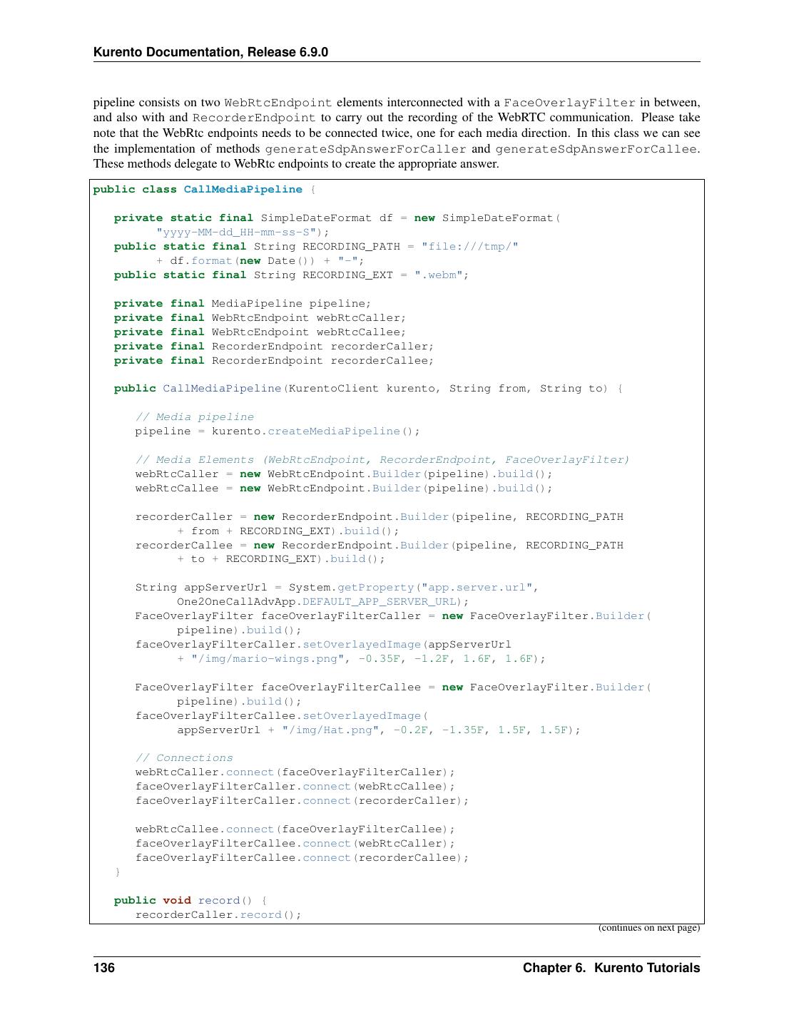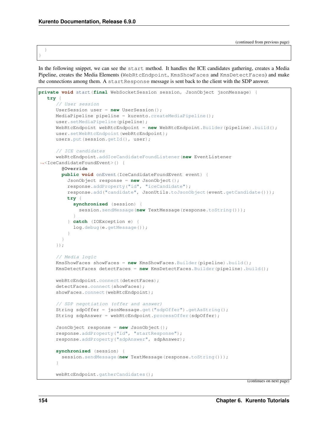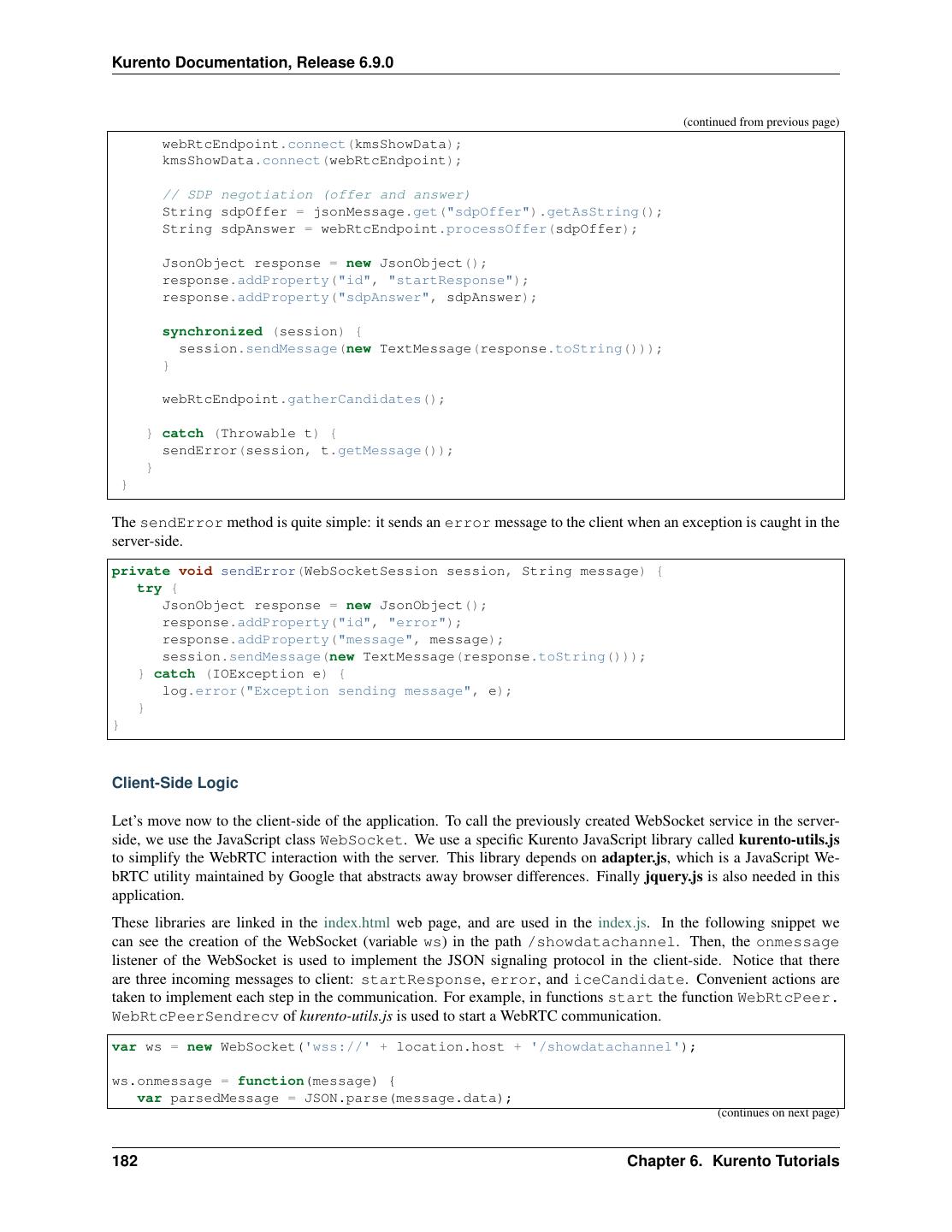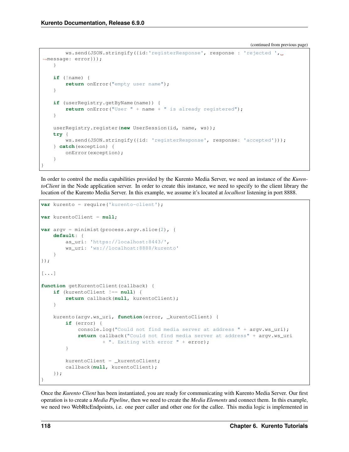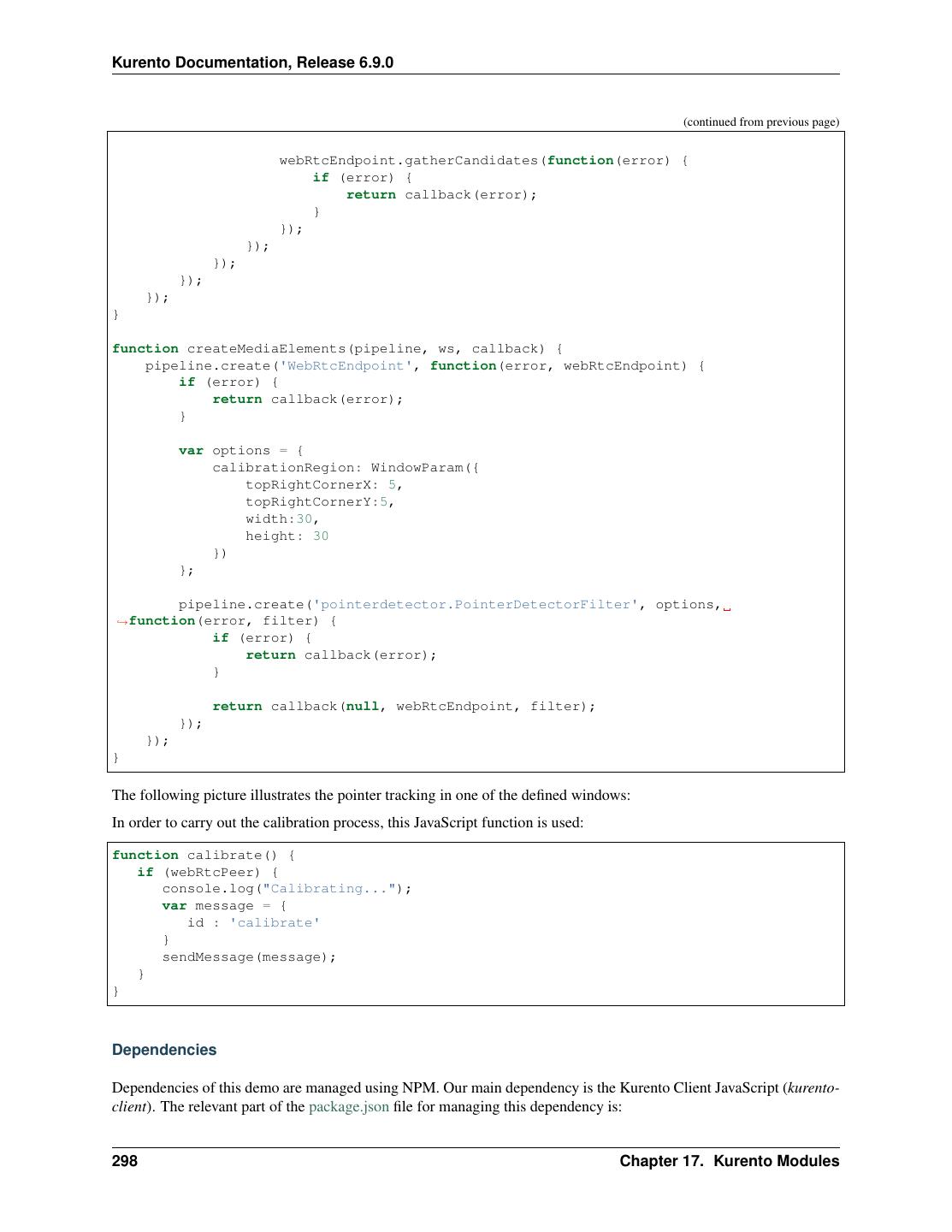 5 . 16.2 Kurento API over JSON-RPC . . . . . . . . . . . . . . . . . . . . . . . . . . . . . . . . . . . . . . 269 16.3 Network issues . . . . . . . . . . . . . . . . . . . . . . . . . . . . . . . . . . . . . . . . . . . . . . 274 16.4 Example: WebRTC in loopback . . . . . . . . . . . . . . . . . . . . . . . . . . . . . . . . . . . . . 275 16.5 Creating a custom Kurento Client . . . . . . . . . . . . . . . . . . . . . . . . . . . . . . . . . . . . 277 17 Kurento Modules 279 17.1 Module Tutorial - Pointer Detector Filter . . . . . . . . . . . . . . . . . . . . . . . . . . . . . . . . 280 17.2 Module Tutorial - Chroma Filter . . . . . . . . . . . . . . . . . . . . . . . . . . . . . . . . . . . . . 300 17.3 Module Tutorial - Crowd Detector Filter . . . . . . . . . . . . . . . . . . . . . . . . . . . . . . . . 316 17.4 Module Tutorial - Plate Detector Filter . . . . . . . . . . . . . . . . . . . . . . . . . . . . . . . . . 334 18 Kurento Utils JS 349 18.1 Overview . . . . . . . . . . . . . . . . . . . . . . . . . . . . . . . . . . . . . . . . . . . . . . . . . 349 18.2 How to use it . . . . . . . . . . . . . . . . . . . . . . . . . . . . . . . . . . . . . . . . . . . . . . . 349 18.3 Examples . . . . . . . . . . . . . . . . . . . . . . . . . . . . . . . . . . . . . . . . . . . . . . . . . 350 18.4 Using data channels . . . . . . . . . . . . . . . . . . . . . . . . . . . . . . . . . . . . . . . . . . . 351 18.5 Reference documentation . . . . . . . . . . . . . . . . . . . . . . . . . . . . . . . . . . . . . . . . 352 18.6 Souce code . . . . . . . . . . . . . . . . . . . . . . . . . . . . . . . . . . . . . . . . . . . . . . . . 356 18.7 Build for browser . . . . . . . . . . . . . . . . . . . . . . . . . . . . . . . . . . . . . . . . . . . . . 356 19 Endpoint Events 357 19.1 MediaObject events . . . . . . . . . . . . . . . . . . . . . . . . . . . . . . . . . . . . . . . . . . . 358 19.2 MediaElement events . . . . . . . . . . . . . . . . . . . . . . . . . . . . . . . . . . . . . . . . . . 358 19.3 BaseRtpEndpoint events . . . . . . . . . . . . . . . . . . . . . . . . . . . . . . . . . . . . . . . . . 359 19.4 WebRtcEndpoint events . . . . . . . . . . . . . . . . . . . . . . . . . . . . . . . . . . . . . . . . . 360 19.5 Sample sequence of events: WebRtcEndpoint . . . . . . . . . . . . . . . . . . . . . . . . . . . . . . 363 20 NAT Traversal 365 20.1 WebRTC with ICE . . . . . . . . . . . . . . . . . . . . . . . . . . . . . . . . . . . . . . . . . . . . 365 20.2 RTP without ICE . . . . . . . . . . . . . . . . . . . . . . . . . . . . . . . . . . . . . . . . . . . . . 365 21 Securing Kurento Applications 369 21.1 Securing Application Servers . . . . . . . . . . . . . . . . . . . . . . . . . . . . . . . . . . . . . . 369 21.2 Securing server applications . . . . . . . . . . . . . . . . . . . . . . . . . . . . . . . . . . . . . . . 371 22 WebRTC Statistics 373 22.1 Introduction . . . . . . . . . . . . . . . . . . . . . . . . . . . . . . . . . . . . . . . . . . . . . . . 373 22.2 API description . . . . . . . . . . . . . . . . . . . . . . . . . . . . . . . . . . . . . . . . . . . . . . 373 22.3 Example . . . . . . . . . . . . . . . . . . . . . . . . . . . . . . . . . . . . . . . . . . . . . . . . . 375 23 Debug Logging 377 23.1 Logging levels and components . . . . . . . . . . . . . . . . . . . . . . . . . . . . . . . . . . . . . 378 23.2 Suggested levels . . . . . . . . . . . . . . . . . . . . . . . . . . . . . . . . . . . . . . . . . . . . . 379 23.3 3rd-Party libraries . . . . . . . . . . . . . . . . . . . . . . . . . . . . . . . . . . . . . . . . . . . . 380 24 Kurento Team 383 25 Contribution Guide 385 26 Code of Conduct 387 27 Release Notes 389 27.1 6.9.0 (Dec 2018) . . . . . . . . . . . . . . . . . . . . . . . . . . . . . . . . . . . . . . . . . . . . . 389 27.2 6.8.1 (Oct 2018) . . . . . . . . . . . . . . . . . . . . . . . . . . . . . . . . . . . . . . . . . . . . . 392 27.3 6.7.2 (May 2018) . . . . . . . . . . . . . . . . . . . . . . . . . . . . . . . . . . . . . . . . . . . . . 393 iii