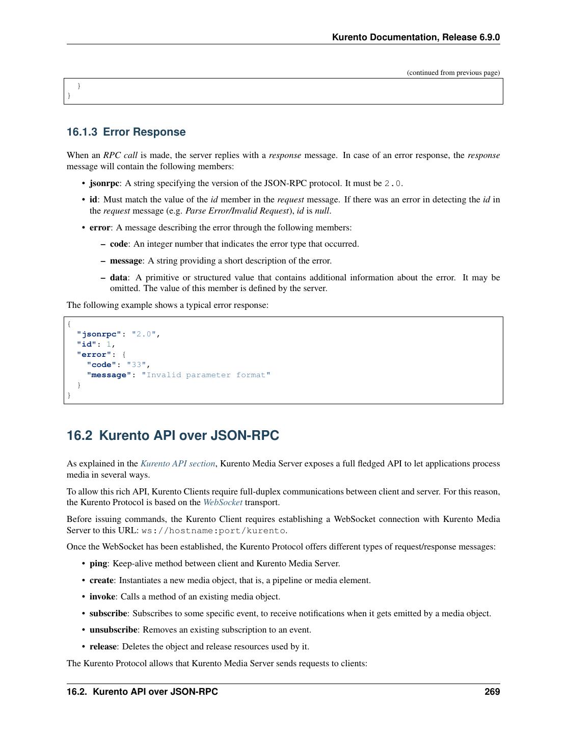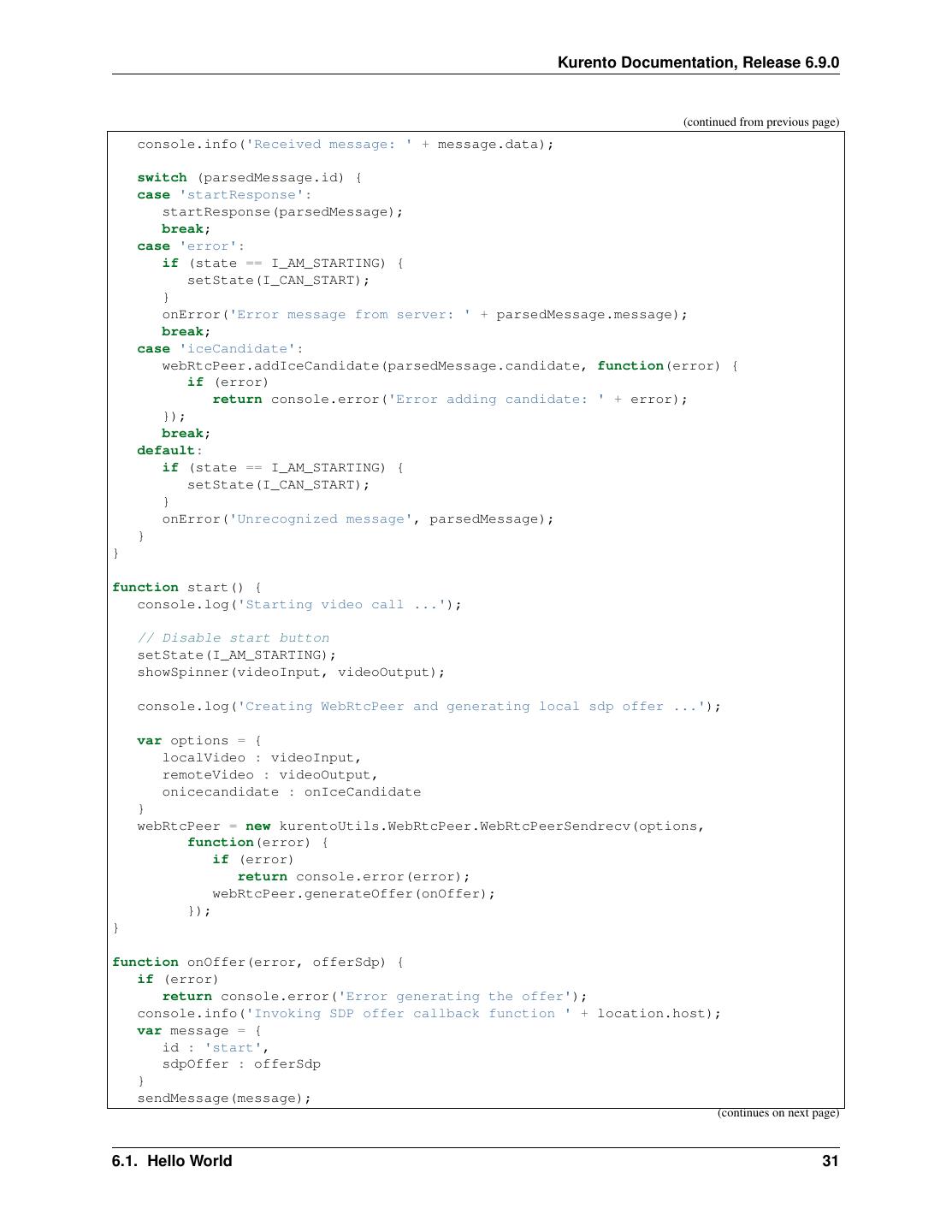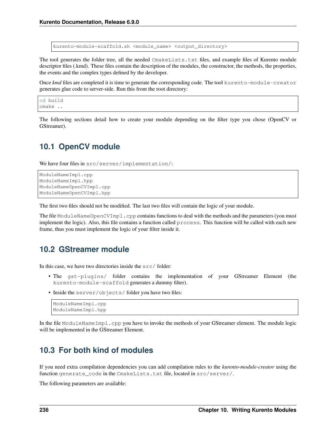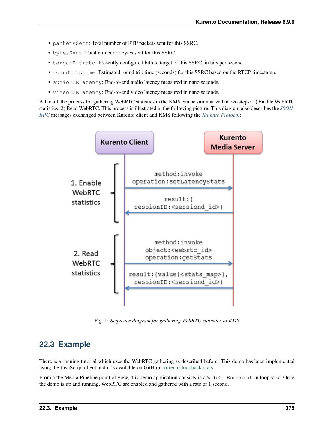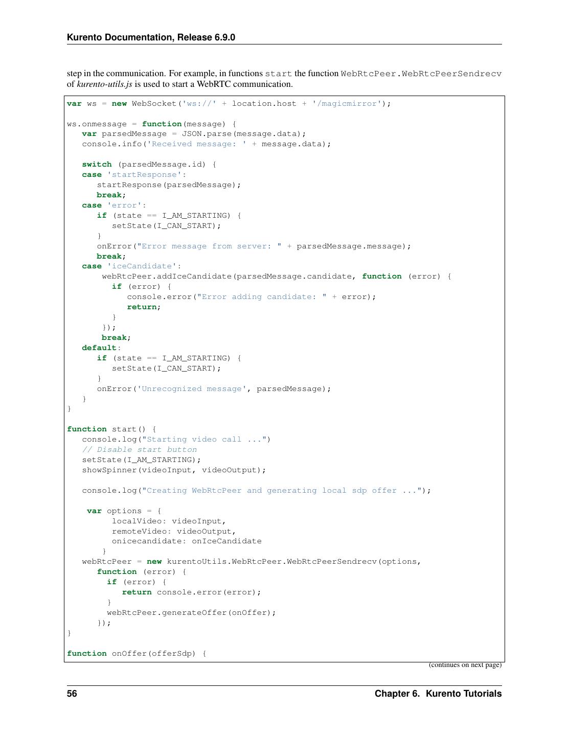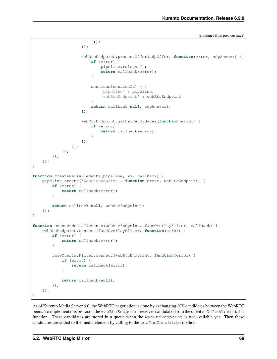 5 . 16.2 Kurento API over JSON-RPC . . . . . . . . . . . . . . . . . . . . . . . . . . . . . . . . . . . . . . 269 16.3 Network issues . . . . . . . . . . . . . . . . . . . . . . . . . . . . . . . . . . . . . . . . . . . . . . 274 16.4 Example: WebRTC in loopback . . . . . . . . . . . . . . . . . . . . . . . . . . . . . . . . . . . . . 275 16.5 Creating a custom Kurento Client . . . . . . . . . . . . . . . . . . . . . . . . . . . . . . . . . . . . 277 17 Kurento Modules 279 17.1 Module Tutorial - Pointer Detector Filter . . . . . . . . . . . . . . . . . . . . . . . . . . . . . . . . 280 17.2 Module Tutorial - Chroma Filter . . . . . . . . . . . . . . . . . . . . . . . . . . . . . . . . . . . . . 300 17.3 Module Tutorial - Crowd Detector Filter . . . . . . . . . . . . . . . . . . . . . . . . . . . . . . . . 316 17.4 Module Tutorial - Plate Detector Filter . . . . . . . . . . . . . . . . . . . . . . . . . . . . . . . . . 334 18 Kurento Utils JS 349 18.1 Overview . . . . . . . . . . . . . . . . . . . . . . . . . . . . . . . . . . . . . . . . . . . . . . . . . 349 18.2 How to use it . . . . . . . . . . . . . . . . . . . . . . . . . . . . . . . . . . . . . . . . . . . . . . . 349 18.3 Examples . . . . . . . . . . . . . . . . . . . . . . . . . . . . . . . . . . . . . . . . . . . . . . . . . 350 18.4 Using data channels . . . . . . . . . . . . . . . . . . . . . . . . . . . . . . . . . . . . . . . . . . . 351 18.5 Reference documentation . . . . . . . . . . . . . . . . . . . . . . . . . . . . . . . . . . . . . . . . 352 18.6 Souce code . . . . . . . . . . . . . . . . . . . . . . . . . . . . . . . . . . . . . . . . . . . . . . . . 356 18.7 Build for browser . . . . . . . . . . . . . . . . . . . . . . . . . . . . . . . . . . . . . . . . . . . . . 356 19 Endpoint Events 357 19.1 MediaObject events . . . . . . . . . . . . . . . . . . . . . . . . . . . . . . . . . . . . . . . . . . . 358 19.2 MediaElement events . . . . . . . . . . . . . . . . . . . . . . . . . . . . . . . . . . . . . . . . . . 358 19.3 BaseRtpEndpoint events . . . . . . . . . . . . . . . . . . . . . . . . . . . . . . . . . . . . . . . . . 359 19.4 WebRtcEndpoint events . . . . . . . . . . . . . . . . . . . . . . . . . . . . . . . . . . . . . . . . . 360 19.5 Sample sequence of events: WebRtcEndpoint . . . . . . . . . . . . . . . . . . . . . . . . . . . . . . 363 20 NAT Traversal 365 20.1 WebRTC with ICE . . . . . . . . . . . . . . . . . . . . . . . . . . . . . . . . . . . . . . . . . . . . 365 20.2 RTP without ICE . . . . . . . . . . . . . . . . . . . . . . . . . . . . . . . . . . . . . . . . . . . . . 365 21 Securing Kurento Applications 369 21.1 Securing Application Servers . . . . . . . . . . . . . . . . . . . . . . . . . . . . . . . . . . . . . . 369 21.2 Securing server applications . . . . . . . . . . . . . . . . . . . . . . . . . . . . . . . . . . . . . . . 371 22 WebRTC Statistics 373 22.1 Introduction . . . . . . . . . . . . . . . . . . . . . . . . . . . . . . . . . . . . . . . . . . . . . . . 373 22.2 API description . . . . . . . . . . . . . . . . . . . . . . . . . . . . . . . . . . . . . . . . . . . . . . 373 22.3 Example . . . . . . . . . . . . . . . . . . . . . . . . . . . . . . . . . . . . . . . . . . . . . . . . . 375 23 Debug Logging 377 23.1 Logging levels and components . . . . . . . . . . . . . . . . . . . . . . . . . . . . . . . . . . . . . 378 23.2 Suggested levels . . . . . . . . . . . . . . . . . . . . . . . . . . . . . . . . . . . . . . . . . . . . . 379 23.3 3rd-Party libraries . . . . . . . . . . . . . . . . . . . . . . . . . . . . . . . . . . . . . . . . . . . . 380 24 Kurento Team 383 25 Contribution Guide 385 26 Code of Conduct 387 27 Release Notes 389 27.1 6.9.0 (Dec 2018) . . . . . . . . . . . . . . . . . . . . . . . . . . . . . . . . . . . . . . . . . . . . . 389 27.2 6.8.1 (Oct 2018) . . . . . . . . . . . . . . . . . . . . . . . . . . . . . . . . . . . . . . . . . . . . . 392 27.3 6.7.2 (May 2018) . . . . . . . . . . . . . . . . . . . . . . . . . . . . . . . . . . . . . . . . . . . . . 393 iii