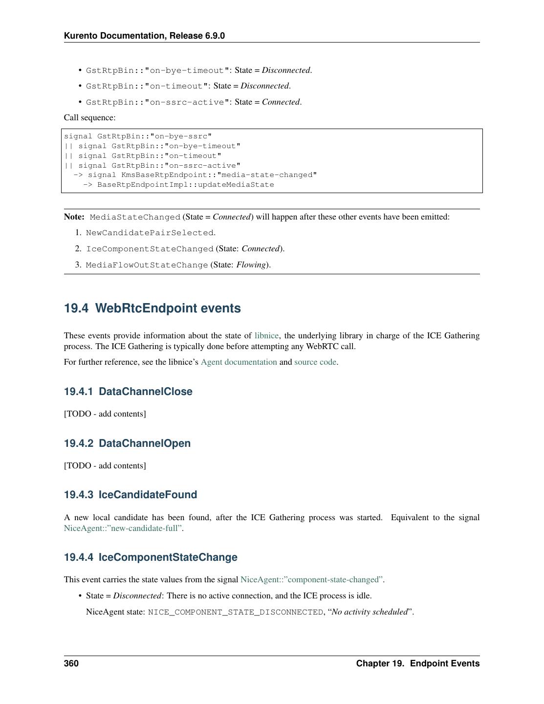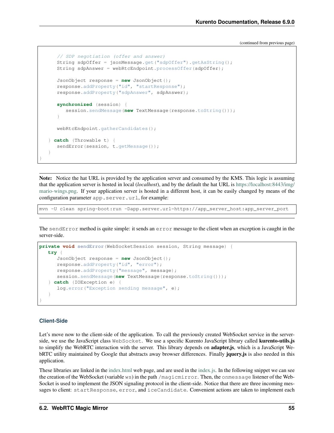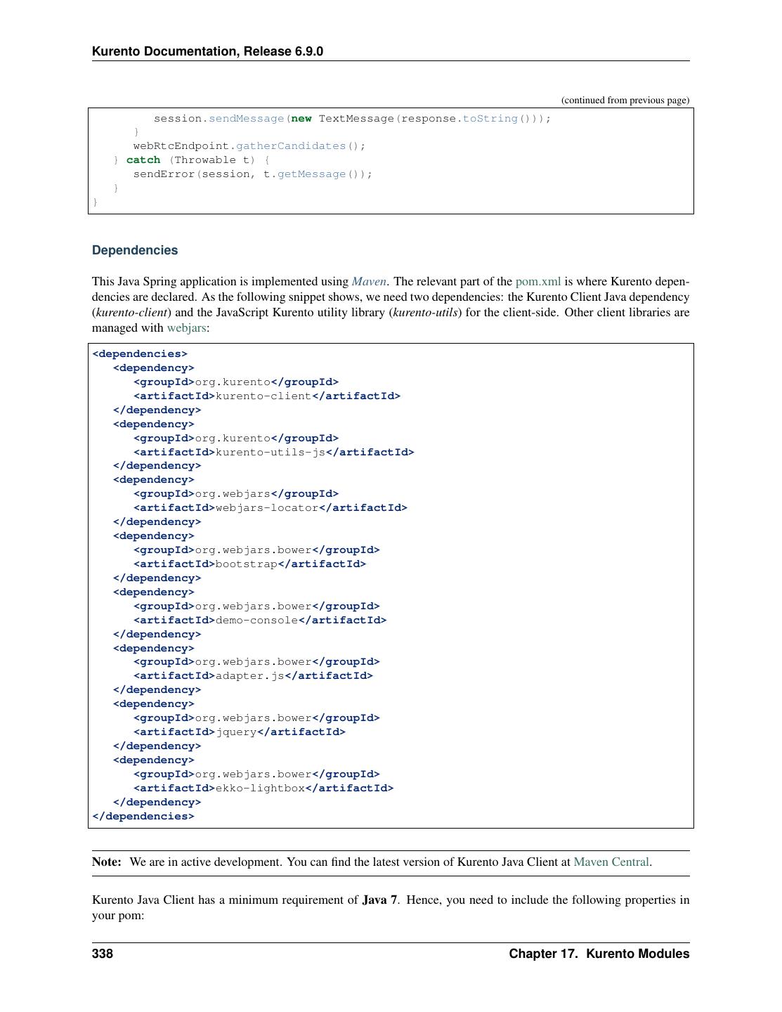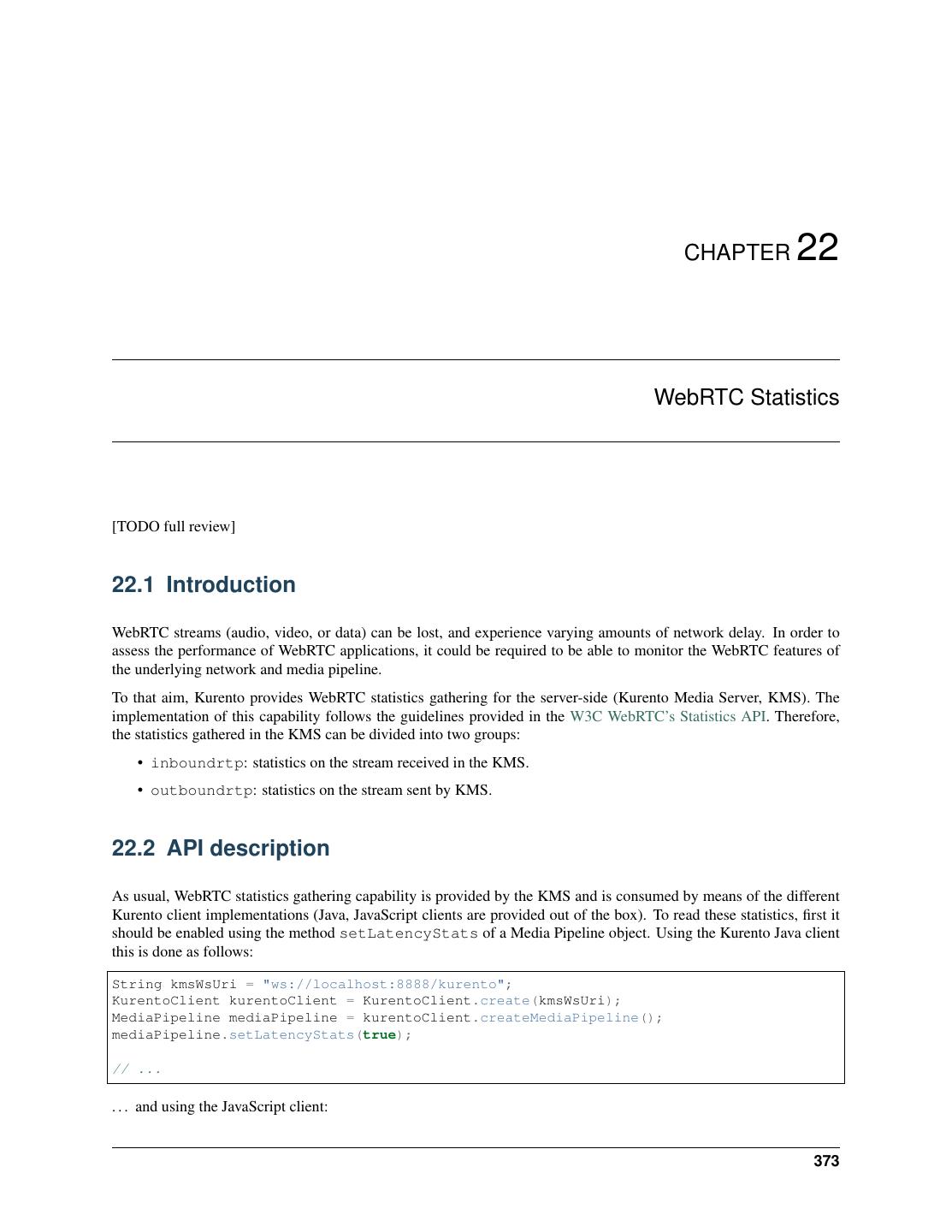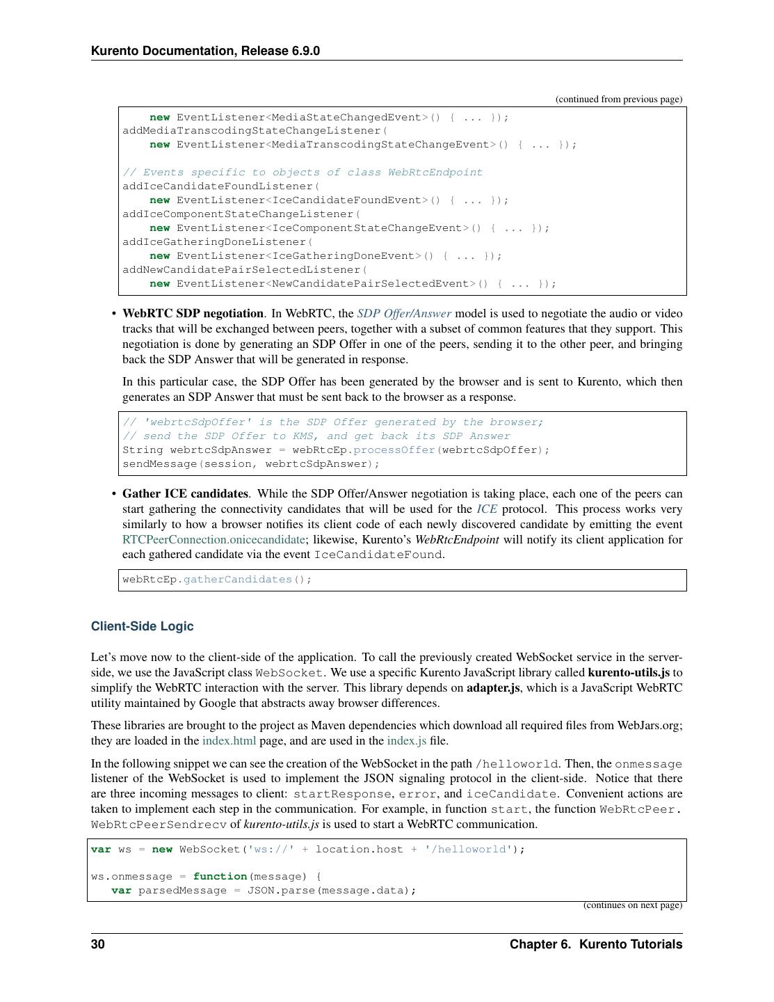 5 . 16.2 Kurento API over JSON-RPC . . . . . . . . . . . . . . . . . . . . . . . . . . . . . . . . . . . . . . 269 16.3 Network issues . . . . . . . . . . . . . . . . . . . . . . . . . . . . . . . . . . . . . . . . . . . . . . 274 16.4 Example: WebRTC in loopback . . . . . . . . . . . . . . . . . . . . . . . . . . . . . . . . . . . . . 275 16.5 Creating a custom Kurento Client . . . . . . . . . . . . . . . . . . . . . . . . . . . . . . . . . . . . 277 17 Kurento Modules 279 17.1 Module Tutorial - Pointer Detector Filter . . . . . . . . . . . . . . . . . . . . . . . . . . . . . . . . 280 17.2 Module Tutorial - Chroma Filter . . . . . . . . . . . . . . . . . . . . . . . . . . . . . . . . . . . . . 300 17.3 Module Tutorial - Crowd Detector Filter . . . . . . . . . . . . . . . . . . . . . . . . . . . . . . . . 316 17.4 Module Tutorial - Plate Detector Filter . . . . . . . . . . . . . . . . . . . . . . . . . . . . . . . . . 334 18 Kurento Utils JS 349 18.1 Overview . . . . . . . . . . . . . . . . . . . . . . . . . . . . . . . . . . . . . . . . . . . . . . . . . 349 18.2 How to use it . . . . . . . . . . . . . . . . . . . . . . . . . . . . . . . . . . . . . . . . . . . . . . . 349 18.3 Examples . . . . . . . . . . . . . . . . . . . . . . . . . . . . . . . . . . . . . . . . . . . . . . . . . 350 18.4 Using data channels . . . . . . . . . . . . . . . . . . . . . . . . . . . . . . . . . . . . . . . . . . . 351 18.5 Reference documentation . . . . . . . . . . . . . . . . . . . . . . . . . . . . . . . . . . . . . . . . 352 18.6 Souce code . . . . . . . . . . . . . . . . . . . . . . . . . . . . . . . . . . . . . . . . . . . . . . . . 356 18.7 Build for browser . . . . . . . . . . . . . . . . . . . . . . . . . . . . . . . . . . . . . . . . . . . . . 356 19 Endpoint Events 357 19.1 MediaObject events . . . . . . . . . . . . . . . . . . . . . . . . . . . . . . . . . . . . . . . . . . . 358 19.2 MediaElement events . . . . . . . . . . . . . . . . . . . . . . . . . . . . . . . . . . . . . . . . . . 358 19.3 BaseRtpEndpoint events . . . . . . . . . . . . . . . . . . . . . . . . . . . . . . . . . . . . . . . . . 359 19.4 WebRtcEndpoint events . . . . . . . . . . . . . . . . . . . . . . . . . . . . . . . . . . . . . . . . . 360 19.5 Sample sequence of events: WebRtcEndpoint . . . . . . . . . . . . . . . . . . . . . . . . . . . . . . 363 20 NAT Traversal 365 20.1 WebRTC with ICE . . . . . . . . . . . . . . . . . . . . . . . . . . . . . . . . . . . . . . . . . . . . 365 20.2 RTP without ICE . . . . . . . . . . . . . . . . . . . . . . . . . . . . . . . . . . . . . . . . . . . . . 365 21 Securing Kurento Applications 369 21.1 Securing Application Servers . . . . . . . . . . . . . . . . . . . . . . . . . . . . . . . . . . . . . . 369 21.2 Securing server applications . . . . . . . . . . . . . . . . . . . . . . . . . . . . . . . . . . . . . . . 371 22 WebRTC Statistics 373 22.1 Introduction . . . . . . . . . . . . . . . . . . . . . . . . . . . . . . . . . . . . . . . . . . . . . . . 373 22.2 API description . . . . . . . . . . . . . . . . . . . . . . . . . . . . . . . . . . . . . . . . . . . . . . 373 22.3 Example . . . . . . . . . . . . . . . . . . . . . . . . . . . . . . . . . . . . . . . . . . . . . . . . . 375 23 Debug Logging 377 23.1 Logging levels and components . . . . . . . . . . . . . . . . . . . . . . . . . . . . . . . . . . . . . 378 23.2 Suggested levels . . . . . . . . . . . . . . . . . . . . . . . . . . . . . . . . . . . . . . . . . . . . . 379 23.3 3rd-Party libraries . . . . . . . . . . . . . . . . . . . . . . . . . . . . . . . . . . . . . . . . . . . . 380 24 Kurento Team 383 25 Contribution Guide 385 26 Code of Conduct 387 27 Release Notes 389 27.1 6.9.0 (Dec 2018) . . . . . . . . . . . . . . . . . . . . . . . . . . . . . . . . . . . . . . . . . . . . . 389 27.2 6.8.1 (Oct 2018) . . . . . . . . . . . . . . . . . . . . . . . . . . . . . . . . . . . . . . . . . . . . . 392 27.3 6.7.2 (May 2018) . . . . . . . . . . . . . . . . . . . . . . . . . . . . . . . . . . . . . . . . . . . . . 393 iii