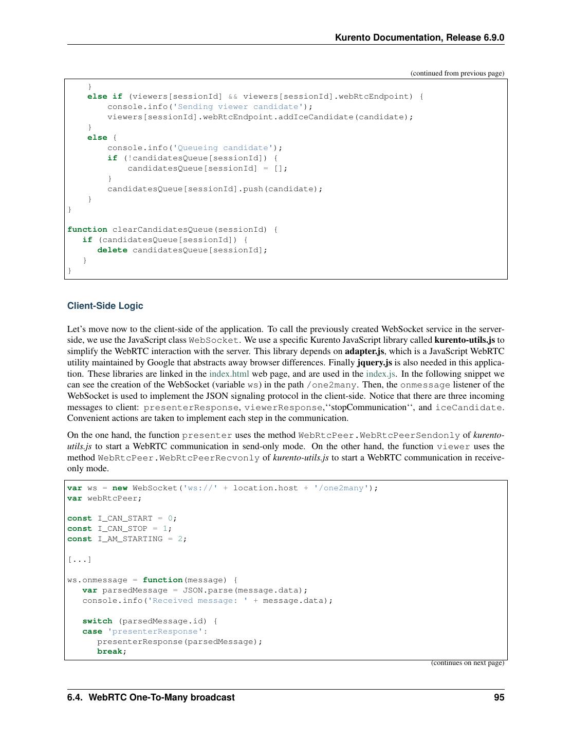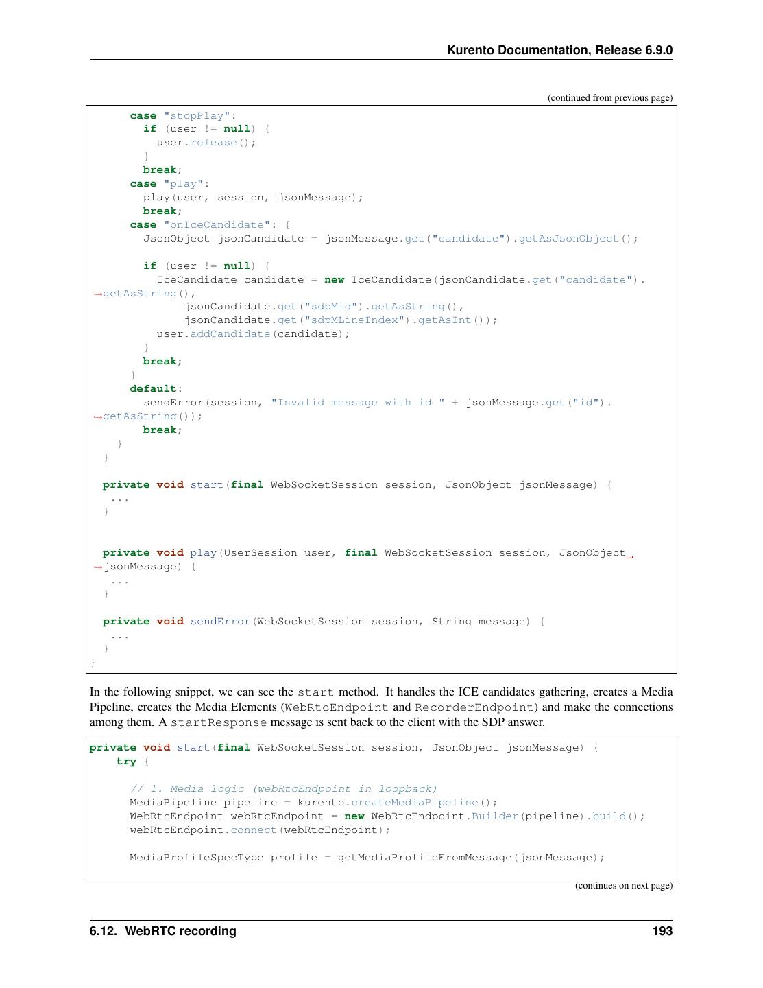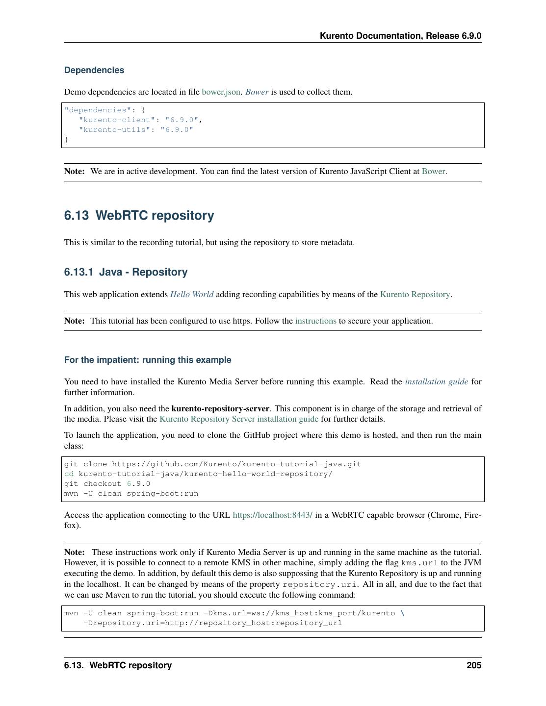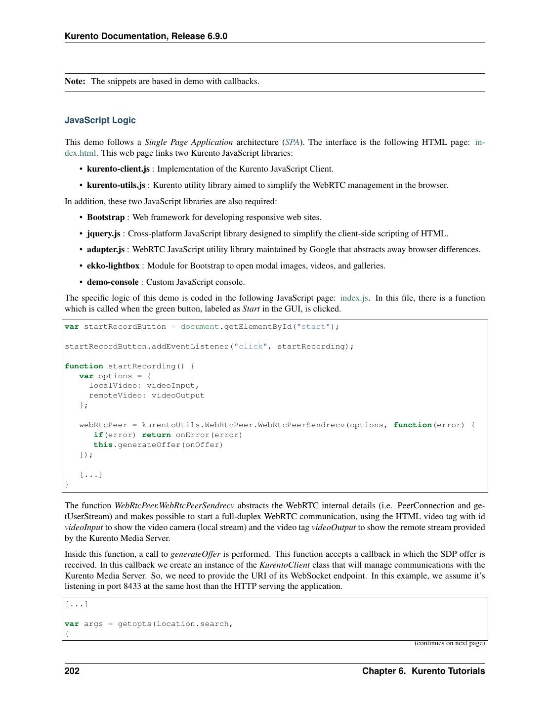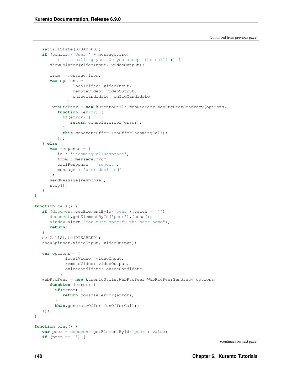 5 . 16.2 Kurento API over JSON-RPC . . . . . . . . . . . . . . . . . . . . . . . . . . . . . . . . . . . . . . 269 16.3 Network issues . . . . . . . . . . . . . . . . . . . . . . . . . . . . . . . . . . . . . . . . . . . . . . 274 16.4 Example: WebRTC in loopback . . . . . . . . . . . . . . . . . . . . . . . . . . . . . . . . . . . . . 275 16.5 Creating a custom Kurento Client . . . . . . . . . . . . . . . . . . . . . . . . . . . . . . . . . . . . 277 17 Kurento Modules 279 17.1 Module Tutorial - Pointer Detector Filter . . . . . . . . . . . . . . . . . . . . . . . . . . . . . . . . 280 17.2 Module Tutorial - Chroma Filter . . . . . . . . . . . . . . . . . . . . . . . . . . . . . . . . . . . . . 300 17.3 Module Tutorial - Crowd Detector Filter . . . . . . . . . . . . . . . . . . . . . . . . . . . . . . . . 316 17.4 Module Tutorial - Plate Detector Filter . . . . . . . . . . . . . . . . . . . . . . . . . . . . . . . . . 334 18 Kurento Utils JS 349 18.1 Overview . . . . . . . . . . . . . . . . . . . . . . . . . . . . . . . . . . . . . . . . . . . . . . . . . 349 18.2 How to use it . . . . . . . . . . . . . . . . . . . . . . . . . . . . . . . . . . . . . . . . . . . . . . . 349 18.3 Examples . . . . . . . . . . . . . . . . . . . . . . . . . . . . . . . . . . . . . . . . . . . . . . . . . 350 18.4 Using data channels . . . . . . . . . . . . . . . . . . . . . . . . . . . . . . . . . . . . . . . . . . . 351 18.5 Reference documentation . . . . . . . . . . . . . . . . . . . . . . . . . . . . . . . . . . . . . . . . 352 18.6 Souce code . . . . . . . . . . . . . . . . . . . . . . . . . . . . . . . . . . . . . . . . . . . . . . . . 356 18.7 Build for browser . . . . . . . . . . . . . . . . . . . . . . . . . . . . . . . . . . . . . . . . . . . . . 356 19 Endpoint Events 357 19.1 MediaObject events . . . . . . . . . . . . . . . . . . . . . . . . . . . . . . . . . . . . . . . . . . . 358 19.2 MediaElement events . . . . . . . . . . . . . . . . . . . . . . . . . . . . . . . . . . . . . . . . . . 358 19.3 BaseRtpEndpoint events . . . . . . . . . . . . . . . . . . . . . . . . . . . . . . . . . . . . . . . . . 359 19.4 WebRtcEndpoint events . . . . . . . . . . . . . . . . . . . . . . . . . . . . . . . . . . . . . . . . . 360 19.5 Sample sequence of events: WebRtcEndpoint . . . . . . . . . . . . . . . . . . . . . . . . . . . . . . 363 20 NAT Traversal 365 20.1 WebRTC with ICE . . . . . . . . . . . . . . . . . . . . . . . . . . . . . . . . . . . . . . . . . . . . 365 20.2 RTP without ICE . . . . . . . . . . . . . . . . . . . . . . . . . . . . . . . . . . . . . . . . . . . . . 365 21 Securing Kurento Applications 369 21.1 Securing Application Servers . . . . . . . . . . . . . . . . . . . . . . . . . . . . . . . . . . . . . . 369 21.2 Securing server applications . . . . . . . . . . . . . . . . . . . . . . . . . . . . . . . . . . . . . . . 371 22 WebRTC Statistics 373 22.1 Introduction . . . . . . . . . . . . . . . . . . . . . . . . . . . . . . . . . . . . . . . . . . . . . . . 373 22.2 API description . . . . . . . . . . . . . . . . . . . . . . . . . . . . . . . . . . . . . . . . . . . . . . 373 22.3 Example . . . . . . . . . . . . . . . . . . . . . . . . . . . . . . . . . . . . . . . . . . . . . . . . . 375 23 Debug Logging 377 23.1 Logging levels and components . . . . . . . . . . . . . . . . . . . . . . . . . . . . . . . . . . . . . 378 23.2 Suggested levels . . . . . . . . . . . . . . . . . . . . . . . . . . . . . . . . . . . . . . . . . . . . . 379 23.3 3rd-Party libraries . . . . . . . . . . . . . . . . . . . . . . . . . . . . . . . . . . . . . . . . . . . . 380 24 Kurento Team 383 25 Contribution Guide 385 26 Code of Conduct 387 27 Release Notes 389 27.1 6.9.0 (Dec 2018) . . . . . . . . . . . . . . . . . . . . . . . . . . . . . . . . . . . . . . . . . . . . . 389 27.2 6.8.1 (Oct 2018) . . . . . . . . . . . . . . . . . . . . . . . . . . . . . . . . . . . . . . . . . . . . . 392 27.3 6.7.2 (May 2018) . . . . . . . . . . . . . . . . . . . . . . . . . . . . . . . . . . . . . . . . . . . . . 393 iii