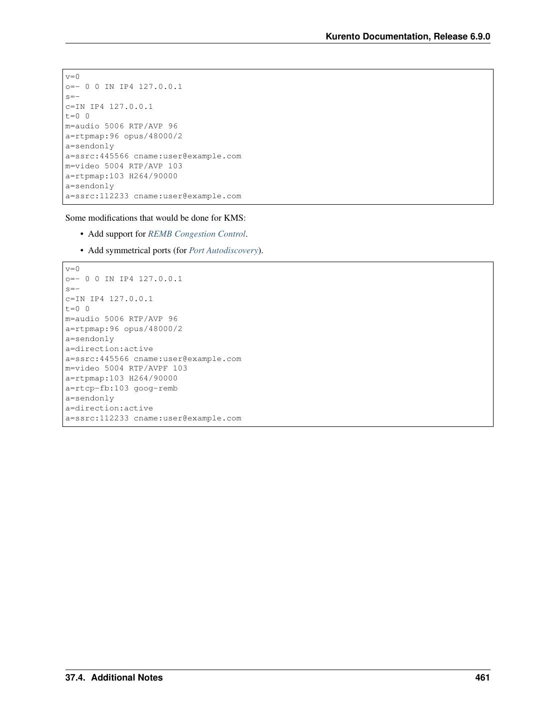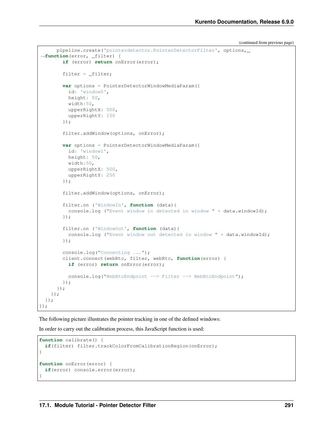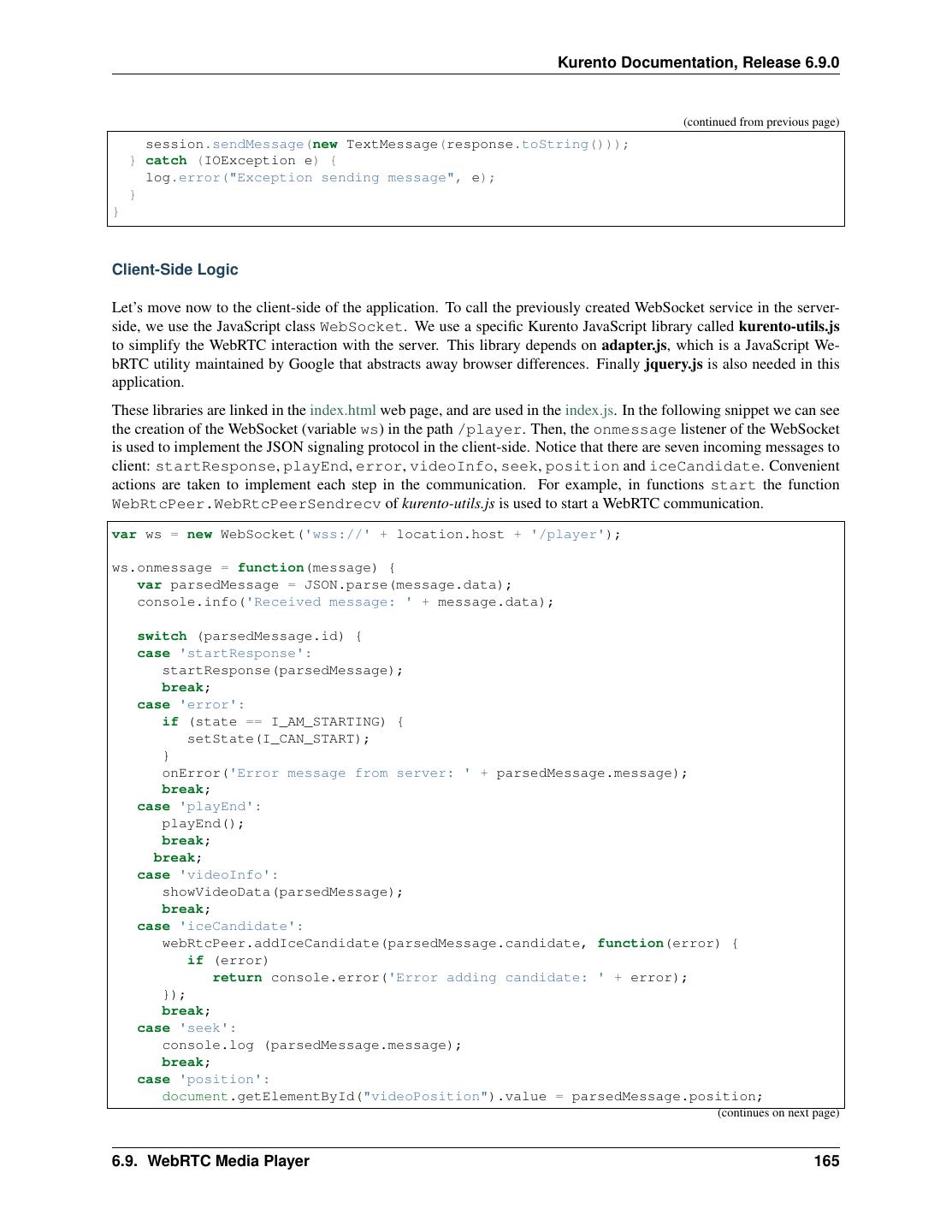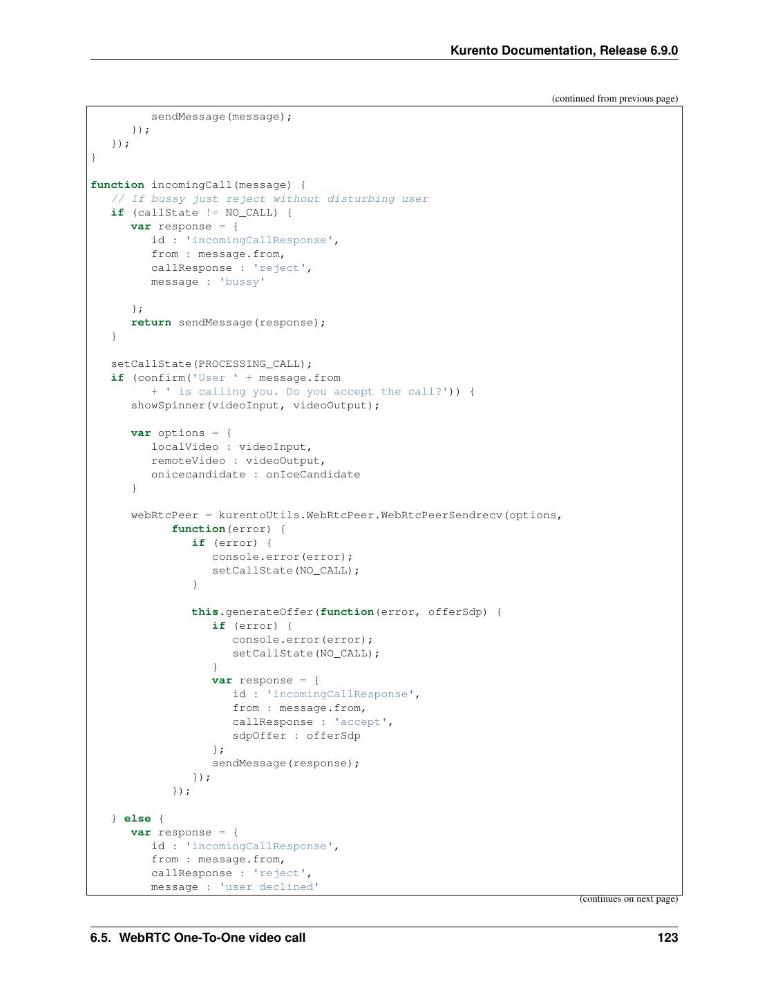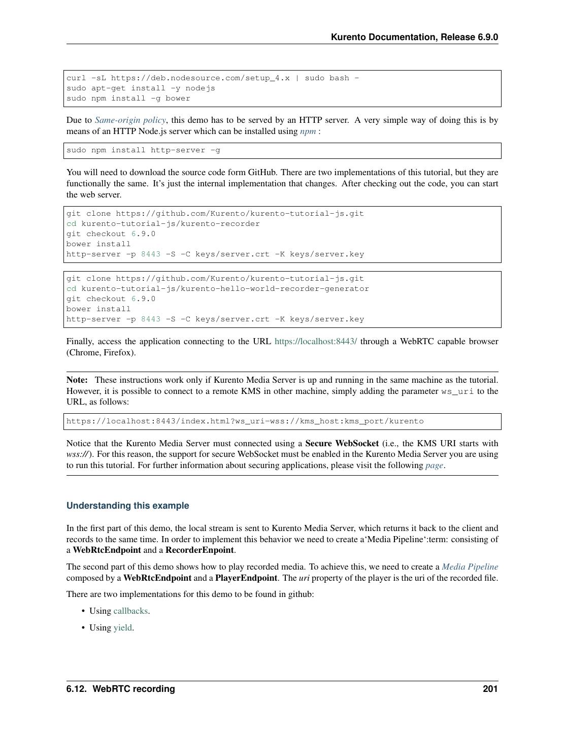 5 . 16.2 Kurento API over JSON-RPC . . . . . . . . . . . . . . . . . . . . . . . . . . . . . . . . . . . . . . 269 16.3 Network issues . . . . . . . . . . . . . . . . . . . . . . . . . . . . . . . . . . . . . . . . . . . . . . 274 16.4 Example: WebRTC in loopback . . . . . . . . . . . . . . . . . . . . . . . . . . . . . . . . . . . . . 275 16.5 Creating a custom Kurento Client . . . . . . . . . . . . . . . . . . . . . . . . . . . . . . . . . . . . 277 17 Kurento Modules 279 17.1 Module Tutorial - Pointer Detector Filter . . . . . . . . . . . . . . . . . . . . . . . . . . . . . . . . 280 17.2 Module Tutorial - Chroma Filter . . . . . . . . . . . . . . . . . . . . . . . . . . . . . . . . . . . . . 300 17.3 Module Tutorial - Crowd Detector Filter . . . . . . . . . . . . . . . . . . . . . . . . . . . . . . . . 316 17.4 Module Tutorial - Plate Detector Filter . . . . . . . . . . . . . . . . . . . . . . . . . . . . . . . . . 334 18 Kurento Utils JS 349 18.1 Overview . . . . . . . . . . . . . . . . . . . . . . . . . . . . . . . . . . . . . . . . . . . . . . . . . 349 18.2 How to use it . . . . . . . . . . . . . . . . . . . . . . . . . . . . . . . . . . . . . . . . . . . . . . . 349 18.3 Examples . . . . . . . . . . . . . . . . . . . . . . . . . . . . . . . . . . . . . . . . . . . . . . . . . 350 18.4 Using data channels . . . . . . . . . . . . . . . . . . . . . . . . . . . . . . . . . . . . . . . . . . . 351 18.5 Reference documentation . . . . . . . . . . . . . . . . . . . . . . . . . . . . . . . . . . . . . . . . 352 18.6 Souce code . . . . . . . . . . . . . . . . . . . . . . . . . . . . . . . . . . . . . . . . . . . . . . . . 356 18.7 Build for browser . . . . . . . . . . . . . . . . . . . . . . . . . . . . . . . . . . . . . . . . . . . . . 356 19 Endpoint Events 357 19.1 MediaObject events . . . . . . . . . . . . . . . . . . . . . . . . . . . . . . . . . . . . . . . . . . . 358 19.2 MediaElement events . . . . . . . . . . . . . . . . . . . . . . . . . . . . . . . . . . . . . . . . . . 358 19.3 BaseRtpEndpoint events . . . . . . . . . . . . . . . . . . . . . . . . . . . . . . . . . . . . . . . . . 359 19.4 WebRtcEndpoint events . . . . . . . . . . . . . . . . . . . . . . . . . . . . . . . . . . . . . . . . . 360 19.5 Sample sequence of events: WebRtcEndpoint . . . . . . . . . . . . . . . . . . . . . . . . . . . . . . 363 20 NAT Traversal 365 20.1 WebRTC with ICE . . . . . . . . . . . . . . . . . . . . . . . . . . . . . . . . . . . . . . . . . . . . 365 20.2 RTP without ICE . . . . . . . . . . . . . . . . . . . . . . . . . . . . . . . . . . . . . . . . . . . . . 365 21 Securing Kurento Applications 369 21.1 Securing Application Servers . . . . . . . . . . . . . . . . . . . . . . . . . . . . . . . . . . . . . . 369 21.2 Securing server applications . . . . . . . . . . . . . . . . . . . . . . . . . . . . . . . . . . . . . . . 371 22 WebRTC Statistics 373 22.1 Introduction . . . . . . . . . . . . . . . . . . . . . . . . . . . . . . . . . . . . . . . . . . . . . . . 373 22.2 API description . . . . . . . . . . . . . . . . . . . . . . . . . . . . . . . . . . . . . . . . . . . . . . 373 22.3 Example . . . . . . . . . . . . . . . . . . . . . . . . . . . . . . . . . . . . . . . . . . . . . . . . . 375 23 Debug Logging 377 23.1 Logging levels and components . . . . . . . . . . . . . . . . . . . . . . . . . . . . . . . . . . . . . 378 23.2 Suggested levels . . . . . . . . . . . . . . . . . . . . . . . . . . . . . . . . . . . . . . . . . . . . . 379 23.3 3rd-Party libraries . . . . . . . . . . . . . . . . . . . . . . . . . . . . . . . . . . . . . . . . . . . . 380 24 Kurento Team 383 25 Contribution Guide 385 26 Code of Conduct 387 27 Release Notes 389 27.1 6.9.0 (Dec 2018) . . . . . . . . . . . . . . . . . . . . . . . . . . . . . . . . . . . . . . . . . . . . . 389 27.2 6.8.1 (Oct 2018) . . . . . . . . . . . . . . . . . . . . . . . . . . . . . . . . . . . . . . . . . . . . . 392 27.3 6.7.2 (May 2018) . . . . . . . . . . . . . . . . . . . . . . . . . . . . . . . . . . . . . . . . . . . . . 393 iii
