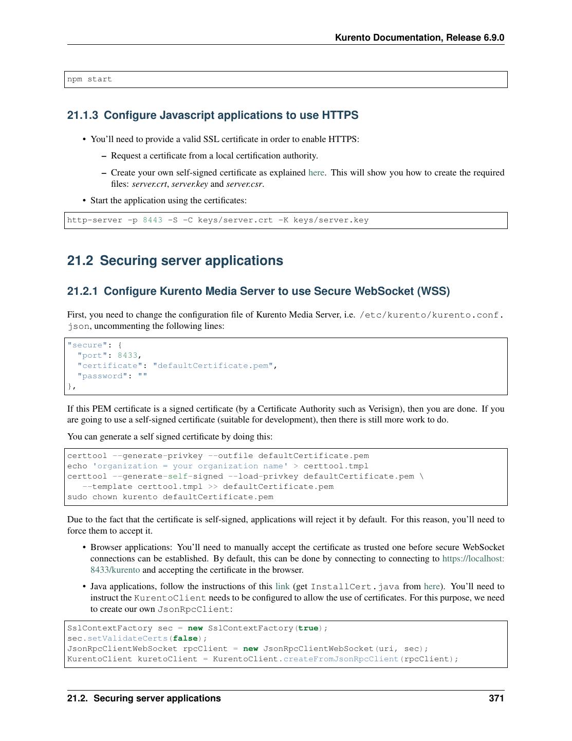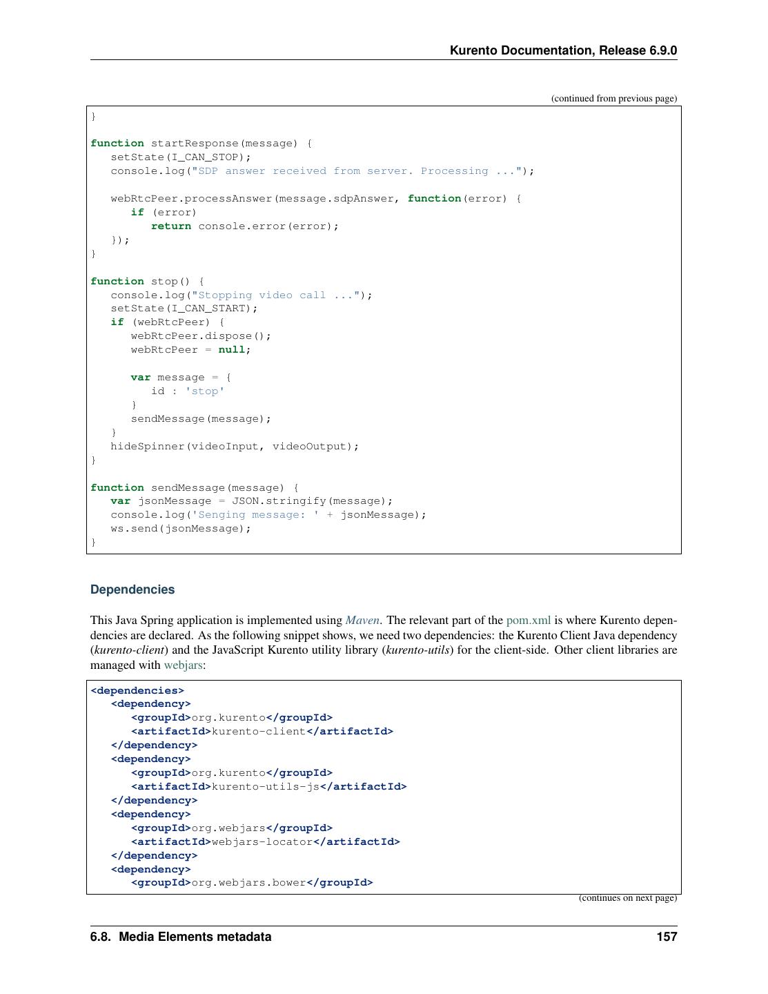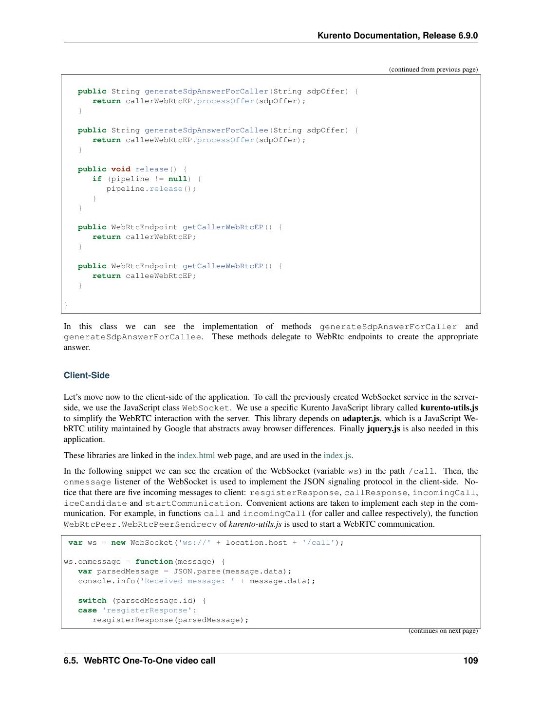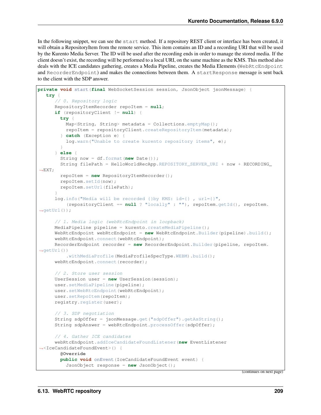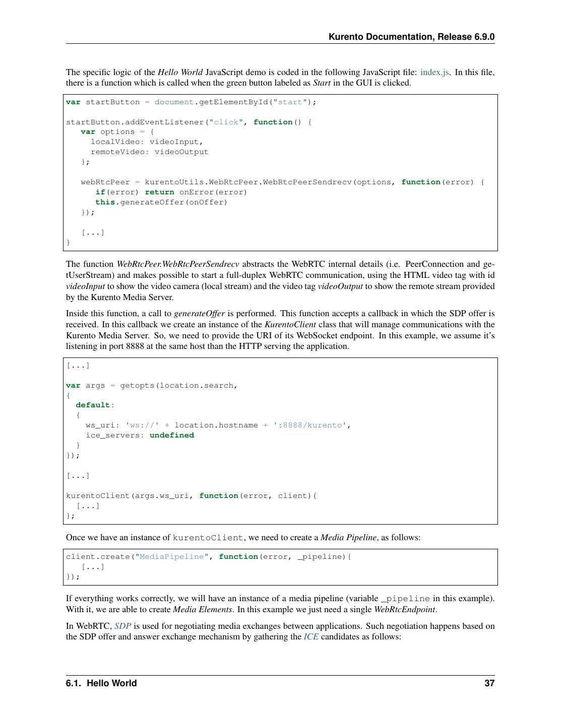 5 . 16.2 Kurento API over JSON-RPC . . . . . . . . . . . . . . . . . . . . . . . . . . . . . . . . . . . . . . 269 16.3 Network issues . . . . . . . . . . . . . . . . . . . . . . . . . . . . . . . . . . . . . . . . . . . . . . 274 16.4 Example: WebRTC in loopback . . . . . . . . . . . . . . . . . . . . . . . . . . . . . . . . . . . . . 275 16.5 Creating a custom Kurento Client . . . . . . . . . . . . . . . . . . . . . . . . . . . . . . . . . . . . 277 17 Kurento Modules 279 17.1 Module Tutorial - Pointer Detector Filter . . . . . . . . . . . . . . . . . . . . . . . . . . . . . . . . 280 17.2 Module Tutorial - Chroma Filter . . . . . . . . . . . . . . . . . . . . . . . . . . . . . . . . . . . . . 300 17.3 Module Tutorial - Crowd Detector Filter . . . . . . . . . . . . . . . . . . . . . . . . . . . . . . . . 316 17.4 Module Tutorial - Plate Detector Filter . . . . . . . . . . . . . . . . . . . . . . . . . . . . . . . . . 334 18 Kurento Utils JS 349 18.1 Overview . . . . . . . . . . . . . . . . . . . . . . . . . . . . . . . . . . . . . . . . . . . . . . . . . 349 18.2 How to use it . . . . . . . . . . . . . . . . . . . . . . . . . . . . . . . . . . . . . . . . . . . . . . . 349 18.3 Examples . . . . . . . . . . . . . . . . . . . . . . . . . . . . . . . . . . . . . . . . . . . . . . . . . 350 18.4 Using data channels . . . . . . . . . . . . . . . . . . . . . . . . . . . . . . . . . . . . . . . . . . . 351 18.5 Reference documentation . . . . . . . . . . . . . . . . . . . . . . . . . . . . . . . . . . . . . . . . 352 18.6 Souce code . . . . . . . . . . . . . . . . . . . . . . . . . . . . . . . . . . . . . . . . . . . . . . . . 356 18.7 Build for browser . . . . . . . . . . . . . . . . . . . . . . . . . . . . . . . . . . . . . . . . . . . . . 356 19 Endpoint Events 357 19.1 MediaObject events . . . . . . . . . . . . . . . . . . . . . . . . . . . . . . . . . . . . . . . . . . . 358 19.2 MediaElement events . . . . . . . . . . . . . . . . . . . . . . . . . . . . . . . . . . . . . . . . . . 358 19.3 BaseRtpEndpoint events . . . . . . . . . . . . . . . . . . . . . . . . . . . . . . . . . . . . . . . . . 359 19.4 WebRtcEndpoint events . . . . . . . . . . . . . . . . . . . . . . . . . . . . . . . . . . . . . . . . . 360 19.5 Sample sequence of events: WebRtcEndpoint . . . . . . . . . . . . . . . . . . . . . . . . . . . . . . 363 20 NAT Traversal 365 20.1 WebRTC with ICE . . . . . . . . . . . . . . . . . . . . . . . . . . . . . . . . . . . . . . . . . . . . 365 20.2 RTP without ICE . . . . . . . . . . . . . . . . . . . . . . . . . . . . . . . . . . . . . . . . . . . . . 365 21 Securing Kurento Applications 369 21.1 Securing Application Servers . . . . . . . . . . . . . . . . . . . . . . . . . . . . . . . . . . . . . . 369 21.2 Securing server applications . . . . . . . . . . . . . . . . . . . . . . . . . . . . . . . . . . . . . . . 371 22 WebRTC Statistics 373 22.1 Introduction . . . . . . . . . . . . . . . . . . . . . . . . . . . . . . . . . . . . . . . . . . . . . . . 373 22.2 API description . . . . . . . . . . . . . . . . . . . . . . . . . . . . . . . . . . . . . . . . . . . . . . 373 22.3 Example . . . . . . . . . . . . . . . . . . . . . . . . . . . . . . . . . . . . . . . . . . . . . . . . . 375 23 Debug Logging 377 23.1 Logging levels and components . . . . . . . . . . . . . . . . . . . . . . . . . . . . . . . . . . . . . 378 23.2 Suggested levels . . . . . . . . . . . . . . . . . . . . . . . . . . . . . . . . . . . . . . . . . . . . . 379 23.3 3rd-Party libraries . . . . . . . . . . . . . . . . . . . . . . . . . . . . . . . . . . . . . . . . . . . . 380 24 Kurento Team 383 25 Contribution Guide 385 26 Code of Conduct 387 27 Release Notes 389 27.1 6.9.0 (Dec 2018) . . . . . . . . . . . . . . . . . . . . . . . . . . . . . . . . . . . . . . . . . . . . . 389 27.2 6.8.1 (Oct 2018) . . . . . . . . . . . . . . . . . . . . . . . . . . . . . . . . . . . . . . . . . . . . . 392 27.3 6.7.2 (May 2018) . . . . . . . . . . . . . . . . . . . . . . . . . . . . . . . . . . . . . . . . . . . . . 393 iii