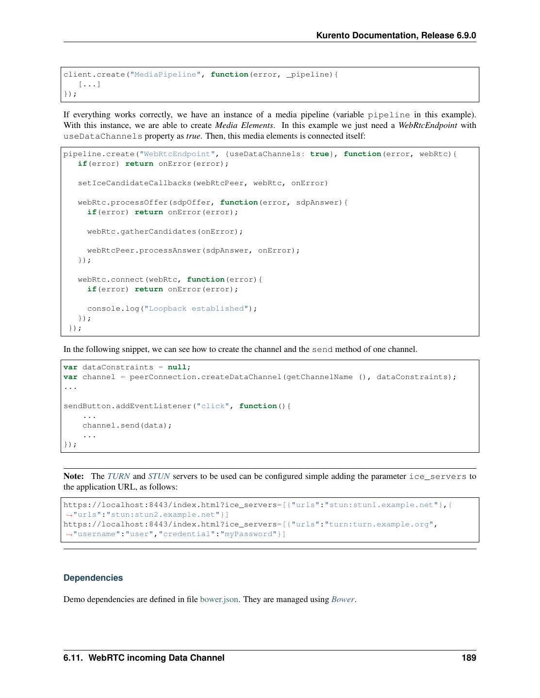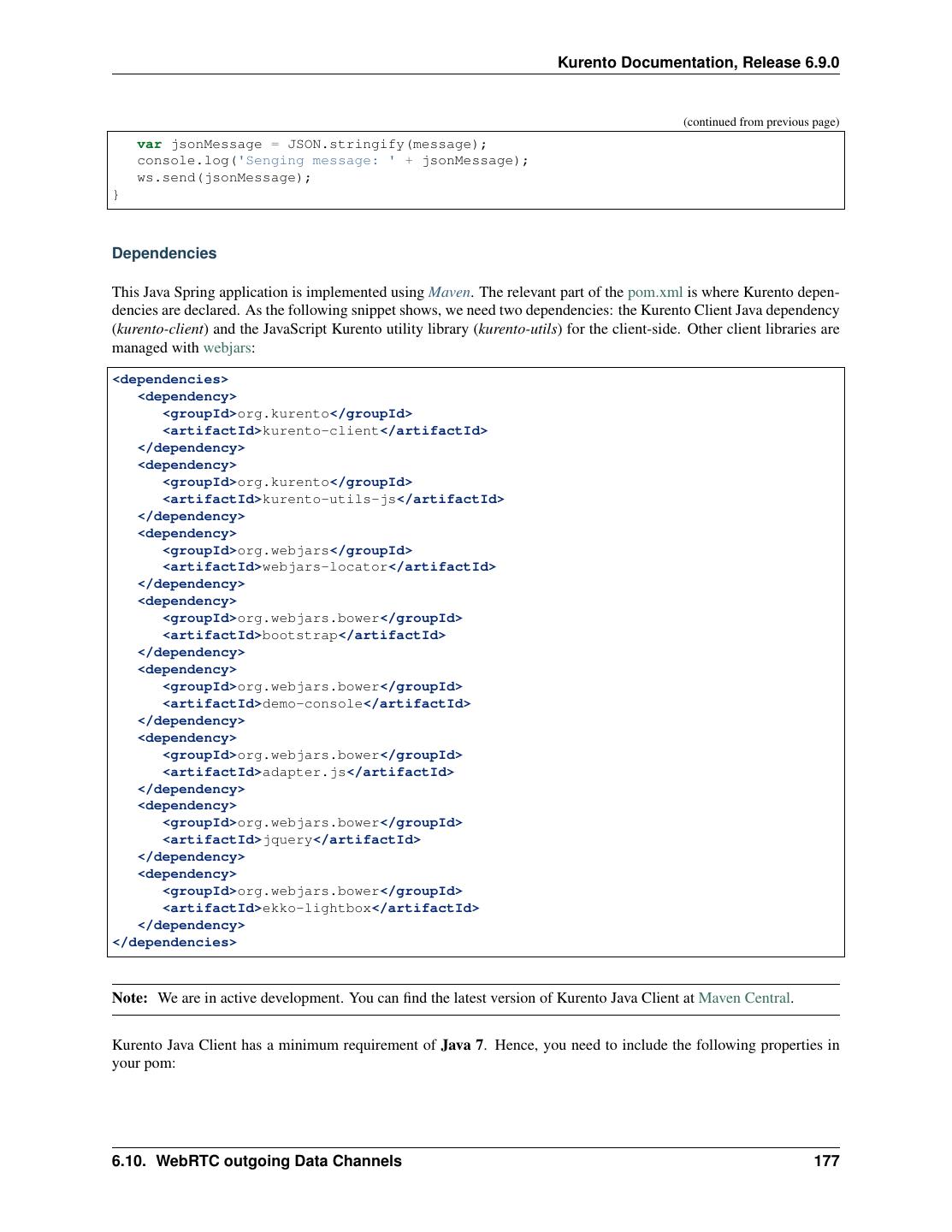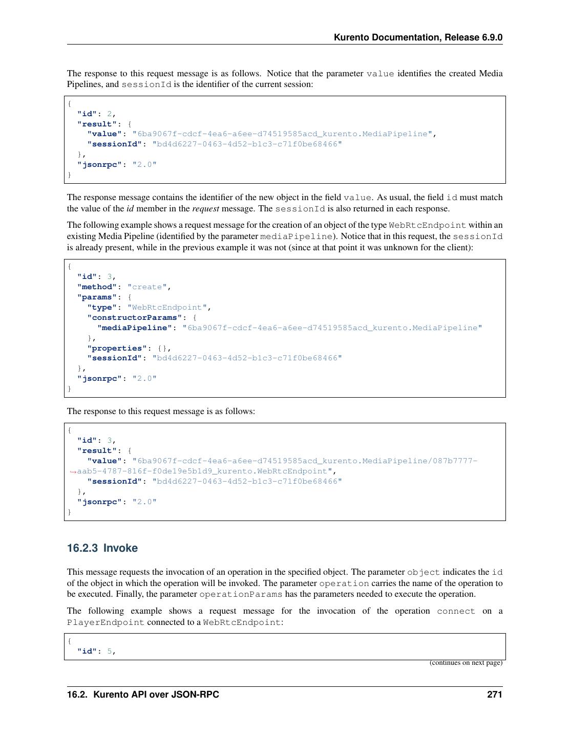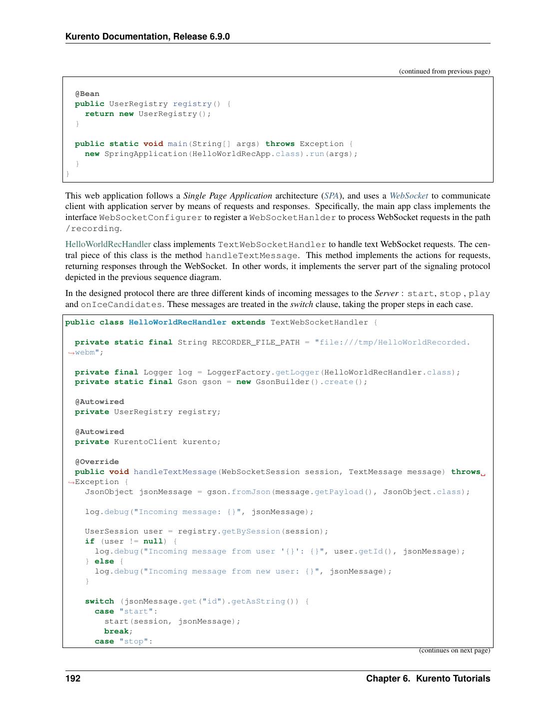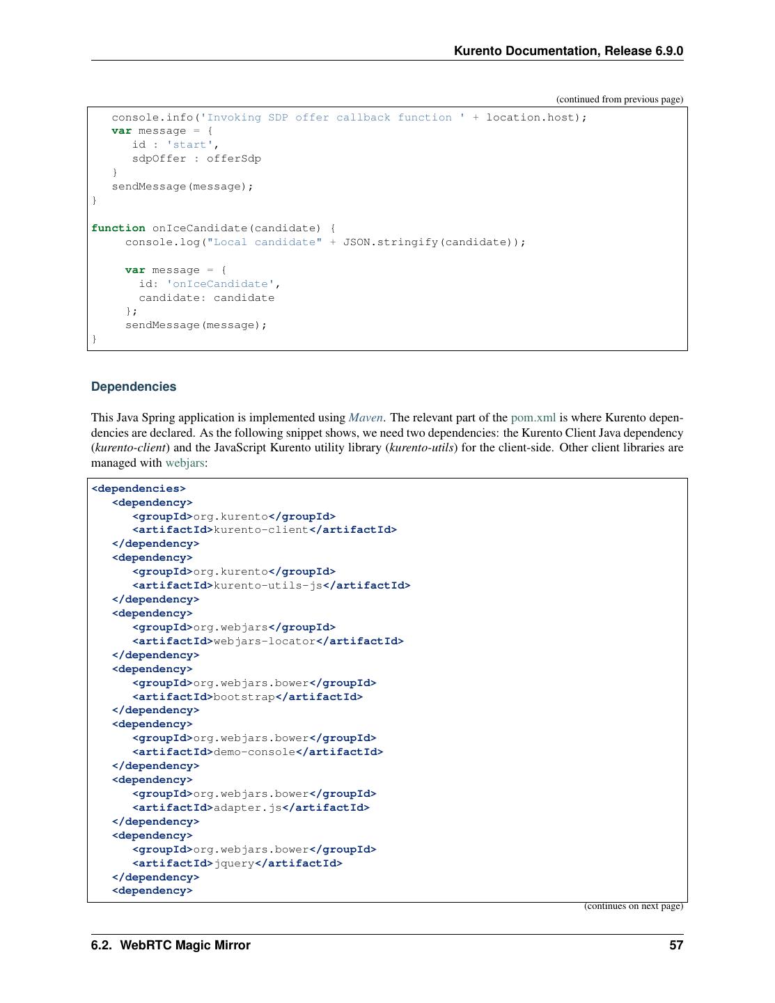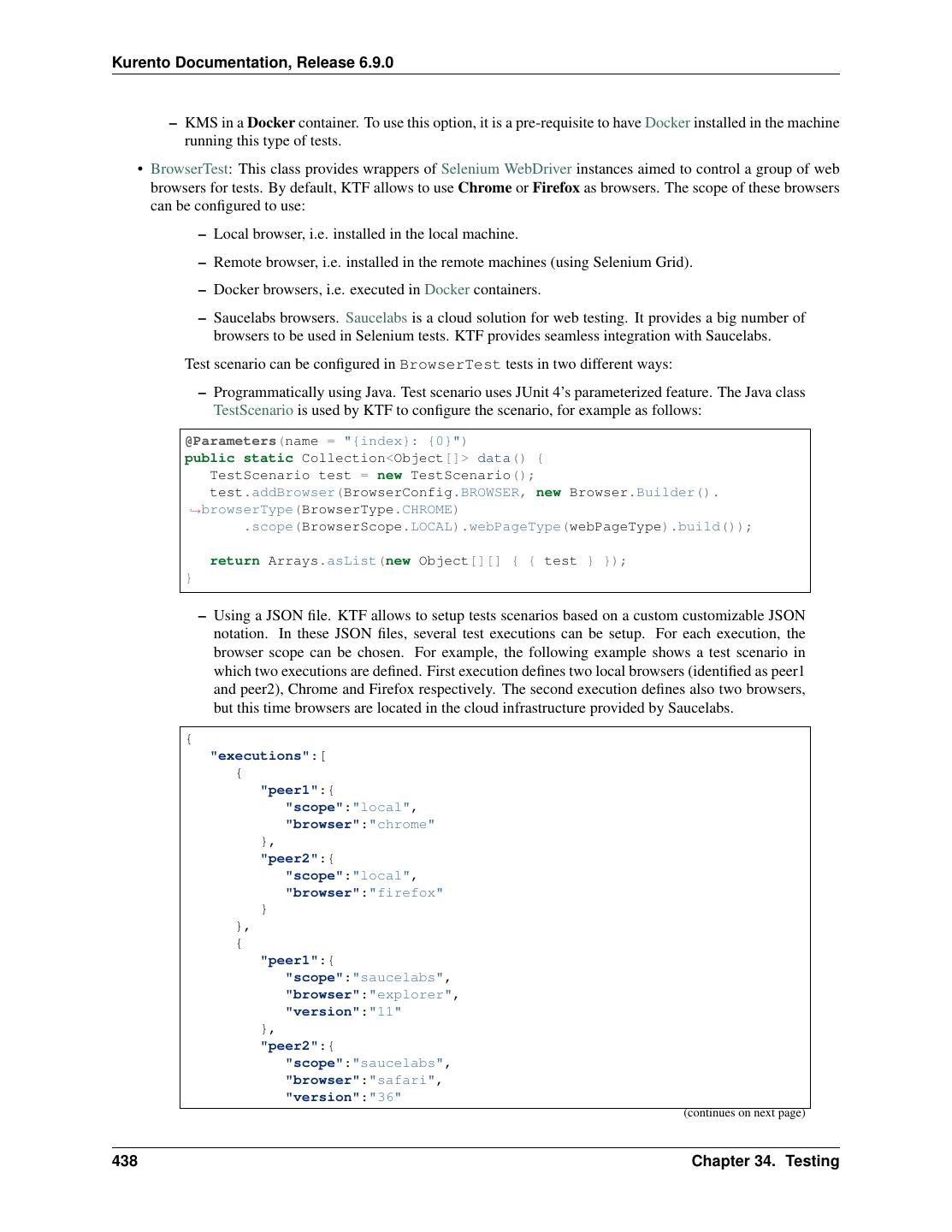 5 . 16.2 Kurento API over JSON-RPC . . . . . . . . . . . . . . . . . . . . . . . . . . . . . . . . . . . . . . 269 16.3 Network issues . . . . . . . . . . . . . . . . . . . . . . . . . . . . . . . . . . . . . . . . . . . . . . 274 16.4 Example: WebRTC in loopback . . . . . . . . . . . . . . . . . . . . . . . . . . . . . . . . . . . . . 275 16.5 Creating a custom Kurento Client . . . . . . . . . . . . . . . . . . . . . . . . . . . . . . . . . . . . 277 17 Kurento Modules 279 17.1 Module Tutorial - Pointer Detector Filter . . . . . . . . . . . . . . . . . . . . . . . . . . . . . . . . 280 17.2 Module Tutorial - Chroma Filter . . . . . . . . . . . . . . . . . . . . . . . . . . . . . . . . . . . . . 300 17.3 Module Tutorial - Crowd Detector Filter . . . . . . . . . . . . . . . . . . . . . . . . . . . . . . . . 316 17.4 Module Tutorial - Plate Detector Filter . . . . . . . . . . . . . . . . . . . . . . . . . . . . . . . . . 334 18 Kurento Utils JS 349 18.1 Overview . . . . . . . . . . . . . . . . . . . . . . . . . . . . . . . . . . . . . . . . . . . . . . . . . 349 18.2 How to use it . . . . . . . . . . . . . . . . . . . . . . . . . . . . . . . . . . . . . . . . . . . . . . . 349 18.3 Examples . . . . . . . . . . . . . . . . . . . . . . . . . . . . . . . . . . . . . . . . . . . . . . . . . 350 18.4 Using data channels . . . . . . . . . . . . . . . . . . . . . . . . . . . . . . . . . . . . . . . . . . . 351 18.5 Reference documentation . . . . . . . . . . . . . . . . . . . . . . . . . . . . . . . . . . . . . . . . 352 18.6 Souce code . . . . . . . . . . . . . . . . . . . . . . . . . . . . . . . . . . . . . . . . . . . . . . . . 356 18.7 Build for browser . . . . . . . . . . . . . . . . . . . . . . . . . . . . . . . . . . . . . . . . . . . . . 356 19 Endpoint Events 357 19.1 MediaObject events . . . . . . . . . . . . . . . . . . . . . . . . . . . . . . . . . . . . . . . . . . . 358 19.2 MediaElement events . . . . . . . . . . . . . . . . . . . . . . . . . . . . . . . . . . . . . . . . . . 358 19.3 BaseRtpEndpoint events . . . . . . . . . . . . . . . . . . . . . . . . . . . . . . . . . . . . . . . . . 359 19.4 WebRtcEndpoint events . . . . . . . . . . . . . . . . . . . . . . . . . . . . . . . . . . . . . . . . . 360 19.5 Sample sequence of events: WebRtcEndpoint . . . . . . . . . . . . . . . . . . . . . . . . . . . . . . 363 20 NAT Traversal 365 20.1 WebRTC with ICE . . . . . . . . . . . . . . . . . . . . . . . . . . . . . . . . . . . . . . . . . . . . 365 20.2 RTP without ICE . . . . . . . . . . . . . . . . . . . . . . . . . . . . . . . . . . . . . . . . . . . . . 365 21 Securing Kurento Applications 369 21.1 Securing Application Servers . . . . . . . . . . . . . . . . . . . . . . . . . . . . . . . . . . . . . . 369 21.2 Securing server applications . . . . . . . . . . . . . . . . . . . . . . . . . . . . . . . . . . . . . . . 371 22 WebRTC Statistics 373 22.1 Introduction . . . . . . . . . . . . . . . . . . . . . . . . . . . . . . . . . . . . . . . . . . . . . . . 373 22.2 API description . . . . . . . . . . . . . . . . . . . . . . . . . . . . . . . . . . . . . . . . . . . . . . 373 22.3 Example . . . . . . . . . . . . . . . . . . . . . . . . . . . . . . . . . . . . . . . . . . . . . . . . . 375 23 Debug Logging 377 23.1 Logging levels and components . . . . . . . . . . . . . . . . . . . . . . . . . . . . . . . . . . . . . 378 23.2 Suggested levels . . . . . . . . . . . . . . . . . . . . . . . . . . . . . . . . . . . . . . . . . . . . . 379 23.3 3rd-Party libraries . . . . . . . . . . . . . . . . . . . . . . . . . . . . . . . . . . . . . . . . . . . . 380 24 Kurento Team 383 25 Contribution Guide 385 26 Code of Conduct 387 27 Release Notes 389 27.1 6.9.0 (Dec 2018) . . . . . . . . . . . . . . . . . . . . . . . . . . . . . . . . . . . . . . . . . . . . . 389 27.2 6.8.1 (Oct 2018) . . . . . . . . . . . . . . . . . . . . . . . . . . . . . . . . . . . . . . . . . . . . . 392 27.3 6.7.2 (May 2018) . . . . . . . . . . . . . . . . . . . . . . . . . . . . . . . . . . . . . . . . . . . . . 393 iii