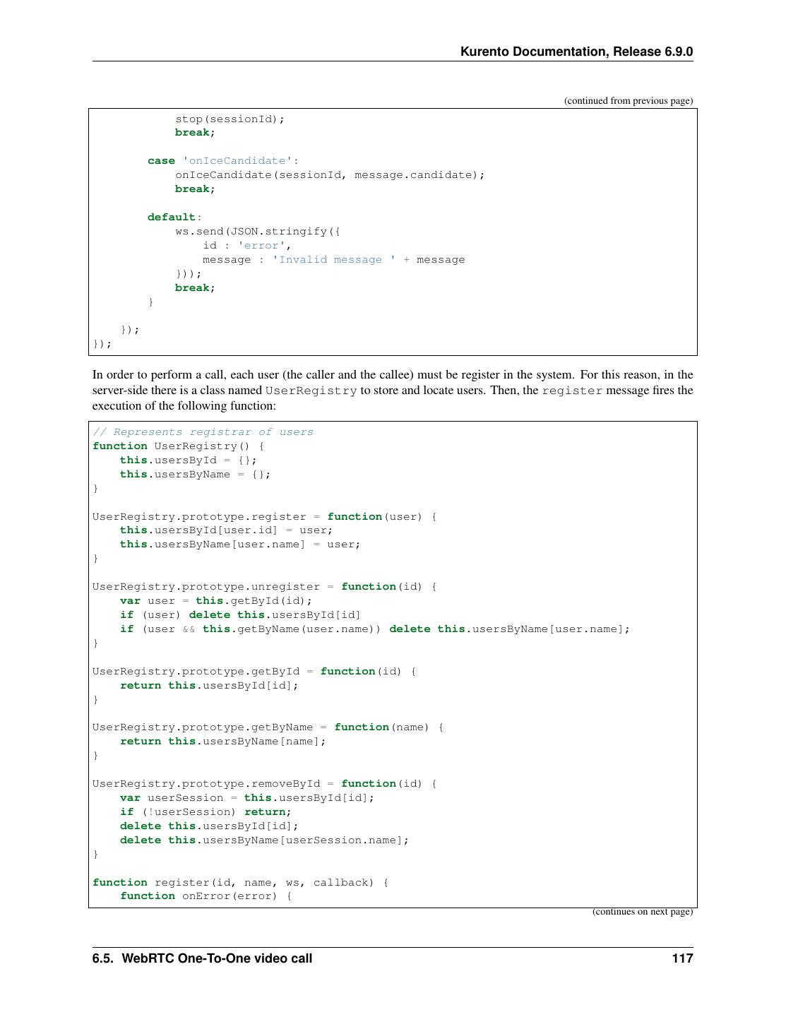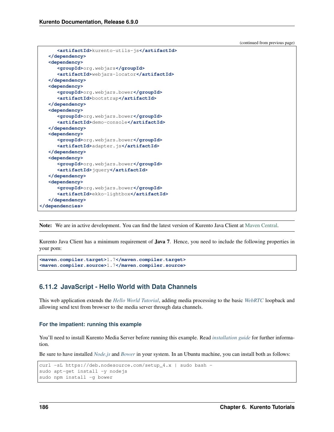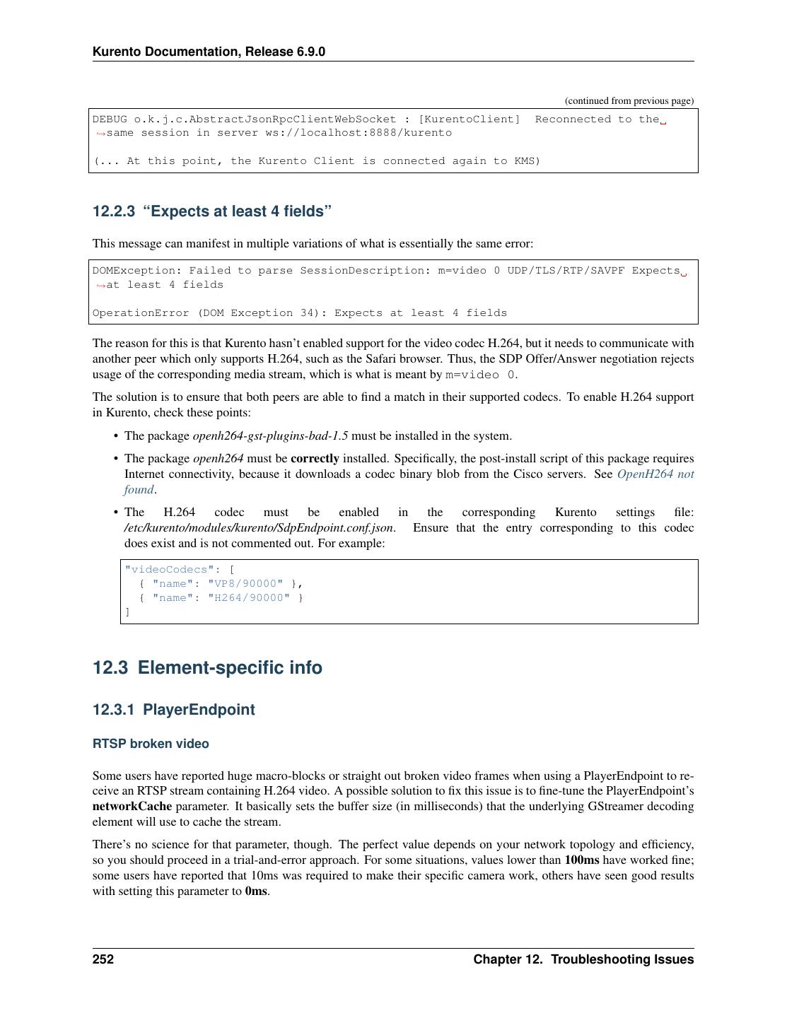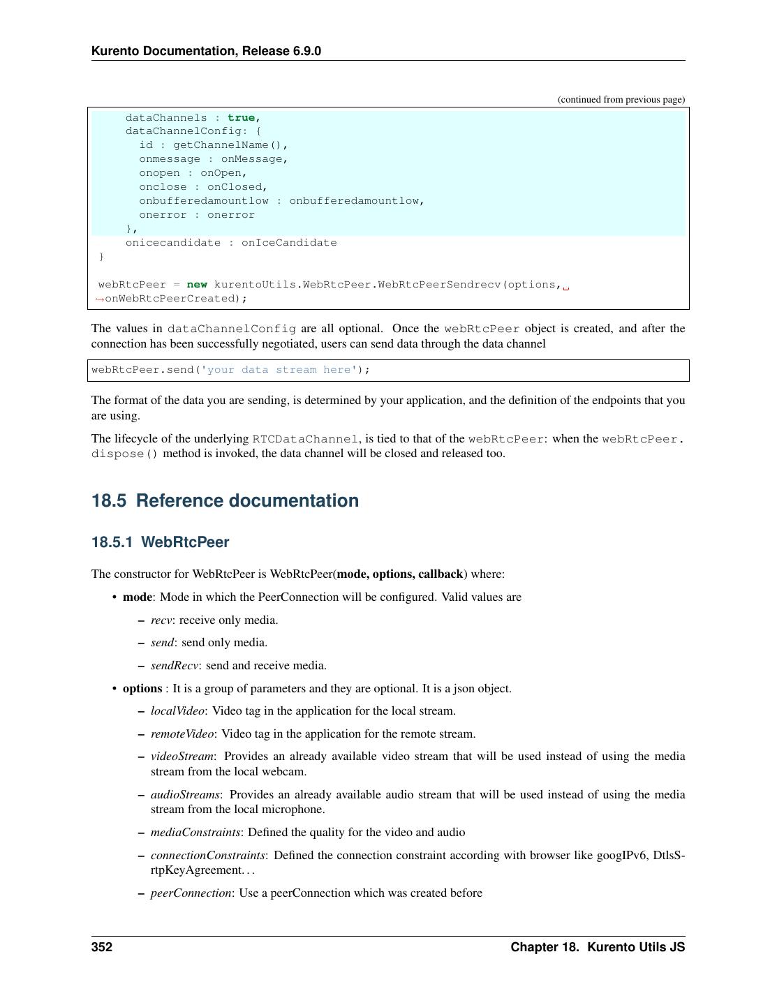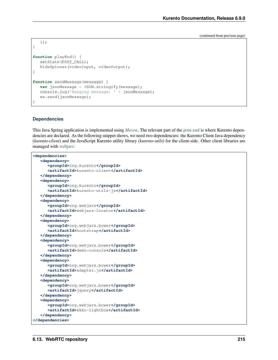 5 . 16.2 Kurento API over JSON-RPC . . . . . . . . . . . . . . . . . . . . . . . . . . . . . . . . . . . . . . 269 16.3 Network issues . . . . . . . . . . . . . . . . . . . . . . . . . . . . . . . . . . . . . . . . . . . . . . 274 16.4 Example: WebRTC in loopback . . . . . . . . . . . . . . . . . . . . . . . . . . . . . . . . . . . . . 275 16.5 Creating a custom Kurento Client . . . . . . . . . . . . . . . . . . . . . . . . . . . . . . . . . . . . 277 17 Kurento Modules 279 17.1 Module Tutorial - Pointer Detector Filter . . . . . . . . . . . . . . . . . . . . . . . . . . . . . . . . 280 17.2 Module Tutorial - Chroma Filter . . . . . . . . . . . . . . . . . . . . . . . . . . . . . . . . . . . . . 300 17.3 Module Tutorial - Crowd Detector Filter . . . . . . . . . . . . . . . . . . . . . . . . . . . . . . . . 316 17.4 Module Tutorial - Plate Detector Filter . . . . . . . . . . . . . . . . . . . . . . . . . . . . . . . . . 334 18 Kurento Utils JS 349 18.1 Overview . . . . . . . . . . . . . . . . . . . . . . . . . . . . . . . . . . . . . . . . . . . . . . . . . 349 18.2 How to use it . . . . . . . . . . . . . . . . . . . . . . . . . . . . . . . . . . . . . . . . . . . . . . . 349 18.3 Examples . . . . . . . . . . . . . . . . . . . . . . . . . . . . . . . . . . . . . . . . . . . . . . . . . 350 18.4 Using data channels . . . . . . . . . . . . . . . . . . . . . . . . . . . . . . . . . . . . . . . . . . . 351 18.5 Reference documentation . . . . . . . . . . . . . . . . . . . . . . . . . . . . . . . . . . . . . . . . 352 18.6 Souce code . . . . . . . . . . . . . . . . . . . . . . . . . . . . . . . . . . . . . . . . . . . . . . . . 356 18.7 Build for browser . . . . . . . . . . . . . . . . . . . . . . . . . . . . . . . . . . . . . . . . . . . . . 356 19 Endpoint Events 357 19.1 MediaObject events . . . . . . . . . . . . . . . . . . . . . . . . . . . . . . . . . . . . . . . . . . . 358 19.2 MediaElement events . . . . . . . . . . . . . . . . . . . . . . . . . . . . . . . . . . . . . . . . . . 358 19.3 BaseRtpEndpoint events . . . . . . . . . . . . . . . . . . . . . . . . . . . . . . . . . . . . . . . . . 359 19.4 WebRtcEndpoint events . . . . . . . . . . . . . . . . . . . . . . . . . . . . . . . . . . . . . . . . . 360 19.5 Sample sequence of events: WebRtcEndpoint . . . . . . . . . . . . . . . . . . . . . . . . . . . . . . 363 20 NAT Traversal 365 20.1 WebRTC with ICE . . . . . . . . . . . . . . . . . . . . . . . . . . . . . . . . . . . . . . . . . . . . 365 20.2 RTP without ICE . . . . . . . . . . . . . . . . . . . . . . . . . . . . . . . . . . . . . . . . . . . . . 365 21 Securing Kurento Applications 369 21.1 Securing Application Servers . . . . . . . . . . . . . . . . . . . . . . . . . . . . . . . . . . . . . . 369 21.2 Securing server applications . . . . . . . . . . . . . . . . . . . . . . . . . . . . . . . . . . . . . . . 371 22 WebRTC Statistics 373 22.1 Introduction . . . . . . . . . . . . . . . . . . . . . . . . . . . . . . . . . . . . . . . . . . . . . . . 373 22.2 API description . . . . . . . . . . . . . . . . . . . . . . . . . . . . . . . . . . . . . . . . . . . . . . 373 22.3 Example . . . . . . . . . . . . . . . . . . . . . . . . . . . . . . . . . . . . . . . . . . . . . . . . . 375 23 Debug Logging 377 23.1 Logging levels and components . . . . . . . . . . . . . . . . . . . . . . . . . . . . . . . . . . . . . 378 23.2 Suggested levels . . . . . . . . . . . . . . . . . . . . . . . . . . . . . . . . . . . . . . . . . . . . . 379 23.3 3rd-Party libraries . . . . . . . . . . . . . . . . . . . . . . . . . . . . . . . . . . . . . . . . . . . . 380 24 Kurento Team 383 25 Contribution Guide 385 26 Code of Conduct 387 27 Release Notes 389 27.1 6.9.0 (Dec 2018) . . . . . . . . . . . . . . . . . . . . . . . . . . . . . . . . . . . . . . . . . . . . . 389 27.2 6.8.1 (Oct 2018) . . . . . . . . . . . . . . . . . . . . . . . . . . . . . . . . . . . . . . . . . . . . . 392 27.3 6.7.2 (May 2018) . . . . . . . . . . . . . . . . . . . . . . . . . . . . . . . . . . . . . . . . . . . . . 393 iii