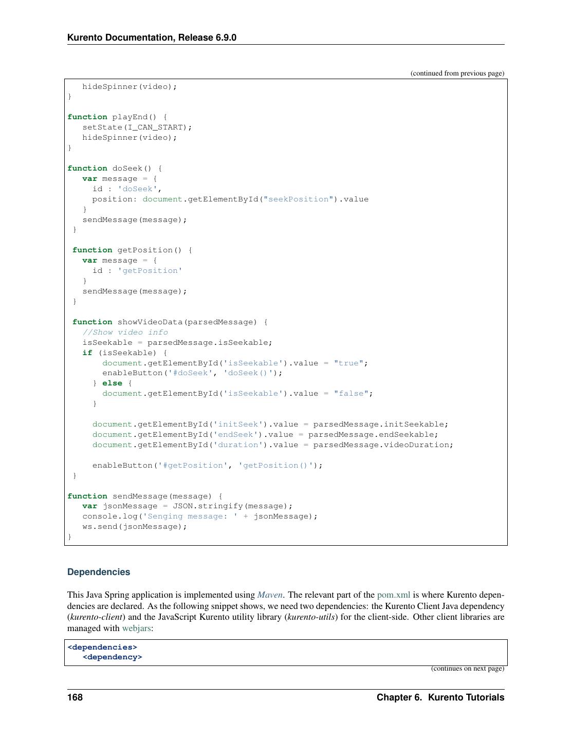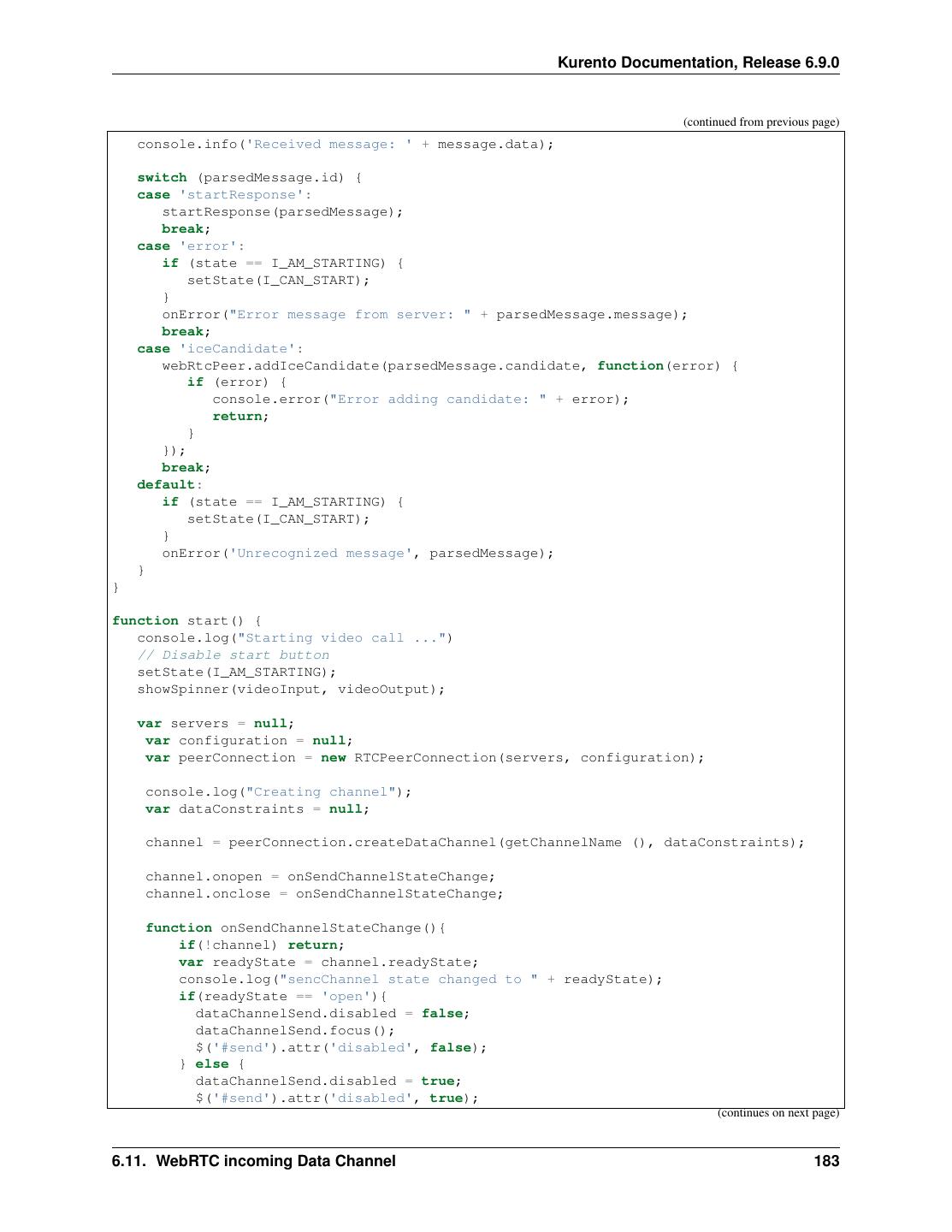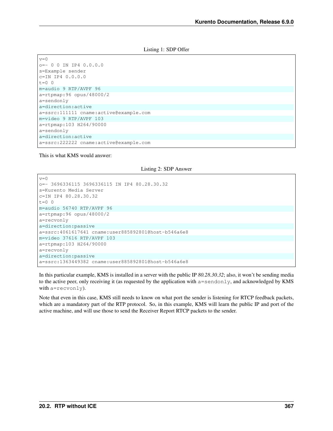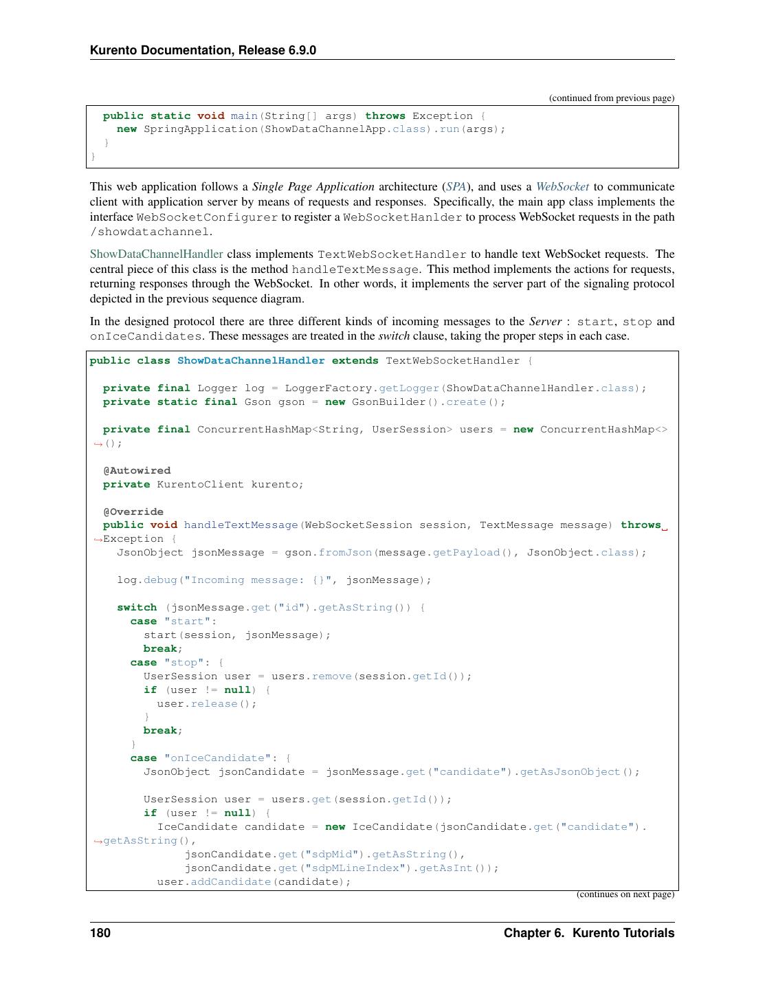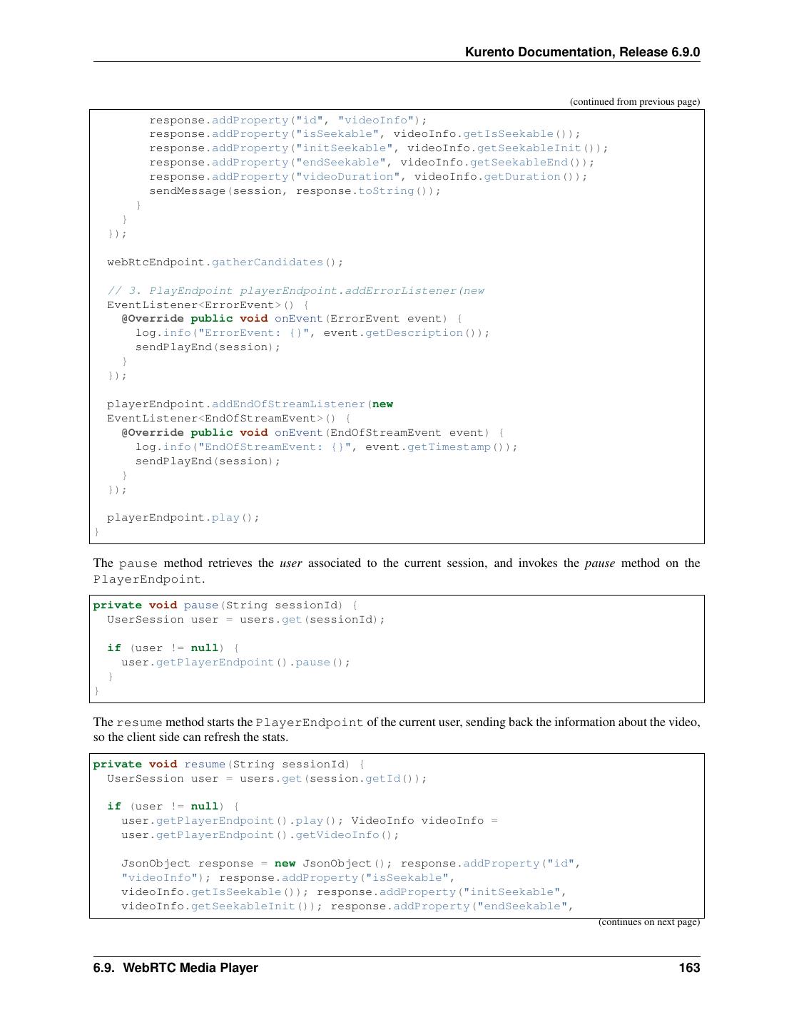 5 . 16.2 Kurento API over JSON-RPC . . . . . . . . . . . . . . . . . . . . . . . . . . . . . . . . . . . . . . 269 16.3 Network issues . . . . . . . . . . . . . . . . . . . . . . . . . . . . . . . . . . . . . . . . . . . . . . 274 16.4 Example: WebRTC in loopback . . . . . . . . . . . . . . . . . . . . . . . . . . . . . . . . . . . . . 275 16.5 Creating a custom Kurento Client . . . . . . . . . . . . . . . . . . . . . . . . . . . . . . . . . . . . 277 17 Kurento Modules 279 17.1 Module Tutorial - Pointer Detector Filter . . . . . . . . . . . . . . . . . . . . . . . . . . . . . . . . 280 17.2 Module Tutorial - Chroma Filter . . . . . . . . . . . . . . . . . . . . . . . . . . . . . . . . . . . . . 300 17.3 Module Tutorial - Crowd Detector Filter . . . . . . . . . . . . . . . . . . . . . . . . . . . . . . . . 316 17.4 Module Tutorial - Plate Detector Filter . . . . . . . . . . . . . . . . . . . . . . . . . . . . . . . . . 334 18 Kurento Utils JS 349 18.1 Overview . . . . . . . . . . . . . . . . . . . . . . . . . . . . . . . . . . . . . . . . . . . . . . . . . 349 18.2 How to use it . . . . . . . . . . . . . . . . . . . . . . . . . . . . . . . . . . . . . . . . . . . . . . . 349 18.3 Examples . . . . . . . . . . . . . . . . . . . . . . . . . . . . . . . . . . . . . . . . . . . . . . . . . 350 18.4 Using data channels . . . . . . . . . . . . . . . . . . . . . . . . . . . . . . . . . . . . . . . . . . . 351 18.5 Reference documentation . . . . . . . . . . . . . . . . . . . . . . . . . . . . . . . . . . . . . . . . 352 18.6 Souce code . . . . . . . . . . . . . . . . . . . . . . . . . . . . . . . . . . . . . . . . . . . . . . . . 356 18.7 Build for browser . . . . . . . . . . . . . . . . . . . . . . . . . . . . . . . . . . . . . . . . . . . . . 356 19 Endpoint Events 357 19.1 MediaObject events . . . . . . . . . . . . . . . . . . . . . . . . . . . . . . . . . . . . . . . . . . . 358 19.2 MediaElement events . . . . . . . . . . . . . . . . . . . . . . . . . . . . . . . . . . . . . . . . . . 358 19.3 BaseRtpEndpoint events . . . . . . . . . . . . . . . . . . . . . . . . . . . . . . . . . . . . . . . . . 359 19.4 WebRtcEndpoint events . . . . . . . . . . . . . . . . . . . . . . . . . . . . . . . . . . . . . . . . . 360 19.5 Sample sequence of events: WebRtcEndpoint . . . . . . . . . . . . . . . . . . . . . . . . . . . . . . 363 20 NAT Traversal 365 20.1 WebRTC with ICE . . . . . . . . . . . . . . . . . . . . . . . . . . . . . . . . . . . . . . . . . . . . 365 20.2 RTP without ICE . . . . . . . . . . . . . . . . . . . . . . . . . . . . . . . . . . . . . . . . . . . . . 365 21 Securing Kurento Applications 369 21.1 Securing Application Servers . . . . . . . . . . . . . . . . . . . . . . . . . . . . . . . . . . . . . . 369 21.2 Securing server applications . . . . . . . . . . . . . . . . . . . . . . . . . . . . . . . . . . . . . . . 371 22 WebRTC Statistics 373 22.1 Introduction . . . . . . . . . . . . . . . . . . . . . . . . . . . . . . . . . . . . . . . . . . . . . . . 373 22.2 API description . . . . . . . . . . . . . . . . . . . . . . . . . . . . . . . . . . . . . . . . . . . . . . 373 22.3 Example . . . . . . . . . . . . . . . . . . . . . . . . . . . . . . . . . . . . . . . . . . . . . . . . . 375 23 Debug Logging 377 23.1 Logging levels and components . . . . . . . . . . . . . . . . . . . . . . . . . . . . . . . . . . . . . 378 23.2 Suggested levels . . . . . . . . . . . . . . . . . . . . . . . . . . . . . . . . . . . . . . . . . . . . . 379 23.3 3rd-Party libraries . . . . . . . . . . . . . . . . . . . . . . . . . . . . . . . . . . . . . . . . . . . . 380 24 Kurento Team 383 25 Contribution Guide 385 26 Code of Conduct 387 27 Release Notes 389 27.1 6.9.0 (Dec 2018) . . . . . . . . . . . . . . . . . . . . . . . . . . . . . . . . . . . . . . . . . . . . . 389 27.2 6.8.1 (Oct 2018) . . . . . . . . . . . . . . . . . . . . . . . . . . . . . . . . . . . . . . . . . . . . . 392 27.3 6.7.2 (May 2018) . . . . . . . . . . . . . . . . . . . . . . . . . . . . . . . . . . . . . . . . . . . . . 393 iii