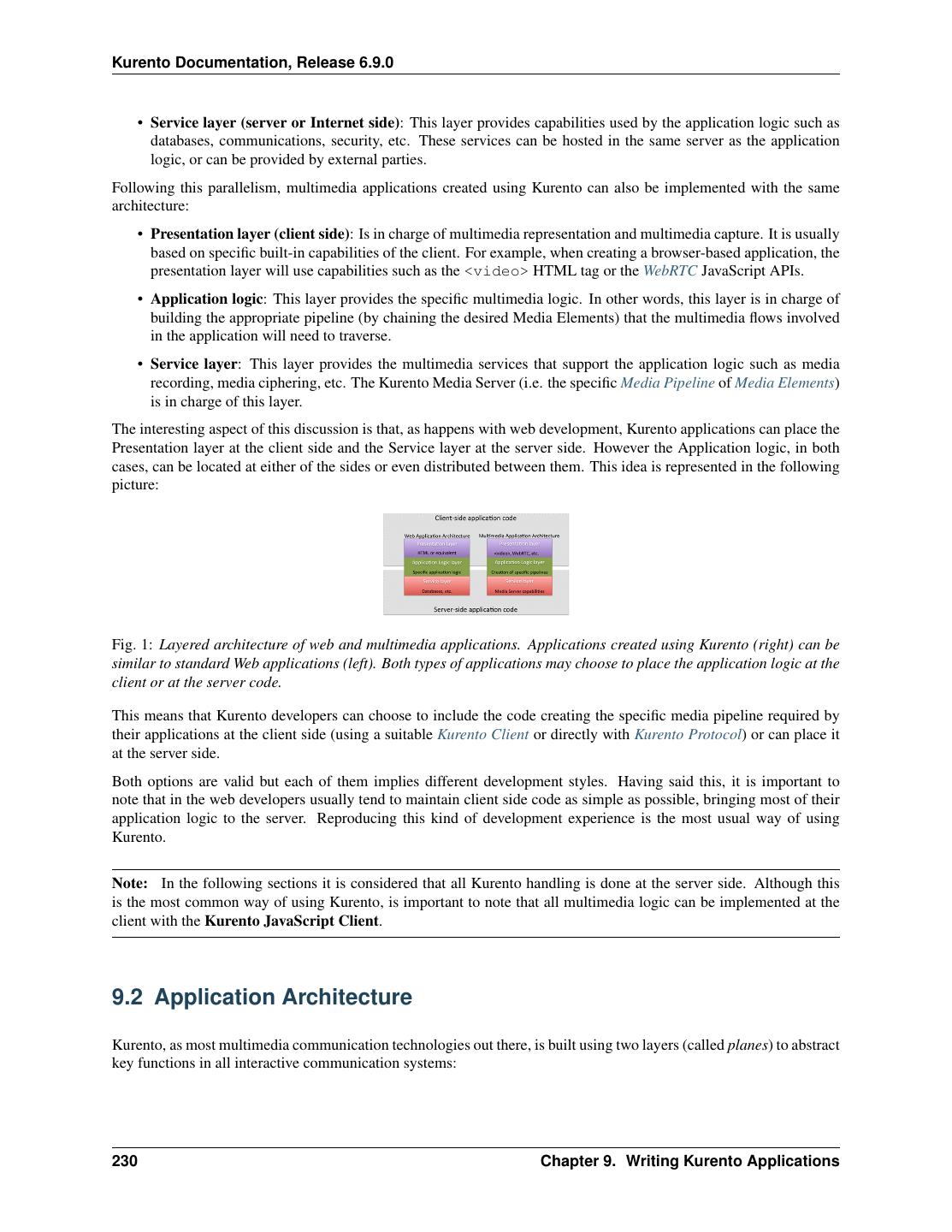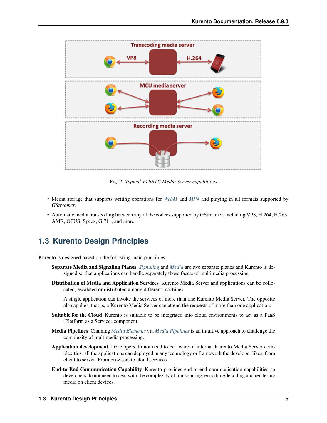 13 . Kurento Documentation, Release 6.9.0 Fig. 2: Typical WebRTC Media Server capabilities • Media storage that supports writing operations for WebM and MP4 and playing in all formats supported by GStreamer. • Automatic media transcoding between any of the codecs supported by GStreamer, including VP8, H.264, H.263, AMR, OPUS, Speex, G.711, and more. 1.3 Kurento Design Principles Kurento is designed based on the following main principles: Separate Media and Signaling Planes Signaling and Media are two separate planes and Kurento is de- signed so that applications can handle separately those facets of multimedia processing. Distribution of Media and Application Services Kurento Media Server and applications can be collo- cated, escalated or distributed among different machines. A single application can invoke the services of more than one Kurento Media Server. The opposite also applies, that is, a Kurento Media Server can attend the requests of more than one application. Suitable for the Cloud Kurento is suitable to be integrated into cloud environments to act as a PaaS (Platform as a Service) component. Media Pipelines Chaining Media Elements via Media Pipelines is an intuitive approach to challenge the complexity of multimedia processing. Application development Developers do not need to be aware of internal Kurento Media Server com- plexities: all the applications can deployed in any technology or framework the developer likes, from client to server. From browsers to cloud services. End-to-End Communication Capability Kurento provides end-to-end communication capabilities so developers do not need to deal with the complexity of transporting, encoding/decoding and rendering media on client devices. 1.3. Kurento Design Principles 5