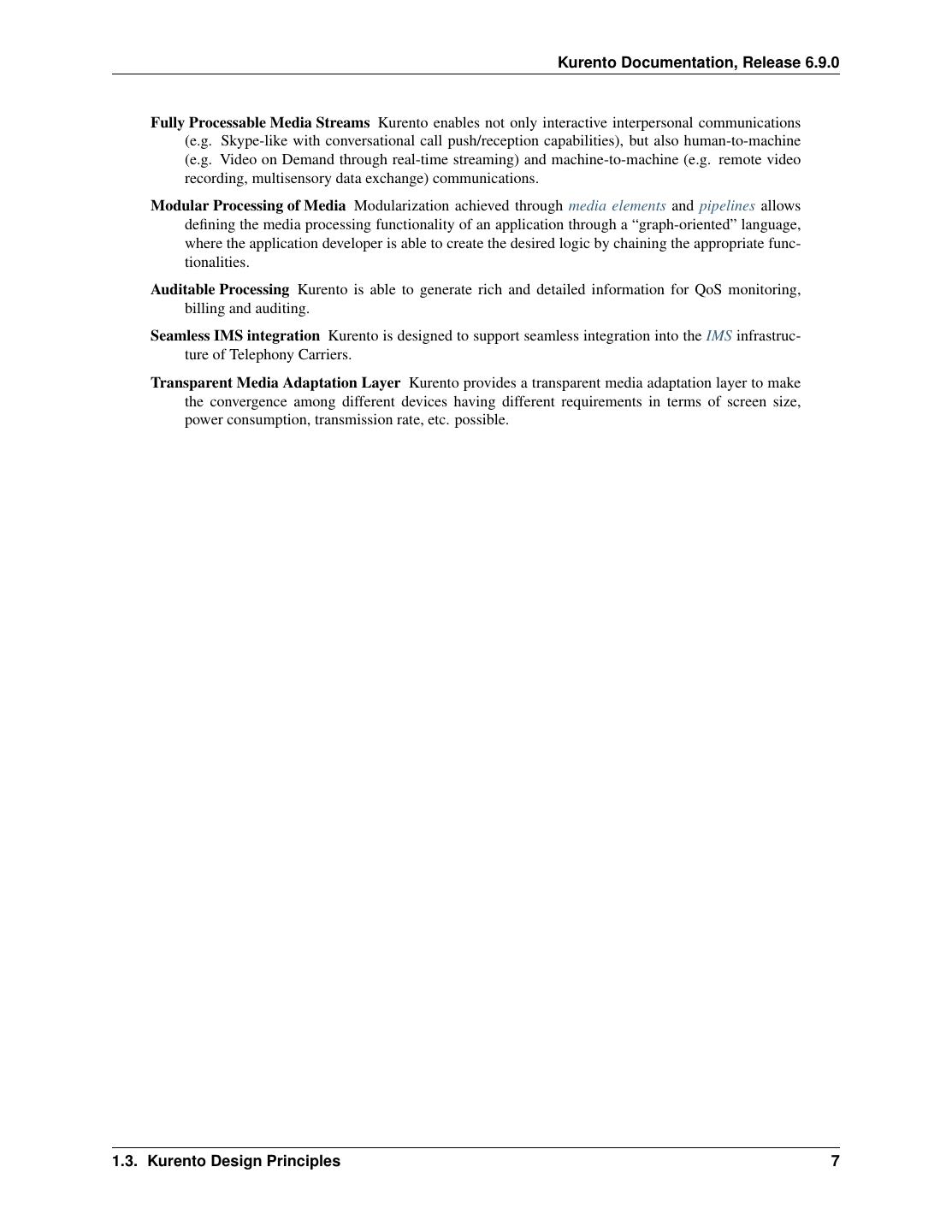 15 . Kurento Documentation, Release 6.9.0 Fully Processable Media Streams Kurento enables not only interactive interpersonal communications (e.g. Skype-like with conversational call push/reception capabilities), but also human-to-machine (e.g. Video on Demand through real-time streaming) and machine-to-machine (e.g. remote video recording, multisensory data exchange) communications. Modular Processing of Media Modularization achieved through media elements and pipelines allows defining the media processing functionality of an application through a “graph-oriented” language, where the application developer is able to create the desired logic by chaining the appropriate func- tionalities. Auditable Processing Kurento is able to generate rich and detailed information for QoS monitoring, billing and auditing. Seamless IMS integration Kurento is designed to support seamless integration into the IMS infrastruc- ture of Telephony Carriers. Transparent Media Adaptation Layer Kurento provides a transparent media adaptation layer to make the convergence among different devices having different requirements in terms of screen size, power consumption, transmission rate, etc. possible. 1.3. Kurento Design Principles 7