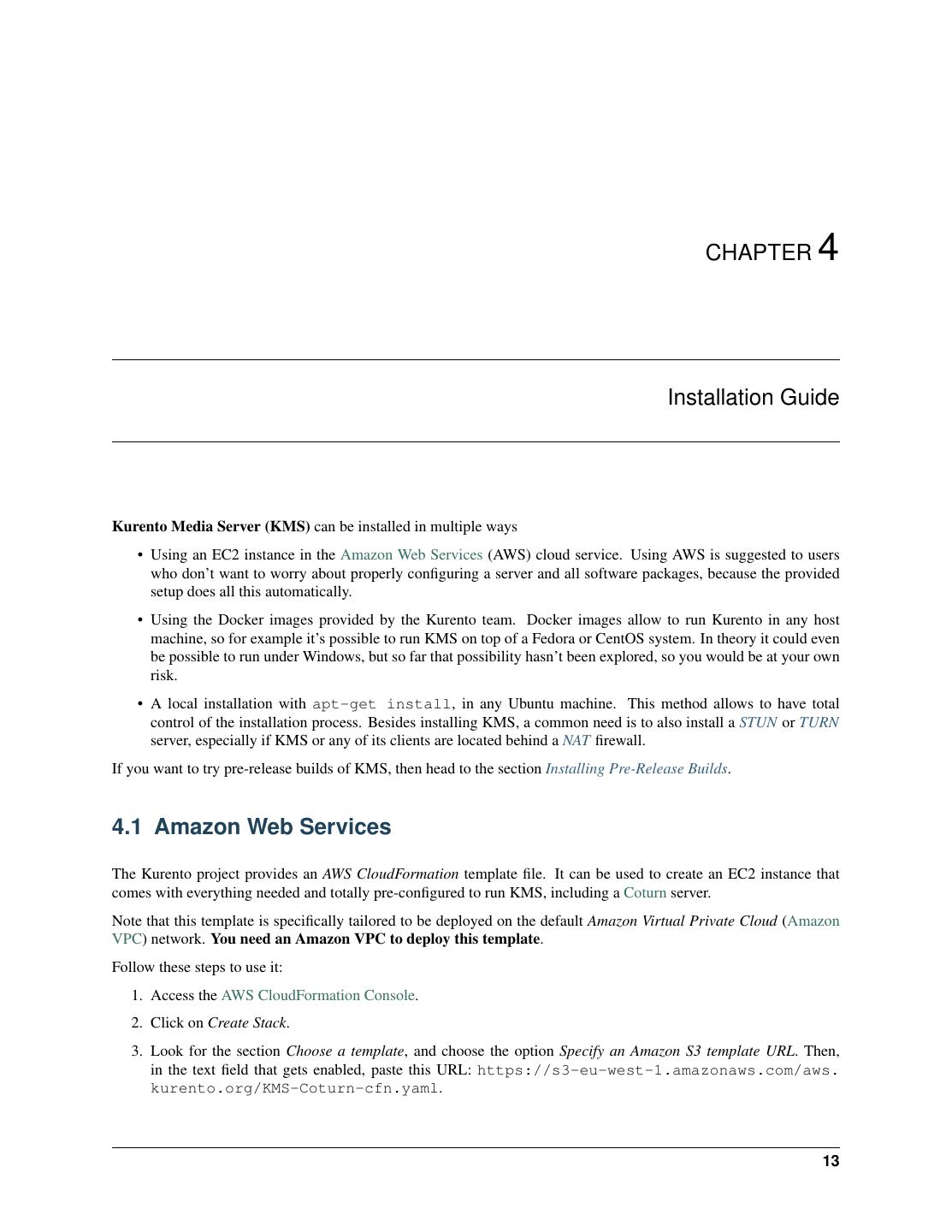 21 . CHAPTER 4 Installation Guide Kurento Media Server (KMS) can be installed in multiple ways • Using an EC2 instance in the Amazon Web Services (AWS) cloud service. Using AWS is suggested to users who don’t want to worry about properly configuring a server and all software packages, because the provided setup does all this automatically. • Using the Docker images provided by the Kurento team. Docker images allow to run Kurento in any host machine, so for example it’s possible to run KMS on top of a Fedora or CentOS system. In theory it could even be possible to run under Windows, but so far that possibility hasn’t been explored, so you would be at your own risk. • A local installation with apt-get install, in any Ubuntu machine. This method allows to have total control of the installation process. Besides installing KMS, a common need is to also install a STUN or TURN server, especially if KMS or any of its clients are located behind a NAT firewall. If you want to try pre-release builds of KMS, then head to the section Installing Pre-Release Builds. 4.1 Amazon Web Services The Kurento project provides an AWS CloudFormation template file. It can be used to create an EC2 instance that comes with everything needed and totally pre-configured to run KMS, including a Coturn server. Note that this template is specifically tailored to be deployed on the default Amazon Virtual Private Cloud (Amazon VPC) network. You need an Amazon VPC to deploy this template. Follow these steps to use it: 1. Access the AWS CloudFormation Console. 2. Click on Create Stack. 3. Look for the section Choose a template, and choose the option Specify an Amazon S3 template URL. Then, in the text field that gets enabled, paste this URL: https://s3-eu-west-1.amazonaws.com/aws. kurento.org/KMS-Coturn-cfn.yaml. 13