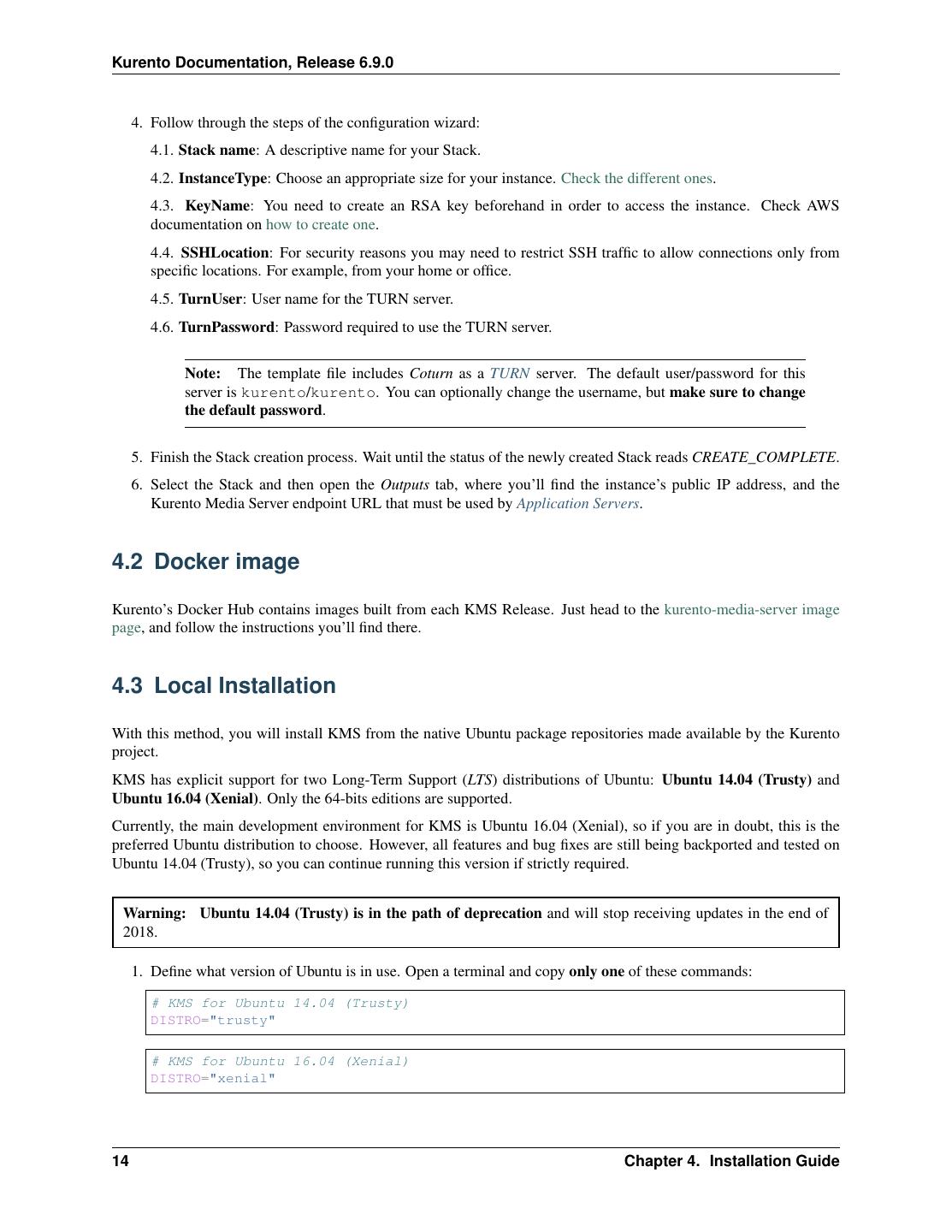 22 .Kurento Documentation, Release 6.9.0 4. Follow through the steps of the configuration wizard: 4.1. Stack name: A descriptive name for your Stack. 4.2. InstanceType: Choose an appropriate size for your instance. Check the different ones. 4.3. KeyName: You need to create an RSA key beforehand in order to access the instance. Check AWS documentation on how to create one. 4.4. SSHLocation: For security reasons you may need to restrict SSH traffic to allow connections only from specific locations. For example, from your home or office. 4.5. TurnUser: User name for the TURN server. 4.6. TurnPassword: Password required to use the TURN server. Note: The template file includes Coturn as a TURN server. The default user/password for this server is kurento/kurento. You can optionally change the username, but make sure to change the default password. 5. Finish the Stack creation process. Wait until the status of the newly created Stack reads CREATE_COMPLETE. 6. Select the Stack and then open the Outputs tab, where you’ll find the instance’s public IP address, and the Kurento Media Server endpoint URL that must be used by Application Servers. 4.2 Docker image Kurento’s Docker Hub contains images built from each KMS Release. Just head to the kurento-media-server image page, and follow the instructions you’ll find there. 4.3 Local Installation With this method, you will install KMS from the native Ubuntu package repositories made available by the Kurento project. KMS has explicit support for two Long-Term Support (LTS) distributions of Ubuntu: Ubuntu 14.04 (Trusty) and Ubuntu 16.04 (Xenial). Only the 64-bits editions are supported. Currently, the main development environment for KMS is Ubuntu 16.04 (Xenial), so if you are in doubt, this is the preferred Ubuntu distribution to choose. However, all features and bug fixes are still being backported and tested on Ubuntu 14.04 (Trusty), so you can continue running this version if strictly required. Warning: Ubuntu 14.04 (Trusty) is in the path of deprecation and will stop receiving updates in the end of 2018. 1. Define what version of Ubuntu is in use. Open a terminal and copy only one of these commands: # KMS for Ubuntu 14.04 (Trusty) DISTRO="trusty" # KMS for Ubuntu 16.04 (Xenial) DISTRO="xenial" 14 Chapter 4. Installation Guide