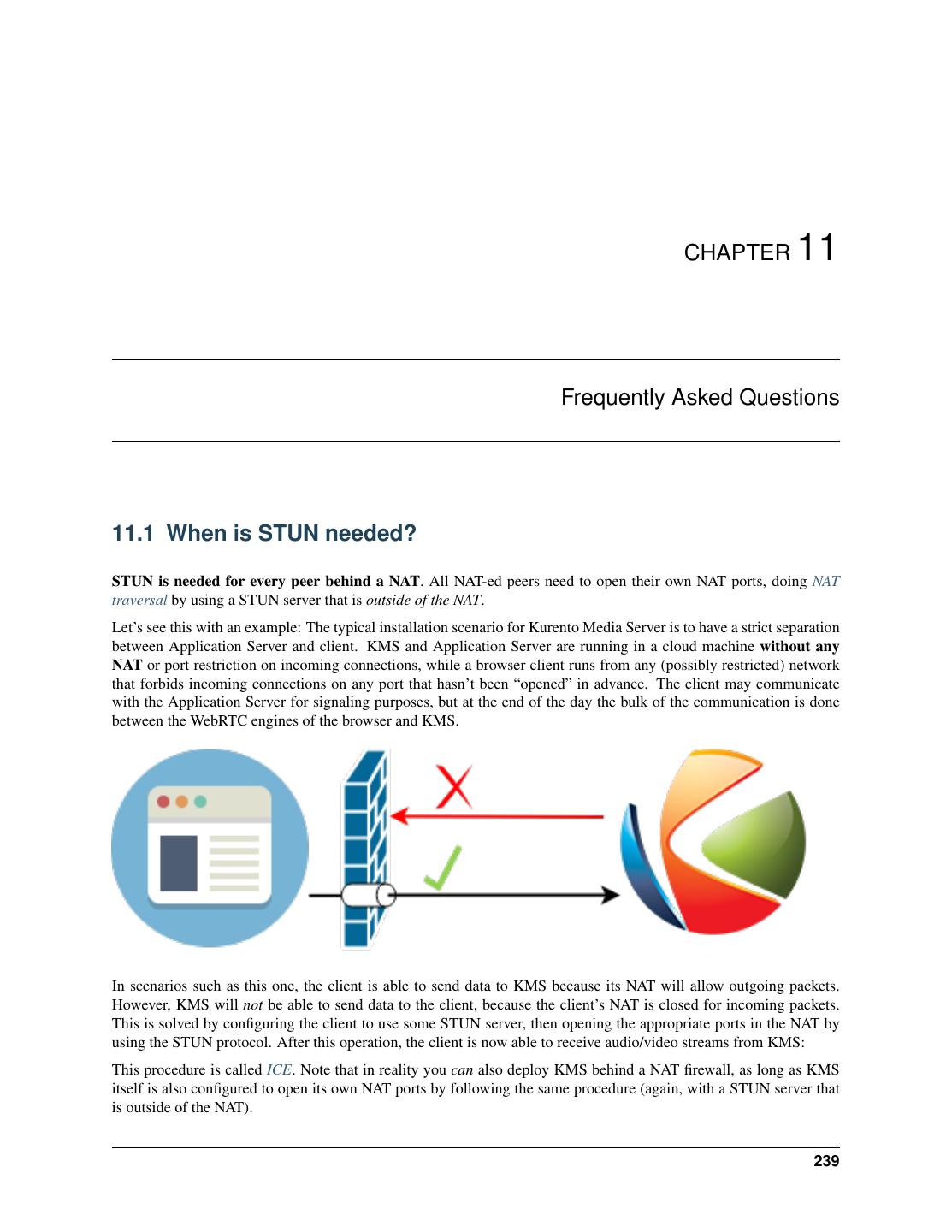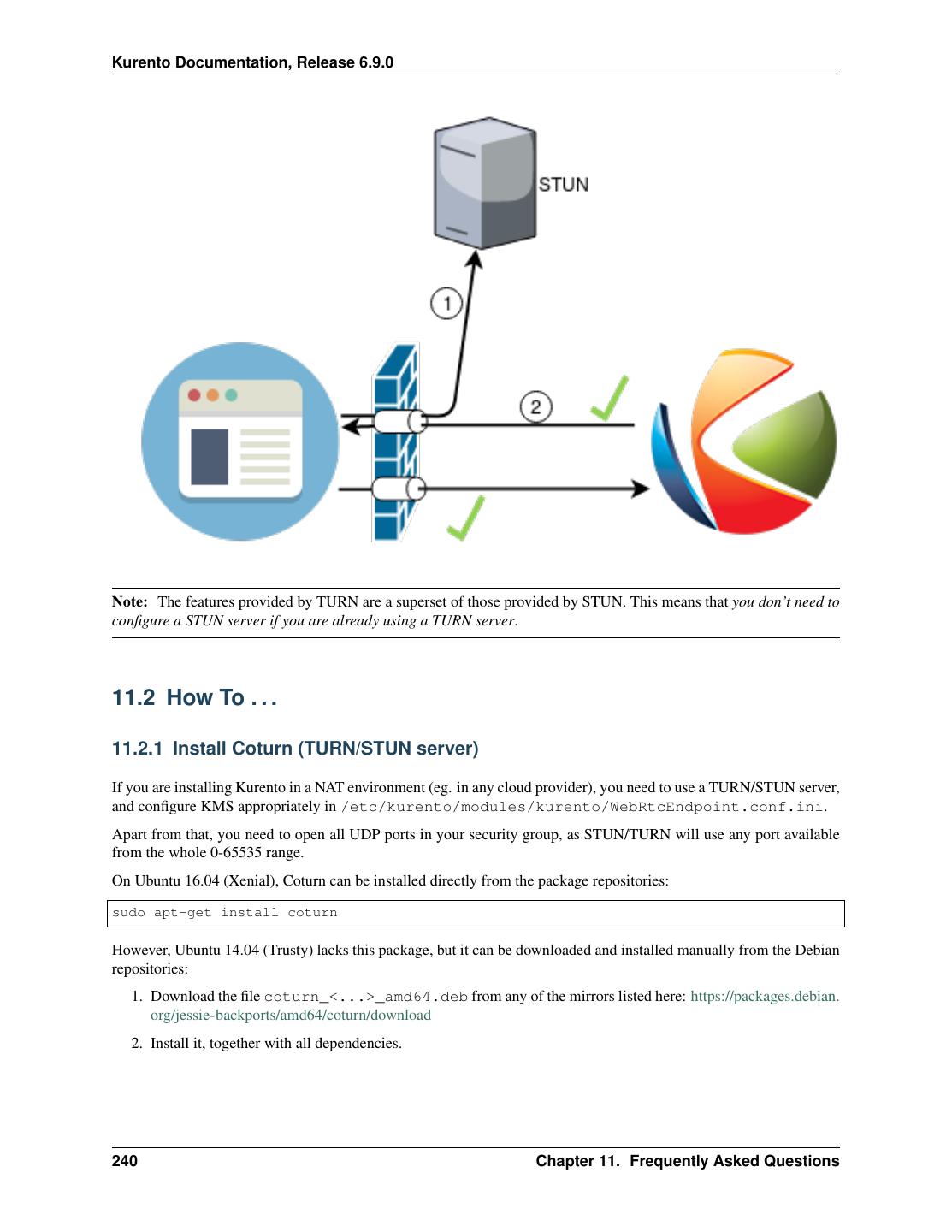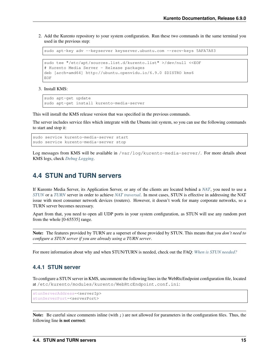 23 . Kurento Documentation, Release 6.9.0 2. Add the Kurento repository to your system configuration. Run these two commands in the same terminal you used in the previous step: sudo apt-key adv --keyserver keyserver.ubuntu.com --recv-keys 5AFA7A83 sudo tee "/etc/apt/sources.list.d/kurento.list" >/dev/null <<EOF # Kurento Media Server - Release packages deb [arch=amd64] http://ubuntu.openvidu.io/6.9.0 $DISTRO kms6 EOF 3. Install KMS: sudo apt-get update sudo apt-get install kurento-media-server This will install the KMS release version that was specified in the previous commands. The server includes service files which integrate with the Ubuntu init system, so you can use the following commands to start and stop it: sudo service kurento-media-server start sudo service kurento-media-server stop Log messages from KMS will be available in /var/log/kurento-media-server/. For more details about KMS logs, check Debug Logging. 4.4 STUN and TURN servers If Kurento Media Server, its Application Server, or any of the clients are located behind a NAT, you need to use a STUN or a TURN server in order to achieve NAT traversal. In most cases, STUN is effective in addressing the NAT issue with most consumer network devices (routers). However, it doesn’t work for many corporate networks, so a TURN server becomes necessary. Apart from that, you need to open all UDP ports in your system configuration, as STUN will use any random port from the whole [0-65535] range. Note: The features provided by TURN are a superset of those provided by STUN. This means that you don’t need to configure a STUN server if you are already using a TURN server. For more information about why and when STUN/TURN is needed, check out the FAQ: When is STUN needed? 4.4.1 STUN server To configure a STUN server in KMS, uncomment the following lines in the WebRtcEndpoint configuration file, located at /etc/kurento/modules/kurento/WebRtcEndpoint.conf.ini: stunServerAddress=<serverIp> stunServerPort=<serverPort> Note: Be careful since comments inline (with ;) are not allowed for parameters in the configuration files. Thus, the following line is not correct: 4.4. STUN and TURN servers 15