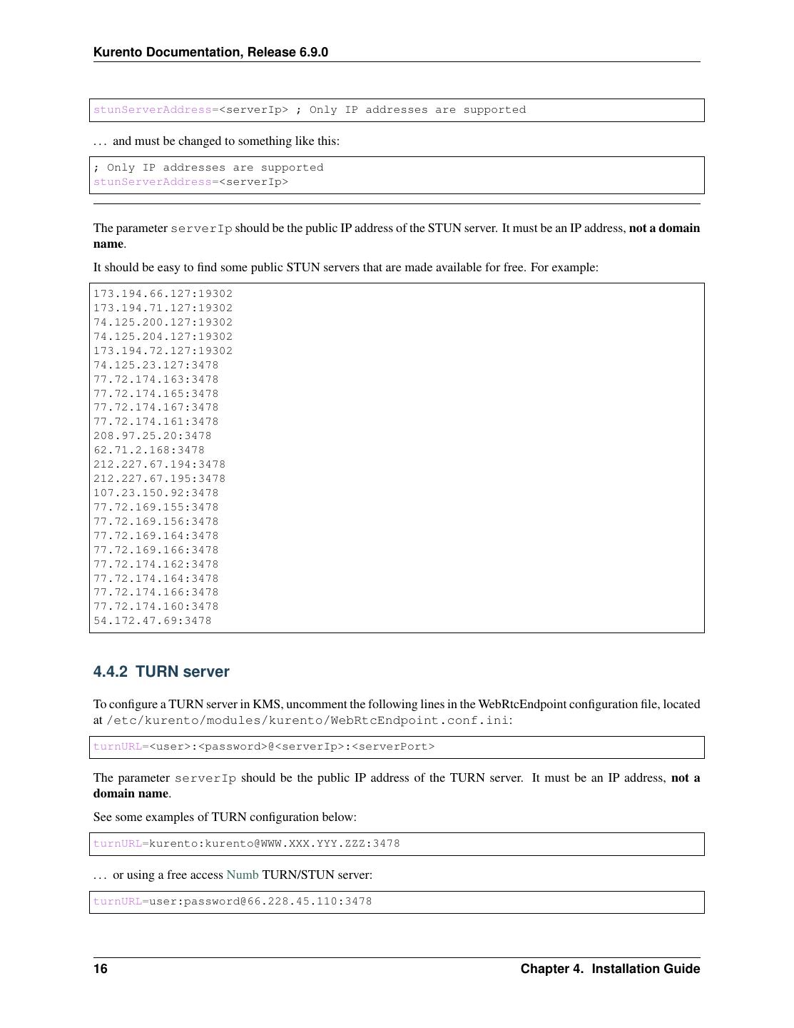 24 .Kurento Documentation, Release 6.9.0 stunServerAddress=<serverIp> ; Only IP addresses are supported . . . and must be changed to something like this: ; Only IP addresses are supported stunServerAddress=<serverIp> The parameter serverIp should be the public IP address of the STUN server. It must be an IP address, not a domain name. It should be easy to find some public STUN servers that are made available for free. For example: 173.194.66.127:19302 173.194.71.127:19302 74.125.200.127:19302 74.125.204.127:19302 173.194.72.127:19302 74.125.23.127:3478 77.72.174.163:3478 77.72.174.165:3478 77.72.174.167:3478 77.72.174.161:3478 208.97.25.20:3478 62.71.2.168:3478 212.227.67.194:3478 212.227.67.195:3478 107.23.150.92:3478 77.72.169.155:3478 77.72.169.156:3478 77.72.169.164:3478 77.72.169.166:3478 77.72.174.162:3478 77.72.174.164:3478 77.72.174.166:3478 77.72.174.160:3478 54.172.47.69:3478 4.4.2 TURN server To configure a TURN server in KMS, uncomment the following lines in the WebRtcEndpoint configuration file, located at /etc/kurento/modules/kurento/WebRtcEndpoint.conf.ini: turnURL=<user>:<password>@<serverIp>:<serverPort> The parameter serverIp should be the public IP address of the TURN server. It must be an IP address, not a domain name. See some examples of TURN configuration below: turnURL=kurento:kurento@WWW.XXX.YYY.ZZZ:3478 . . . or using a free access Numb TURN/STUN server: turnURL=user:password@66.228.45.110:3478 16 Chapter 4. Installation Guide