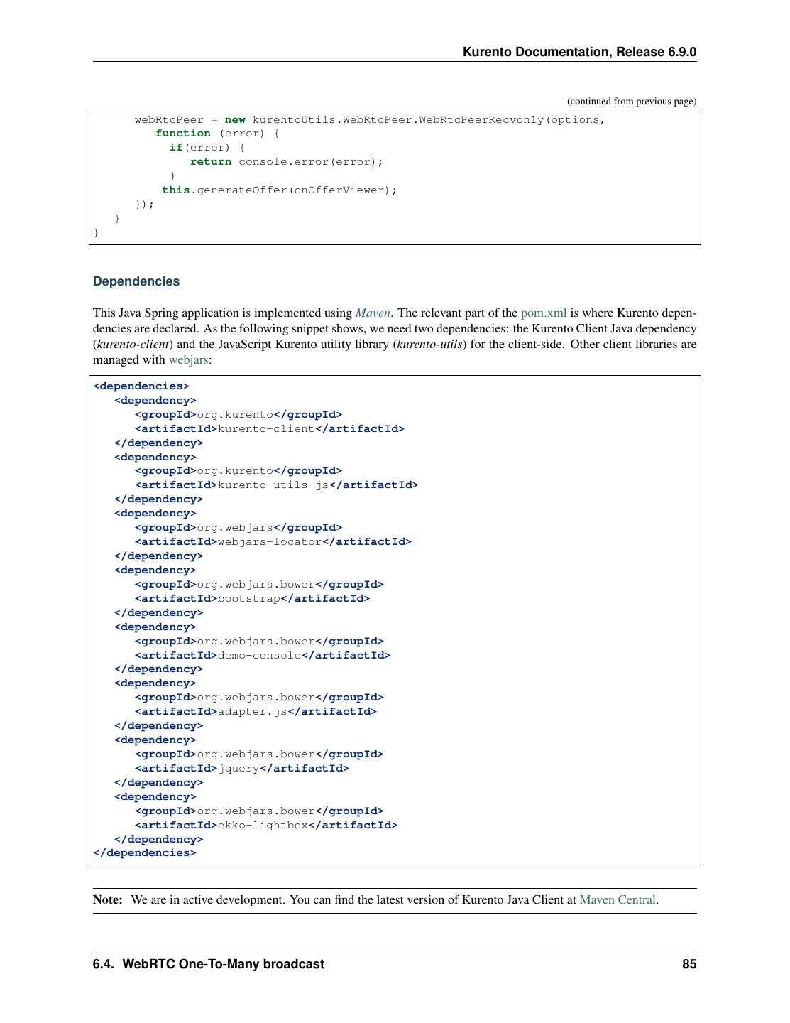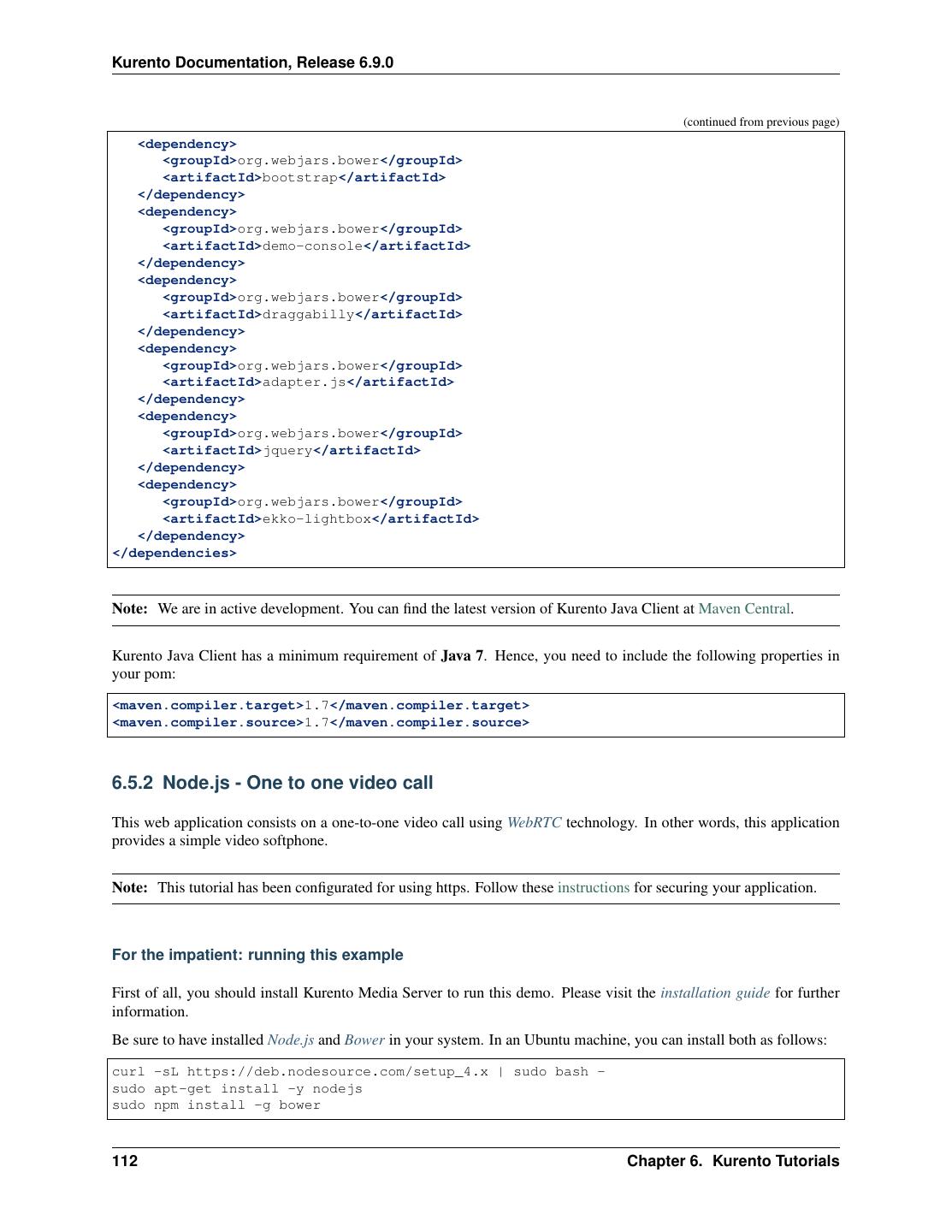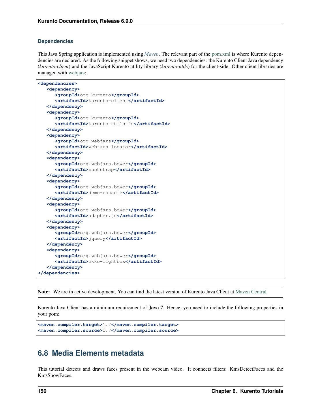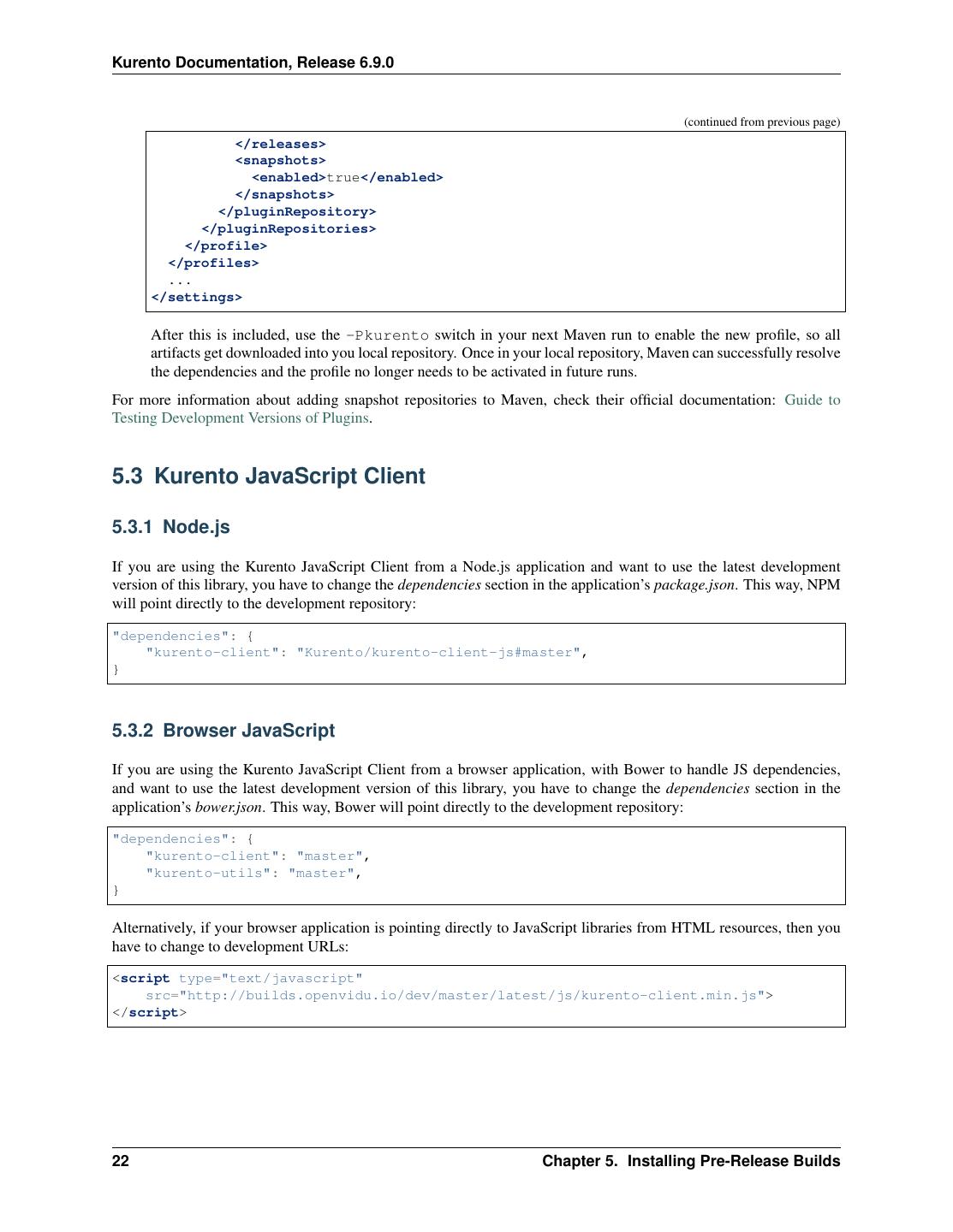 29 . Kurento Documentation, Release 6.9.0 (continued from previous page) <snapshots> <enabled>true</enabled> </snapshots> </pluginRepository> </pluginRepositories> ... </project> After this is included, there are two ways to use the updated versions: 1. In the same pom.xml, look for the desired <dependency> and change its version. For example: <dependency> <groupId>org.kurento</groupId> <artifactId>kurento-client</artifactId> <version>6.6.3-SNAPSHOT</version> </dependency> 2. If you have not specified a dependency version, use the -U switch in your next Maven run to force updating all dependencies. • User and System levels. The file settings.xml provides configuration for all projects, but its contents have a different reach depending on where it is located: – At $HOME/.m2/settings.xml, it defines the settings that will be applied for a single user. – At /etc/maven/settings.xml, it defines the settings that will be applied for all Maven users on a machine. To use this method, first edit the settings file at one of the mentioned locations, and include this: <settings> ... <profiles> <profile> <id>kurento</id> <repositories> <repository> <id>kurento-snapshots</id> <name>Kurento Snapshots</name> <url>https://maven.openvidu.io/repository/snapshots/</url> <releases> <enabled>false</enabled> </releases> <snapshots> <enabled>true</enabled> </snapshots> </repository> </repositories> <pluginRepositories> <pluginRepository> <id>kurento-snapshots</id> <name>Kurento Snapshots</name> <url>https://maven.openvidu.io/repository/snapshots/</url> <releases> <enabled>false</enabled> (continues on next page) 5.2. Kurento Java Client 21