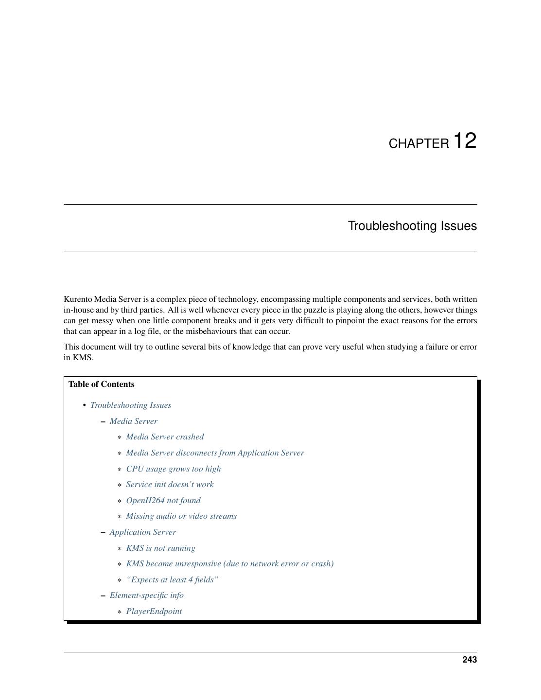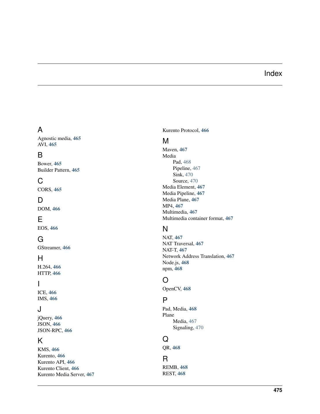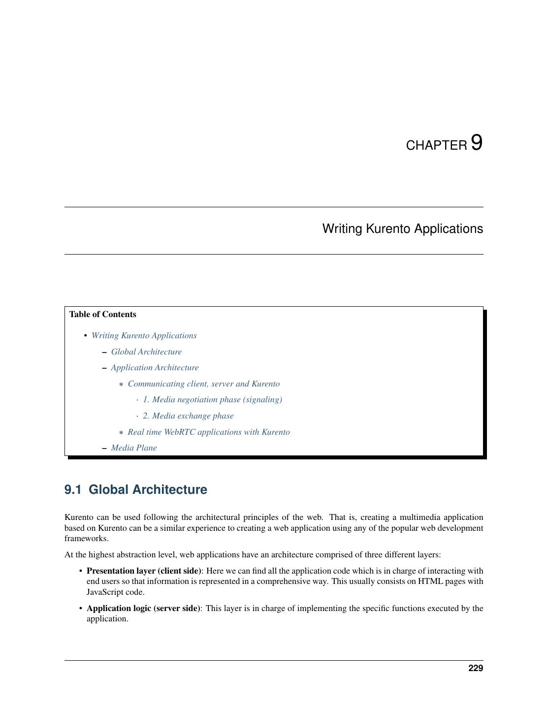 4 .7 Features 221 7.1 Kurento API, Clients, and Protocol . . . . . . . . . . . . . . . . . . . . . . . . . . . . . . . . . . . 221 7.2 Kurento Modules . . . . . . . . . . . . . . . . . . . . . . . . . . . . . . . . . . . . . . . . . . . . . 223 7.3 RTP Streaming . . . . . . . . . . . . . . . . . . . . . . . . . . . . . . . . . . . . . . . . . . . . . . 223 7.4 Congestion Control / REMB . . . . . . . . . . . . . . . . . . . . . . . . . . . . . . . . . . . . . . . 223 8 Configuration Guide 227 8.1 Media Server . . . . . . . . . . . . . . . . . . . . . . . . . . . . . . . . . . . . . . . . . . . . . . . 227 8.2 MediaElement . . . . . . . . . . . . . . . . . . . . . . . . . . . . . . . . . . . . . . . . . . . . . . 227 8.3 SdpEndpoint . . . . . . . . . . . . . . . . . . . . . . . . . . . . . . . . . . . . . . . . . . . . . . . 228 8.4 WebRtcEndpoint . . . . . . . . . . . . . . . . . . . . . . . . . . . . . . . . . . . . . . . . . . . . . 228 8.5 HttpEndpoint . . . . . . . . . . . . . . . . . . . . . . . . . . . . . . . . . . . . . . . . . . . . . . . 228 8.6 Debug Logging . . . . . . . . . . . . . . . . . . . . . . . . . . . . . . . . . . . . . . . . . . . . . . 228 8.7 Service Init . . . . . . . . . . . . . . . . . . . . . . . . . . . . . . . . . . . . . . . . . . . . . . . . 228 9 Writing Kurento Applications 229 9.1 Global Architecture . . . . . . . . . . . . . . . . . . . . . . . . . . . . . . . . . . . . . . . . . . . 229 9.2 Application Architecture . . . . . . . . . . . . . . . . . . . . . . . . . . . . . . . . . . . . . . . . . 230 9.3 Media Plane . . . . . . . . . . . . . . . . . . . . . . . . . . . . . . . . . . . . . . . . . . . . . . . 233 10 Writing Kurento Modules 235 10.1 OpenCV module . . . . . . . . . . . . . . . . . . . . . . . . . . . . . . . . . . . . . . . . . . . . . 236 10.2 GStreamer module . . . . . . . . . . . . . . . . . . . . . . . . . . . . . . . . . . . . . . . . . . . . 236 10.3 For both kind of modules . . . . . . . . . . . . . . . . . . . . . . . . . . . . . . . . . . . . . . . . 236 10.4 Examples . . . . . . . . . . . . . . . . . . . . . . . . . . . . . . . . . . . . . . . . . . . . . . . . . 238 11 Frequently Asked Questions 239 11.1 When is STUN needed? . . . . . . . . . . . . . . . . . . . . . . . . . . . . . . . . . . . . . . . . . 239 11.2 How To . . . . . . . . . . . . . . . . . . . . . . . . . . . . . . . . . . . . . . . . . . . . . . . . . . . 240 11.3 Why do I get the error . . . . . . . . . . . . . . . . . . . . . . . . . . . . . . . . . . . . . . . . . . . 242 12 Troubleshooting Issues 243 12.1 Media Server . . . . . . . . . . . . . . . . . . . . . . . . . . . . . . . . . . . . . . . . . . . . . . . 244 12.2 Application Server . . . . . . . . . . . . . . . . . . . . . . . . . . . . . . . . . . . . . . . . . . . . 249 12.3 Element-specific info . . . . . . . . . . . . . . . . . . . . . . . . . . . . . . . . . . . . . . . . . . . 252 12.4 Browser . . . . . . . . . . . . . . . . . . . . . . . . . . . . . . . . . . . . . . . . . . . . . . . . . . 254 13 Support 255 13.1 Usage Questions . . . . . . . . . . . . . . . . . . . . . . . . . . . . . . . . . . . . . . . . . . . . . 255 13.2 Community Support . . . . . . . . . . . . . . . . . . . . . . . . . . . . . . . . . . . . . . . . . . . 255 13.3 Commercial Support . . . . . . . . . . . . . . . . . . . . . . . . . . . . . . . . . . . . . . . . . . . 256 14 Kurento API 257 14.1 Media Elements and Media Pipelines . . . . . . . . . . . . . . . . . . . . . . . . . . . . . . . . . . 257 14.2 Endpoints . . . . . . . . . . . . . . . . . . . . . . . . . . . . . . . . . . . . . . . . . . . . . . . . . 258 14.3 Filters . . . . . . . . . . . . . . . . . . . . . . . . . . . . . . . . . . . . . . . . . . . . . . . . . . . 260 14.4 Hubs . . . . . . . . . . . . . . . . . . . . . . . . . . . . . . . . . . . . . . . . . . . . . . . . . . . 262 15 Kurento Client 265 15.1 Kurento Java Client . . . . . . . . . . . . . . . . . . . . . . . . . . . . . . . . . . . . . . . . . . . 265 15.2 Kurento JavaScript Client . . . . . . . . . . . . . . . . . . . . . . . . . . . . . . . . . . . . . . . . 265 15.3 Reference Documentation . . . . . . . . . . . . . . . . . . . . . . . . . . . . . . . . . . . . . . . . 265 16 Kurento Protocol 267 16.1 JSON-RPC message format . . . . . . . . . . . . . . . . . . . . . . . . . . . . . . . . . . . . . . . 268 ii