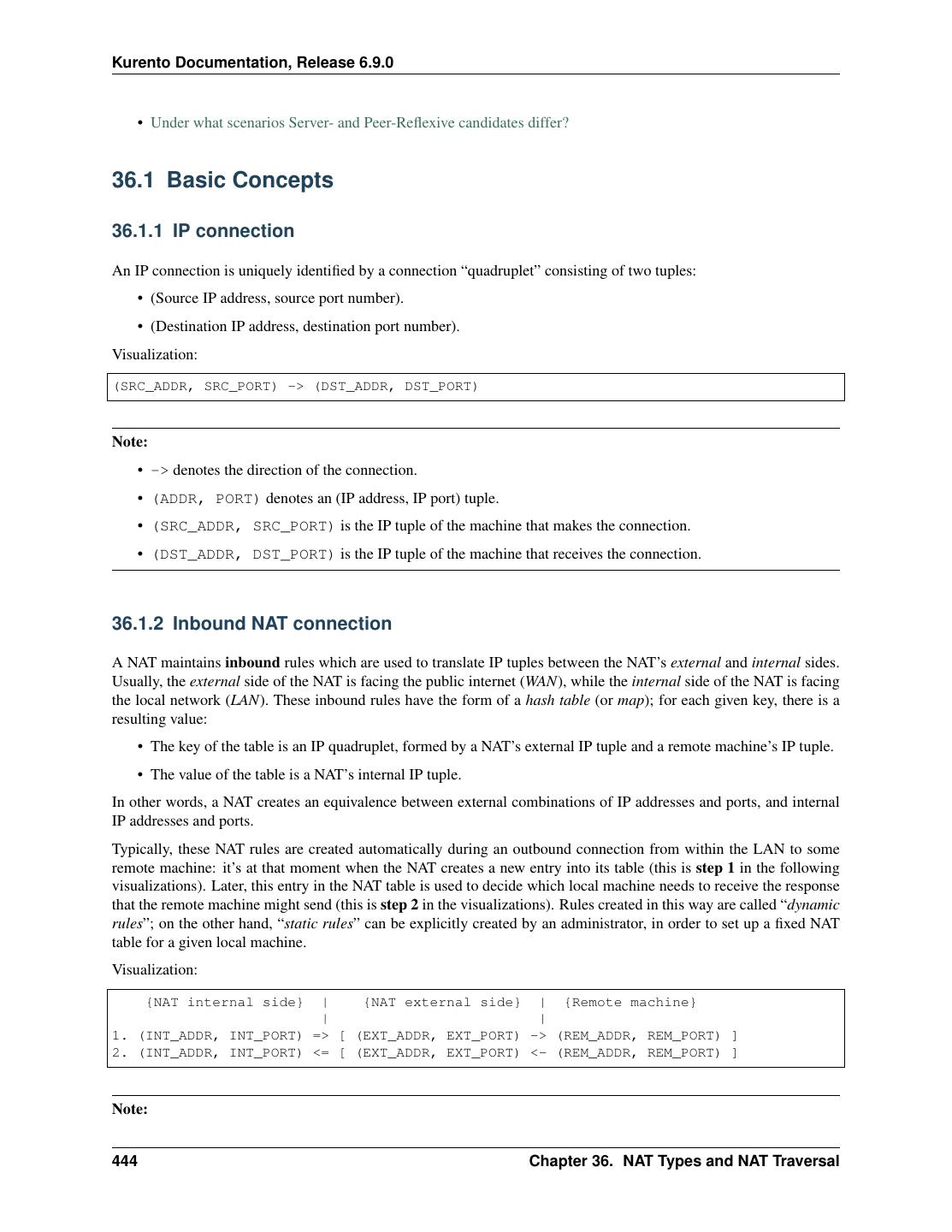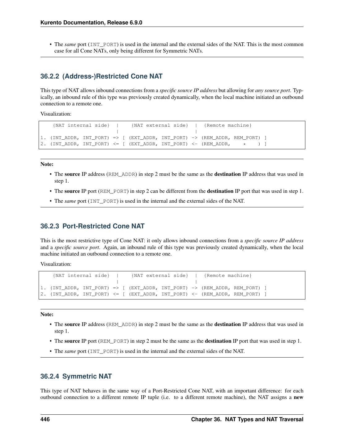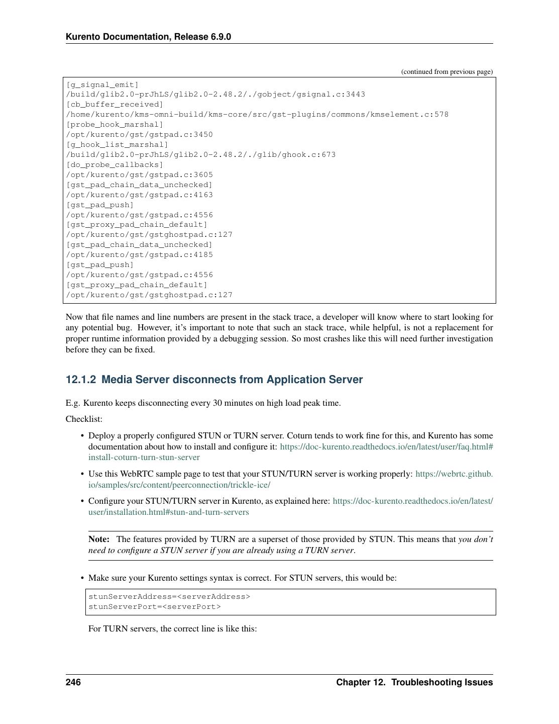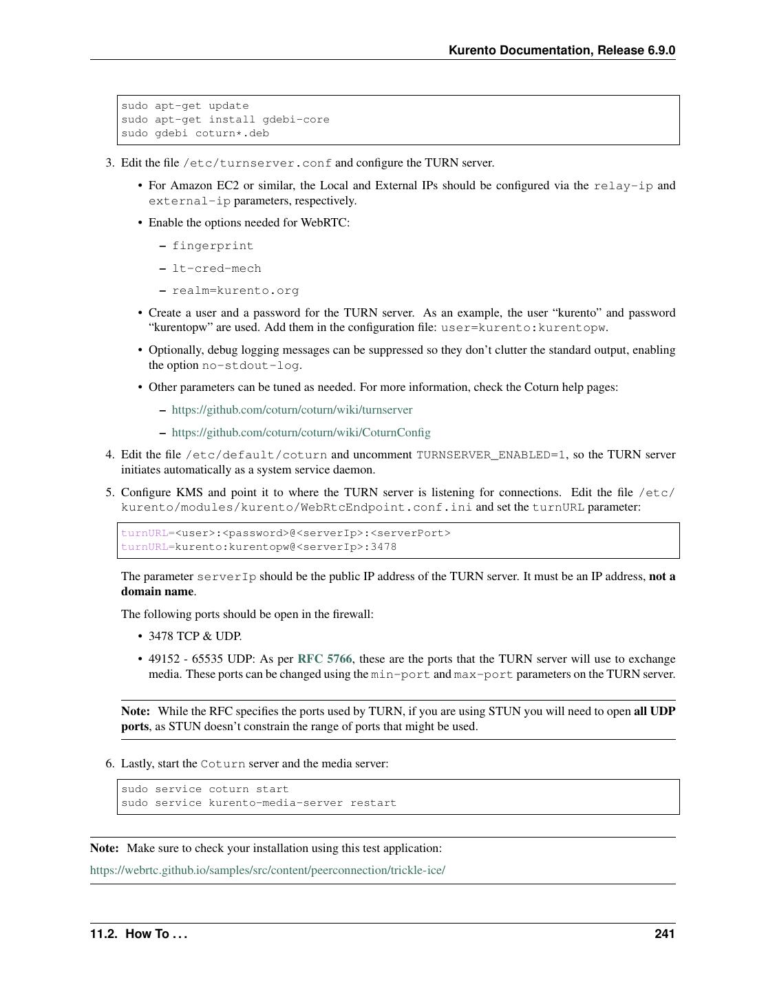 25 . Kurento Documentation, Release 6.9.0 Note that it is somewhat easy to find free STUN servers available on the net, because their functionality is pretty limited and it is not costly to keep them working for free. However, this doesn’t happen with TURN servers, which act as a media proxy between peers and thus the cost of maintaining one is much higher. It is rare to find a TURN server which works for free while offering good performance. Usually, each user opts to maintain their own private TURN server instances. Coturn is an open source implementation of a TURN/STUN server. In the FAQ section there is a description about how to install and configure it. 4.5 Check your installation To verify that KMS is up and running, use this command and look for the kurento-media-server process: ps -ef | grep kurento-media-server > nobody 1270 1 0 08:52 ? 00:01:00 /usr/bin/kurento-media-server Unless configured otherwise, KMS will open the port 8888 to receive requests and send responses by means of the Kurento Protocol. Use this command to verify that this port is listening for incoming packets: sudo netstat -tupan | grep kurento > tcp6 0 0 :::8888 :::* LISTEN 1270/kurento-media-server 4.5. Check your installation 17