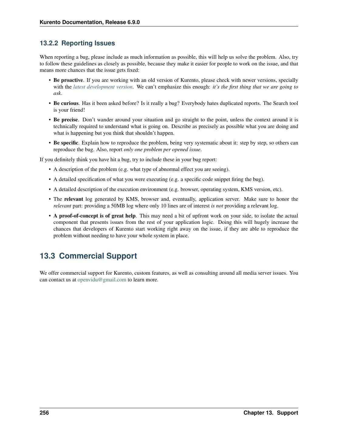 20 .Kurento Documentation, Release 6.9.0 Have a look at the features offered by Kurento, and follow any of the multiple tutorials that explain how to build basic applications. 5. Ask for help If you face any issue with Kurento itself or have difficulties configuring the plethora of mechanisms that form part of WebRTC, don’t hesitate to ask for help to our community of users. Still, there are times when the problems at hand require more specialized study. If you wish to get help from expert people with more inside knowledge of Kurento, we also offer the option of direct support contracts. 6. Enjoy! Kurento is a project that aims to bring the latest innovations closer to the people, and help connect them together. Make a great application with it, and let us know! We will be more than happy to find out about who is using Kurento and what is being built with it :-) 12 Chapter 3. Getting Started