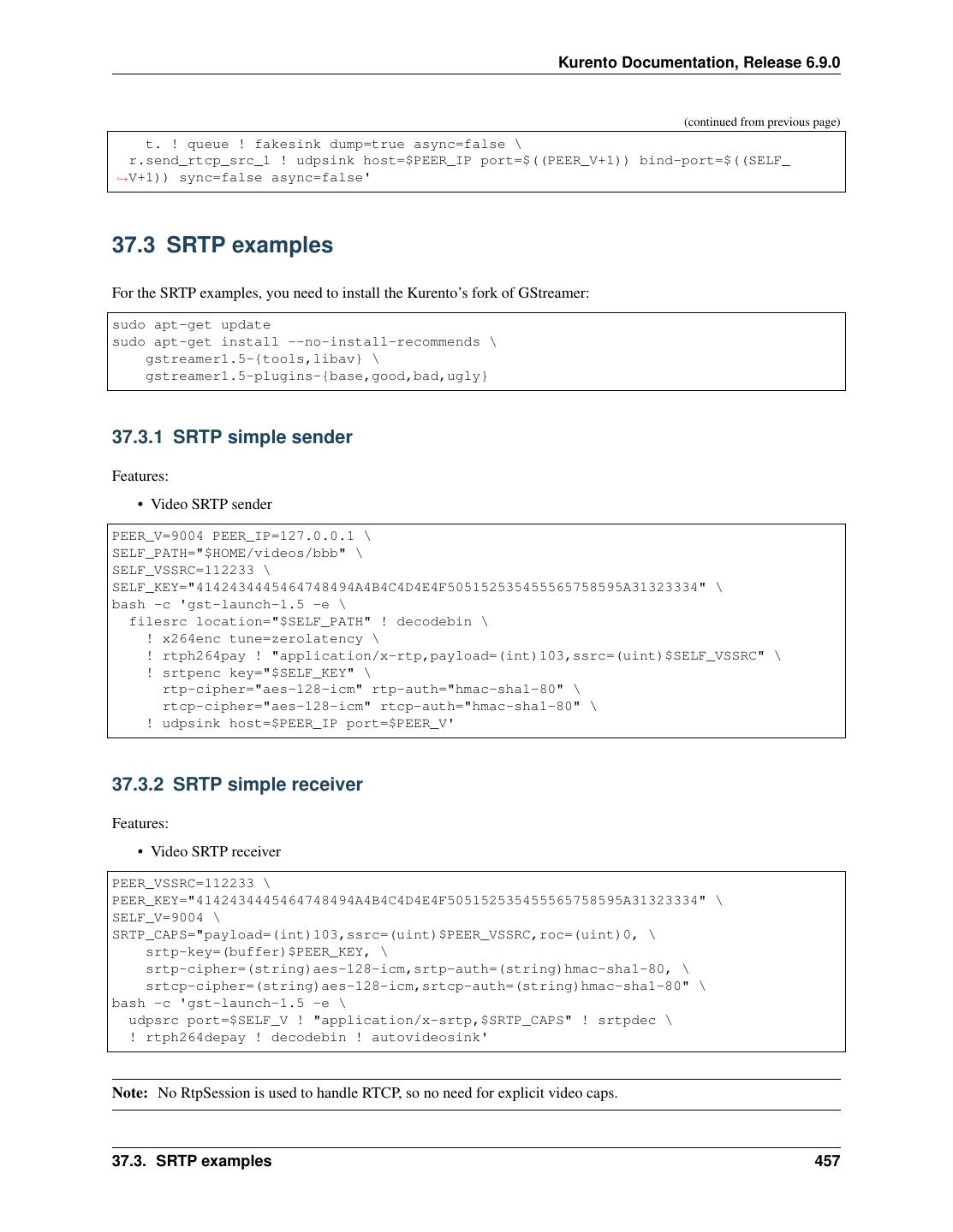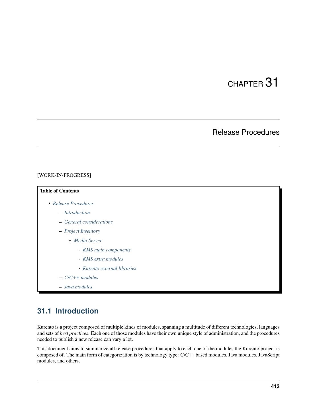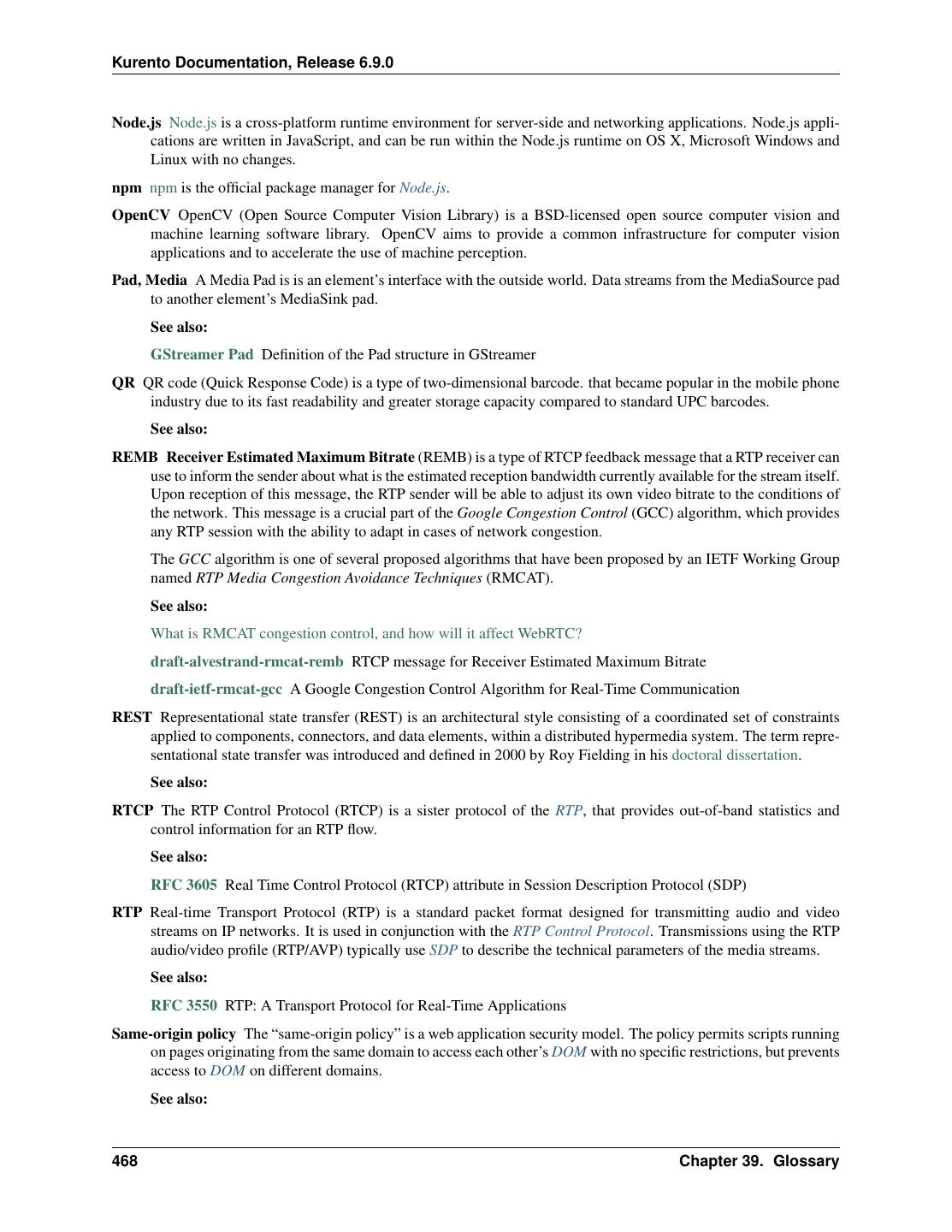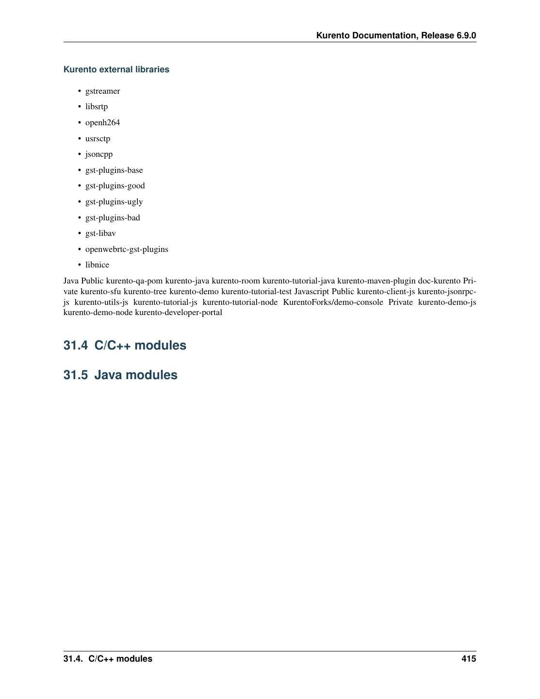 6 .28 Kurento Business Features 395 28.1 Commercial Support . . . . . . . . . . . . . . . . . . . . . . . . . . . . . . . . . . . . . . . . . . . 395 29 Developer Guide 397 29.1 Introduction . . . . . . . . . . . . . . . . . . . . . . . . . . . . . . . . . . . . . . . . . . . . . . . 398 29.2 Code Repositories . . . . . . . . . . . . . . . . . . . . . . . . . . . . . . . . . . . . . . . . . . . . 398 29.3 Development 101 . . . . . . . . . . . . . . . . . . . . . . . . . . . . . . . . . . . . . . . . . . . . . 400 29.4 Building from sources . . . . . . . . . . . . . . . . . . . . . . . . . . . . . . . . . . . . . . . . . . 402 29.5 Working on a forked library . . . . . . . . . . . . . . . . . . . . . . . . . . . . . . . . . . . . . . . 406 29.6 Debian packaging . . . . . . . . . . . . . . . . . . . . . . . . . . . . . . . . . . . . . . . . . . . . 407 29.7 How-To . . . . . . . . . . . . . . . . . . . . . . . . . . . . . . . . . . . . . . . . . . . . . . . . . . 410 30 Continuous Integration 411 31 Release Procedures 413 31.1 Introduction . . . . . . . . . . . . . . . . . . . . . . . . . . . . . . . . . . . . . . . . . . . . . . . 413 31.2 General considerations . . . . . . . . . . . . . . . . . . . . . . . . . . . . . . . . . . . . . . . . . . 414 31.3 Project Inventory . . . . . . . . . . . . . . . . . . . . . . . . . . . . . . . . . . . . . . . . . . . . . 414 31.4 C/C++ modules . . . . . . . . . . . . . . . . . . . . . . . . . . . . . . . . . . . . . . . . . . . . . . 415 31.5 Java modules . . . . . . . . . . . . . . . . . . . . . . . . . . . . . . . . . . . . . . . . . . . . . . . 415 32 Security Hardening 417 32.1 Hardening validation . . . . . . . . . . . . . . . . . . . . . . . . . . . . . . . . . . . . . . . . . . . 418 32.2 Hardening in Kurento . . . . . . . . . . . . . . . . . . . . . . . . . . . . . . . . . . . . . . . . . . 418 32.3 PIC/PIE in GCC . . . . . . . . . . . . . . . . . . . . . . . . . . . . . . . . . . . . . . . . . . . . . 418 32.4 PIC/PIE in CMake . . . . . . . . . . . . . . . . . . . . . . . . . . . . . . . . . . . . . . . . . . . . 419 33 Writing this documentation 421 33.1 Building locally . . . . . . . . . . . . . . . . . . . . . . . . . . . . . . . . . . . . . . . . . . . . . 421 33.2 Kurento documentation Style Guide . . . . . . . . . . . . . . . . . . . . . . . . . . . . . . . . . . . 422 33.3 Sphinx documentation generator . . . . . . . . . . . . . . . . . . . . . . . . . . . . . . . . . . . . . 423 33.4 Read The Docs builds . . . . . . . . . . . . . . . . . . . . . . . . . . . . . . . . . . . . . . . . . . 424 34 Testing 425 34.1 E2E Tests . . . . . . . . . . . . . . . . . . . . . . . . . . . . . . . . . . . . . . . . . . . . . . . . . 425 34.2 Running Java tests . . . . . . . . . . . . . . . . . . . . . . . . . . . . . . . . . . . . . . . . . . . . 427 34.3 Kurento Testing Framework explained . . . . . . . . . . . . . . . . . . . . . . . . . . . . . . . . . . 437 35 Congestion Control (RMCAT) 441 35.1 Google Congestion Control . . . . . . . . . . . . . . . . . . . . . . . . . . . . . . . . . . . . . . . 441 35.2 Meaning of REMB . . . . . . . . . . . . . . . . . . . . . . . . . . . . . . . . . . . . . . . . . . . . 442 36 NAT Types and NAT Traversal 443 36.1 Basic Concepts . . . . . . . . . . . . . . . . . . . . . . . . . . . . . . . . . . . . . . . . . . . . . . 444 36.2 Types of NAT . . . . . . . . . . . . . . . . . . . . . . . . . . . . . . . . . . . . . . . . . . . . . . . 445 36.3 Types of NAT in the Real World . . . . . . . . . . . . . . . . . . . . . . . . . . . . . . . . . . . . . 447 36.4 NAT Traversal . . . . . . . . . . . . . . . . . . . . . . . . . . . . . . . . . . . . . . . . . . . . . . 448 37 RTP Streaming Commands 451 37.1 RTP sender examples . . . . . . . . . . . . . . . . . . . . . . . . . . . . . . . . . . . . . . . . . . . 452 37.2 RTP receiver examples . . . . . . . . . . . . . . . . . . . . . . . . . . . . . . . . . . . . . . . . . . 456 37.3 SRTP examples . . . . . . . . . . . . . . . . . . . . . . . . . . . . . . . . . . . . . . . . . . . . . . 457 37.4 Additional Notes . . . . . . . . . . . . . . . . . . . . . . . . . . . . . . . . . . . . . . . . . . . . . 459 38 Apple Safari 463 38.1 Codec issues . . . . . . . . . . . . . . . . . . . . . . . . . . . . . . . . . . . . . . . . . . . . . . . 463 iv