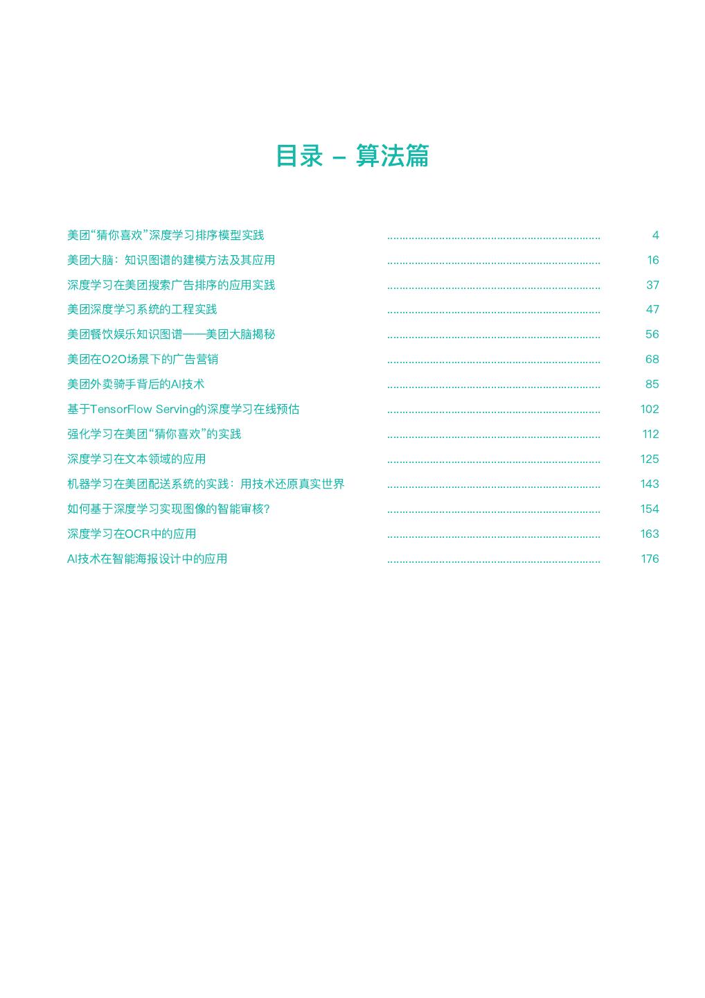 3 . 目录 - 算法篇 美团“猜你喜欢”深度学习排序模型实践 ...................................................................... 4 美团大脑:知识图谱的建模方法及其应用 ...................................................................... 16 深度学习在美团搜索广告排序的应用实践 ...................................................................... 37 美团深度学习系统的工程实践 ...................................................................... 47 美团餐饮娱乐知识图谱——美团大脑揭秘 ...................................................................... 56 美团在O2O场景下的广告营销 ...................................................................... 68 美团外卖骑手背后的AI技术 ...................................................................... 85 基于TensorFlow Serving的深度学习在线预估 ...................................................................... 102 强化学习在美团“猜你喜欢”的实践 ...................................................................... 112 深度学习在文本领域的应用 ...................................................................... 125 机器学习在美团配送系统的实践:用技术还原真实世界 ...................................................................... 143 如何基于深度学习实现图像的智能审核? ...................................................................... 154 深度学习在OCR中的应用 ...................................................................... 163 AI技术在智能海报设计中的应用 ...................................................................... 176