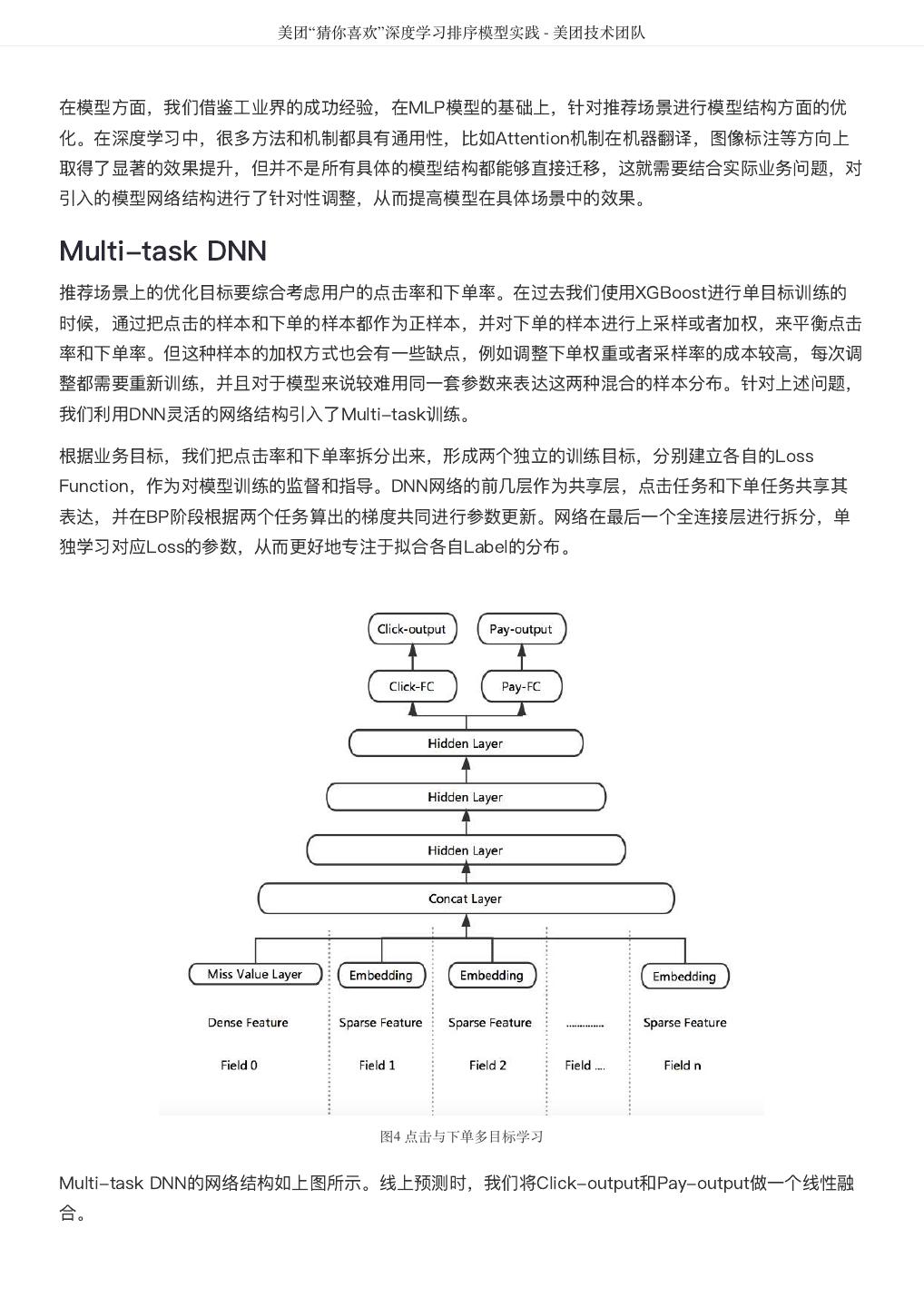 7 . 美团“猜你喜欢”深度学习排序模型实践 - 美团技术团队 在模型方面,我们借鉴工业界的成功经验,在MLP模型的基础上,针对推荐场景进行模型结构方面的优 化。在深度学习中,很多方法和机制都具有通用性,比如Attention机制在机器翻译,图像标注等方向上 取得了显著的效果提升,但并不是所有具体的模型结构都能够直接迁移,这就需要结合实际业务问题,对 引入的模型网络结构进行了针对性调整,从而提高模型在具体场景中的效果。 Multi-task DNN 推荐场景上的优化目标要综合考虑用户的点击率和下单率。在过去我们使用XGBoost进行单目标训练的 时候,通过把点击的样本和下单的样本都作为正样本,并对下单的样本进行上采样或者加权,来平衡点击 率和下单率。但这种样本的加权方式也会有一些缺点,例如调整下单权重或者采样率的成本较高,每次调 整都需要重新训练,并且对于模型来说较难用同一套参数来表达这两种混合的样本分布。针对上述问题, 我们利用DNN灵活的网络结构引入了Multi-task训练。 根据业务目标,我们把点击率和下单率拆分出来,形成两个独立的训练目标,分别建立各自的Loss Function,作为对模型训练的监督和指导。DNN网络的前几层作为共享层,点击任务和下单任务共享其 表达,并在BP阶段根据两个任务算出的梯度共同进行参数更新。网络在最后一个全连接层进行拆分,单 独学习对应Loss的参数,从而更好地专注于拟合各自Label的分布。 图4 点击与下单多目标学习 Multi-task DNN的网络结构如上图所示。线上预测时,我们将Click-output和Pay-output做一个线性融 合。