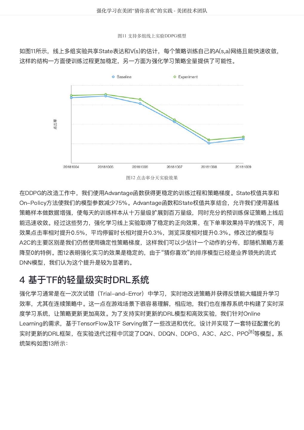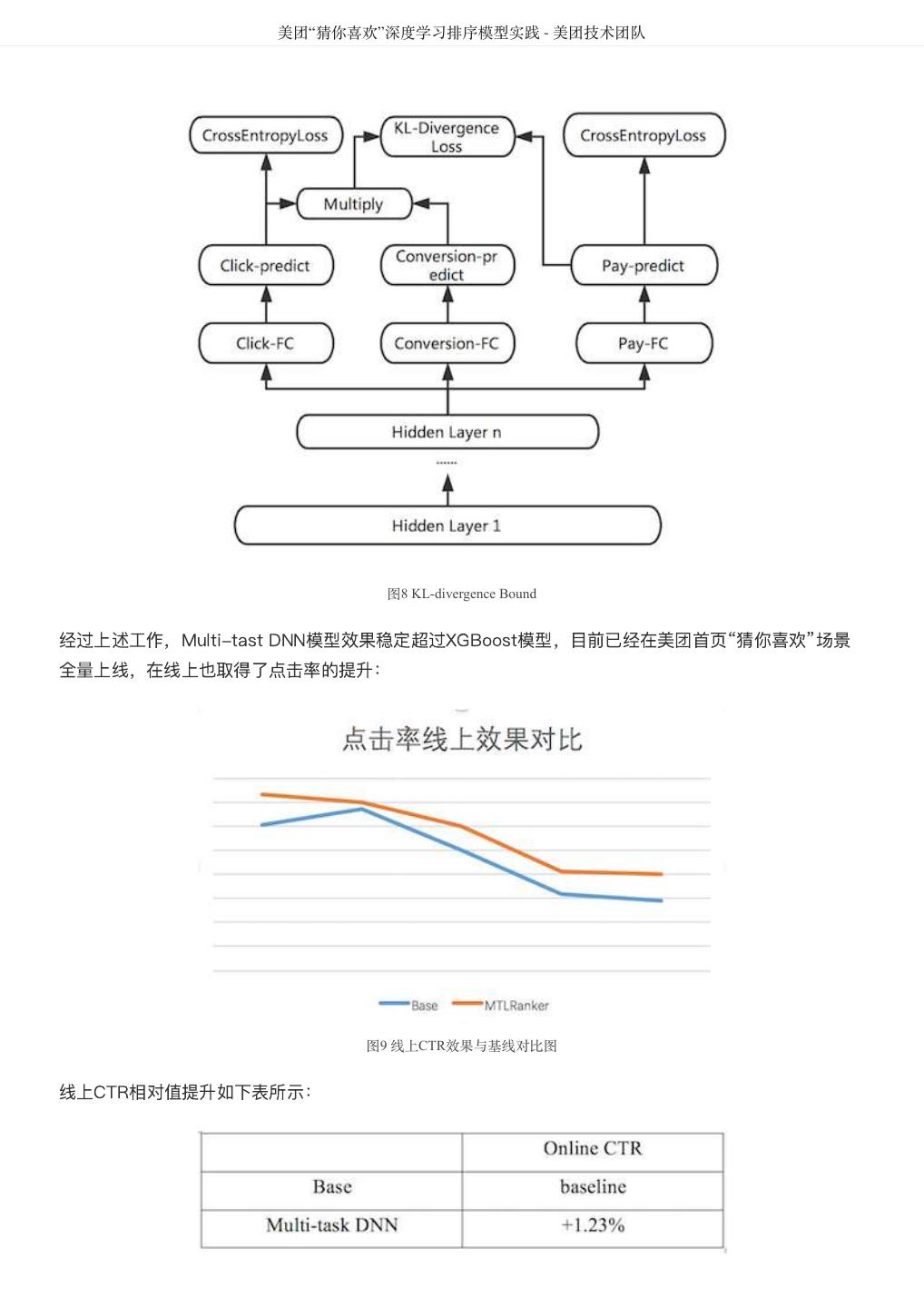 10 . 美团“猜你喜欢”深度学习排序模型实践 - 美团技术团队 图8 KLdivergence Bound 经过上述工作,Multi-tast DNN模型效果稳定超过XGBoost模型,目前已经在美团首页“猜你喜欢”场景 全量上线,在线上也取得了点击率的提升: 图9 线上CTR效果与基线对比图 线上CTR相对值提升如下表所示: