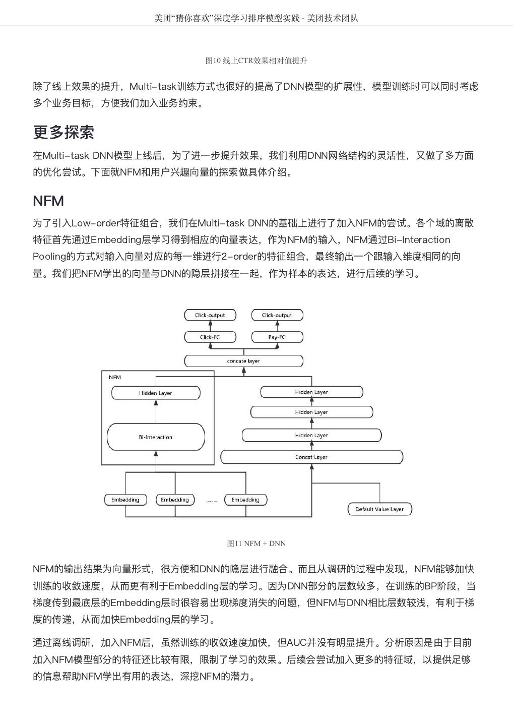 11 . 美团“猜你喜欢”深度学习排序模型实践 - 美团技术团队 图10 线上CTR效果相对值提升 除了线上效果的提升,Multi-task训练方式也很好的提高了DNN模型的扩展性,模型训练时可以同时考虑 多个业务目标,方便我们加入业务约束。 更多探索 在Multi-task DNN模型上线后,为了进一步提升效果,我们利用DNN网络结构的灵活性,又做了多方面 的优化尝试。下面就NFM和用户兴趣向量的探索做具体介绍。 NFM 为了引入Low-order特征组合,我们在Multi-task DNN的基础上进行了加入NFM的尝试。各个域的离散 特征首先通过Embedding层学习得到相应的向量表达,作为NFM的输入,NFM通过Bi-Interaction Pooling的方式对输入向量对应的每一维进行2-order的特征组合,最终输出一个跟输入维度相同的向 量。我们把NFM学出的向量与DNN的隐层拼接在一起,作为样本的表达,进行后续的学习。 图11 NFM + DNN NFM的输出结果为向量形式,很方便和DNN的隐层进行融合。而且从调研的过程中发现,NFM能够加快 训练的收敛速度,从而更有利于Embedding层的学习。因为DNN部分的层数较多,在训练的BP阶段,当 梯度传到最底层的Embedding层时很容易出现梯度消失的问题,但NFM与DNN相比层数较浅,有利于梯 度的传递,从而加快Embedding层的学习。 通过离线调研,加入NFM后,虽然训练的收敛速度加快,但AUC并没有明显提升。分析原因是由于目前 加入NFM模型部分的特征还比较有限,限制了学习的效果。后续会尝试加入更多的特征域,以提供足够 的信息帮助NFM学出有用的表达,深挖NFM的潜力。