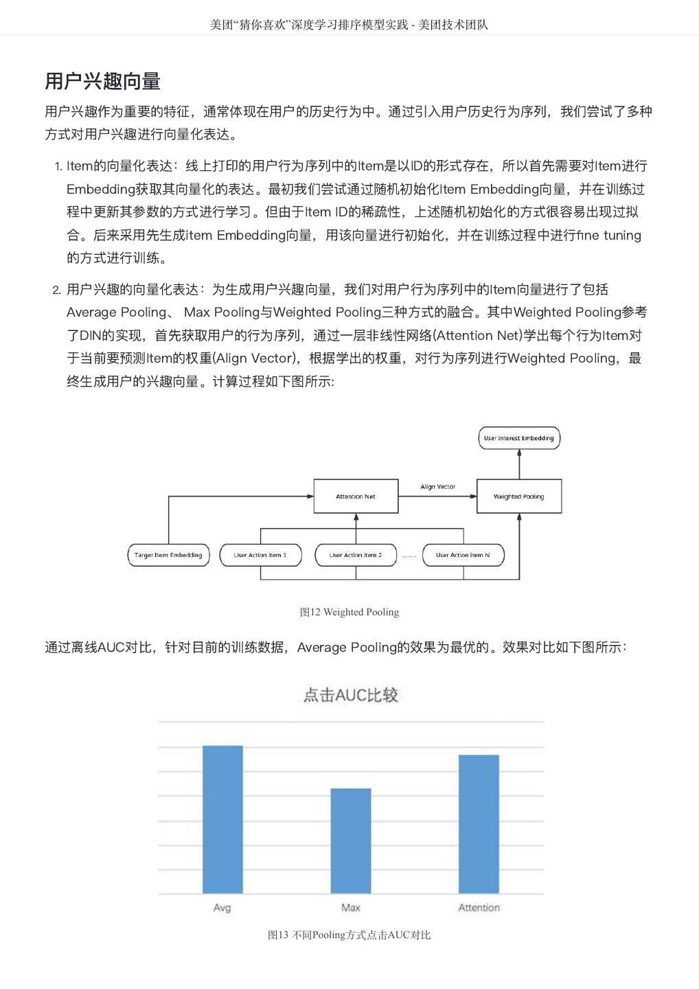 12 . 美团“猜你喜欢”深度学习排序模型实践 - 美团技术团队 用户兴趣向量 用户兴趣作为重要的特征,通常体现在用户的历史行为中。通过引入用户历史行为序列,我们尝试了多种 方式对用户兴趣进行向量化表达。 1. Item的向量化表达:线上打印的用户行为序列中的Item是以ID的形式存在,所以首先需要对Item进行 Embedding获取其向量化的表达。最初我们尝试通过随机初始化Item Embedding向量,并在训练过 程中更新其参数的方式进行学习。但由于Item ID的稀疏性,上述随机初始化的方式很容易出现过拟 合。后来采用先生成item Embedding向量,用该向量进行初始化,并在训练过程中进行fine tuning 的方式进行训练。 2. 用户兴趣的向量化表达:为生成用户兴趣向量,我们对用户行为序列中的Item向量进行了包括 Average Pooling、 Max Pooling与Weighted Pooling三种方式的融合。其中Weighted Pooling参考 了DIN的实现,首先获取用户的行为序列,通过一层非线性网络(Attention Net)学出每个行为Item对 于当前要预测Item的权重(Align Vector),根据学出的权重,对行为序列进行Weighted Pooling,最 终生成用户的兴趣向量。计算过程如下图所示: 图12 Weighted Pooling 通过离线AUC对比,针对目前的训练数据,Average Pooling的效果为最优的。效果对比如下图所示: 图13 不同Pooling方式点击AUC对比