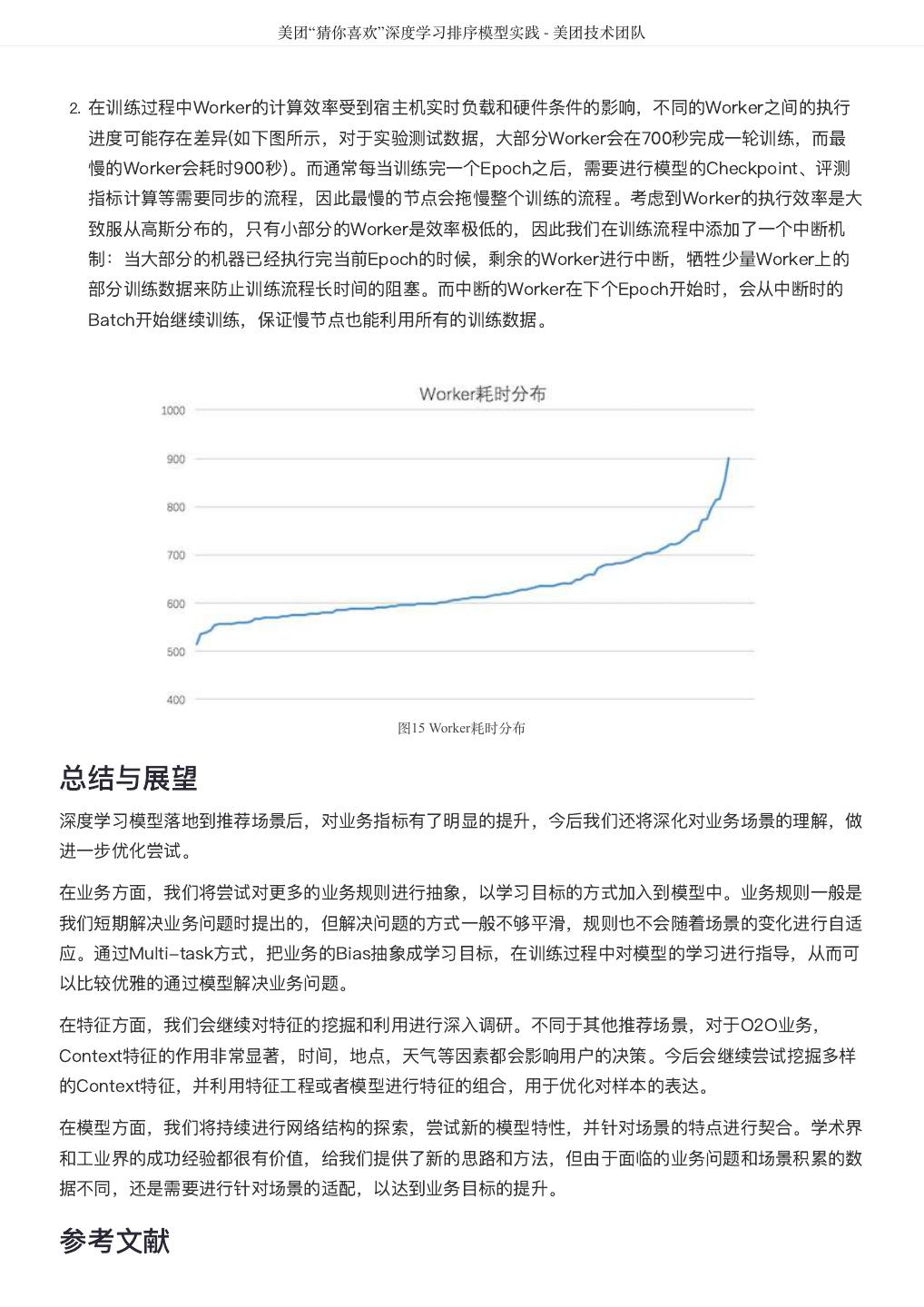 14 . 美团“猜你喜欢”深度学习排序模型实践 - 美团技术团队 2. 在训练过程中Worker的计算效率受到宿主机实时负载和硬件条件的影响,不同的Worker之间的执行 进度可能存在差异(如下图所示,对于实验测试数据,大部分Worker会在700秒完成一轮训练,而最 慢的Worker会耗时900秒)。而通常每当训练完一个Epoch之后,需要进行模型的Checkpoint、评测 指标计算等需要同步的流程,因此最慢的节点会拖慢整个训练的流程。考虑到Worker的执行效率是大 致服从高斯分布的,只有小部分的Worker是效率极低的,因此我们在训练流程中添加了一个中断机 制:当大部分的机器已经执行完当前Epoch的时候,剩余的Worker进行中断,牺牲少量Worker上的 部分训练数据来防止训练流程长时间的阻塞。而中断的Worker在下个Epoch开始时,会从中断时的 Batch开始继续训练,保证慢节点也能利用所有的训练数据。 图15 Worker耗时分布 总结与展望 深度学习模型落地到推荐场景后,对业务指标有了明显的提升,今后我们还将深化对业务场景的理解,做 进一步优化尝试。 在业务方面,我们将尝试对更多的业务规则进行抽象,以学习目标的方式加入到模型中。业务规则一般是 我们短期解决业务问题时提出的,但解决问题的方式一般不够平滑,规则也不会随着场景的变化进行自适 应。通过Multi-task方式,把业务的Bias抽象成学习目标,在训练过程中对模型的学习进行指导,从而可 以比较优雅的通过模型解决业务问题。 在特征方面,我们会继续对特征的挖掘和利用进行深入调研。不同于其他推荐场景,对于O2O业务, Context特征的作用非常显著,时间,地点,天气等因素都会影响用户的决策。今后会继续尝试挖掘多样 的Context特征,并利用特征工程或者模型进行特征的组合,用于优化对样本的表达。 在模型方面,我们将持续进行网络结构的探索,尝试新的模型特性,并针对场景的特点进行契合。学术界 和工业界的成功经验都很有价值,给我们提供了新的思路和方法,但由于面临的业务问题和场景积累的数 据不同,还是需要进行针对场景的适配,以达到业务目标的提升。 参考文献