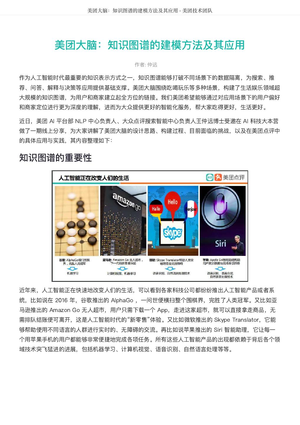 16 . 美团大脑:知识图谱的建模方法及其应用 - 美团技术团队 美团大脑:知识图谱的建模方法及其应用 作者: 仲远 作为人工智能时代最重要的知识表示方式之一,知识图谱能够打破不同场景下的数据隔离,为搜索、推 荐、问答、解释与决策等应用提供基础支撑。美团大脑围绕吃喝玩乐等多种场景,构建了生活娱乐领域超 大规模的知识图谱,为用户和商家建立起全方位的链接。我们美团希望能够通过对应用场景下的用户偏好 和商家定位进行更为深度的理解,进而为大众提供更好的智能化服务,帮大家吃得更好,生活更好。 近日,美团 AI 平台部 NLP 中心负责人、大众点评搜索智能中心负责人王仲远博士受邀在 AI 科技大本营 做了一期线上分享,为大家讲解了美团大脑的设计思路、构建过程、目前面临的挑战,以及在美团点评中 的具体应用与实践,其内容整理如下: 知识图谱的重要性 近年来,人工智能正在快速地改变人们的生活,可以看到各家科技公司都纷纷推出人工智能产品或者系 统,比如说在 2016 年,谷歌推出的 AlphaGo ,一问世便横扫整个围棋界,完胜了人类冠军。又比如亚 马逊推出的 Amazon Go 无人超市,用户只需下载一个 App,走进这家超市,就可以直接拿走商品,无 需排队结账便可离开,这是人工智能时代的“新零售”体验。又比如微软推出的 Skype Translator,它能 够帮助使用不同语言的人群进行实时的、无障碍的交流。再比如说苹果推出的 Siri 智能助理,它让每一 个用苹果手机的用户都能够非常便捷地完成各项任务。所有这些人工智能产品的出现都依赖于背后各个领 域技术突飞猛进的进展,包括机器学习、计算机视觉、语音识别、自然语言处理等等。