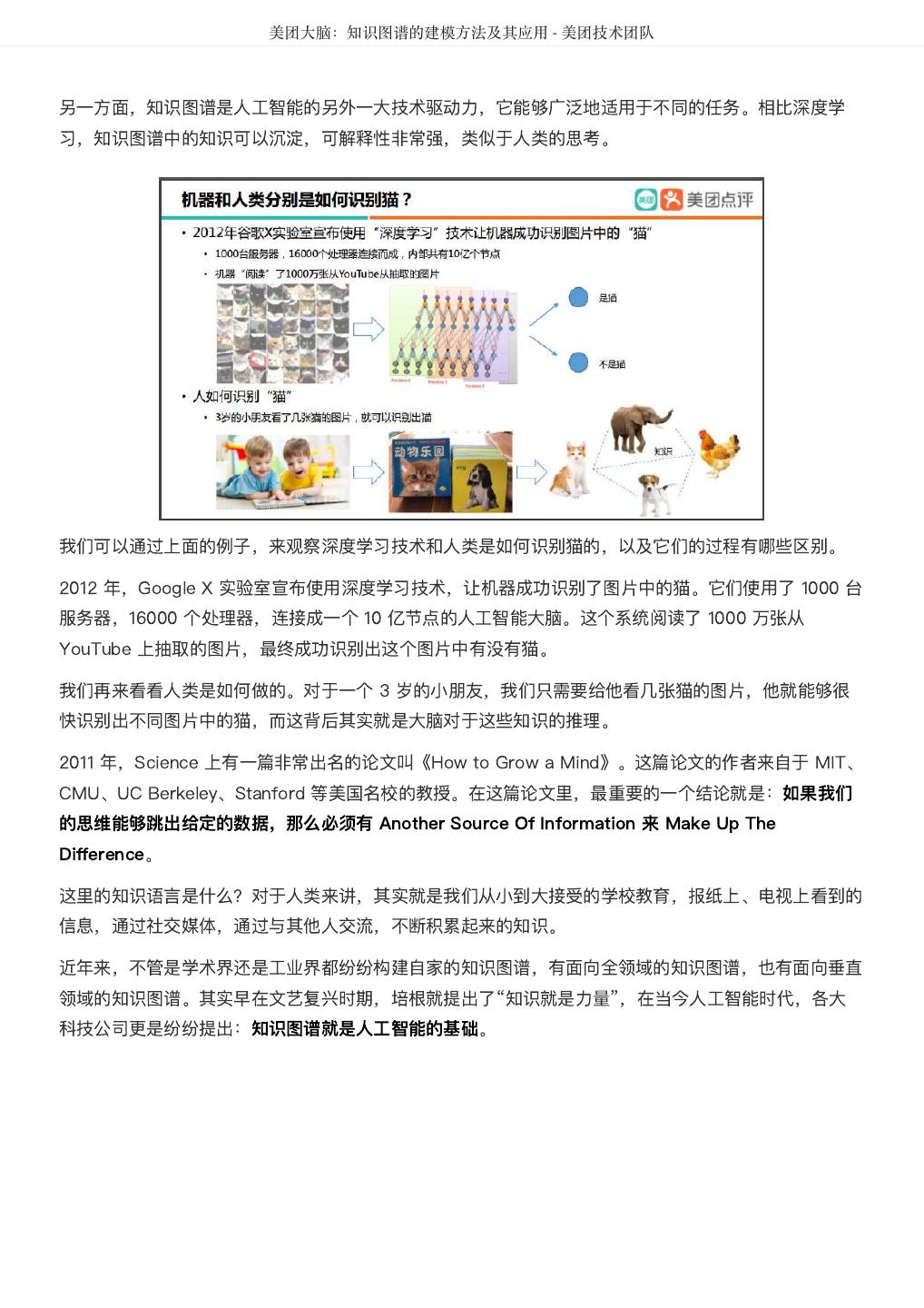 18 . 美团大脑:知识图谱的建模方法及其应用 - 美团技术团队 另一方面,知识图谱是人工智能的另外一大技术驱动力,它能够广泛地适用于不同的任务。相比深度学 习,知识图谱中的知识可以沉淀,可解释性非常强,类似于人类的思考。 我们可以通过上面的例子,来观察深度学习技术和人类是如何识别猫的,以及它们的过程有哪些区别。 2012 年,Google X 实验室宣布使用深度学习技术,让机器成功识别了图片中的猫。它们使用了 1000 台 服务器,16000 个处理器,连接成一个 10 亿节点的人工智能大脑。这个系统阅读了 1000 万张从 YouTube 上抽取的图片,最终成功识别出这个图片中有没有猫。 我们再来看看人类是如何做的。对于一个 3 岁的小朋友,我们只需要给他看几张猫的图片,他就能够很 快识别出不同图片中的猫,而这背后其实就是大脑对于这些知识的推理。 2011 年,Science 上有一篇非常出名的论文叫《How to Grow a Mind》。这篇论文的作者来自于 MIT、 CMU、UC Berkeley、Stanford 等美国名校的教授。在这篇论文里,最重要的一个结论就是:如果我们 的思维能够跳出给定的数据,那么必须有 Another Source Of Information 来 Make Up The Difference。 这里的知识语言是什么?对于人类来讲,其实就是我们从小到大接受的学校教育,报纸上、电视上看到的 信息,通过社交媒体,通过与其他人交流,不断积累起来的知识。 近年来,不管是学术界还是工业界都纷纷构建自家的知识图谱,有面向全领域的知识图谱,也有面向垂直 领域的知识图谱。其实早在文艺复兴时期,培根就提出了“知识就是力量”,在当今人工智能时代,各大 科技公司更是纷纷提出:知识图谱就是人工智能的基础。