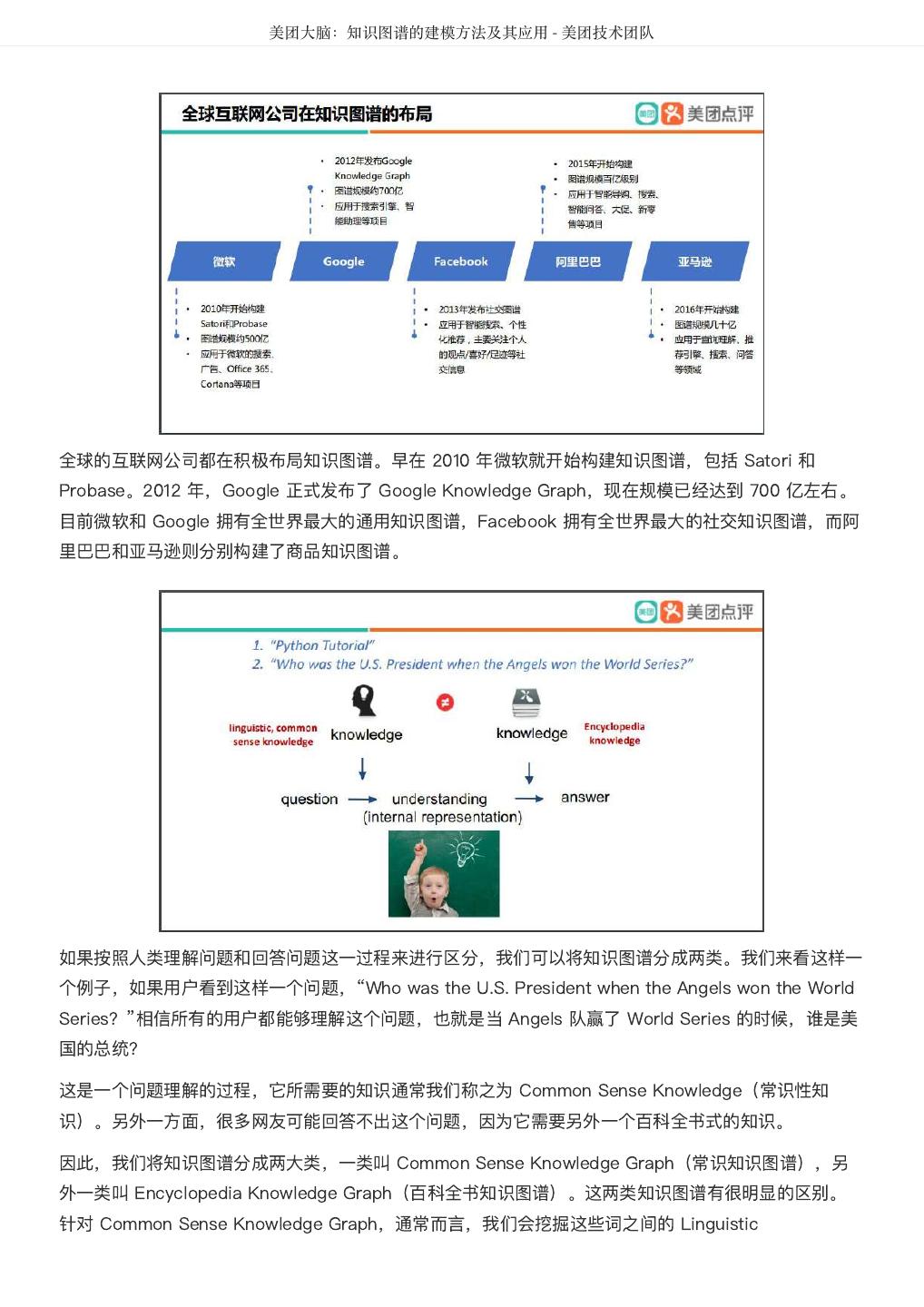19 . 美团大脑:知识图谱的建模方法及其应用 - 美团技术团队 全球的互联网公司都在积极布局知识图谱。早在 2010 年微软就开始构建知识图谱,包括 Satori 和 Probase。2012 年,Google 正式发布了 Google Knowledge Graph,现在规模已经达到 700 亿左右。 目前微软和 Google 拥有全世界最大的通用知识图谱,Facebook 拥有全世界最大的社交知识图谱,而阿 里巴巴和亚马逊则分别构建了商品知识图谱。 如果按照人类理解问题和回答问题这一过程来进行区分,我们可以将知识图谱分成两类。我们来看这样一 个例子,如果用户看到这样一个问题,“Who was the U.S. President when the Angels won the World Series?”相信所有的用户都能够理解这个问题,也就是当 Angels 队赢了 World Series 的时候,谁是美 国的总统? 这是一个问题理解的过程,它所需要的知识通常我们称之为 Common Sense Knowledge(常识性知 识)。另外一方面,很多网友可能回答不出这个问题,因为它需要另外一个百科全书式的知识。 因此,我们将知识图谱分成两大类,一类叫 Common Sense Knowledge Graph(常识知识图谱),另 外一类叫 Encyclopedia Knowledge Graph(百科全书知识图谱)。这两类知识图谱有很明显的区别。 针对 Common Sense Knowledge Graph,通常而言,我们会挖掘这些词之间的 Linguistic
