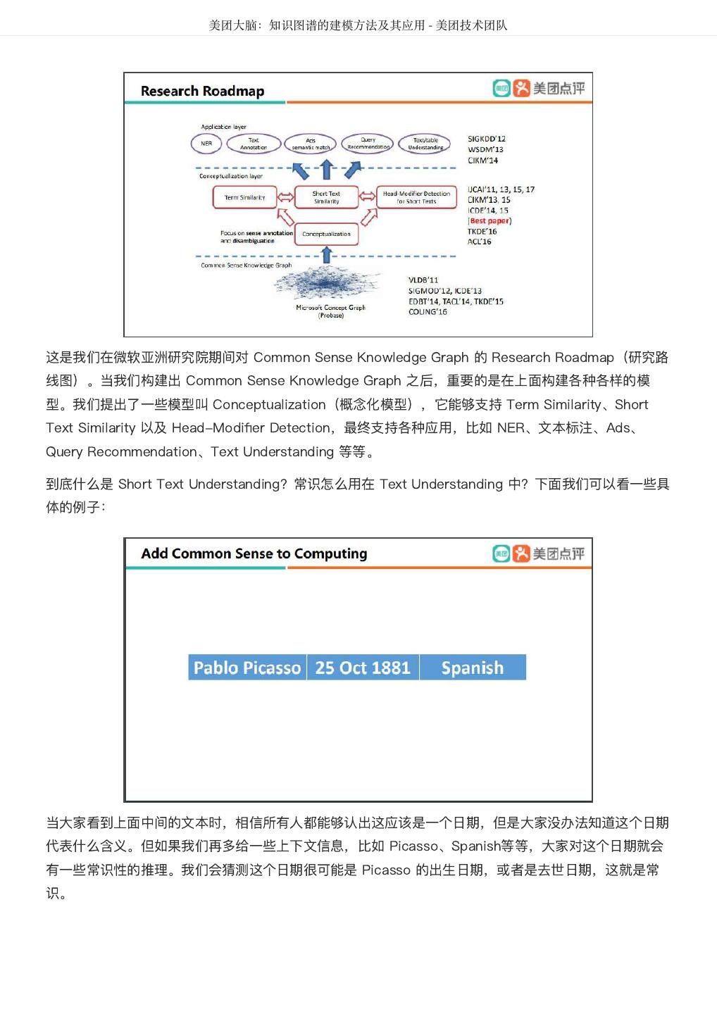 21 . 美团大脑:知识图谱的建模方法及其应用 - 美团技术团队 这是我们在微软亚洲研究院期间对 Common Sense Knowledge Graph 的 Research Roadmap(研究路 线图)。当我们构建出 Common Sense Knowledge Graph 之后,重要的是在上面构建各种各样的模 型。我们提出了一些模型叫 Conceptualization(概念化模型),它能够支持 Term Similarity、Short Text Similarity 以及 Head-Modifier Detection,最终支持各种应用,比如 NER、文本标注、Ads、 Query Recommendation、Text Understanding 等等。 到底什么是 Short Text Understanding?常识怎么用在 Text Understanding 中?下面我们可以看一些具 体的例子: 当大家看到上面中间的文本时,相信所有人都能够认出这应该是一个日期,但是大家没办法知道这个日期 代表什么含义。但如果我们再多给一些上下文信息,比如 Picasso、Spanish等等,大家对这个日期就会 有一些常识性的推理。我们会猜测这个日期很可能是 Picasso 的出生日期,或者是去世日期,这就是常 识。