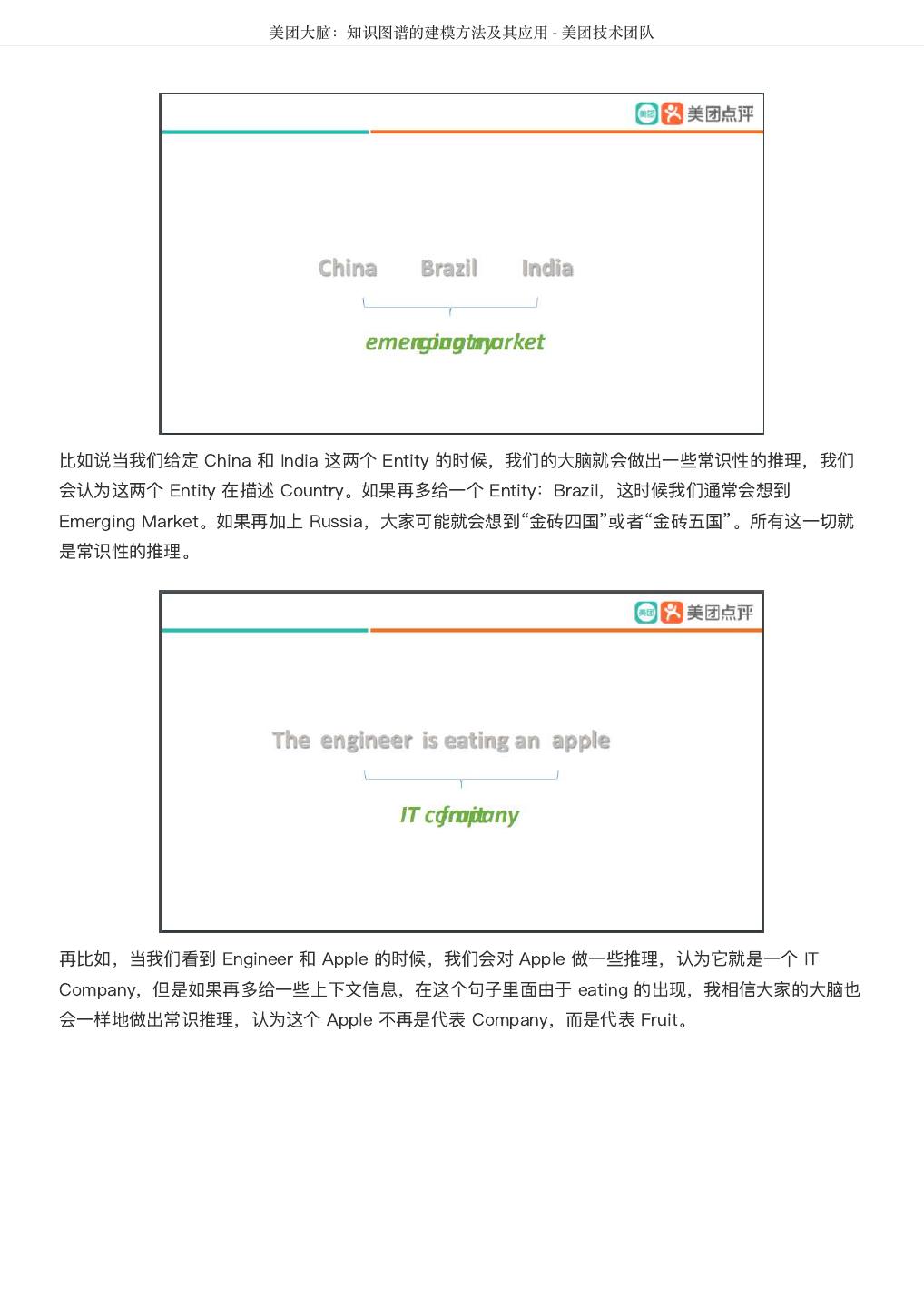 22 . 美团大脑:知识图谱的建模方法及其应用 - 美团技术团队 比如说当我们给定 China 和 India 这两个 Entity 的时候,我们的大脑就会做出一些常识性的推理,我们 会认为这两个 Entity 在描述 Country。如果再多给一个 Entity:Brazil,这时候我们通常会想到 Emerging Market。如果再加上 Russia,大家可能就会想到“金砖四国”或者“金砖五国”。所有这一切就 是常识性的推理。 再比如,当我们看到 Engineer 和 Apple 的时候,我们会对 Apple 做一些推理,认为它就是一个 IT Company,但是如果再多给一些上下文信息,在这个句子里面由于 eating 的出现,我相信大家的大脑也 会一样地做出常识推理,认为这个 Apple 不再是代表 Company,而是代表 Fruit。