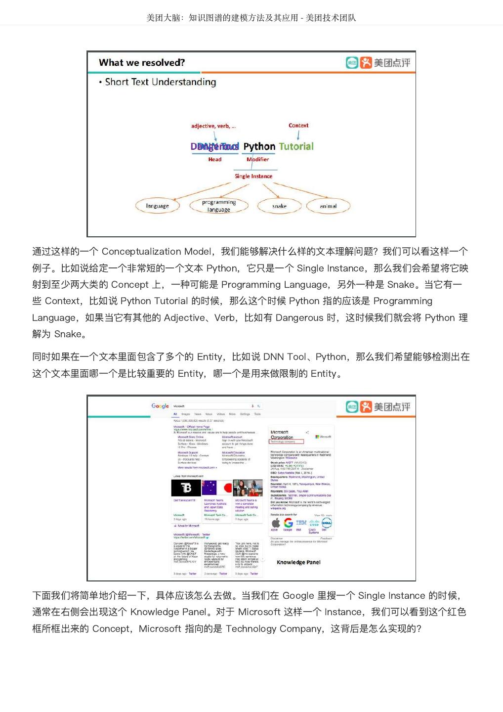 24 . 美团大脑:知识图谱的建模方法及其应用 - 美团技术团队 通过这样的一个 Conceptualization Model,我们能够解决什么样的文本理解问题?我们可以看这样一个 例子。比如说给定一个非常短的一个文本 Python,它只是一个 Single Instance,那么我们会希望将它映 射到至少两大类的 Concept 上,一种可能是 Programming Language,另外一种是 Snake。当它有一 些 Context,比如说 Python Tutorial 的时候,那么这个时候 Python 指的应该是 Programming Language,如果当它有其他的 Adjective、Verb,比如有 Dangerous 时,这时候我们就会将 Python 理 解为 Snake。 同时如果在一个文本里面包含了多个的 Entity,比如说 DNN Tool、Python,那么我们希望能够检测出在 这个文本里面哪一个是比较重要的 Entity,哪一个是用来做限制的 Entity。 下面我们将简单地介绍一下,具体应该怎么去做。当我们在 Google 里搜一个 Single Instance 的时候, 通常在右侧会出现这个 Knowledge Panel。对于 Microsoft 这样一个 Instance,我们可以看到这个红色 框所框出来的 Concept,Microsoft 指向的是 Technology Company,这背后是怎么实现的?