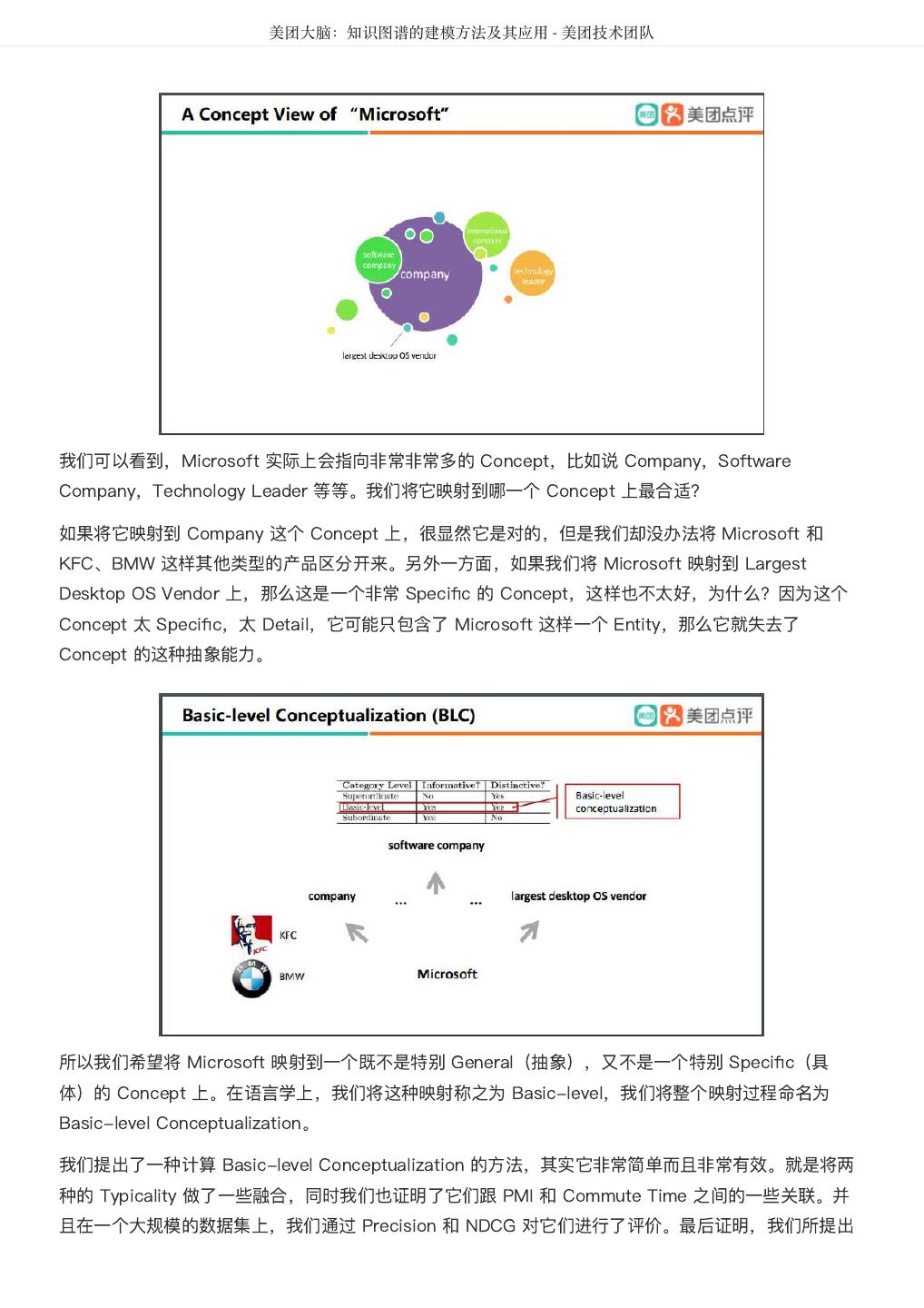 25 . 美团大脑:知识图谱的建模方法及其应用 - 美团技术团队 我们可以看到,Microsoft 实际上会指向非常非常多的 Concept,比如说 Company,Software Company,Technology Leader 等等。我们将它映射到哪一个 Concept 上最合适? 如果将它映射到 Company 这个 Concept 上,很显然它是对的,但是我们却没办法将 Microsoft 和 KFC、BMW 这样其他类型的产品区分开来。另外一方面,如果我们将 Microsoft 映射到 Largest Desktop OS Vendor 上,那么这是一个非常 Specific 的 Concept,这样也不太好,为什么?因为这个 Concept 太 Specific,太 Detail,它可能只包含了 Microsoft 这样一个 Entity,那么它就失去了 Concept 的这种抽象能力。 所以我们希望将 Microsoft 映射到一个既不是特别 General(抽象),又不是一个特别 Specific(具 体)的 Concept 上。在语言学上,我们将这种映射称之为 Basic-level,我们将整个映射过程命名为 Basic-level Conceptualization。 我们提出了一种计算 Basic-level Conceptualization 的方法,其实它非常简单而且非常有效。就是将两 种的 Typicality 做了一些融合,同时我们也证明了它们跟 PMI 和 Commute Time 之间的一些关联。并 且在一个大规模的数据集上,我们通过 Precision 和 NDCG 对它们进行了评价。最后证明,我们所提出