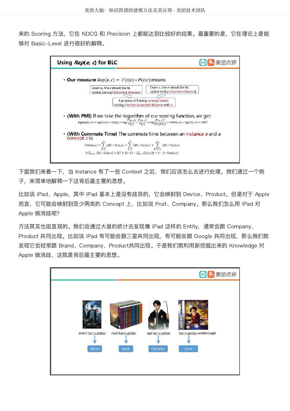 26 . 美团大脑:知识图谱的建模方法及其应用 - 美团技术团队 来的 Scoring 方法,它在 NDCG 和 Precision 上都能达到比较好的结果。最重要的是,它在理论上是能 够对 Basic-Level 进行很好的解释。 下面我们来看一下,当 Instance 有了一些 Context 之后,我们应该怎么去进行处理。我们通过一个例 子,来简单地解释一下这背后最主要的思想。 比如说 iPad、Apple,其中 iPad 基本上是没有歧异的,它会映射到 Device、Product。但是对于 Apple 而言,它可能会映射到至少两类的 Concept 上,比如说 Fruit、Company。那么我们怎么用 iPad 对 Apple 做消歧呢? 方法其实也挺直观的。我们会通过大量的统计去发现像 iPad 这样的 Entity,通常会跟 Company、 Product 共同出现。比如说 iPad 有可能会跟三星共同出现,有可能会跟 Google 共同出现,那么我们就 发现它会经常跟 Brand、Company、Product共同出现。于是我们就利用新挖掘出来的 Knowledge 对 Apple 做消歧,这就是背后最主要的思想。